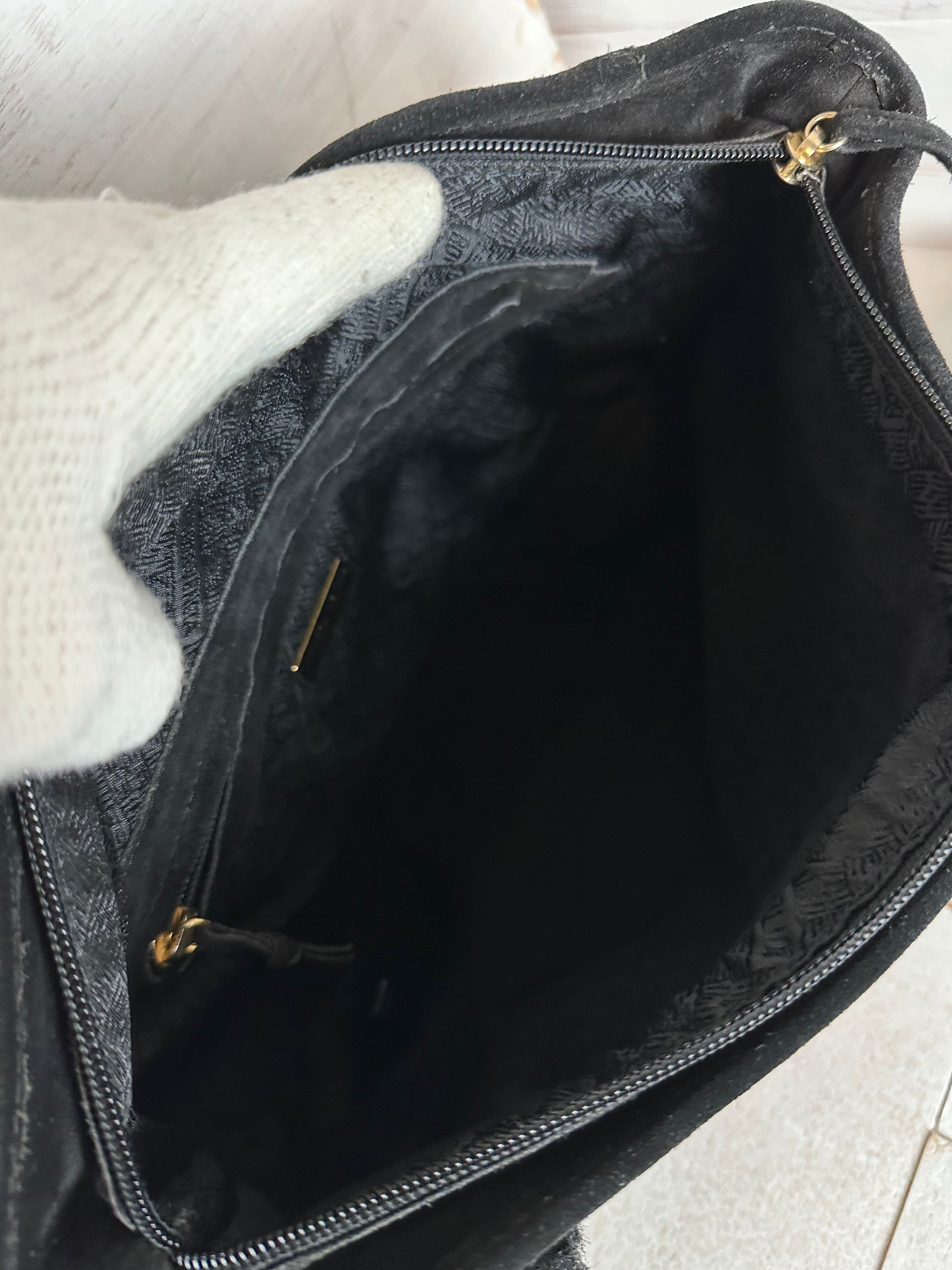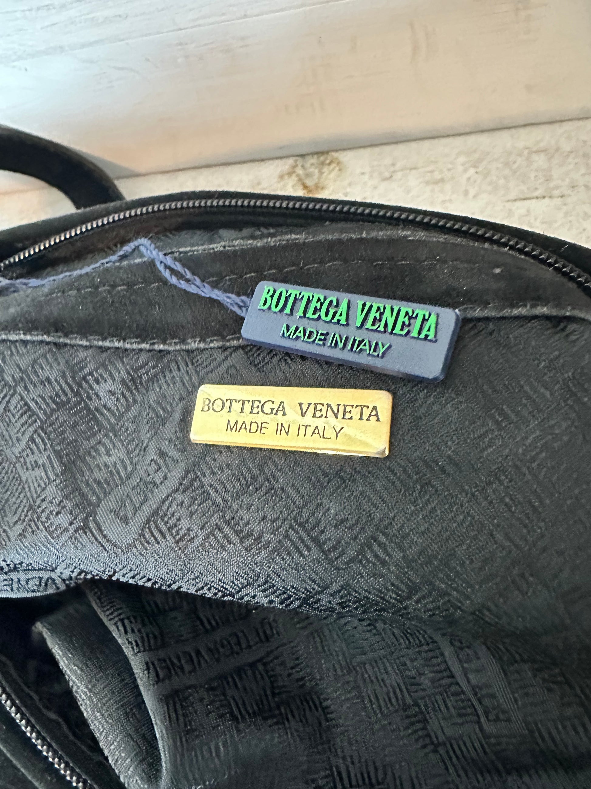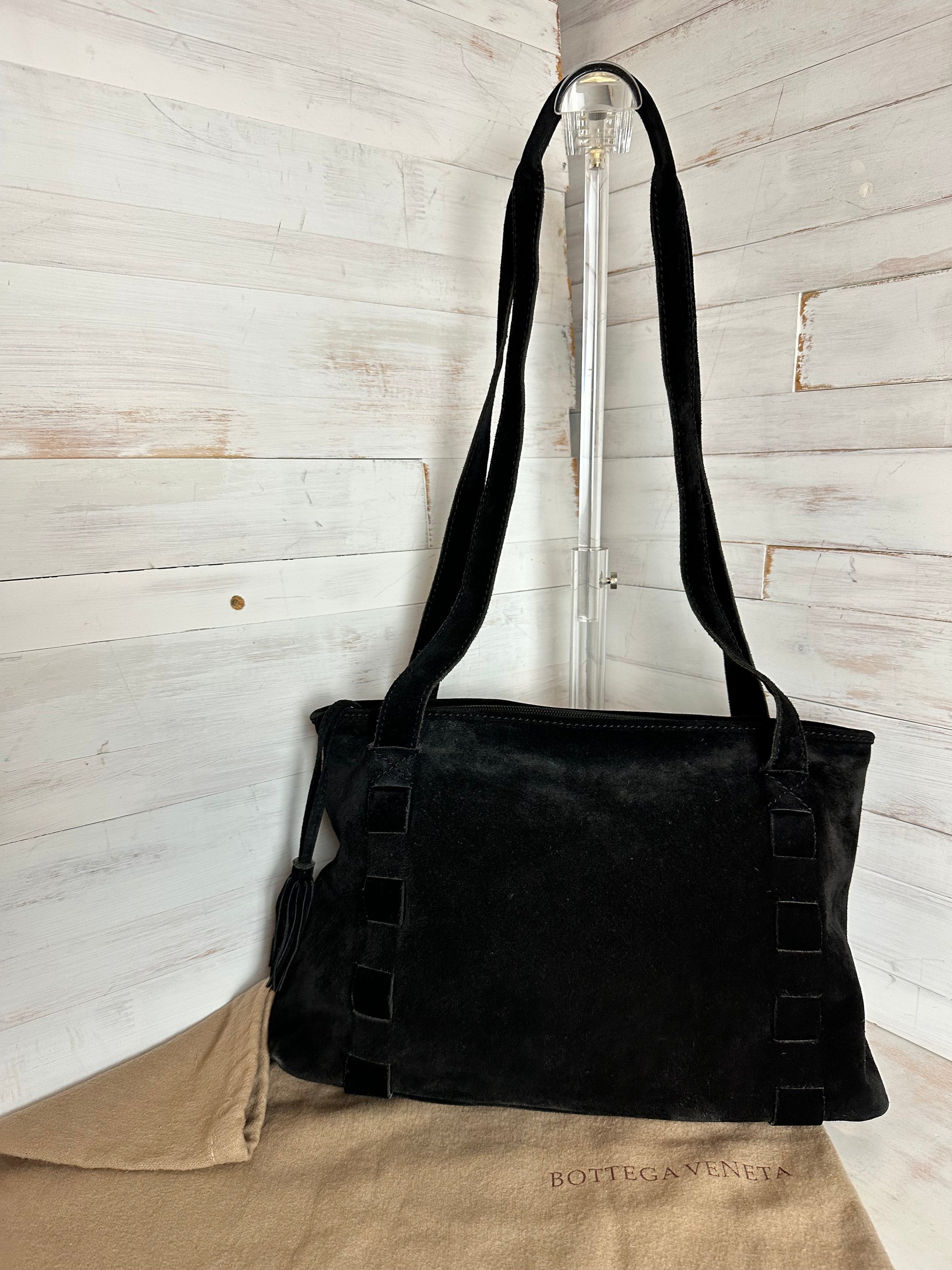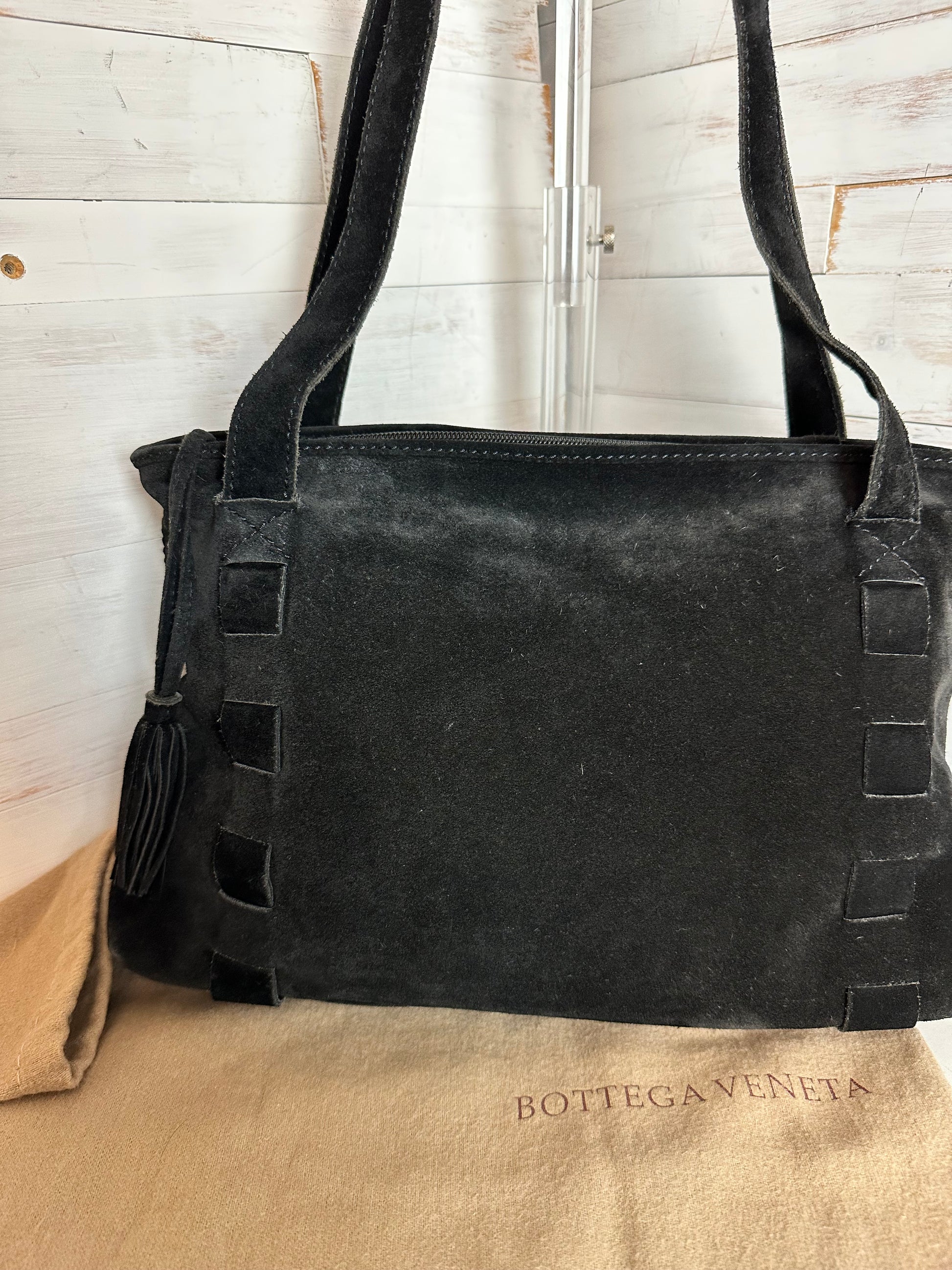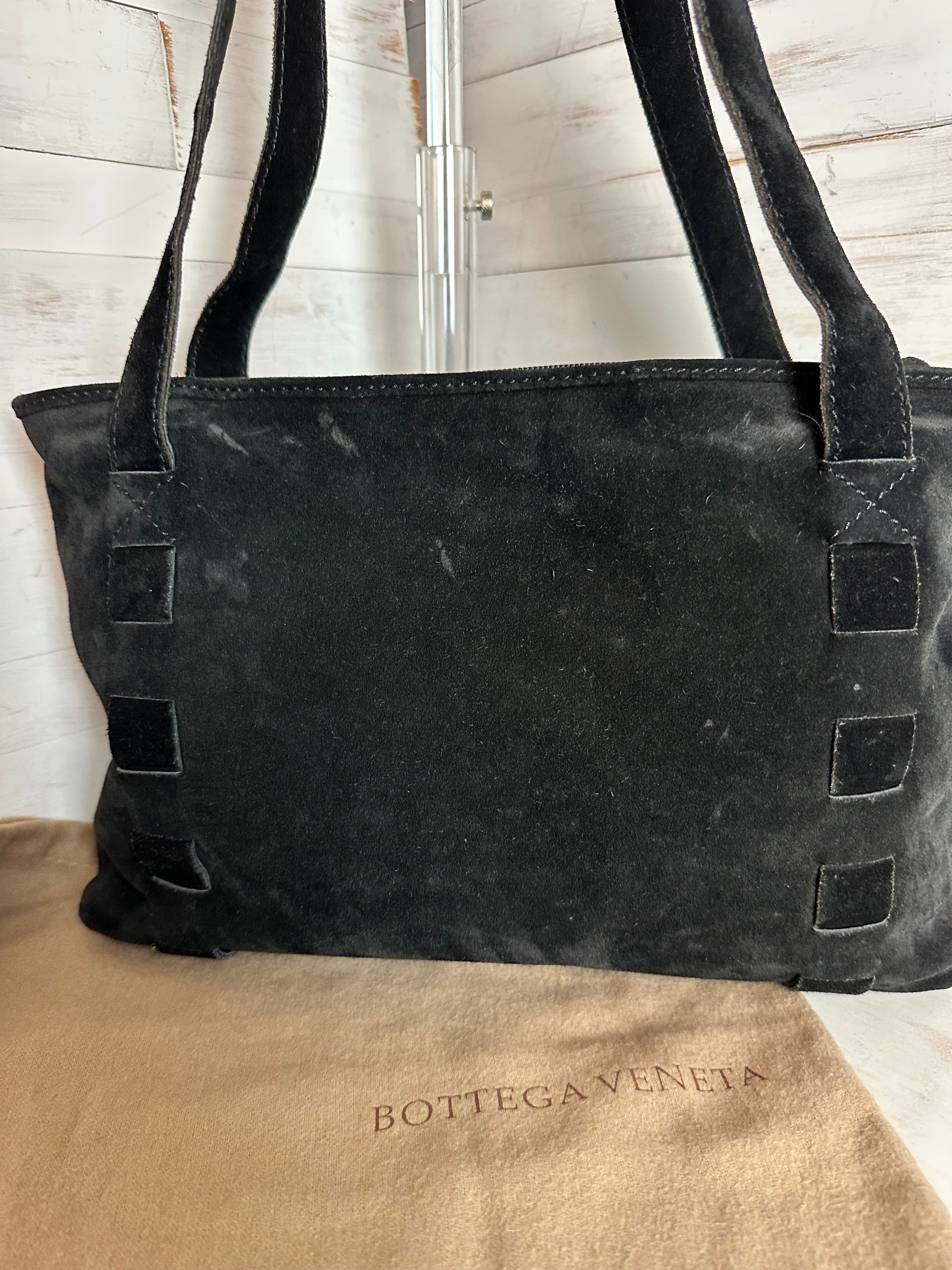 Beautiful black suede Bottega Veneta Tote Bag. Small area of rubbing on the exterior (difficult to notice but please note all pictures). Interior is clean with no markings. Interior zipper still has original Bottega Veneta tag.