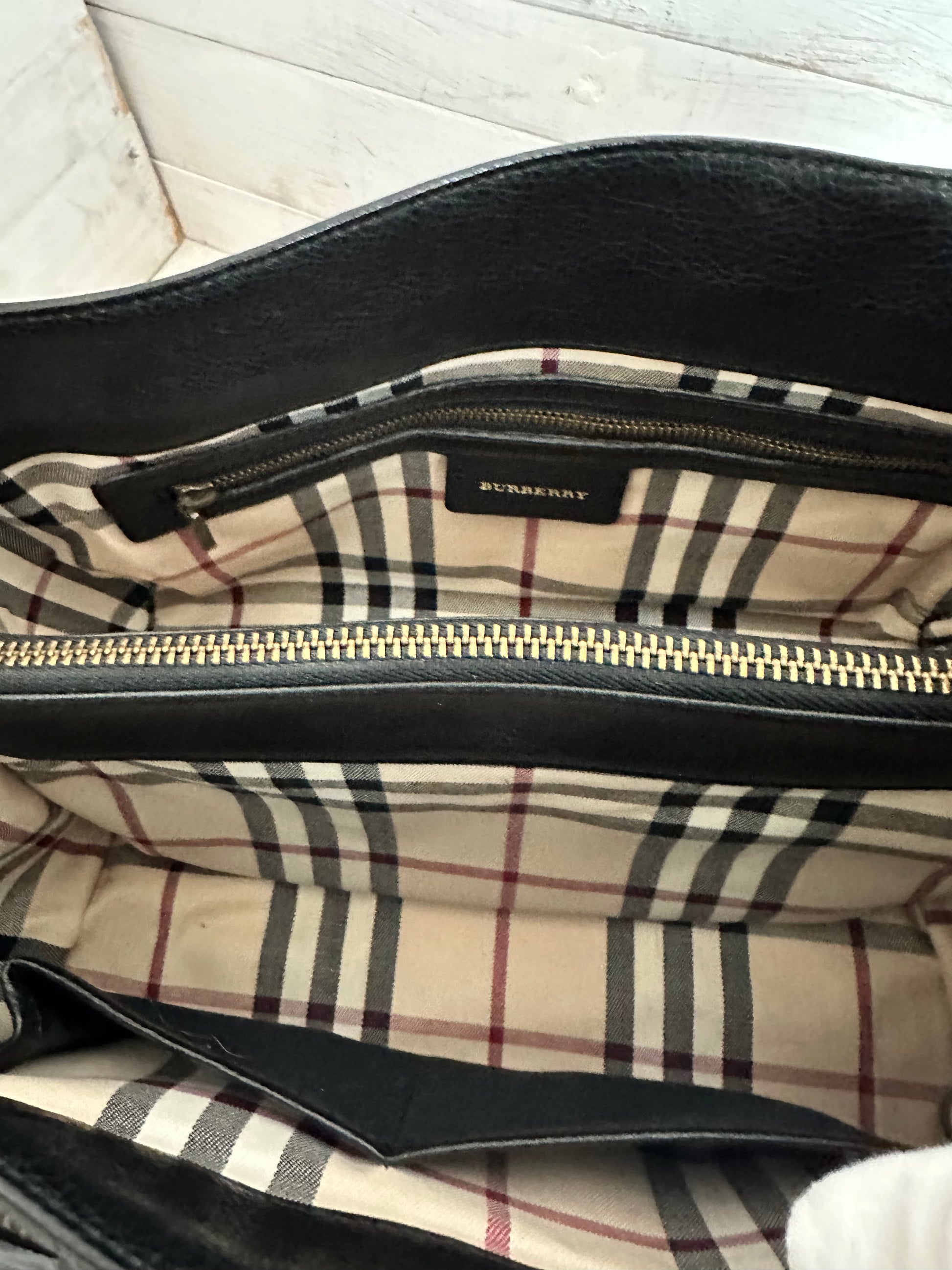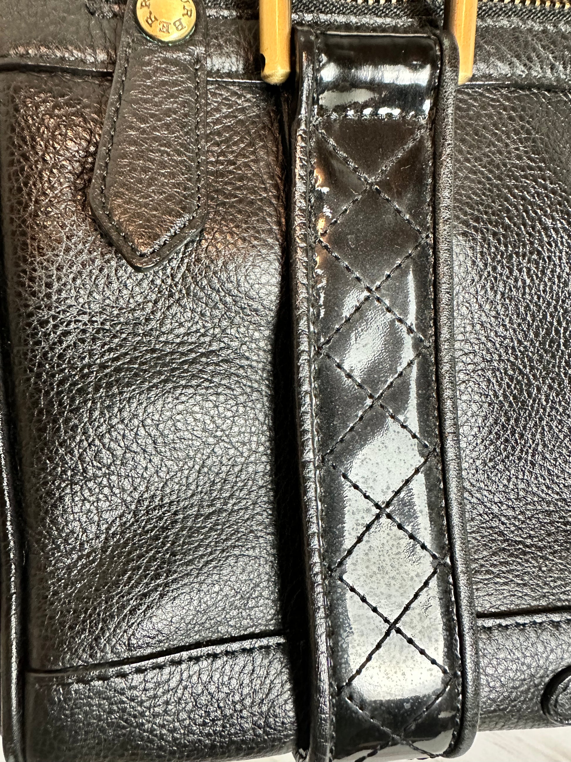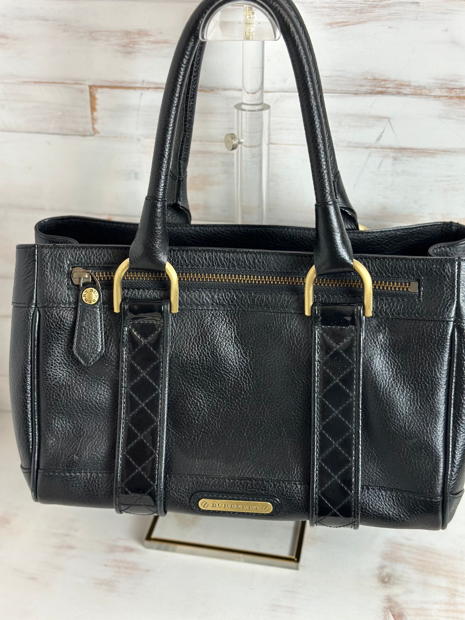 Beautiful crafted pebbled black leather with patent leather checked strips makes this Burberry bag a standout. Rolled black leather handles add to the sophistication. Featuring an exterior zipper compartment. The interior is an open, two compartments in the infamous Burberry House Check pattern. One side is a zipper pocket and the other has two slip pockets. The center features a zipped compartment. Comes with a COA. Minimal usage wear is noted.
