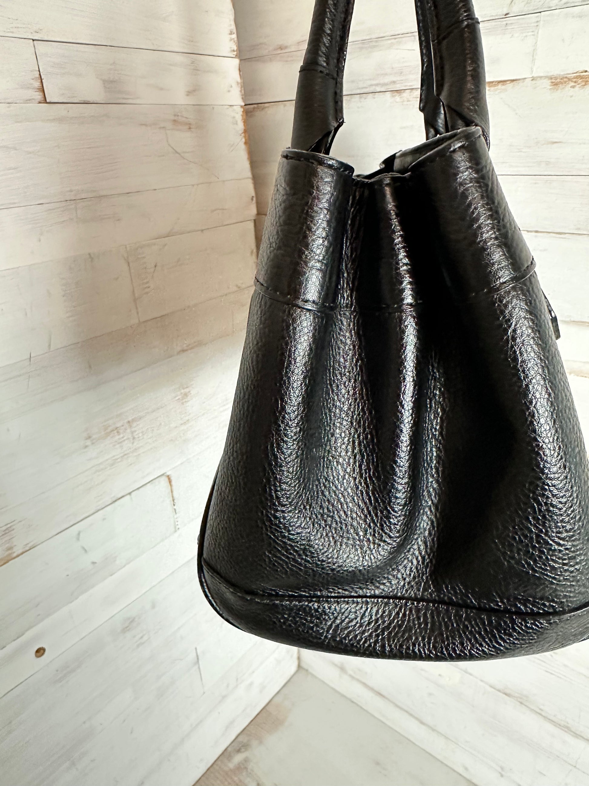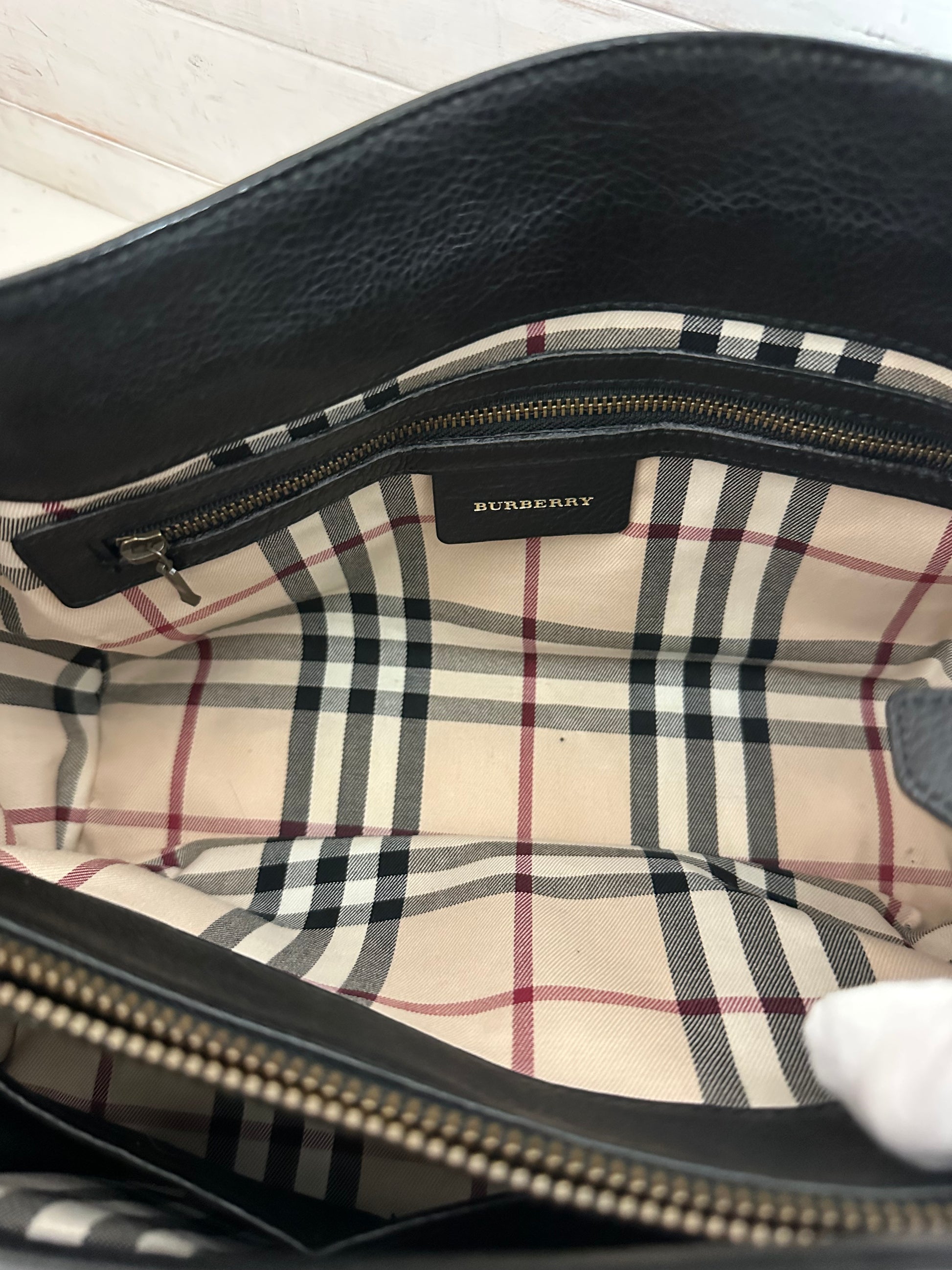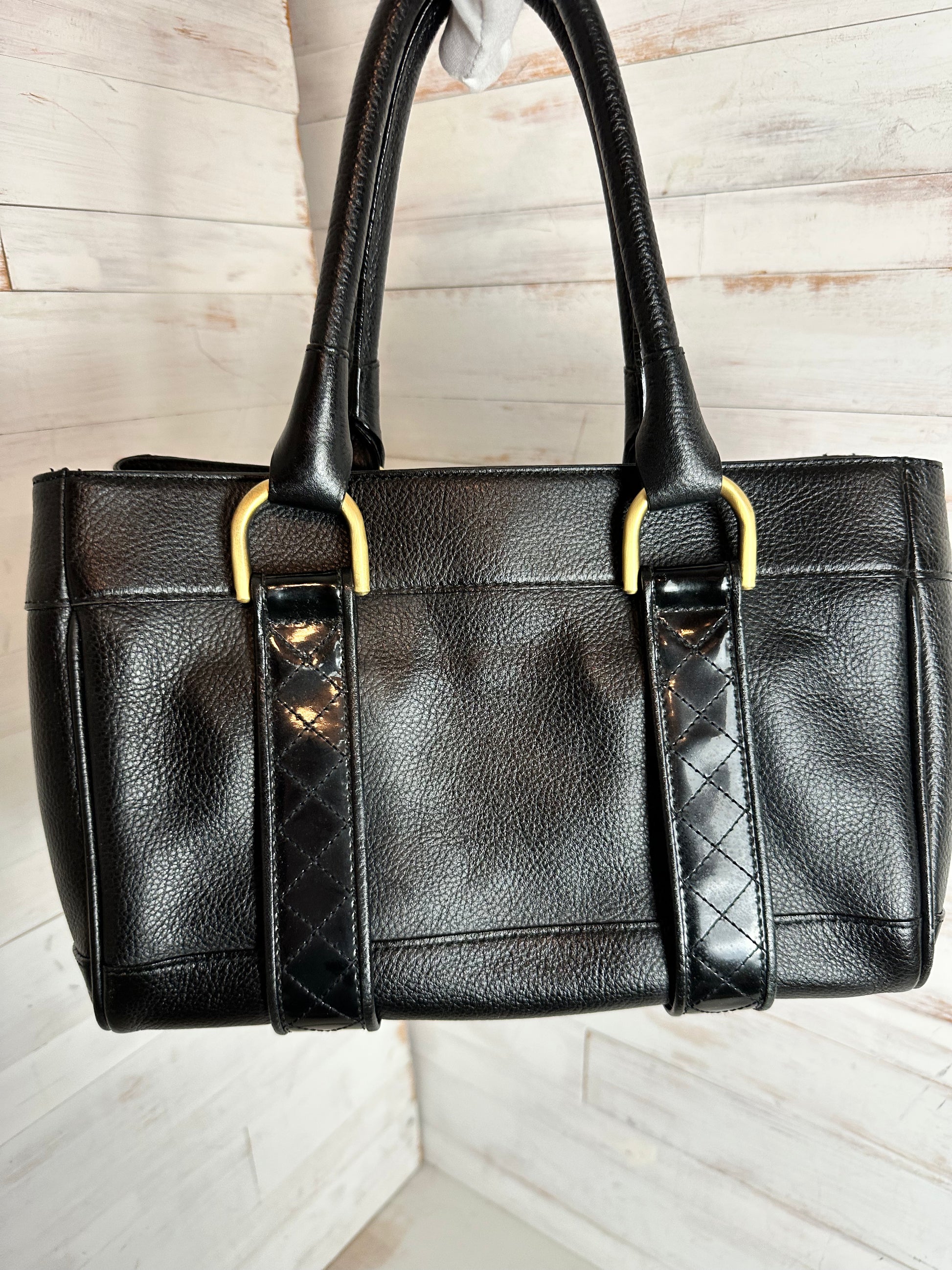 Beautiful crafted pebbled black leather with patent leather checked strips makes this Burberry bag a standout. Rolled black leather handles add to the sophistication. Featuring an exterior zipper compartment. The interior is an open, two compartments in the infamous Burberry House Check pattern. One side is a zipper pocket and the other has two slip pockets. The center features a zipped compartment. Comes with a COA. Minimal usage wear is noted.