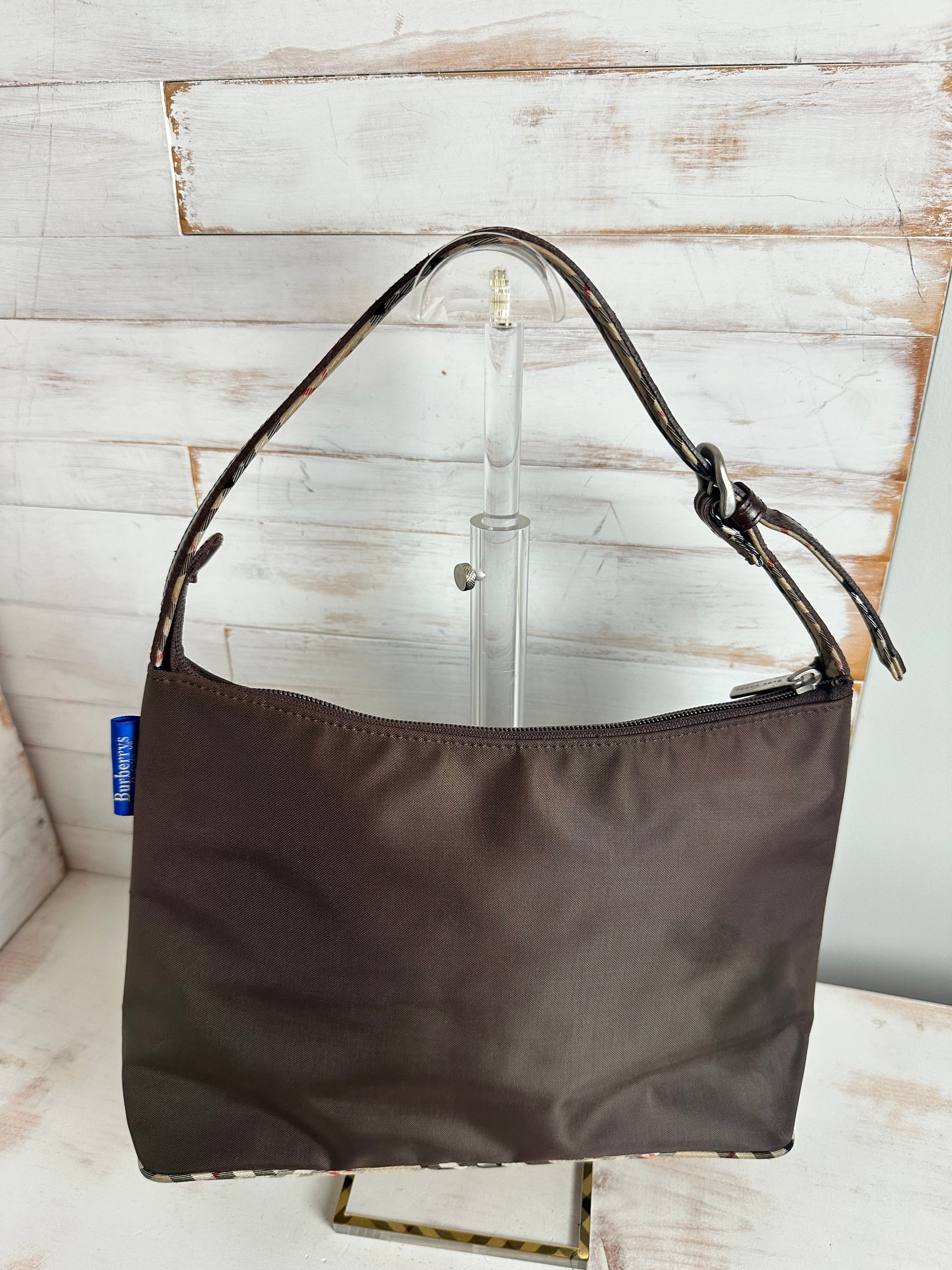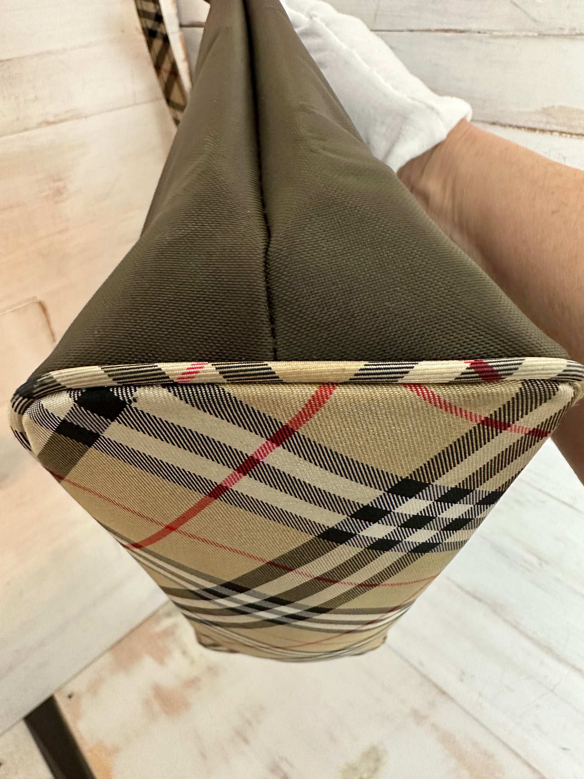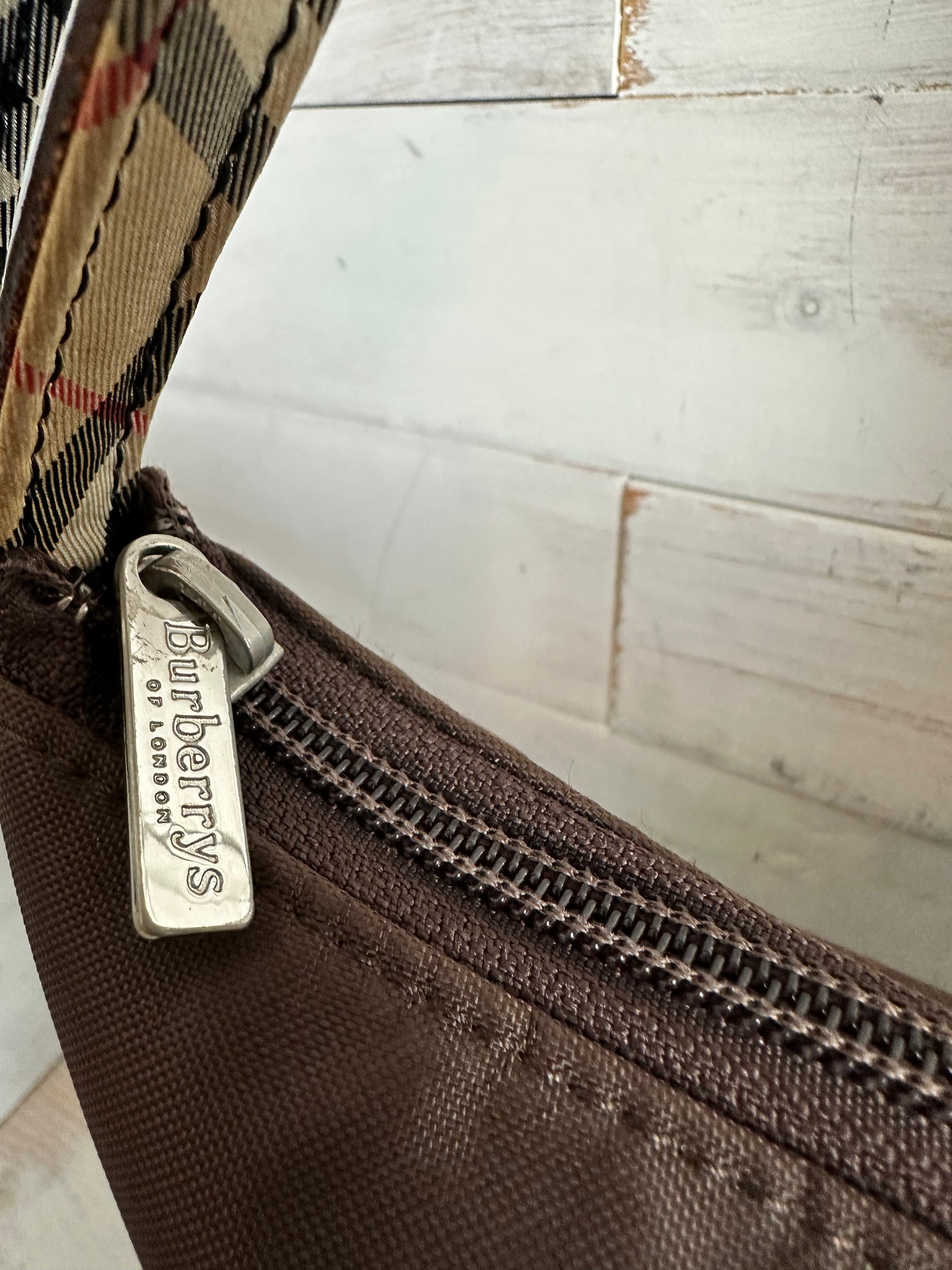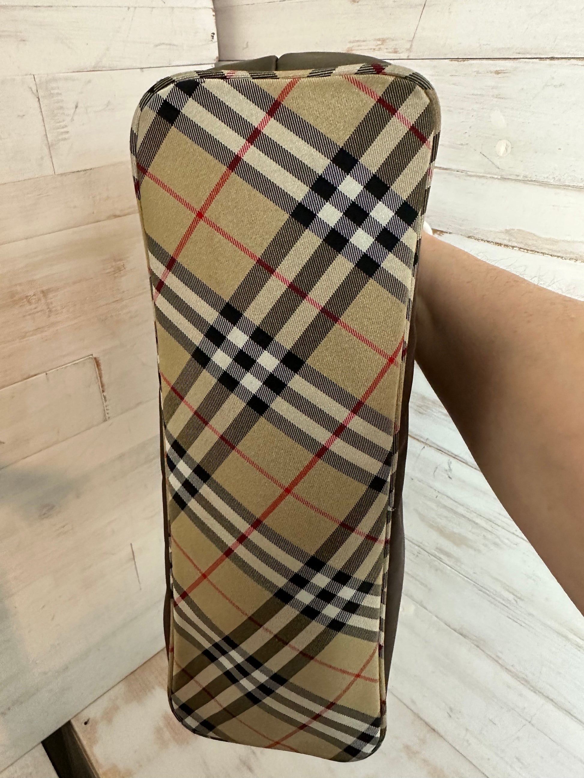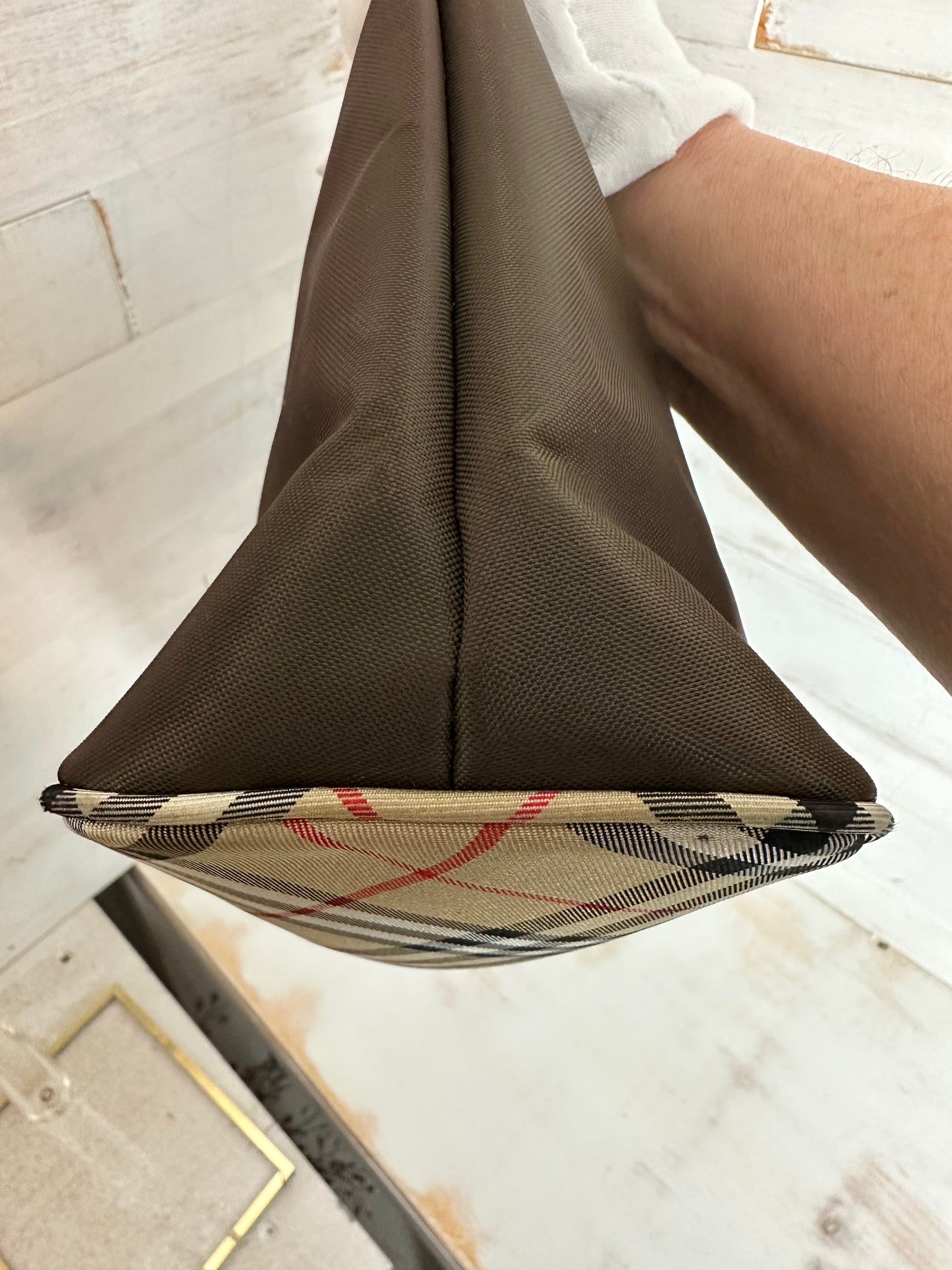 This is a beautiful brown nylon small tote bag with the infamous Burberry House Check Pattern on the bottom. The handle is brown leather on the top and the House Check pattern on the bottom. The interior is black featuring a zippered pocket and a large slip pocket. Hardware shows wear but the rest of the bag is clean.