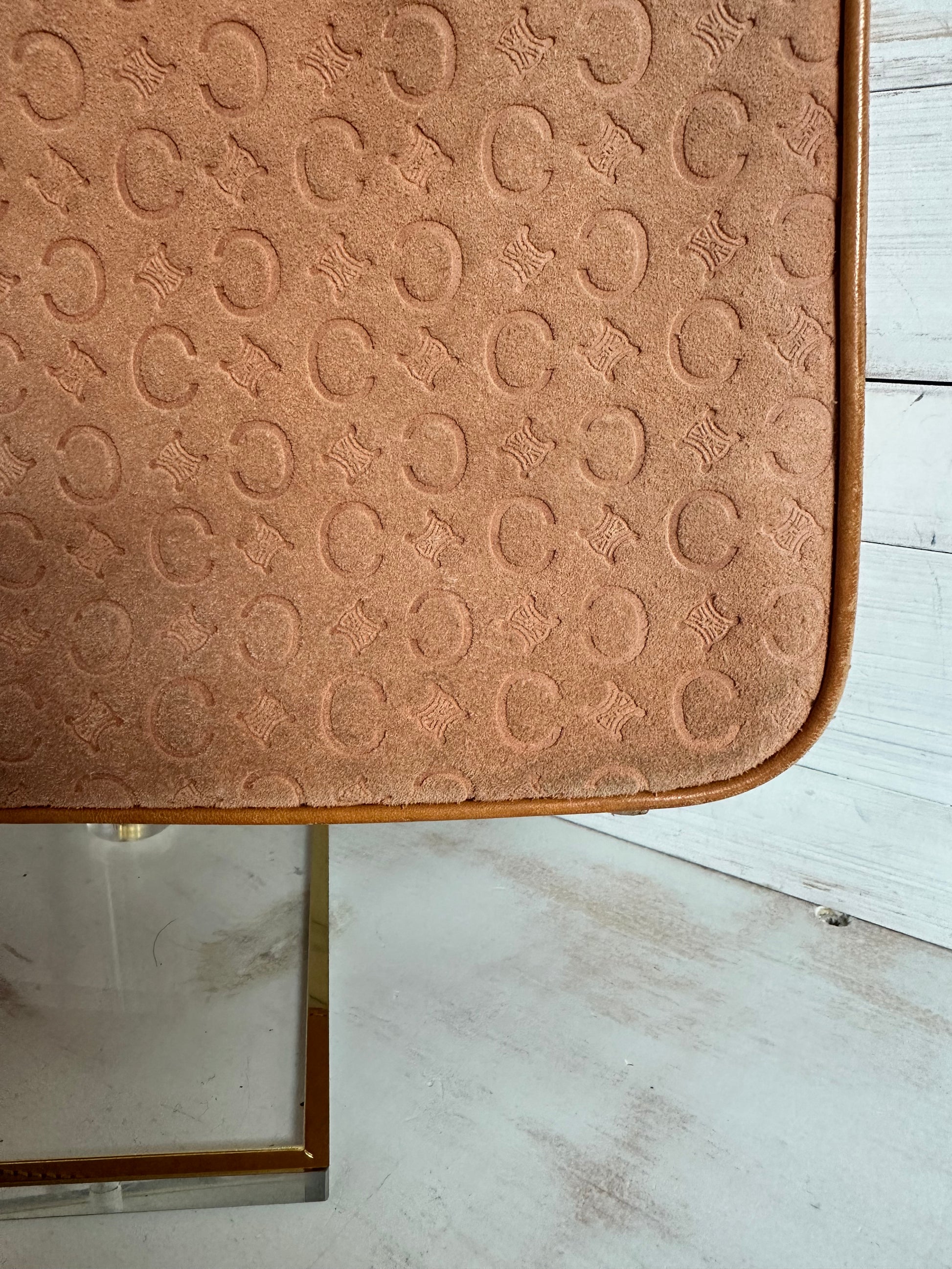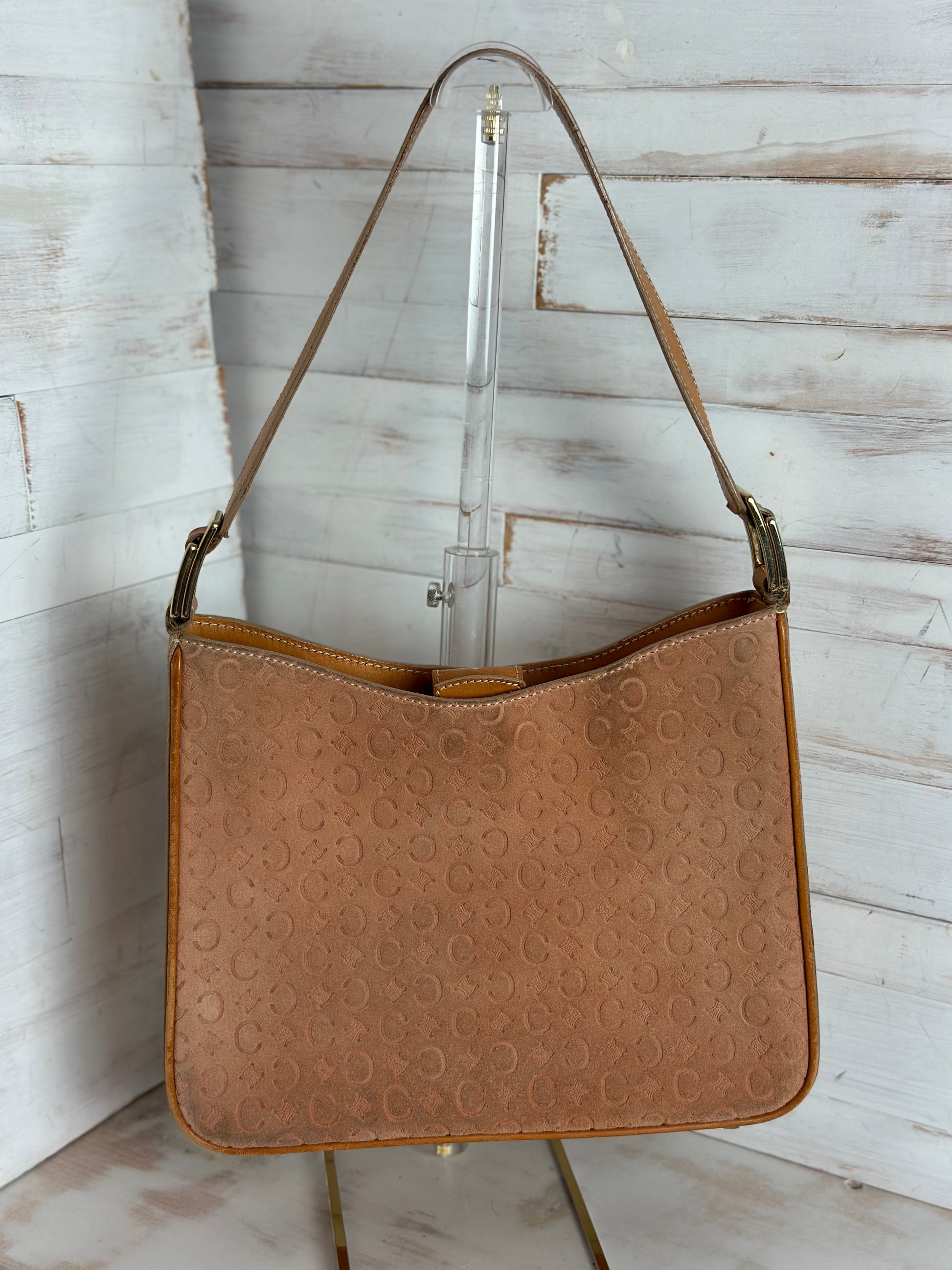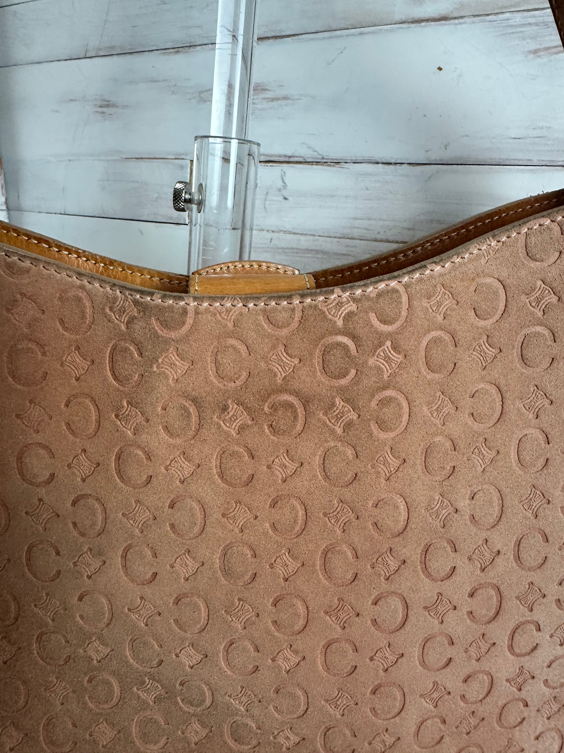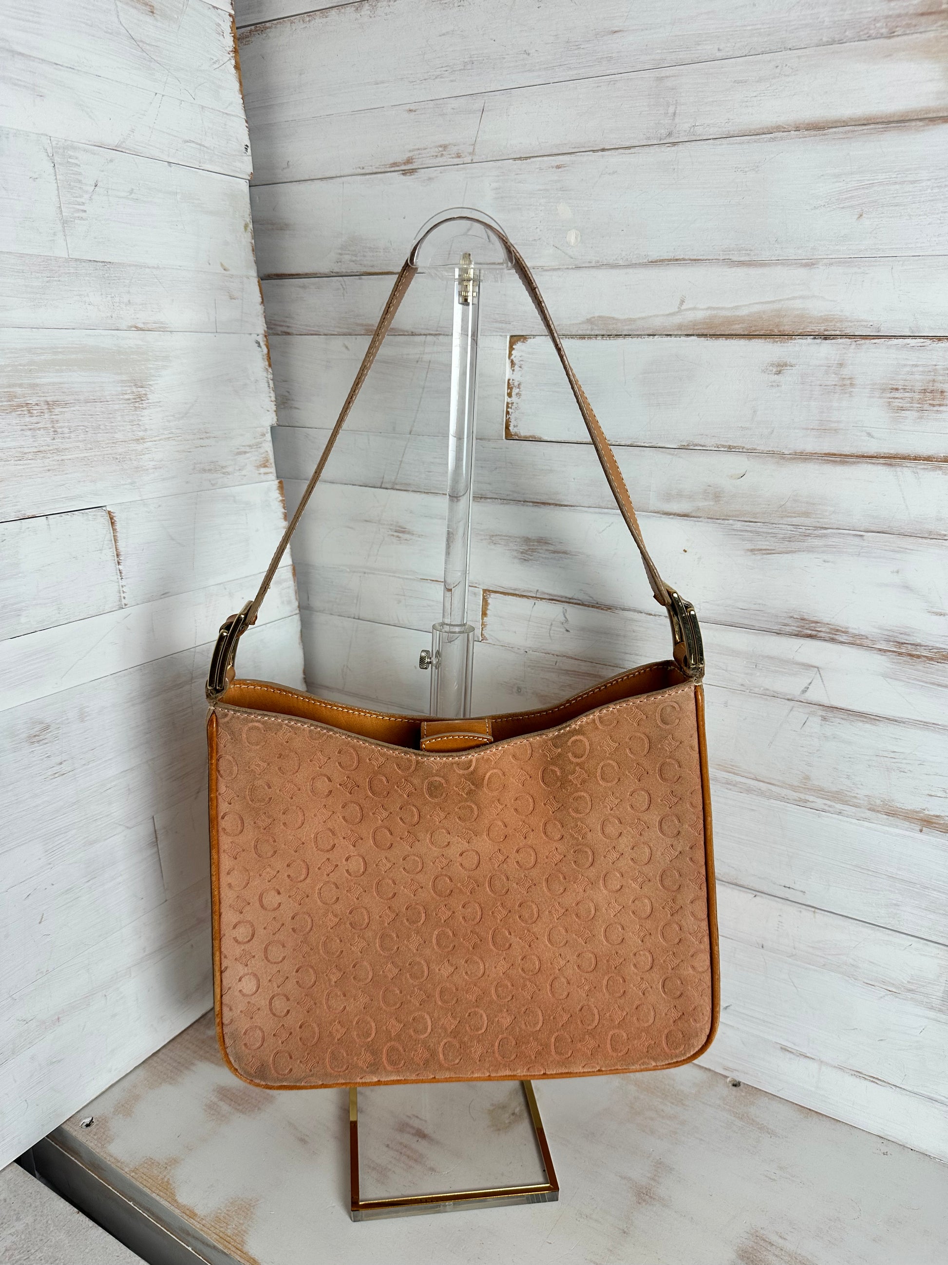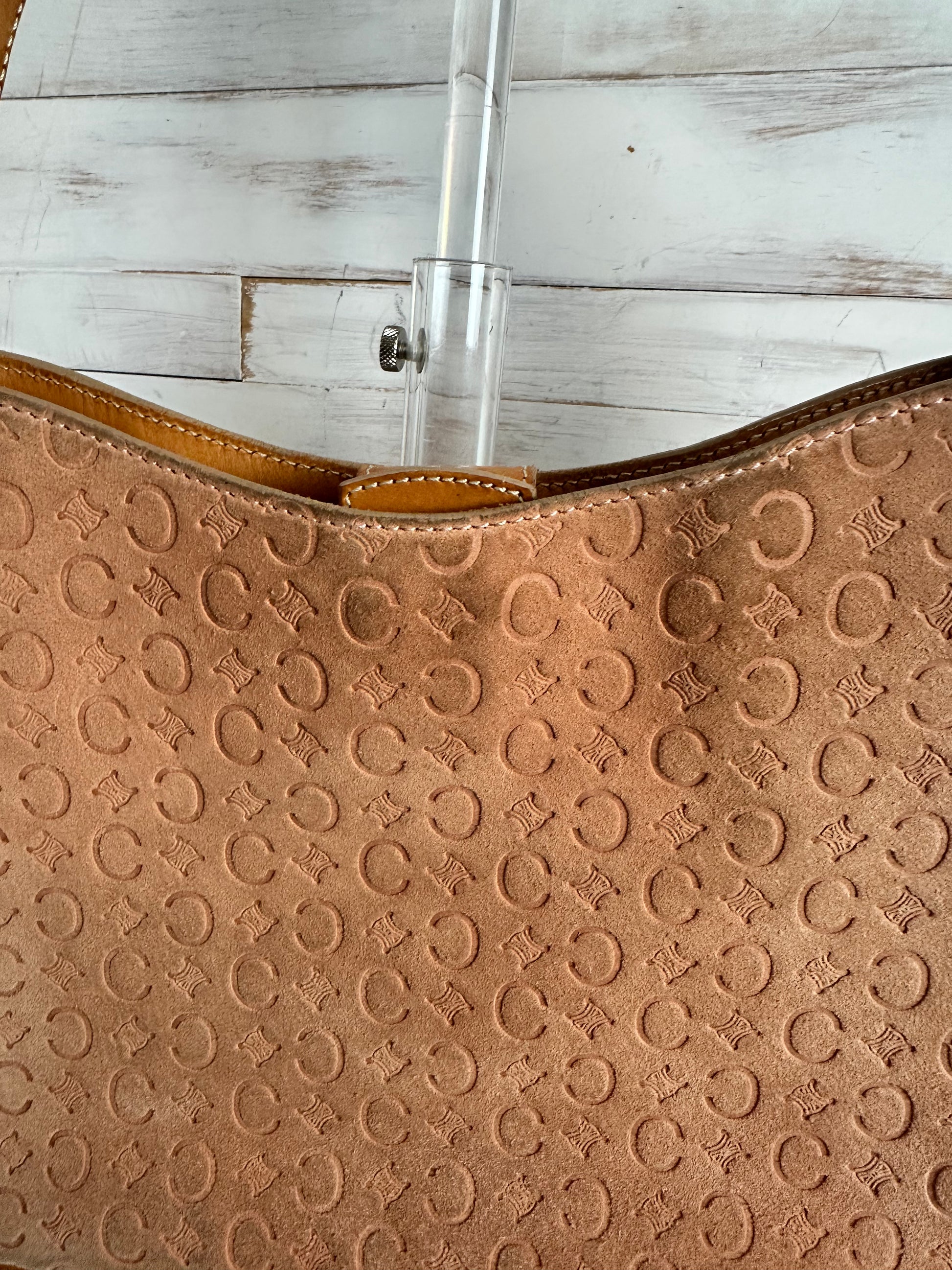 This is a Vintage Celine shoulder bag from circa 2001 featuring a luxurious salmon-colored suede with embossed monogram leather accents, creating a soft, sophisticated silhouette with a subtle statement. This bag is in good overall condition, though there is visible signs of wear and dirt on the suede (see photos) consistent with its vintage nature. The leather details and hardware are in good shape, and the corners show no major damage.