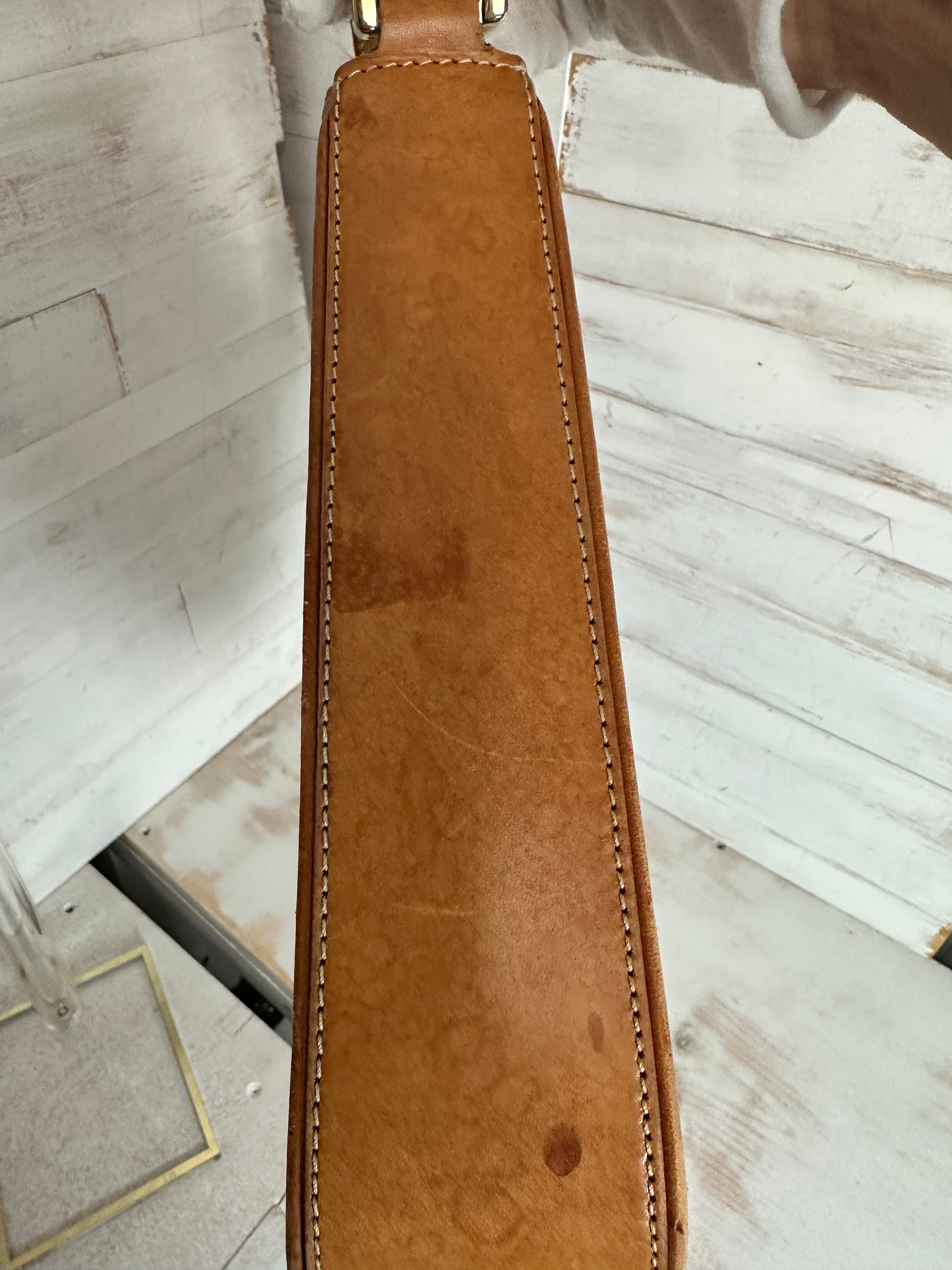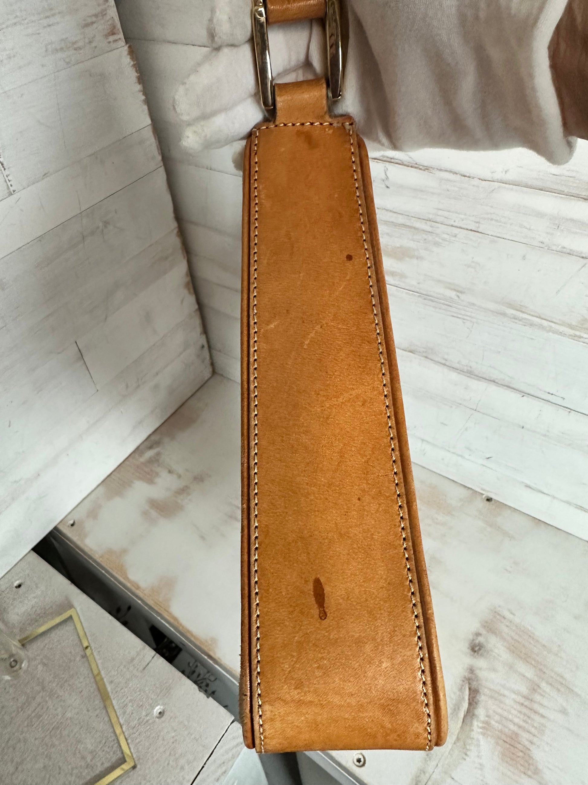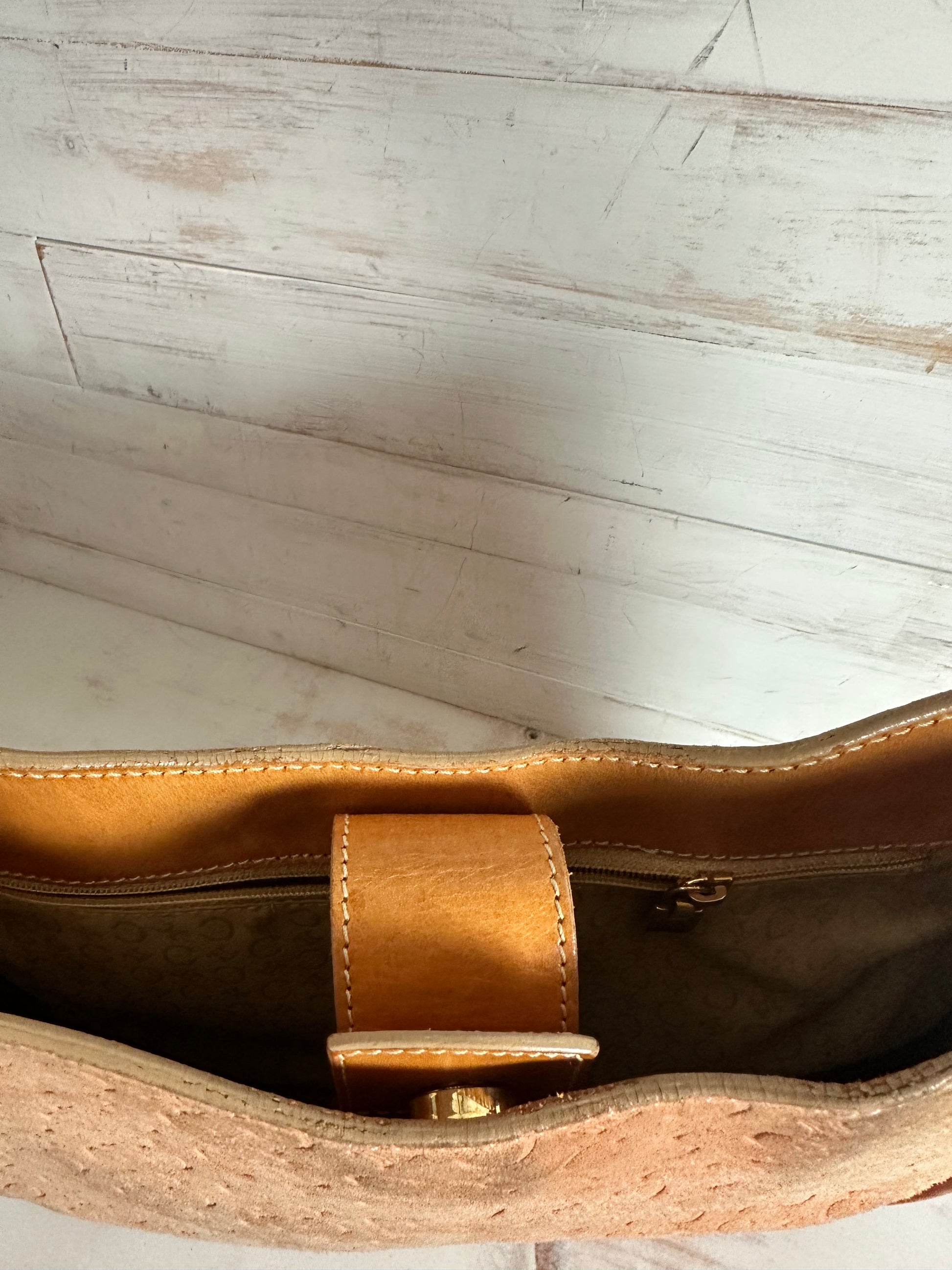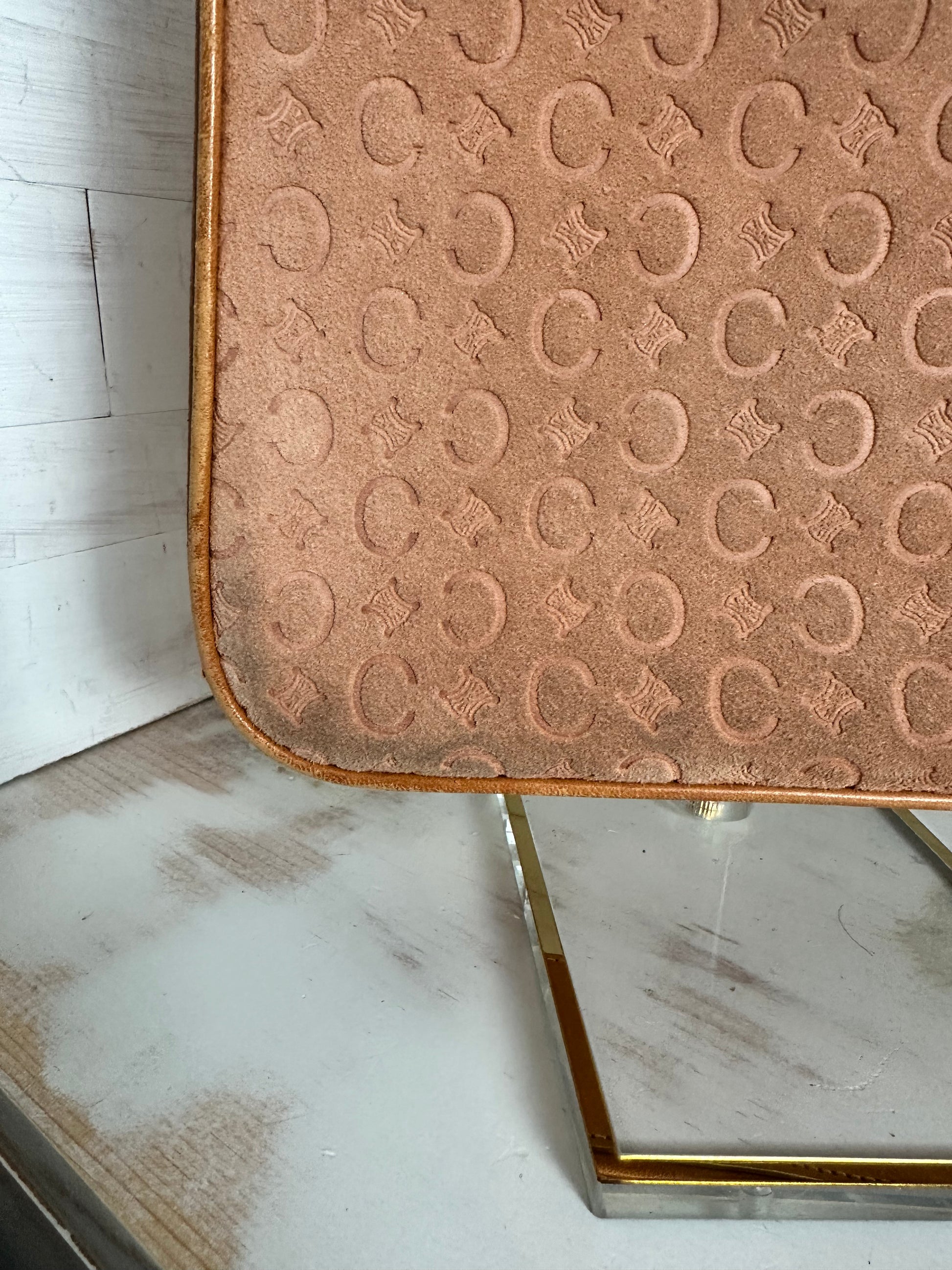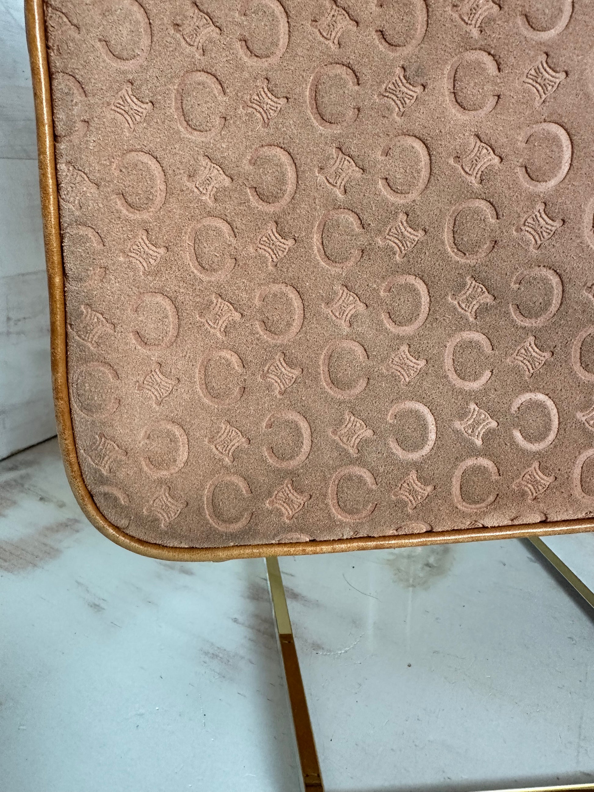 This is a Vintage Celine shoulder bag from circa 2001 featuring a luxurious salmon-colored suede with embossed monogram leather accents, creating a soft, sophisticated silhouette with a subtle statement. This bag is in good overall condition, though there is visible signs of wear and dirt on the suede (see photos) consistent with its vintage nature. The leather details and hardware are in good shape, and the corners show no major damage.