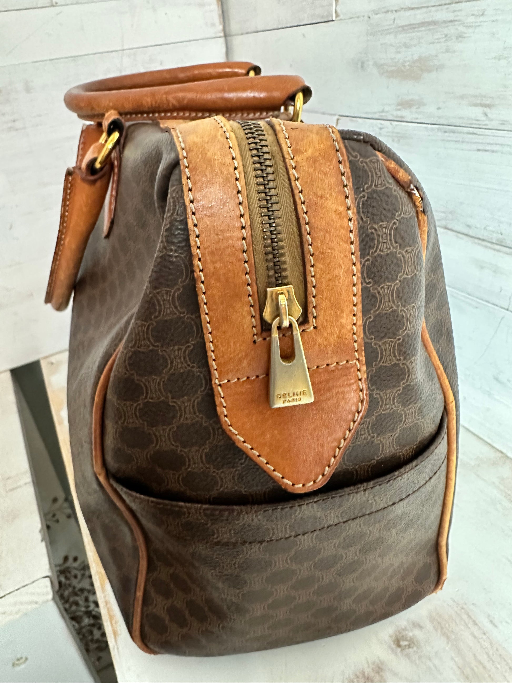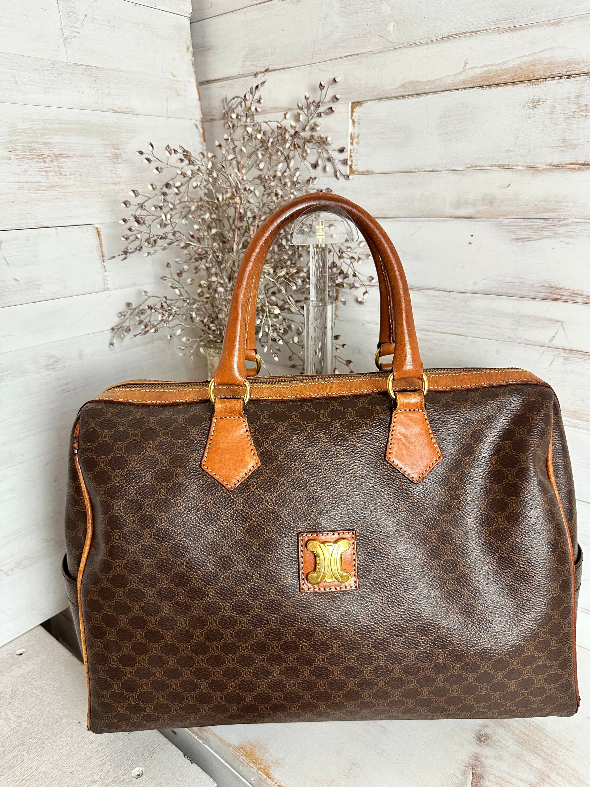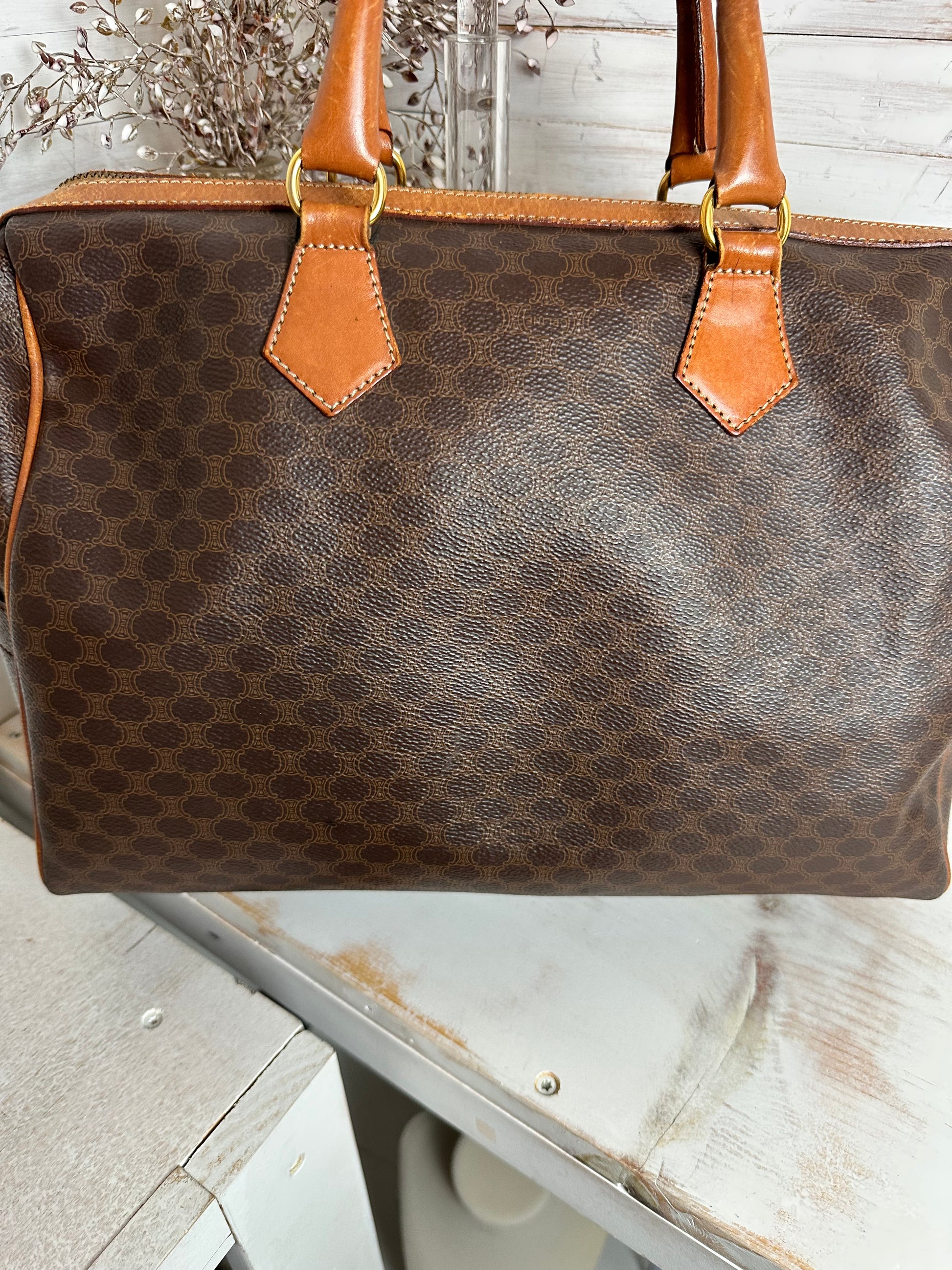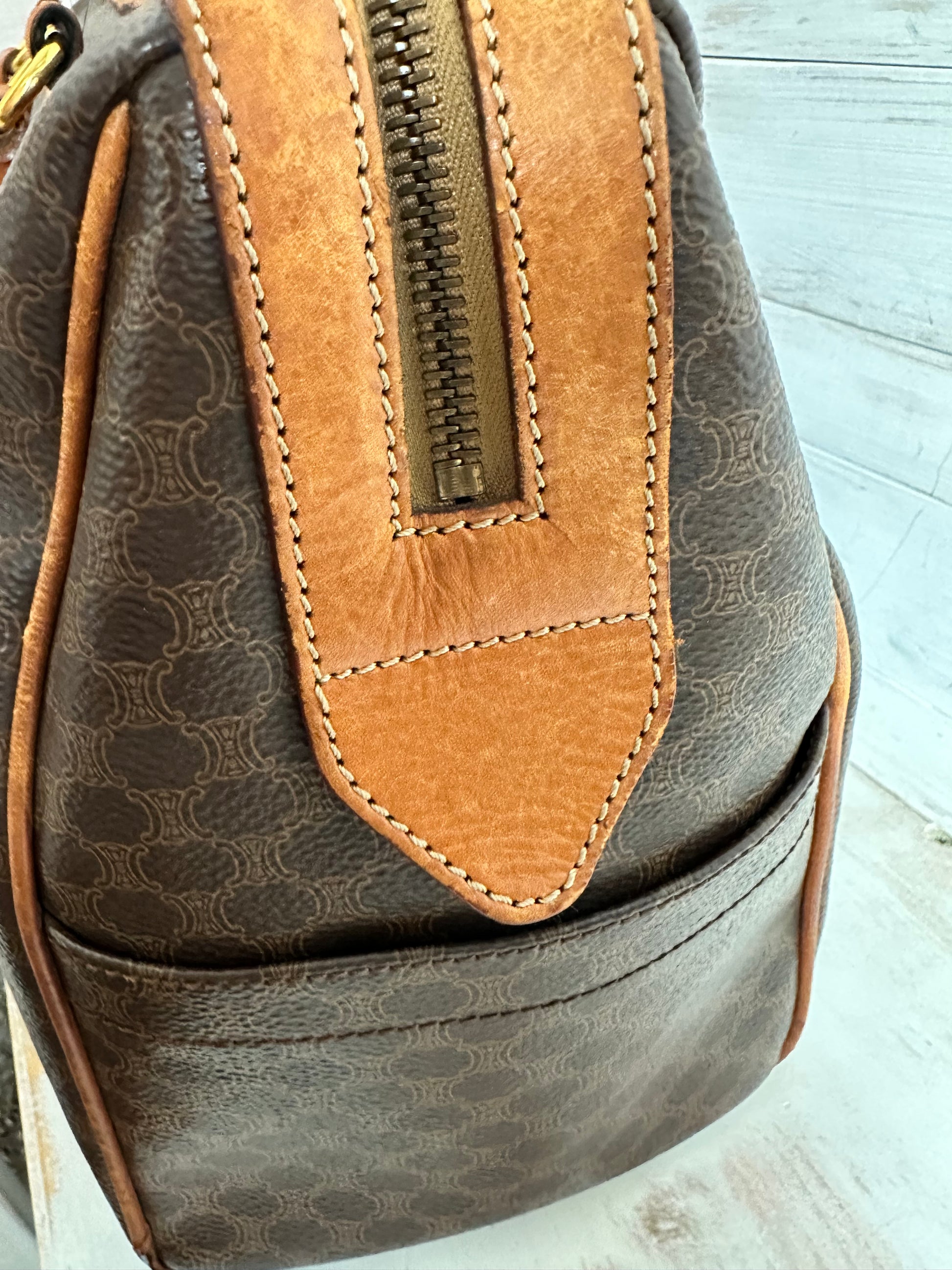 Celine Macadam Boston Bag in a brown canvas. Double top rolled leather handles with strong joints. Exterior features a side pocket. Please note there is patina to the leather. Rubbing noted on the corners and upper right side. Interior is clean, featuring a zipper pouch and two open pouches. Comes with a COA.