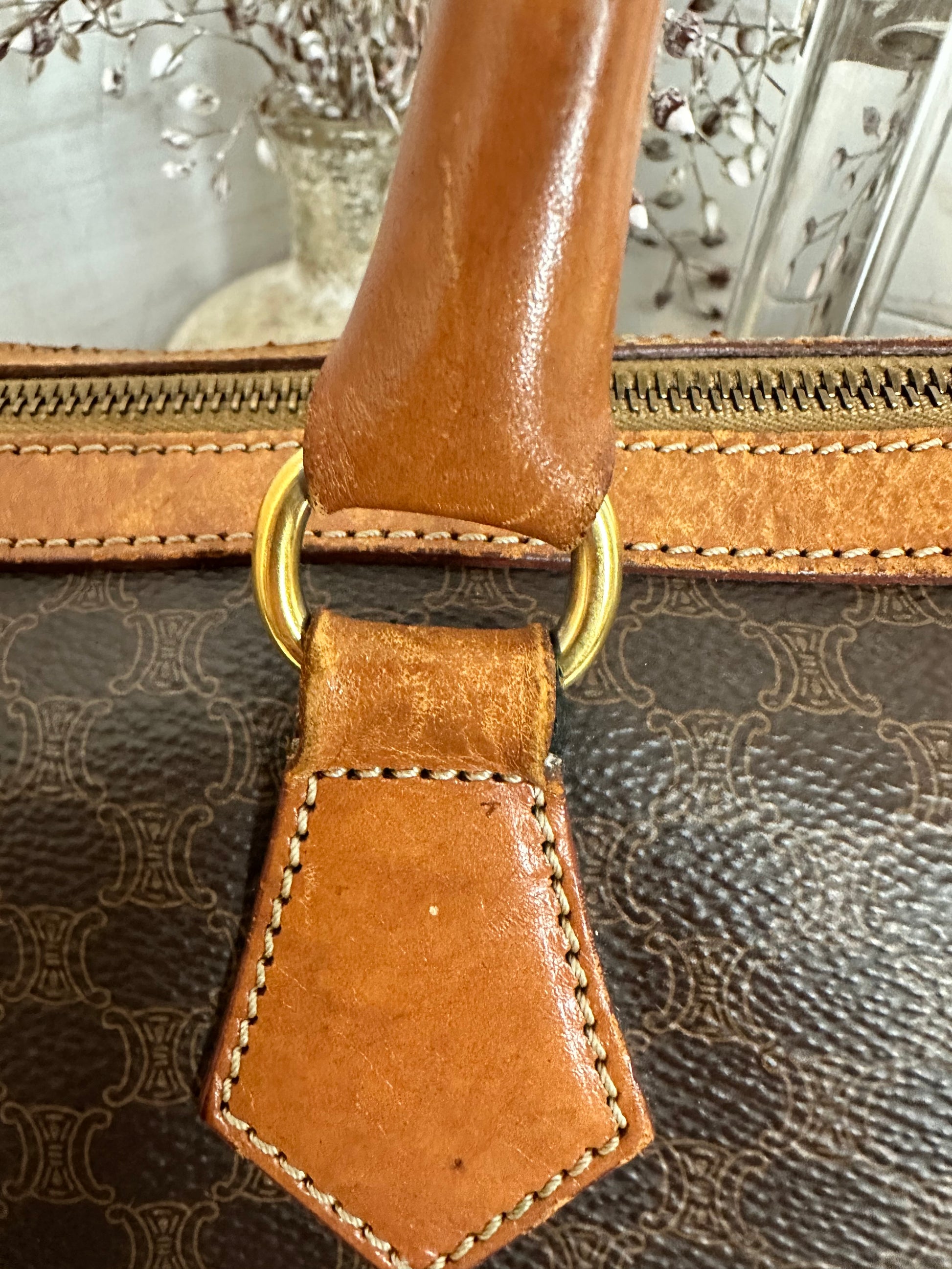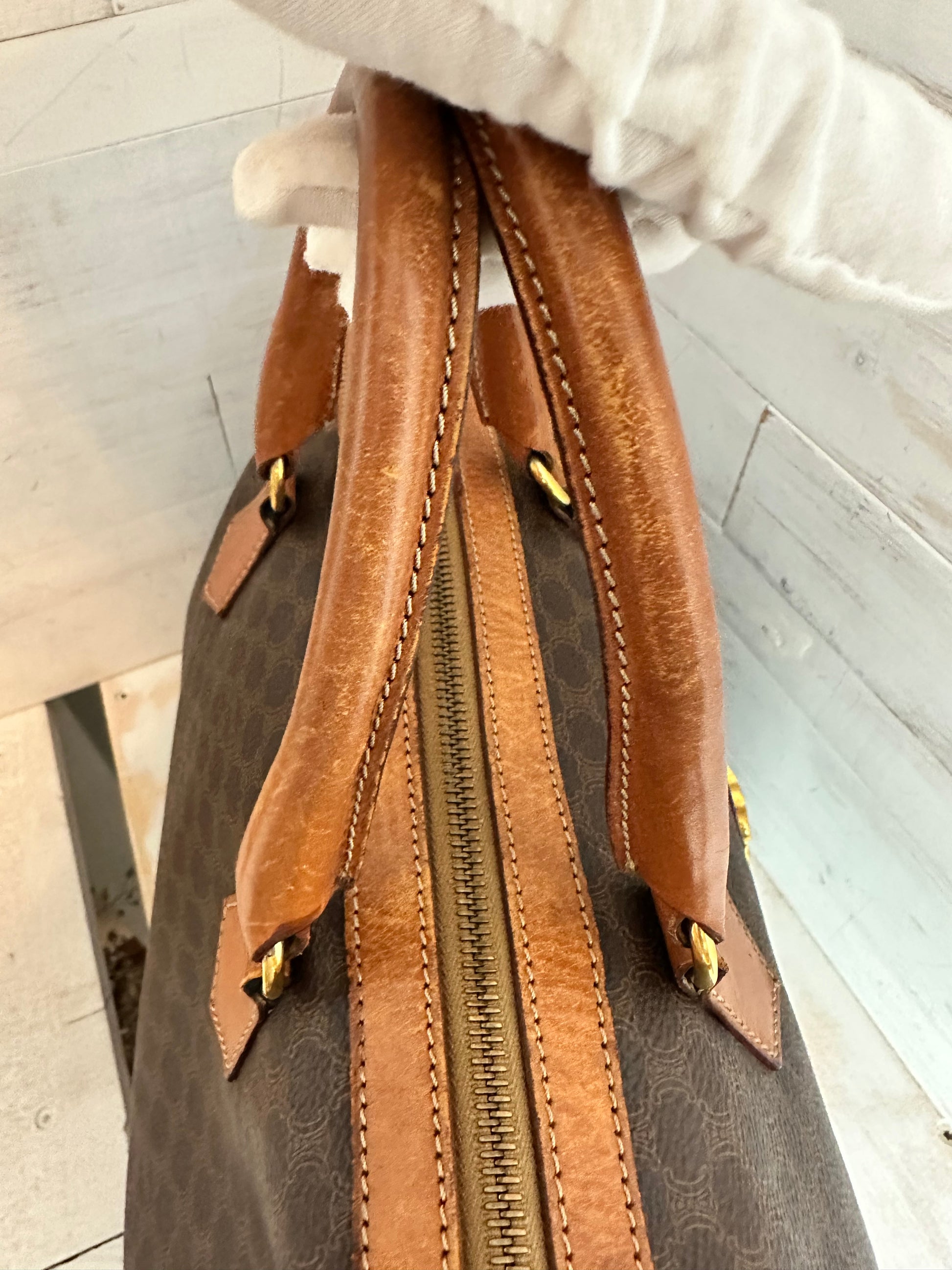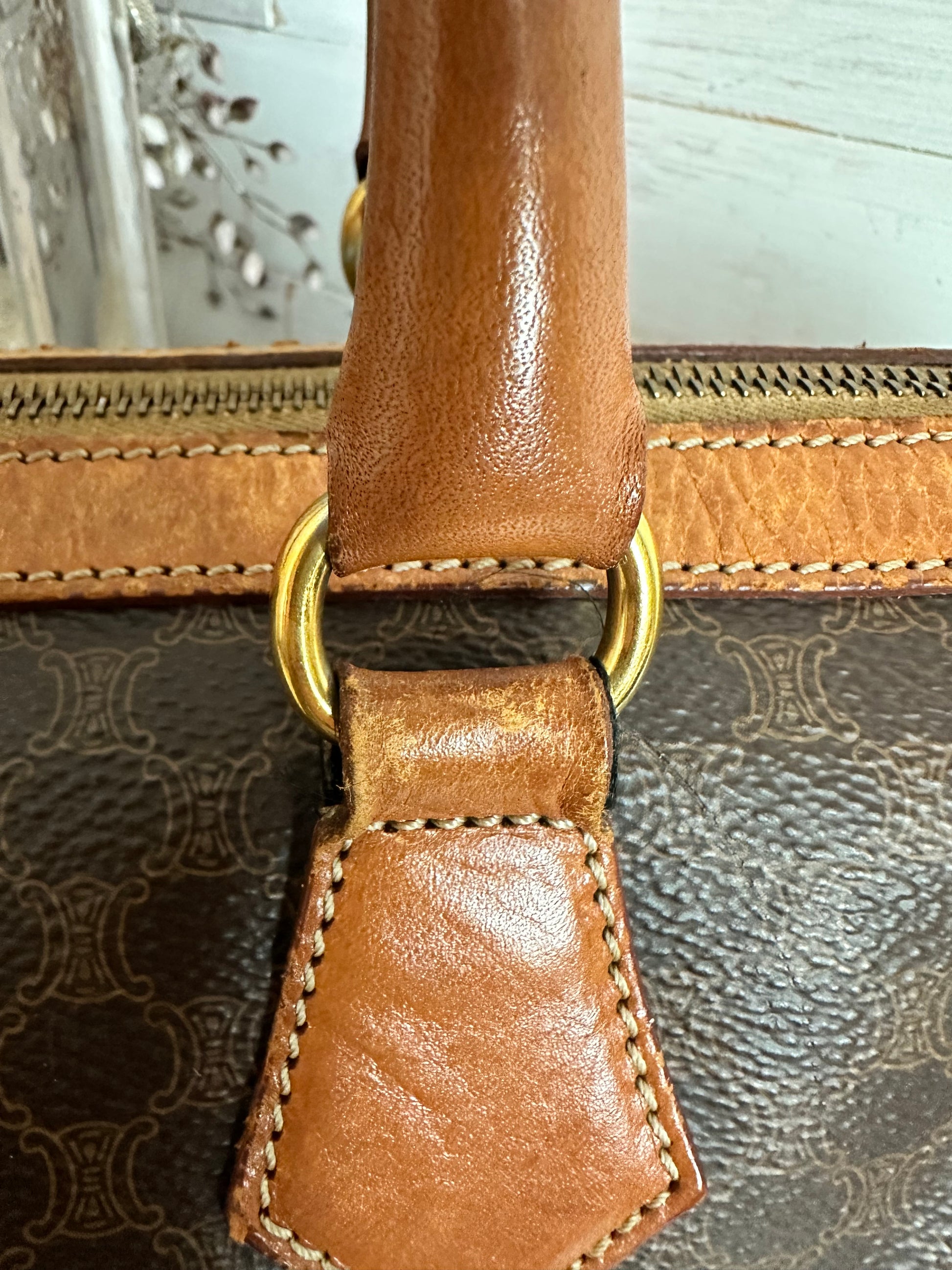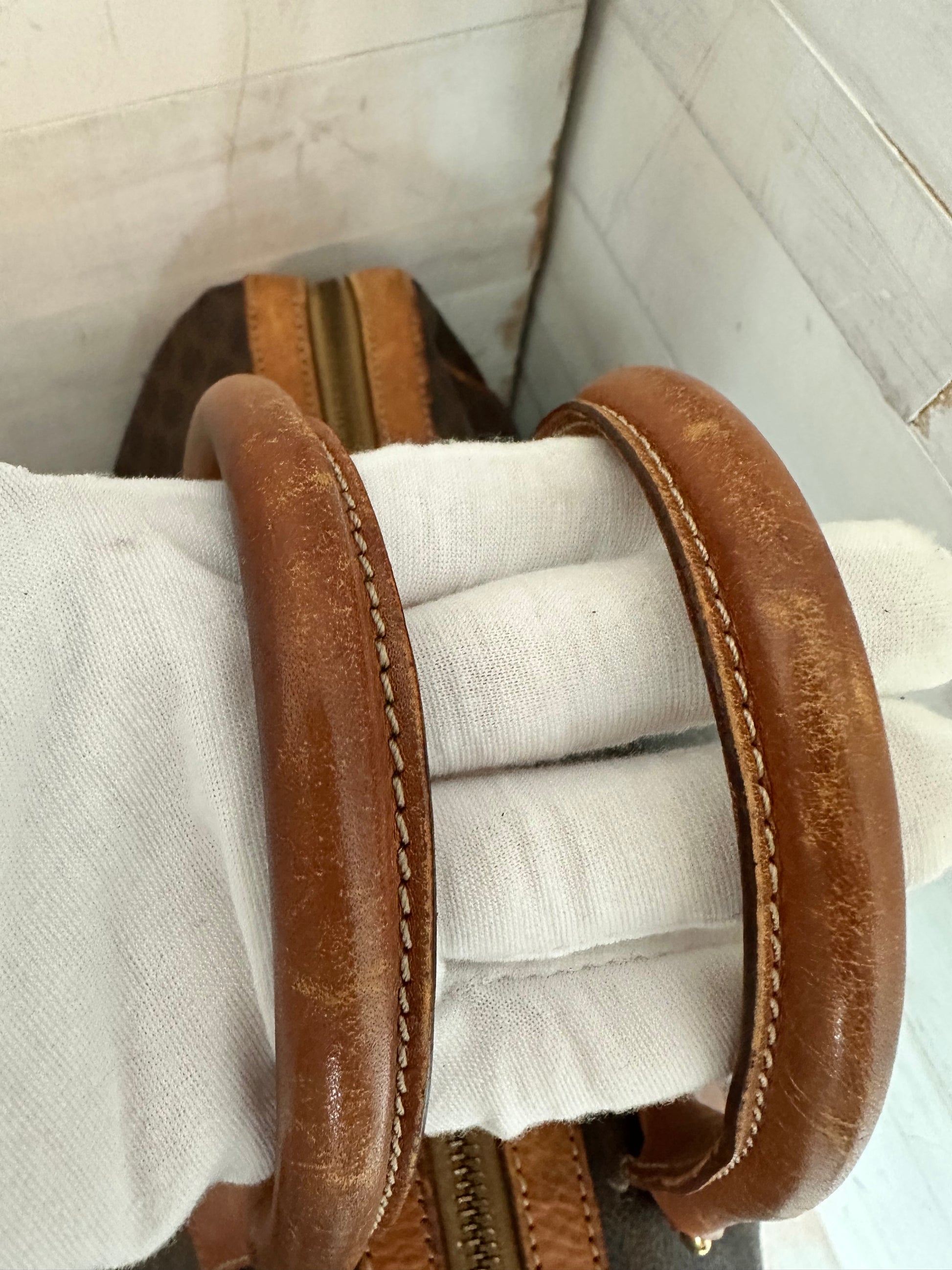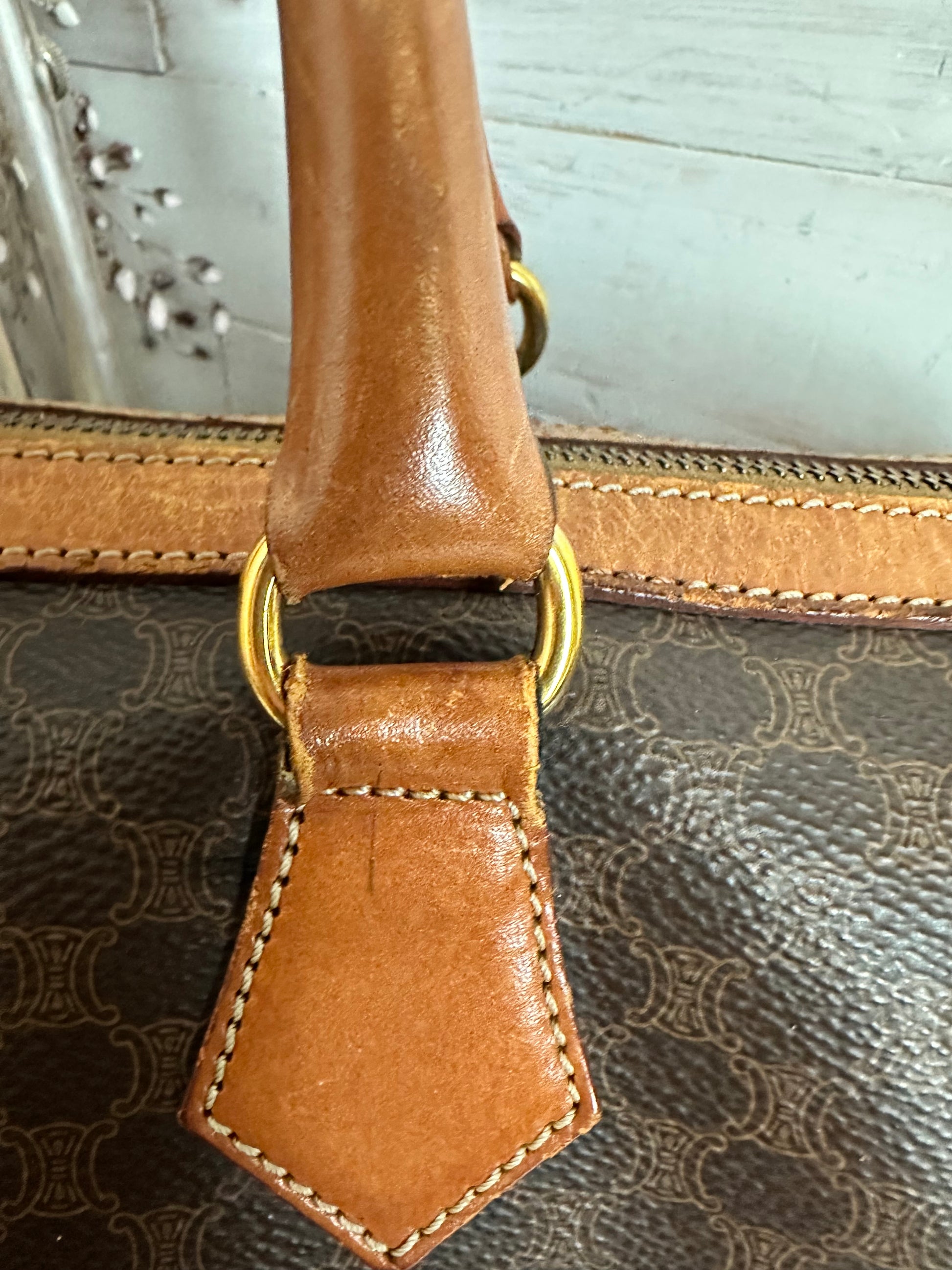 Celine Macadam Boston Bag in a brown canvas. Double top rolled leather handles with strong joints. Exterior features a side pocket. Please note there is patina to the leather. Rubbing noted on the corners and upper right side. Interior is clean, featuring a zipper pouch and two open pouches. Comes with a COA.