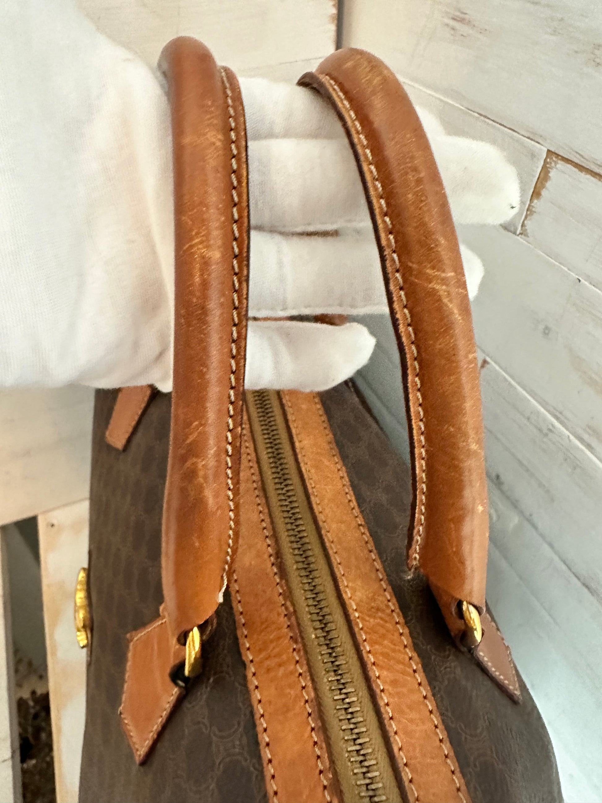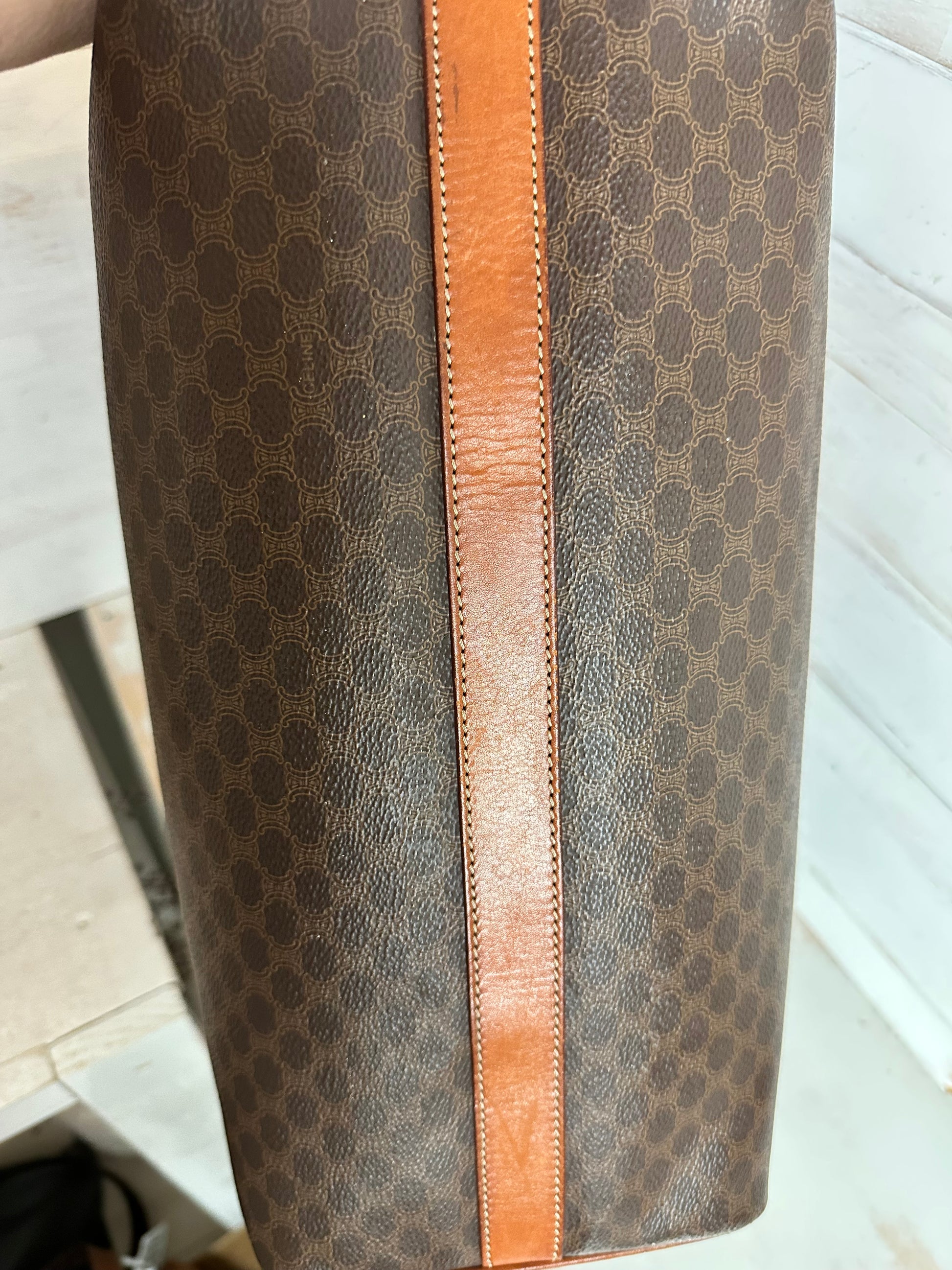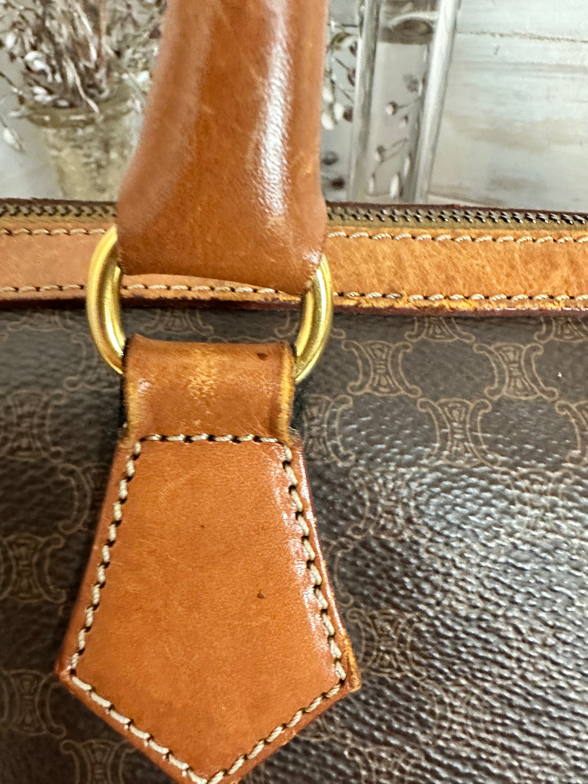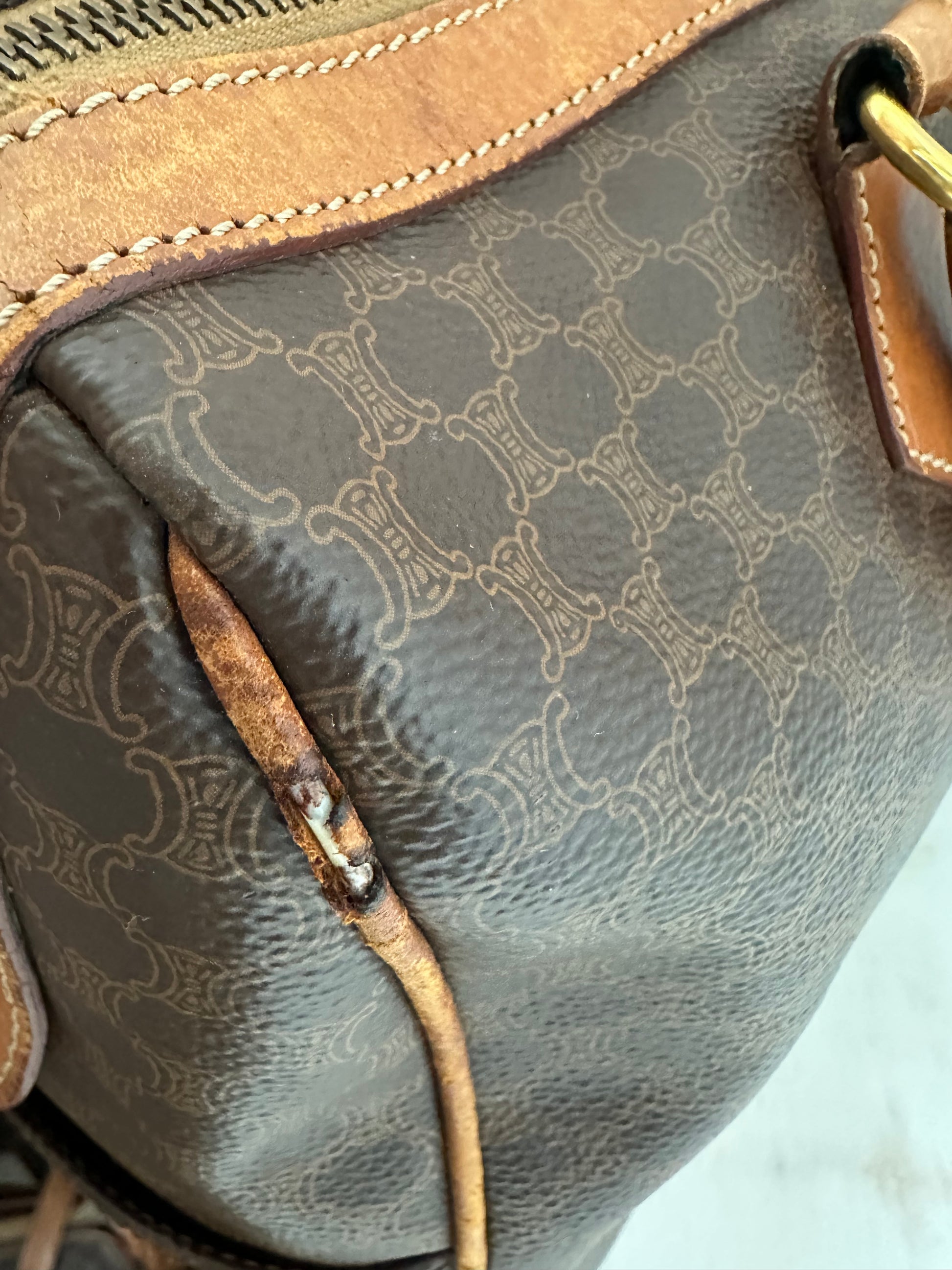 Celine Macadam Boston Bag in a brown canvas. Double top rolled leather handles with strong joints. Exterior features a side pocket. Please note there is patina to the leather. Rubbing noted on the corners and upper right side. Interior is clean, featuring a zipper pouch and two open pouches. Comes with a COA.