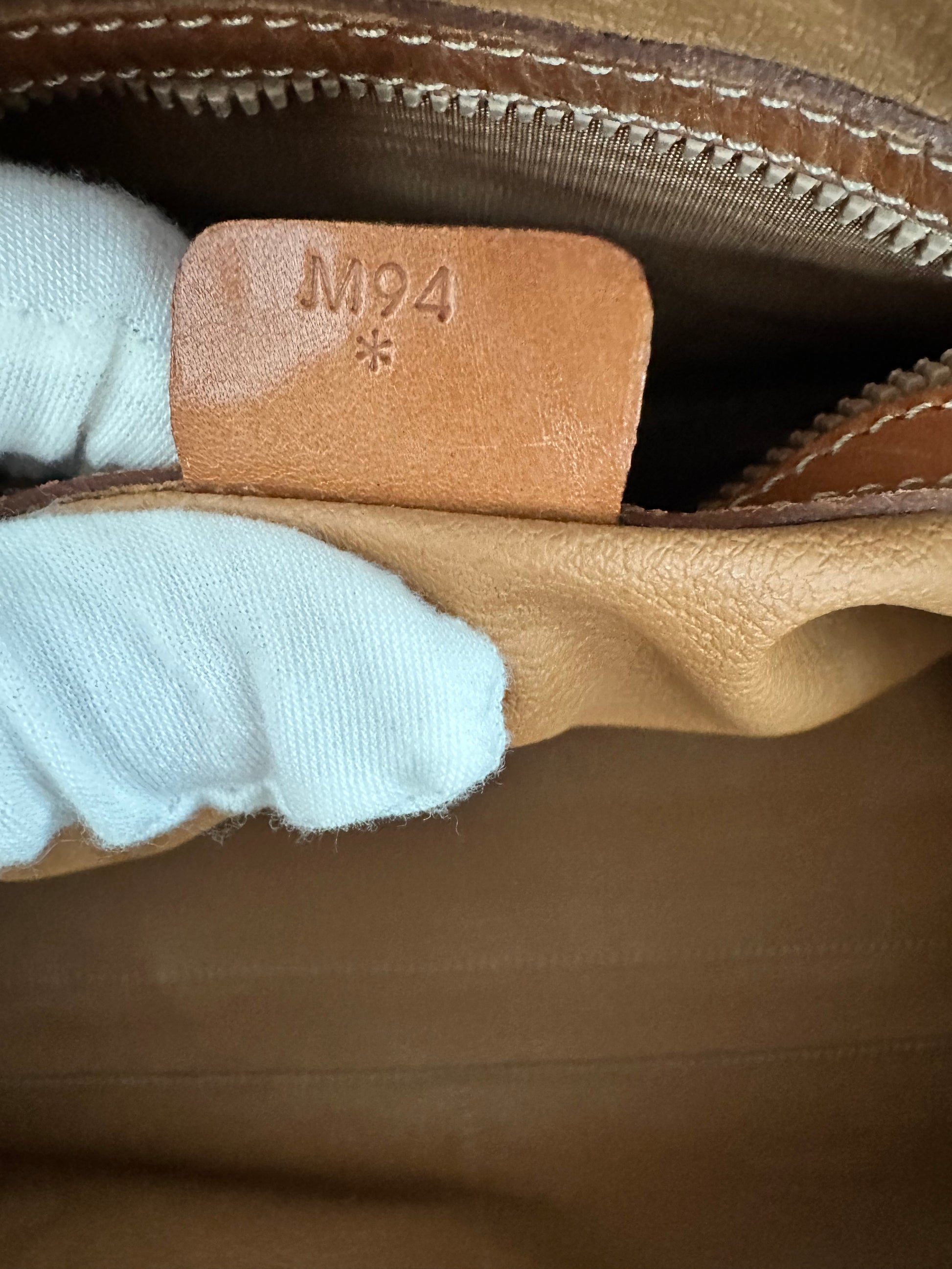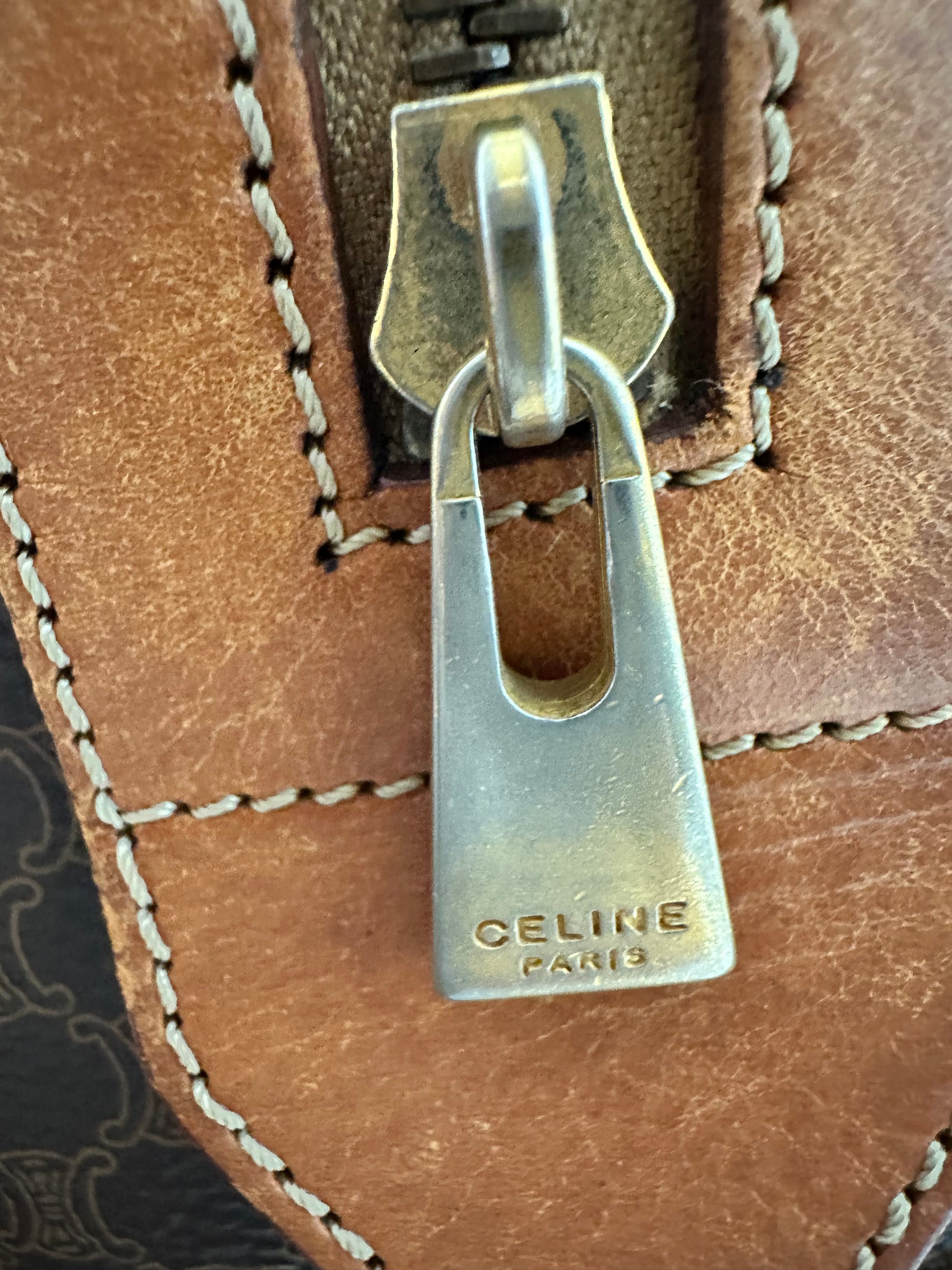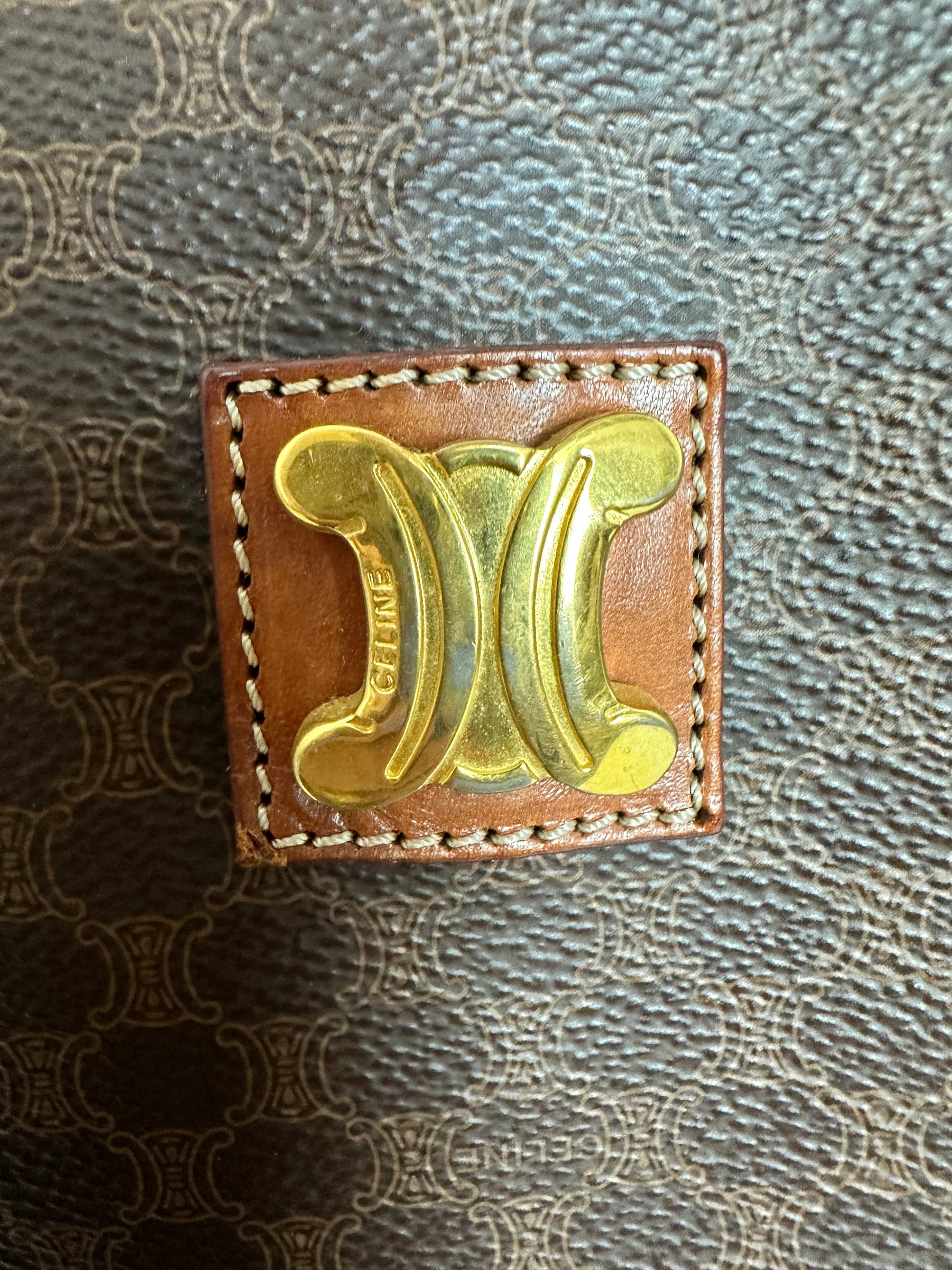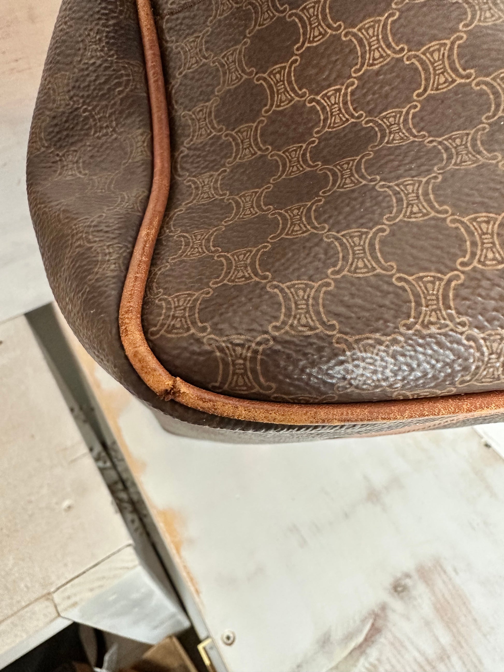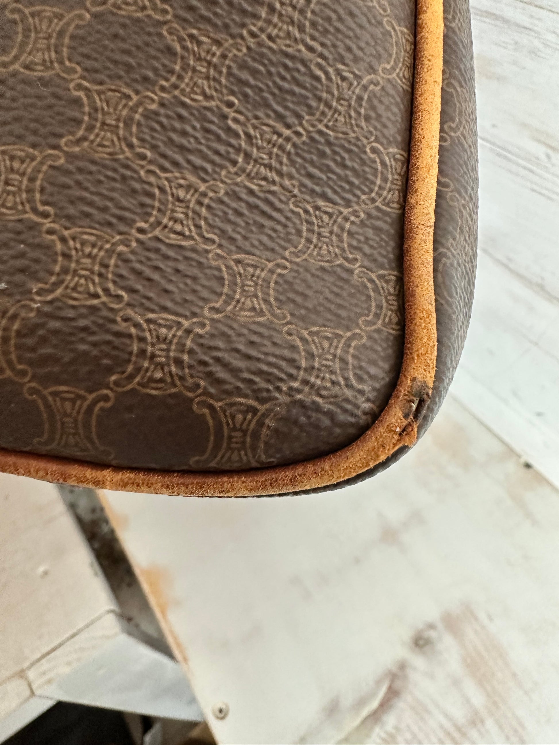 Celine Macadam Boston Bag in a brown canvas. Double top rolled leather handles with strong joints. Exterior features a side pocket. Please note there is patina to the leather. Rubbing noted on the corners and upper right side. Interior is clean, featuring a zipper pouch and two open pouches. Comes with a COA.
