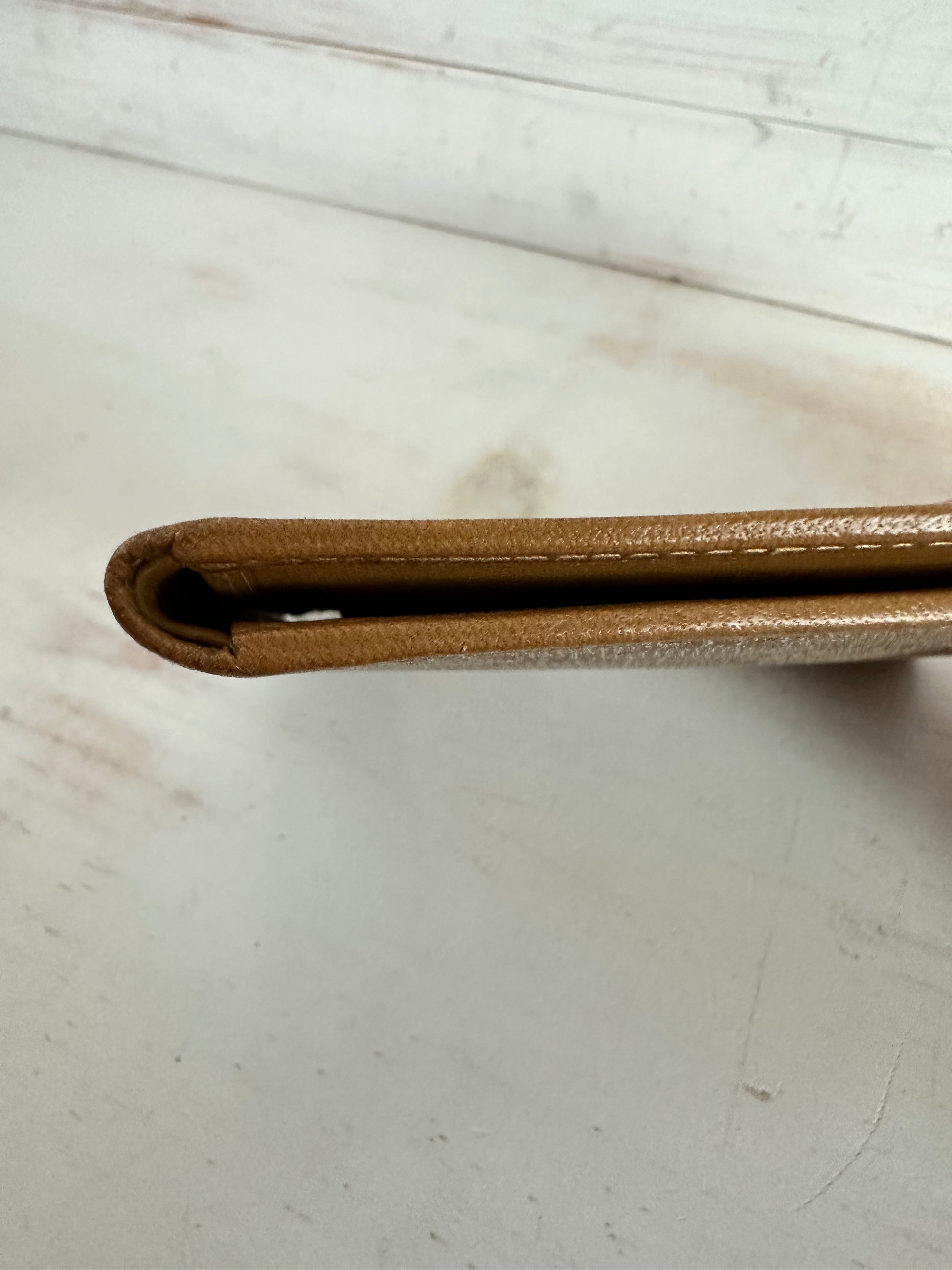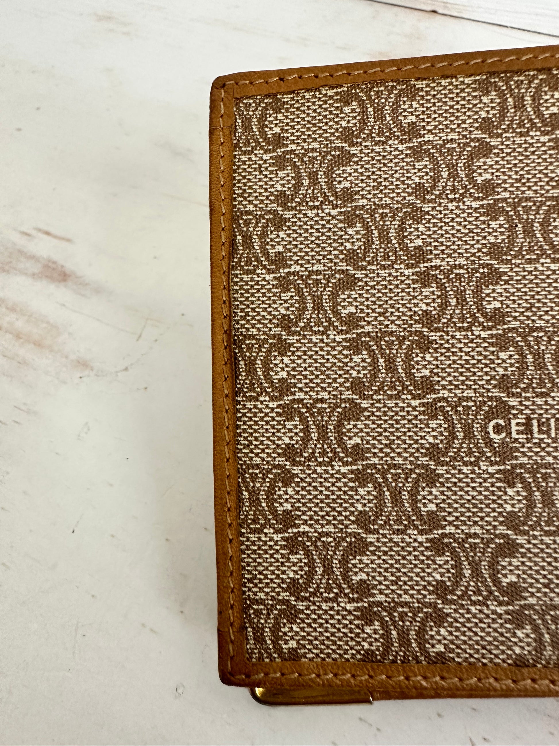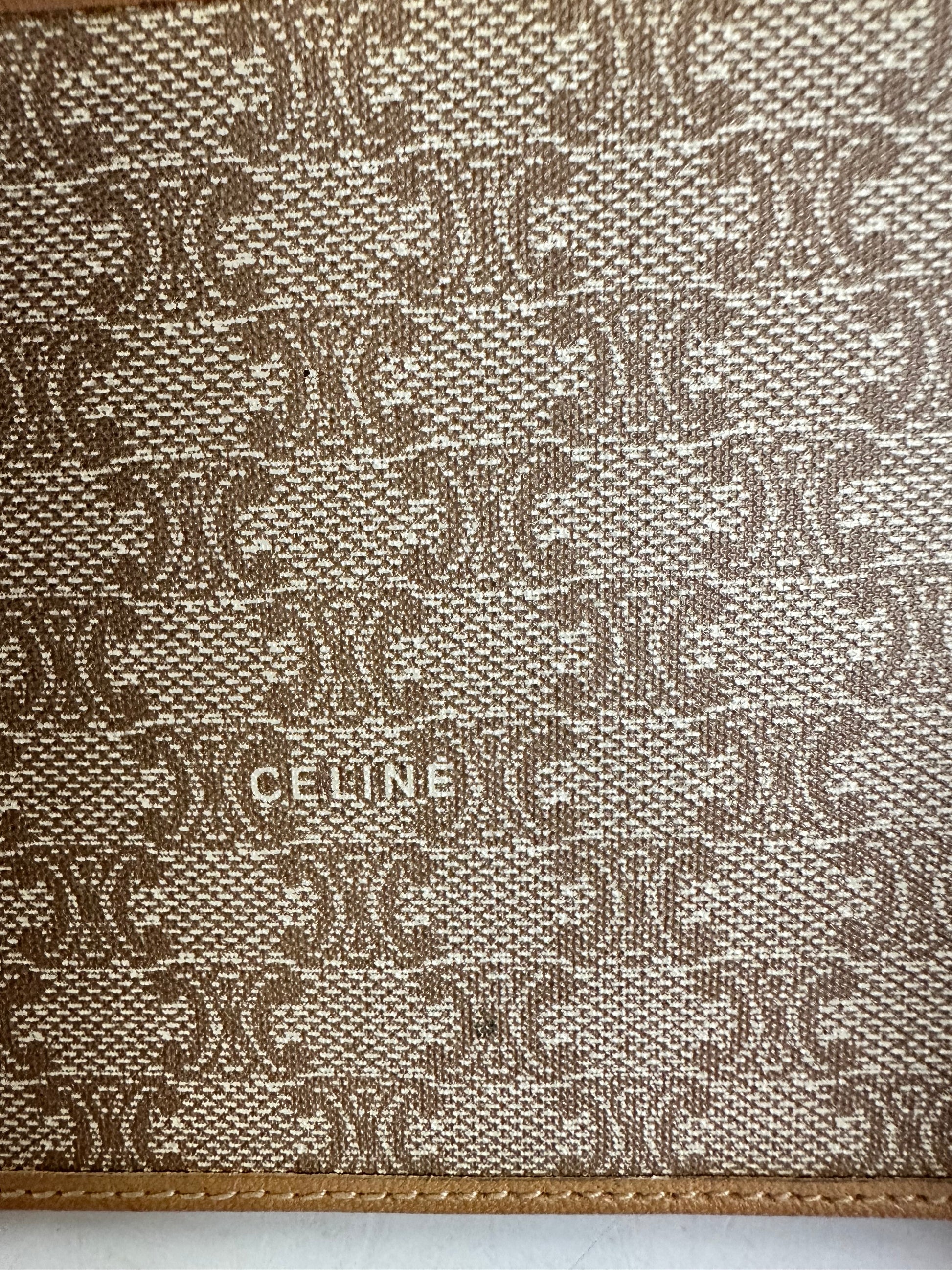 Celine Macadam Bifold Wallet. Coated brown canvas with leather trim and gold tone hardware on corners. Snap pocket closure is strong with clean coin pouch. Please note discoloration under coin flap. No peeling.