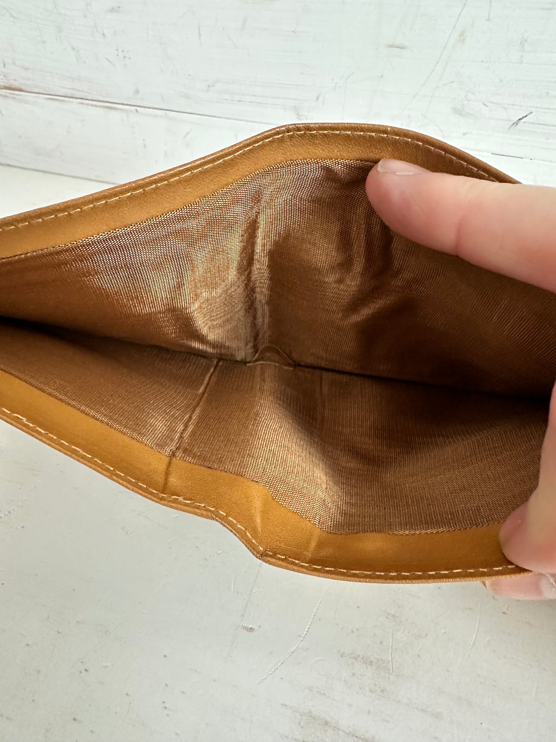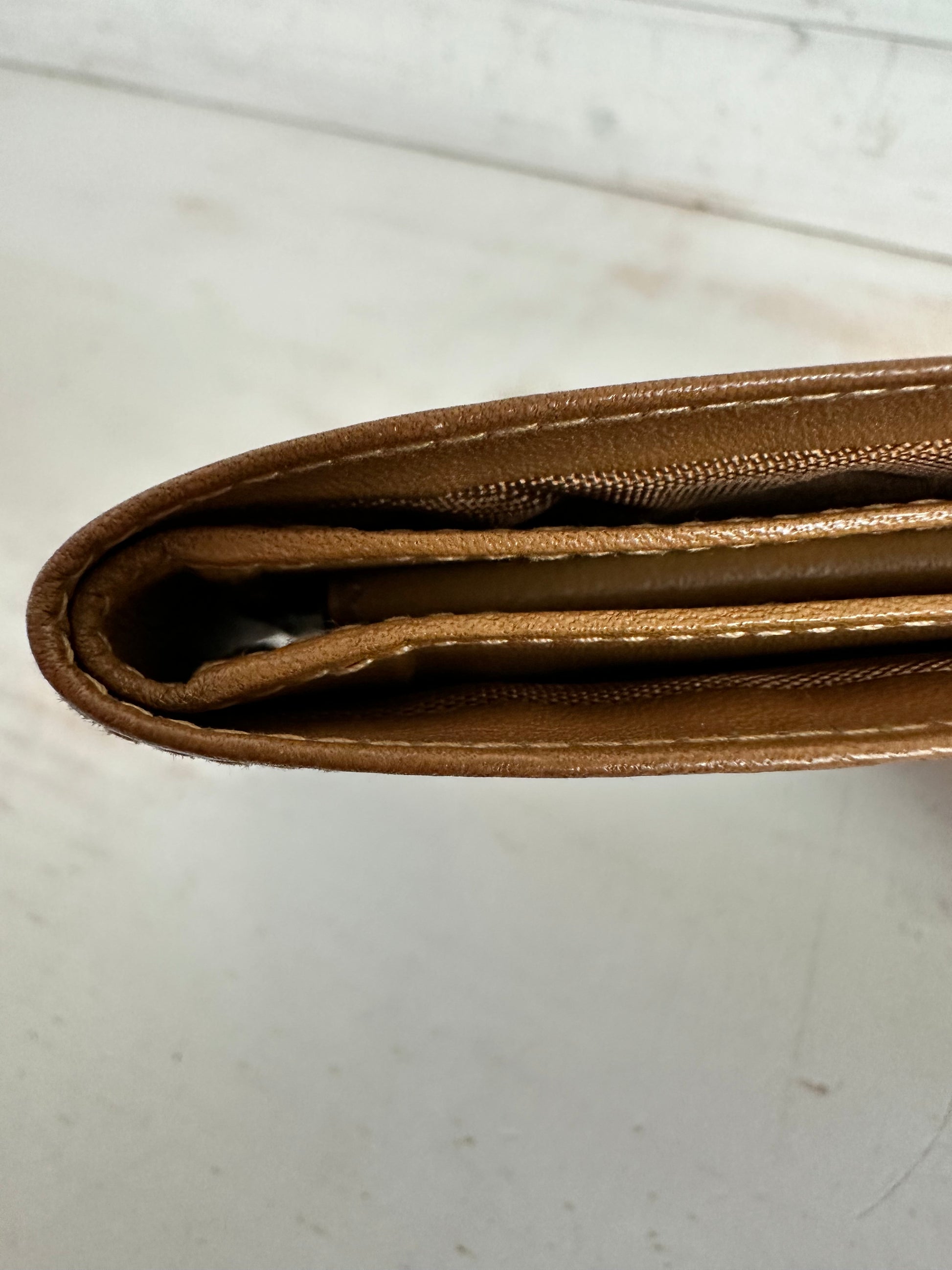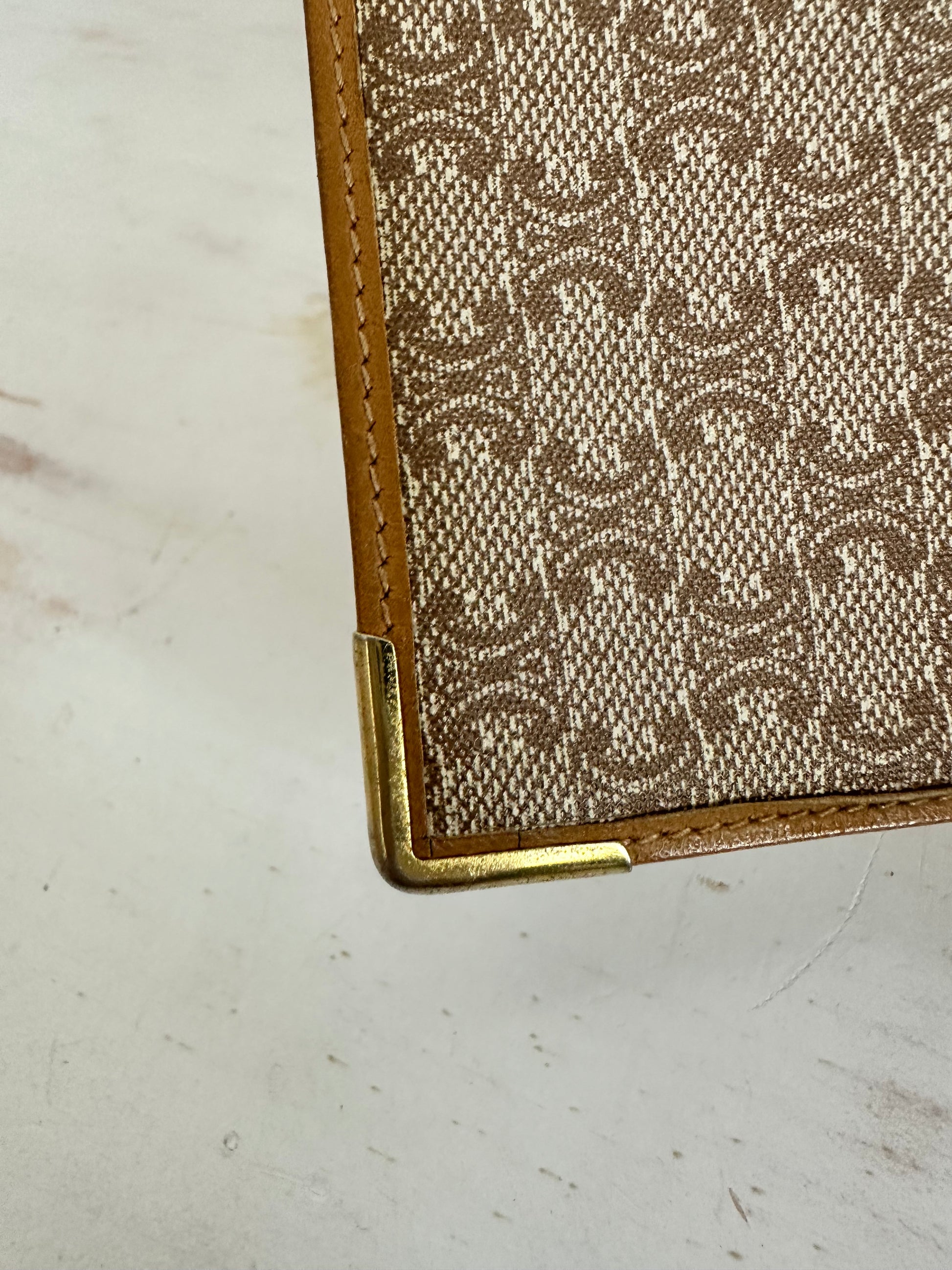 Celine Macadam Bifold Wallet. Coated brown canvas with leather trim and gold tone hardware on corners. Snap pocket closure is strong with clean coin pouch. Please note discoloration under coin flap. No peeling.