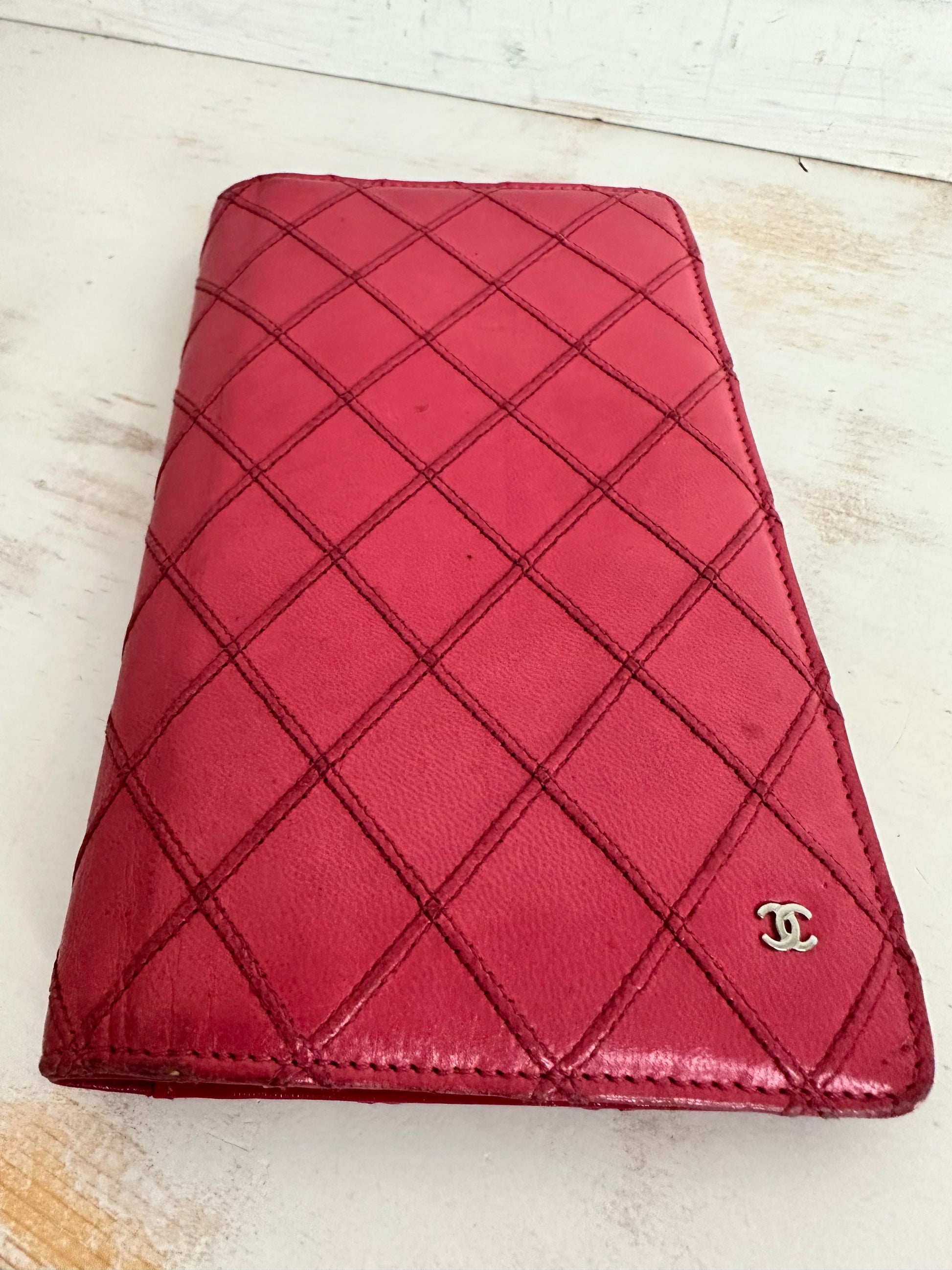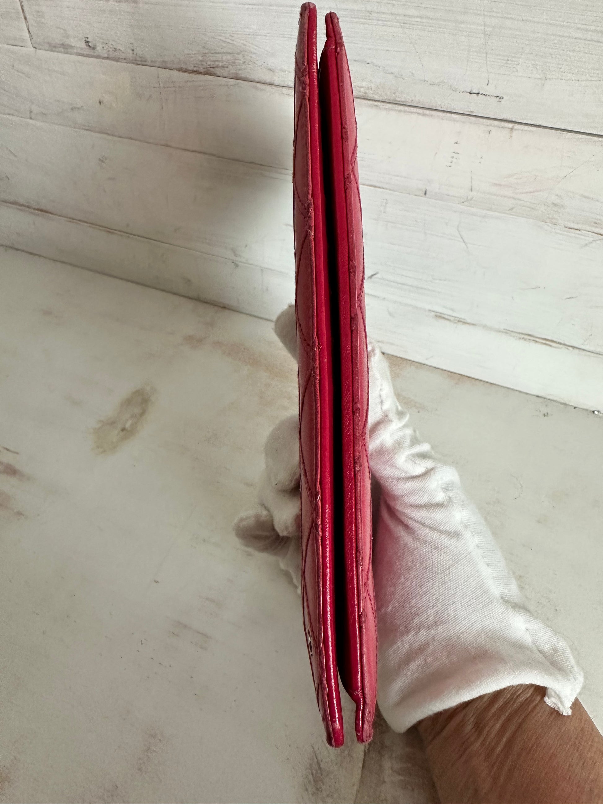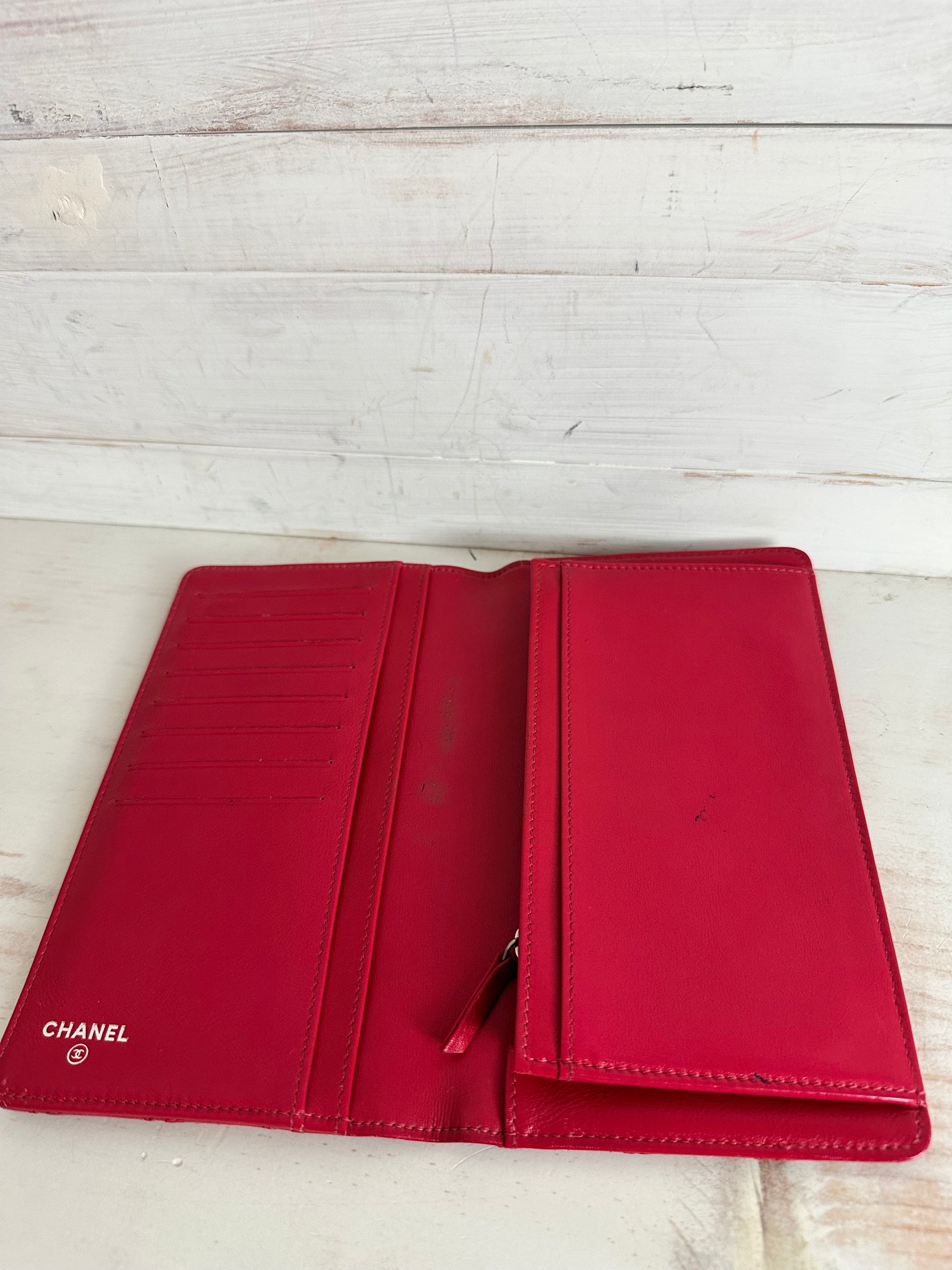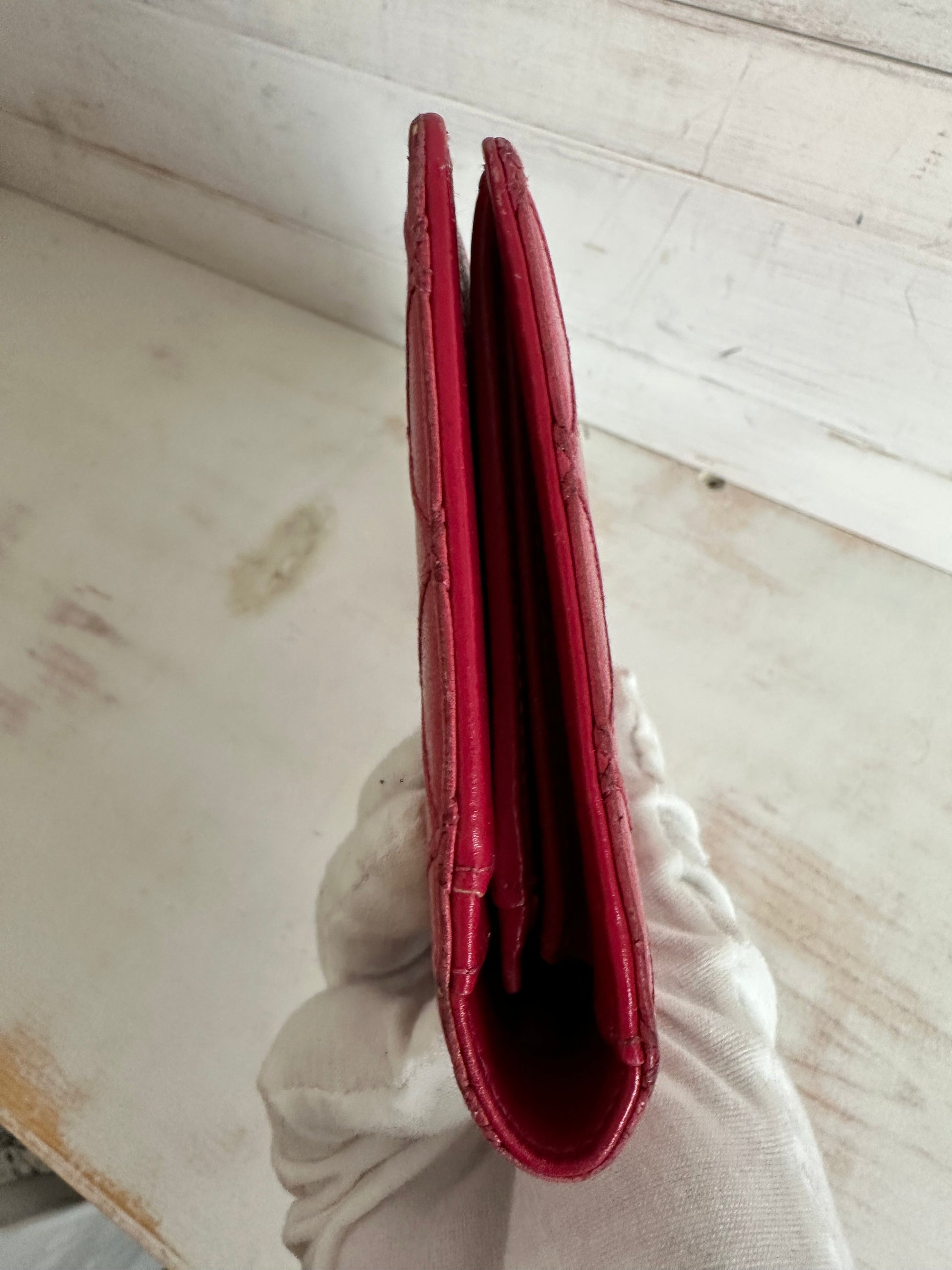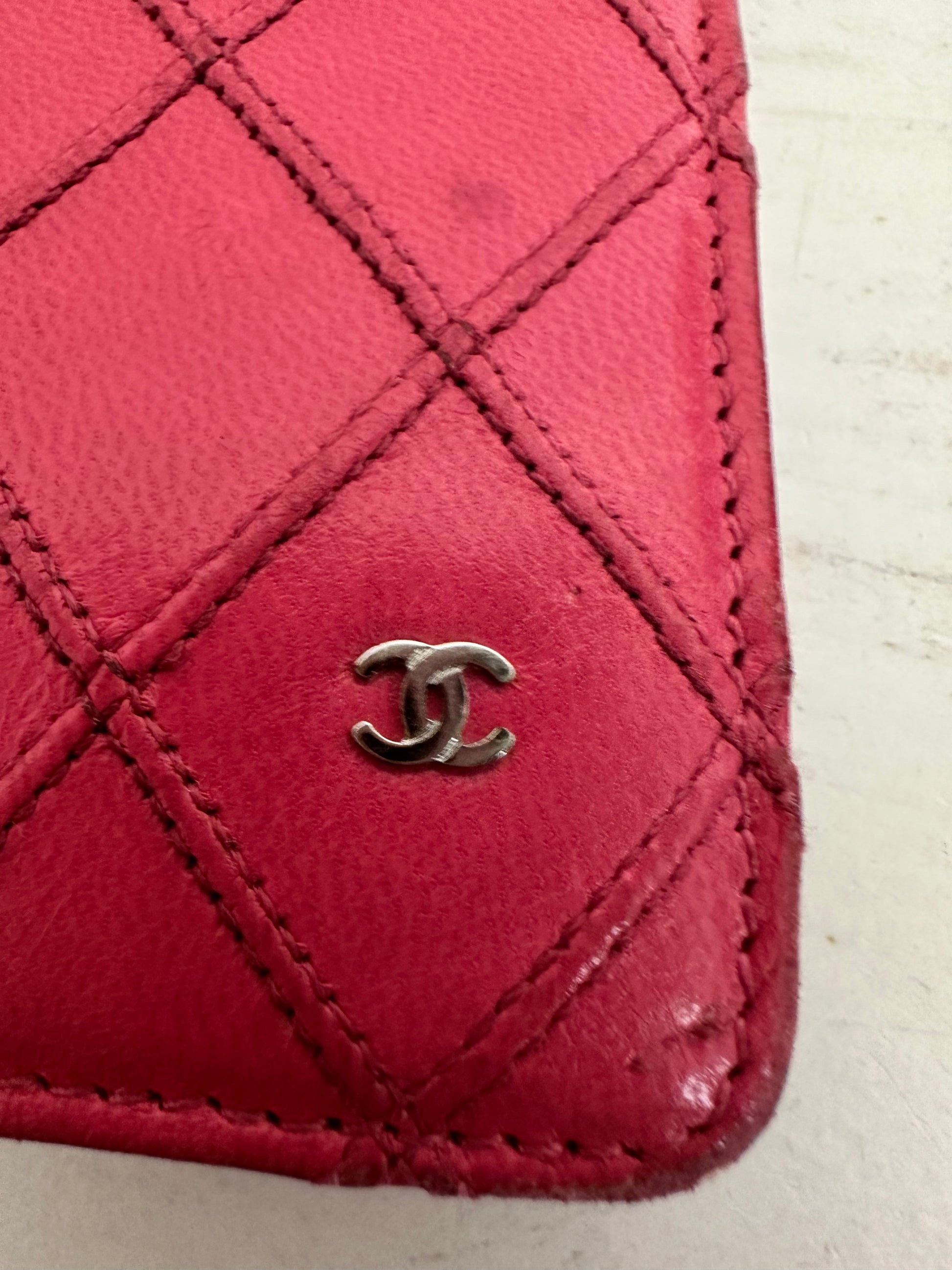 Chanel Bicolor Matelasse Pink Lambskin Leather Long Wallet with the double CC is in good condition. Slight rubbing on the corners and a pen mark and color transfer on the inside. This bubblegum pink with the silver accents is an amazing color combination. Does come with a COA.