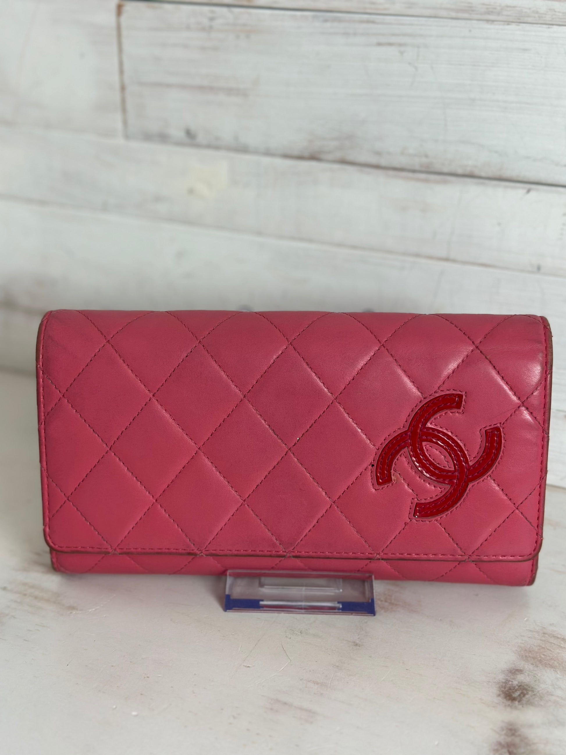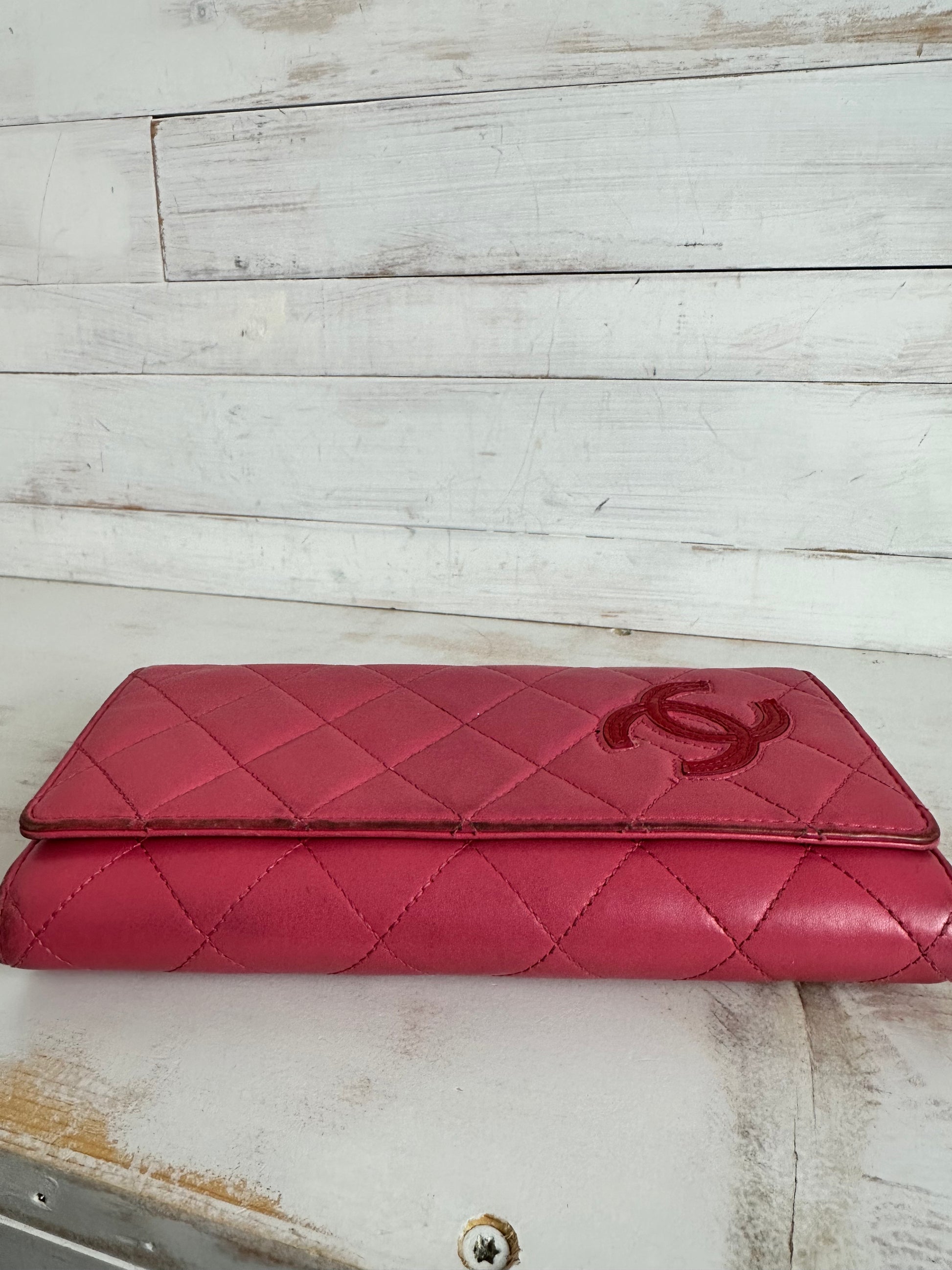 Add the Chanel touch to your everyday accessories by owning this continental wallet! It is leather-made and it has been styled with their signature quilt design and the interlocking CC logo on the flap. The wallet is also equipped with multiple slots and a zip compartment. Please note there is rubbing on the edges, pen marks on the interior flap, and heavy coin usage.