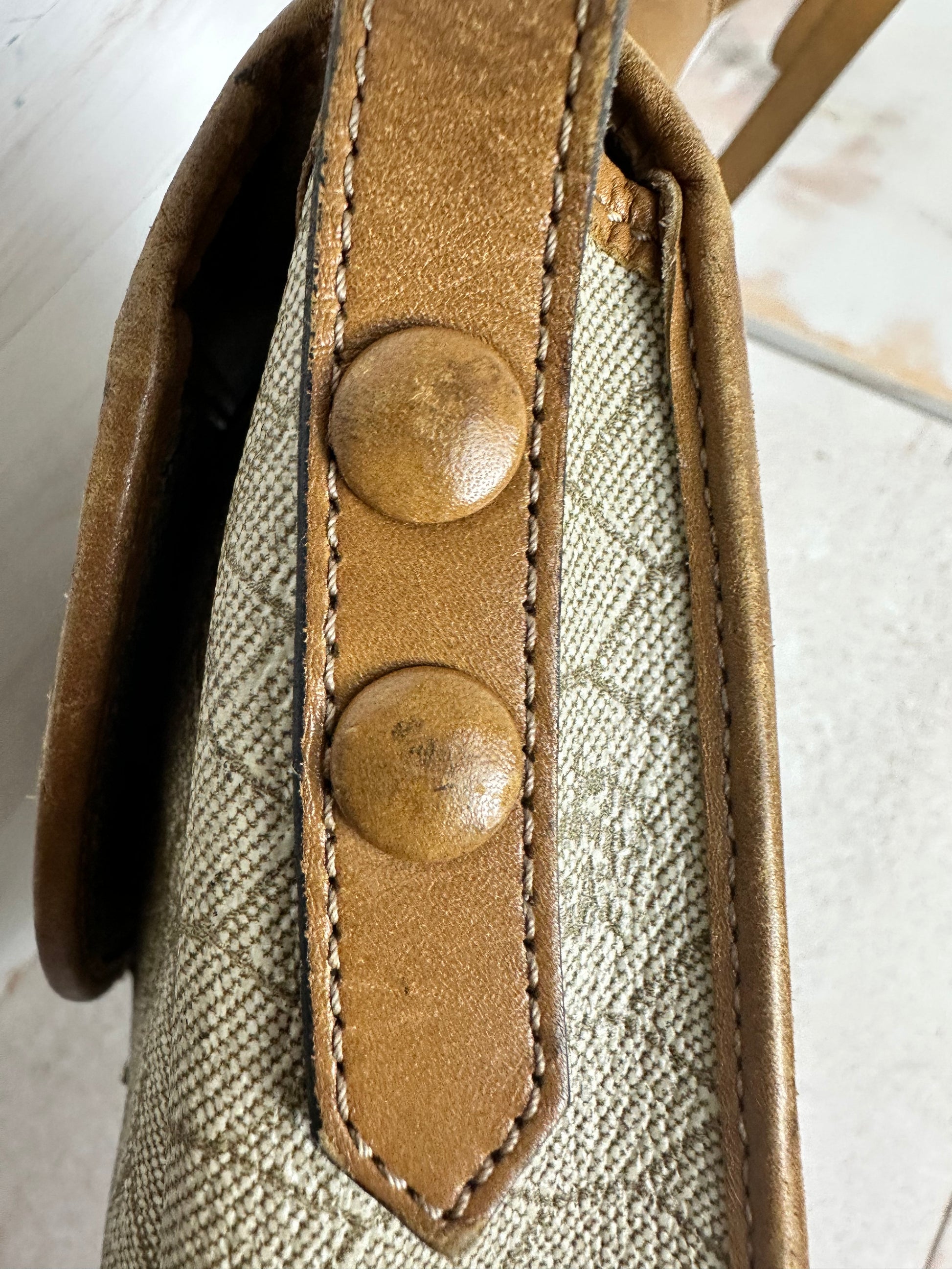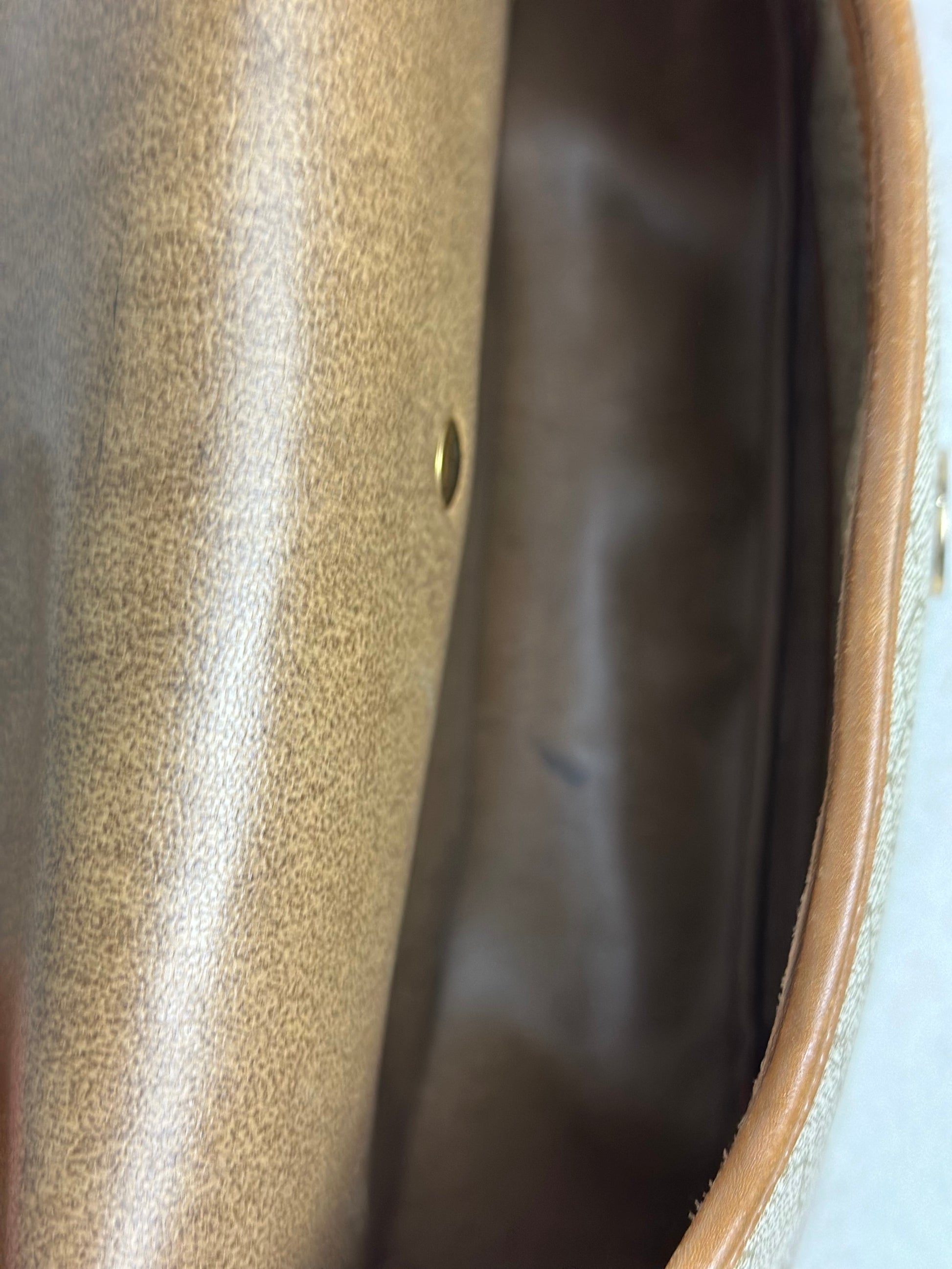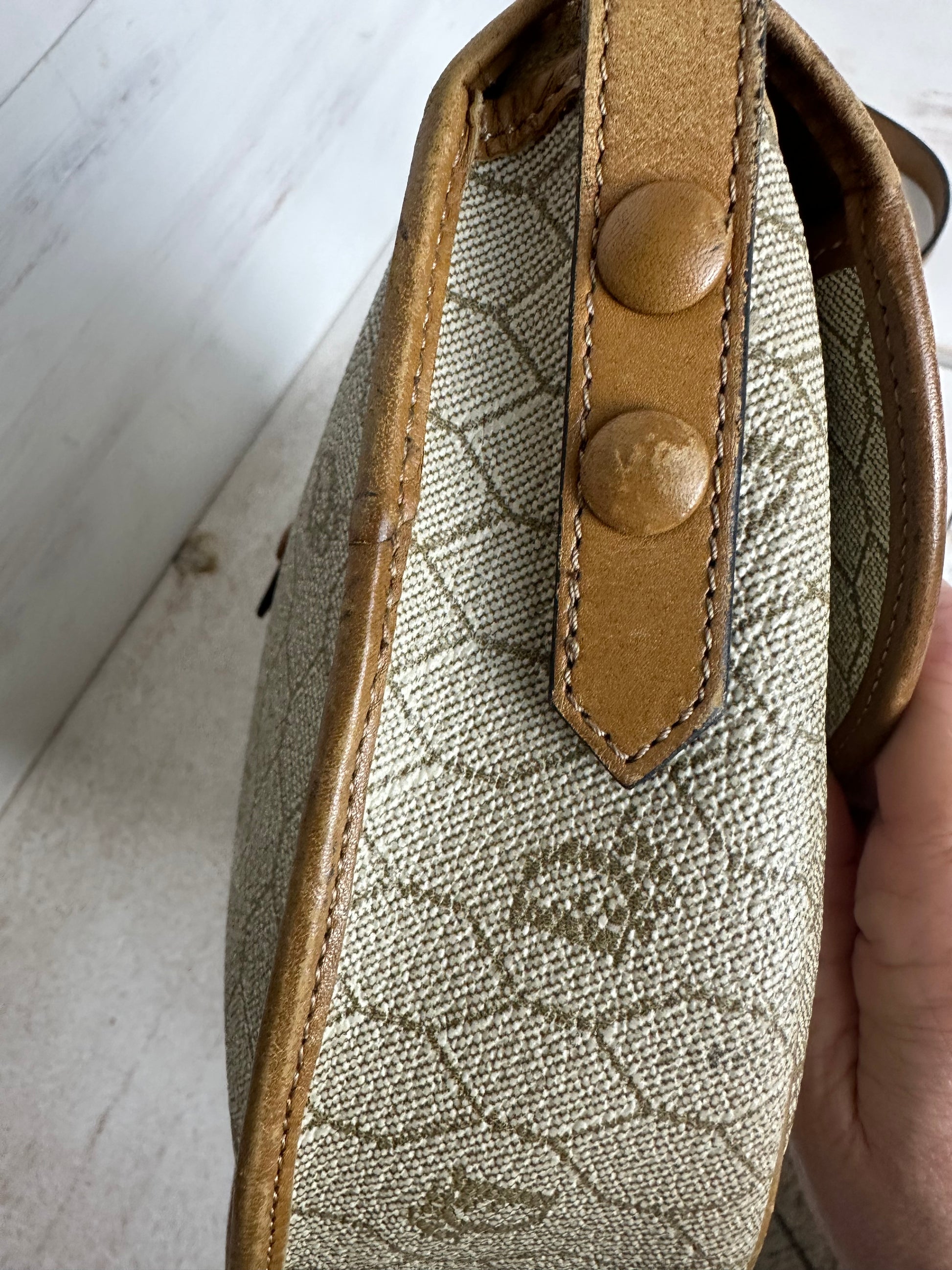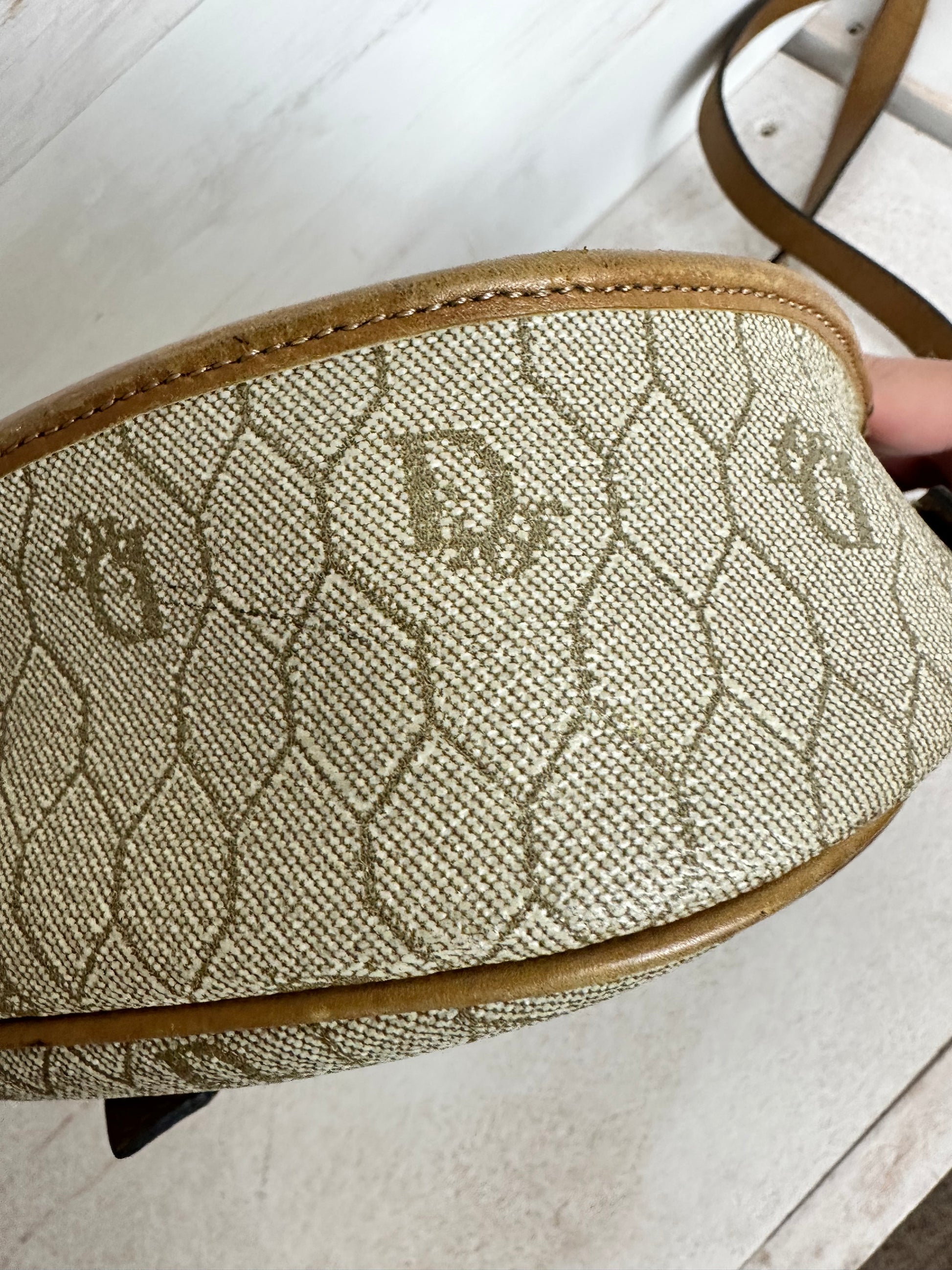This beige and brown crossbody is a vintage piece featuring a honeycomb along with the classic CD logo, seen typically in the 1980's. This crossbody has one small call out (as seen in the pictures) inside the bag on the bottom. The exterior has minor scratching on the buttons. The interior has no cracking or peeling. No corner rubs are noted. Neutral and classic, the perfect crossbody for all occasions.