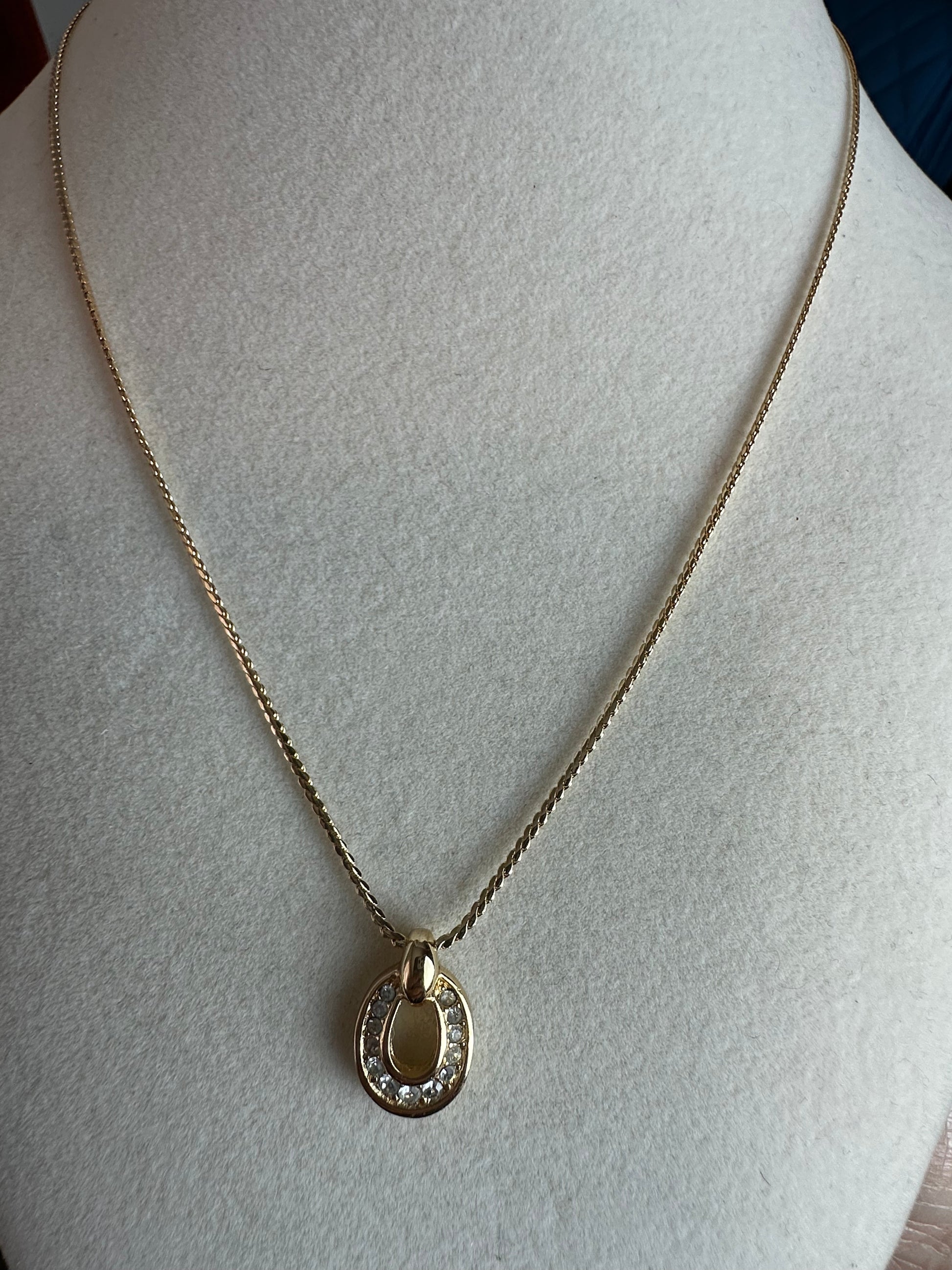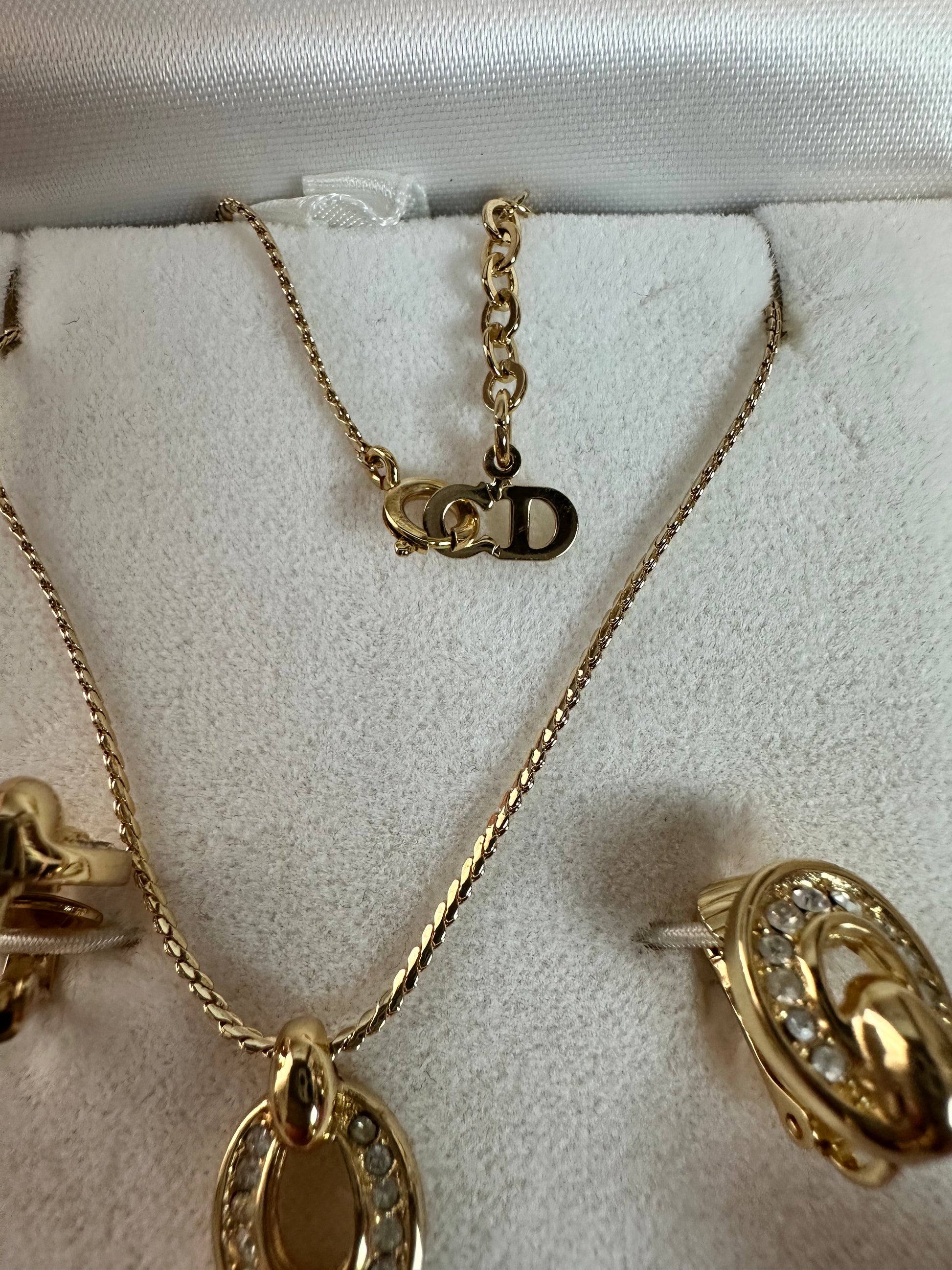 Vintage Christian Dior Pendant and clip on earrings featuring rhinestones and 18K gold plated. Absolutely stunning piece. Appears to be dead stock.