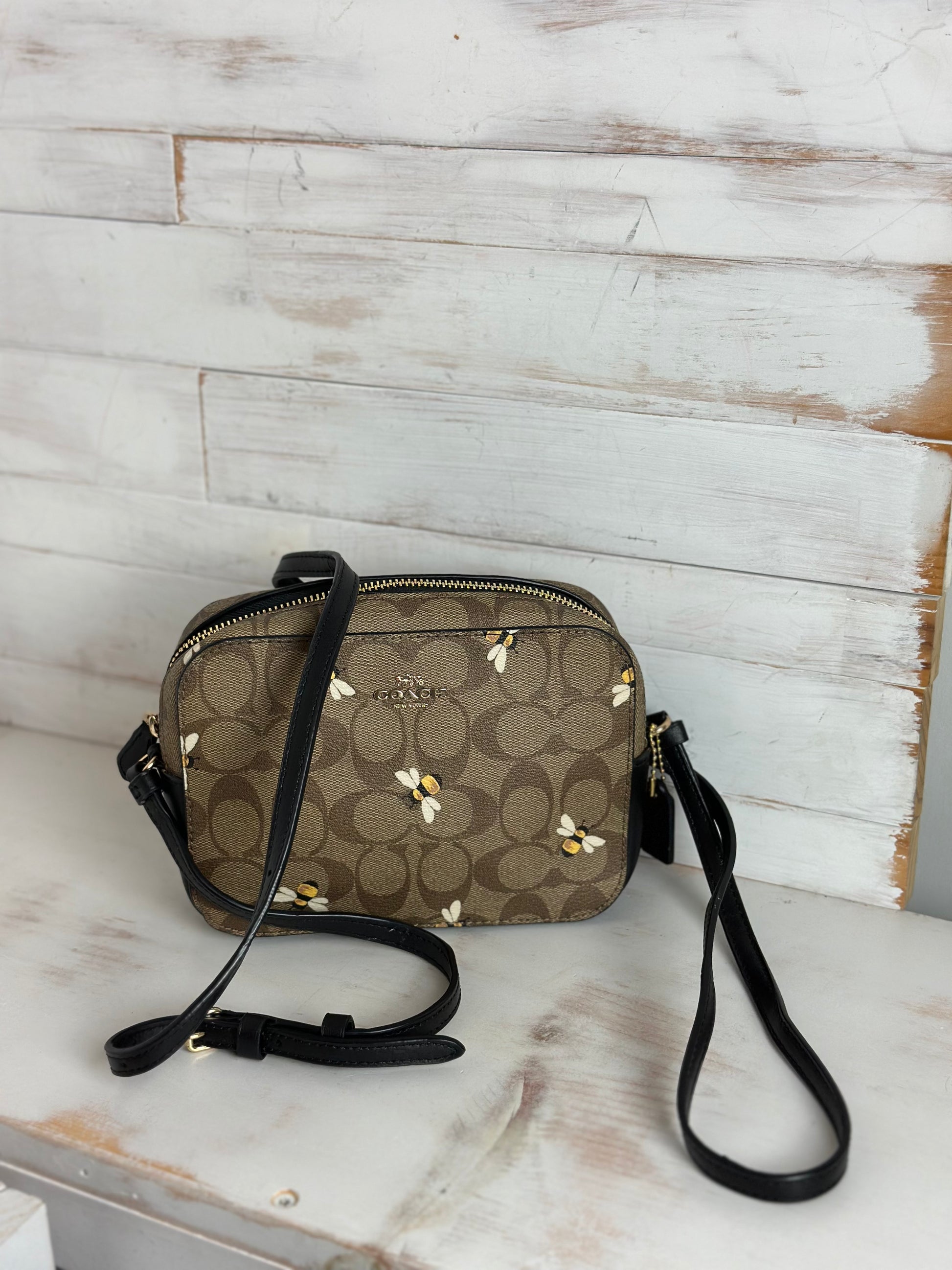 Coach Mini Camera Bag with Bee Print Crossbody. Featuring the signature coated canvas and smooth leather. Back slip pocket on the exterior. Interior is a black fabric with 2 credit card slots and a multifunction pocket. Has a gold tone hardware zipper closure. Black leather adjustable crossbody strap.