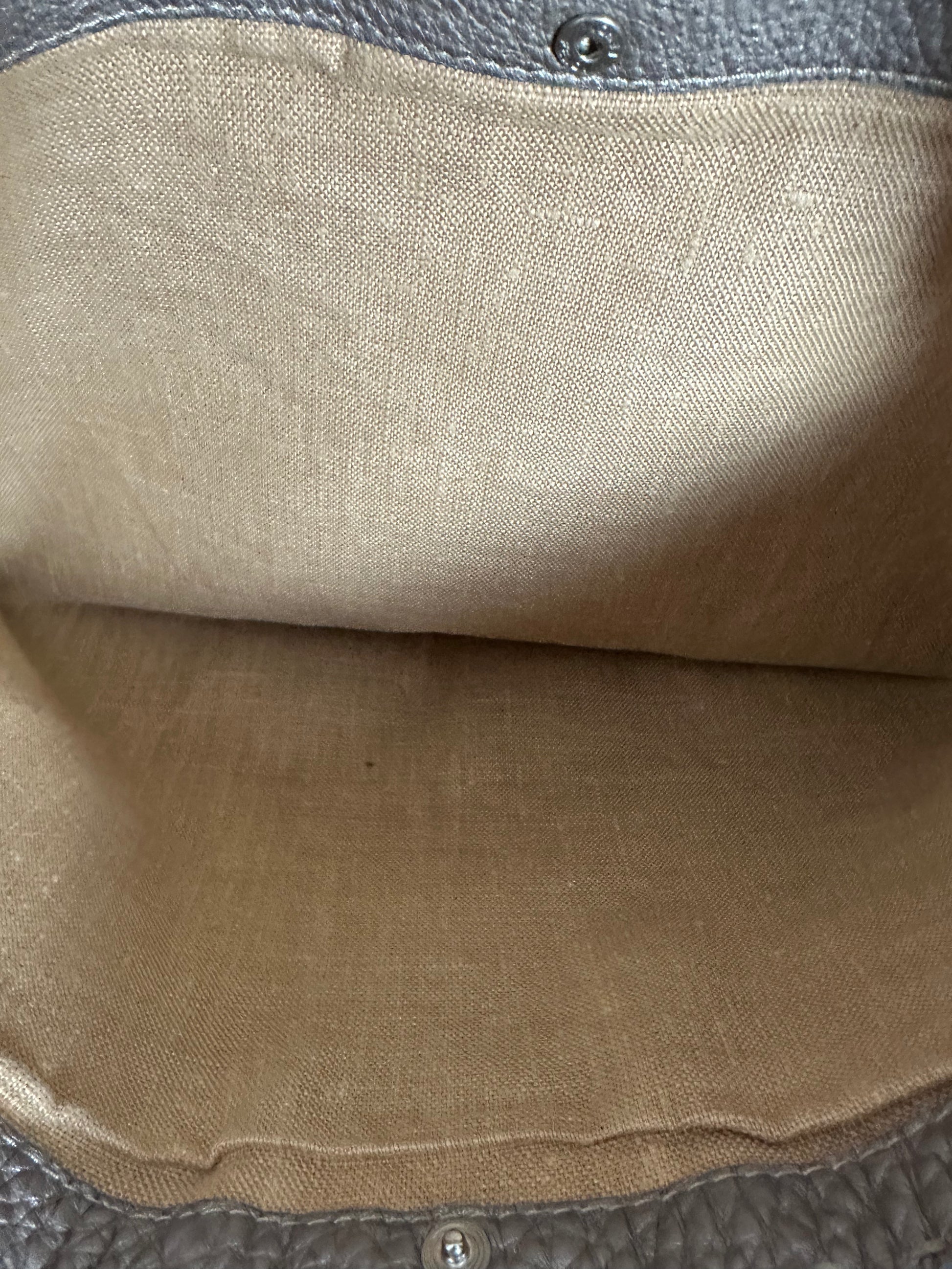 This is an Authentic FENDI Calfskin Romano Selleria Messenger in a Gray shimmer. This stylish messenger bag crafted of a soft calfskin grey leather. This bag features an adjustable shoulder strap lined with a buckle design, a front pocket, and silver hardware. The top zipper opens to a brown fabric interior with a zipper pocket. Only sign of use is hairline scratches on front hardware. (see pictures)