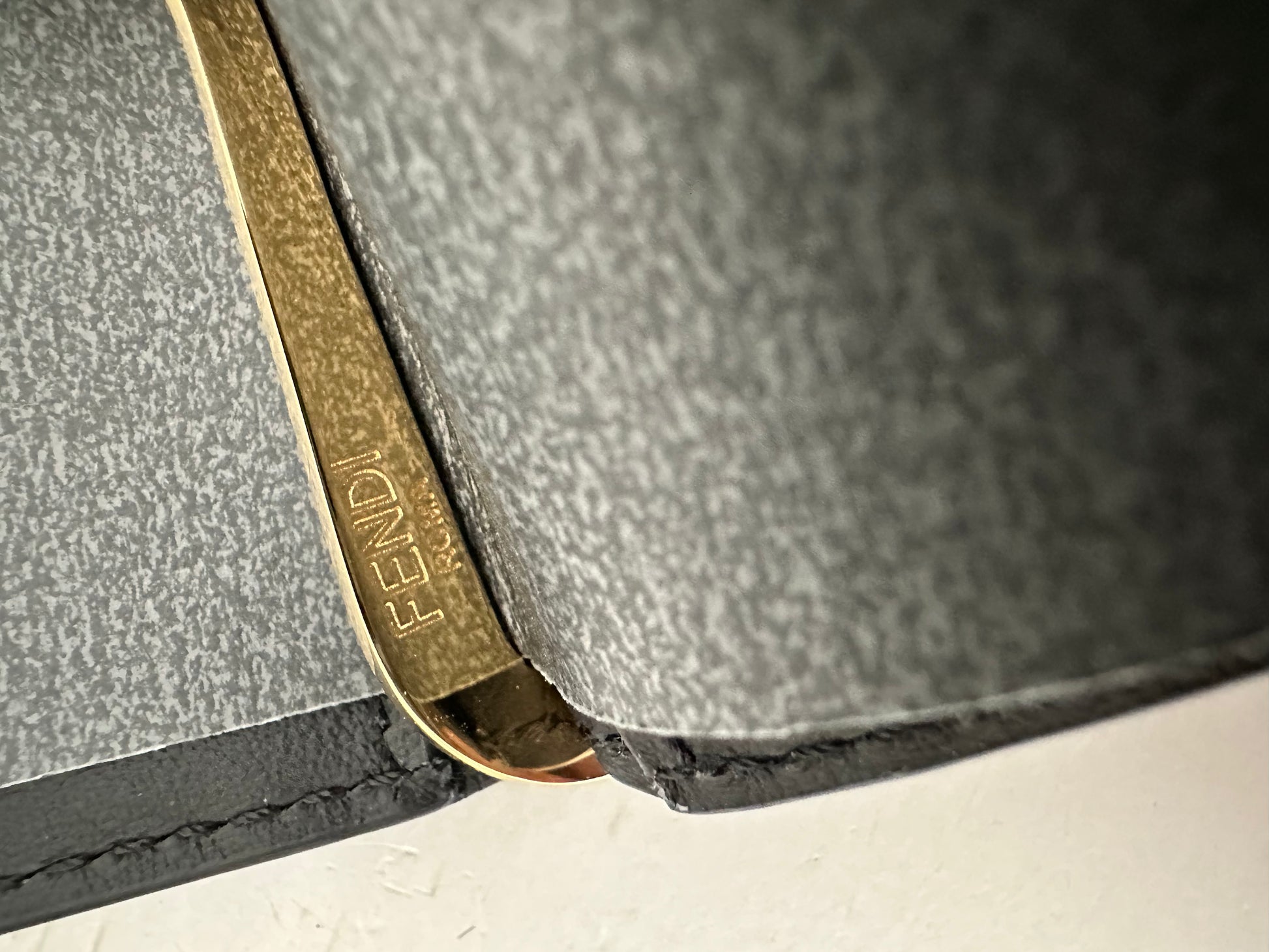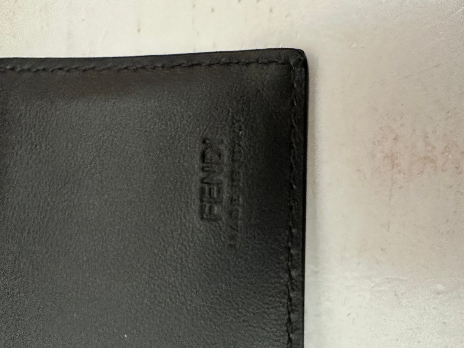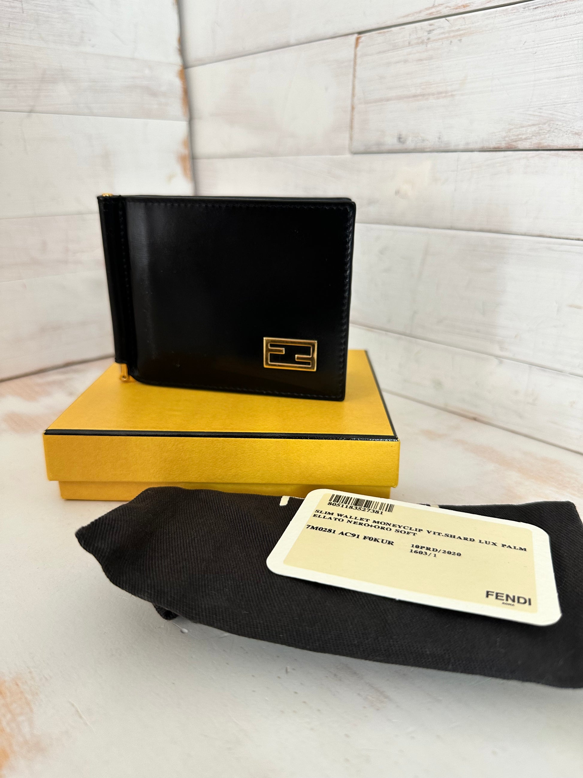 New Fendi Slim Wallet Money Clip in Black Calfskin. Hardware is gold-tone which is a fantastic contrast to the smooth black calfskin leather. Comes with tag, box, and dustbag.