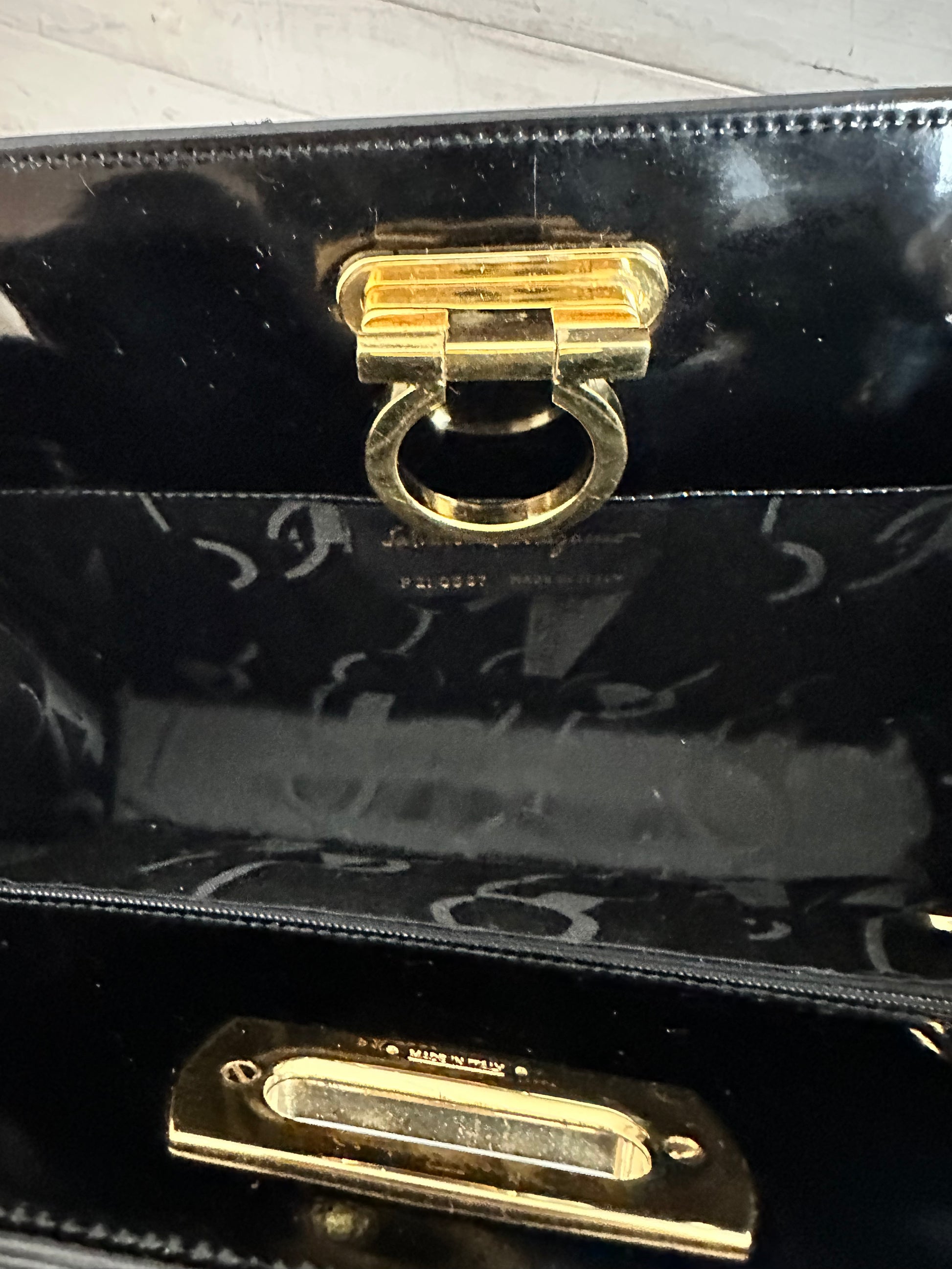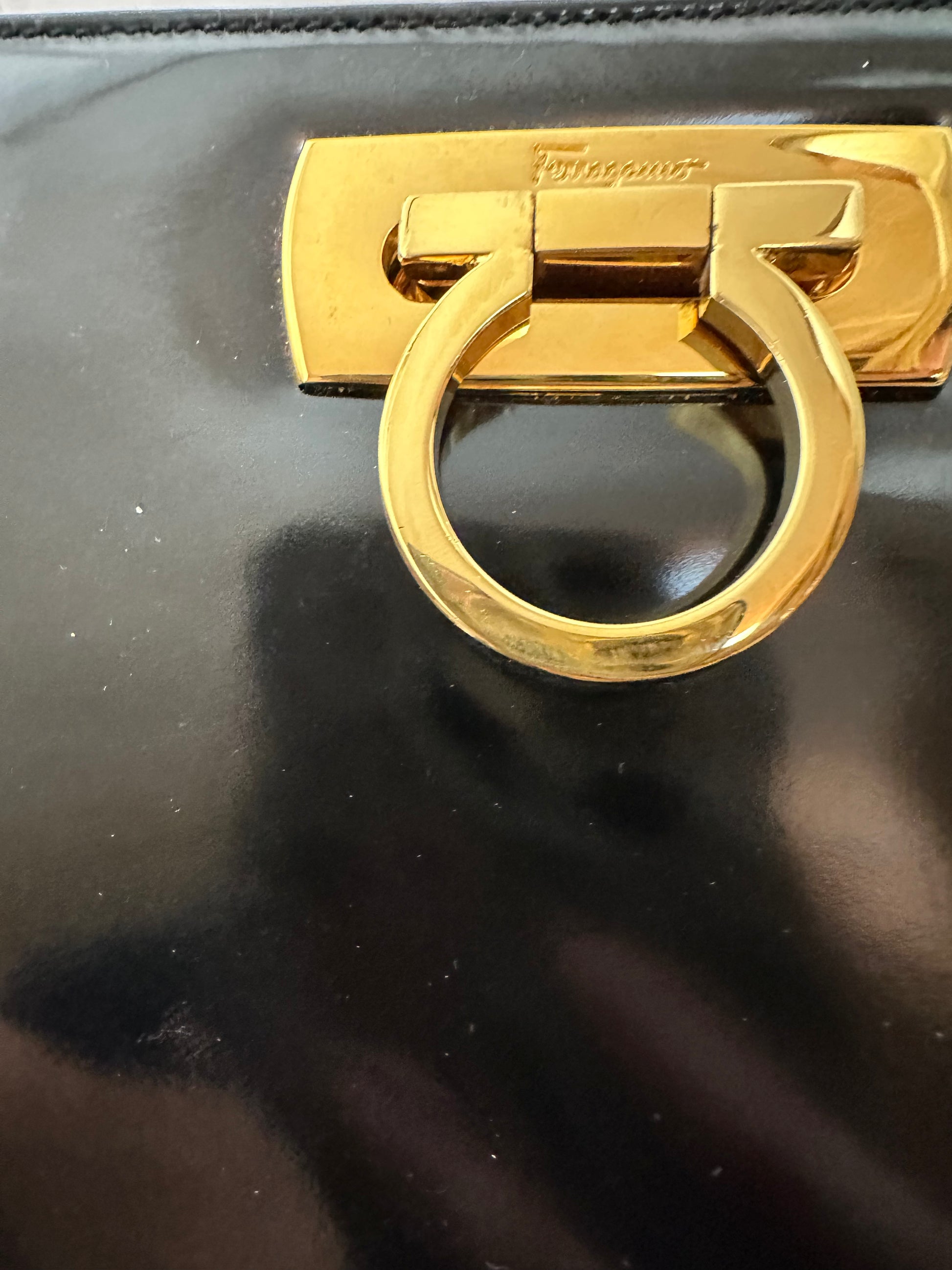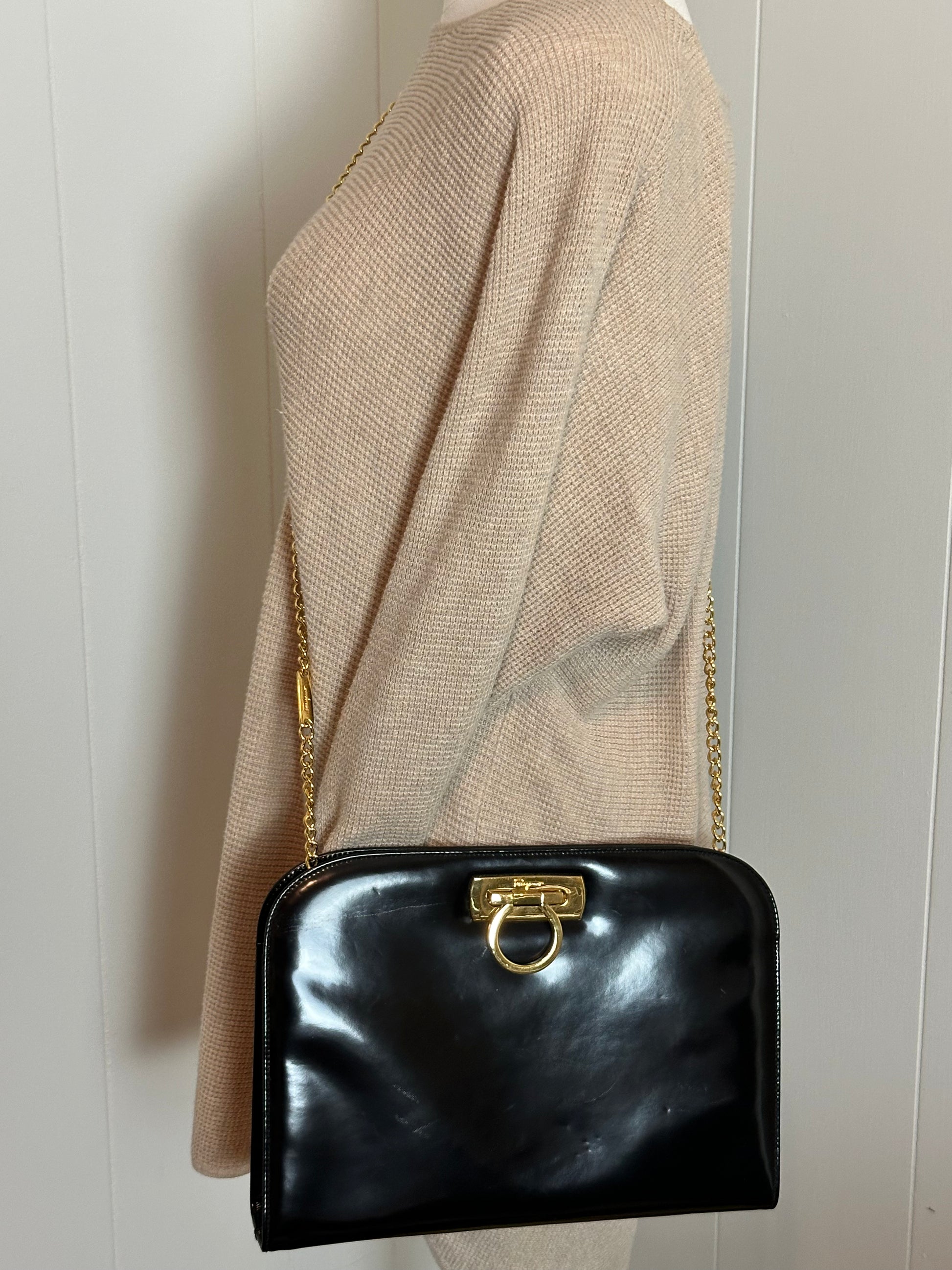 Salvatore Ferragamo "Diana" Crossbody/Clutch Bag. Clutch calfskin patent leather with Gancini clasp. This popular Salvatore Ferragamo bag was create for Lady Diana Spencer, Princess of Wales. Amazing Condition. Shiny black patent leather with gold tone hardware. Singles interior zipper pocket. Monogram gold tone chain.