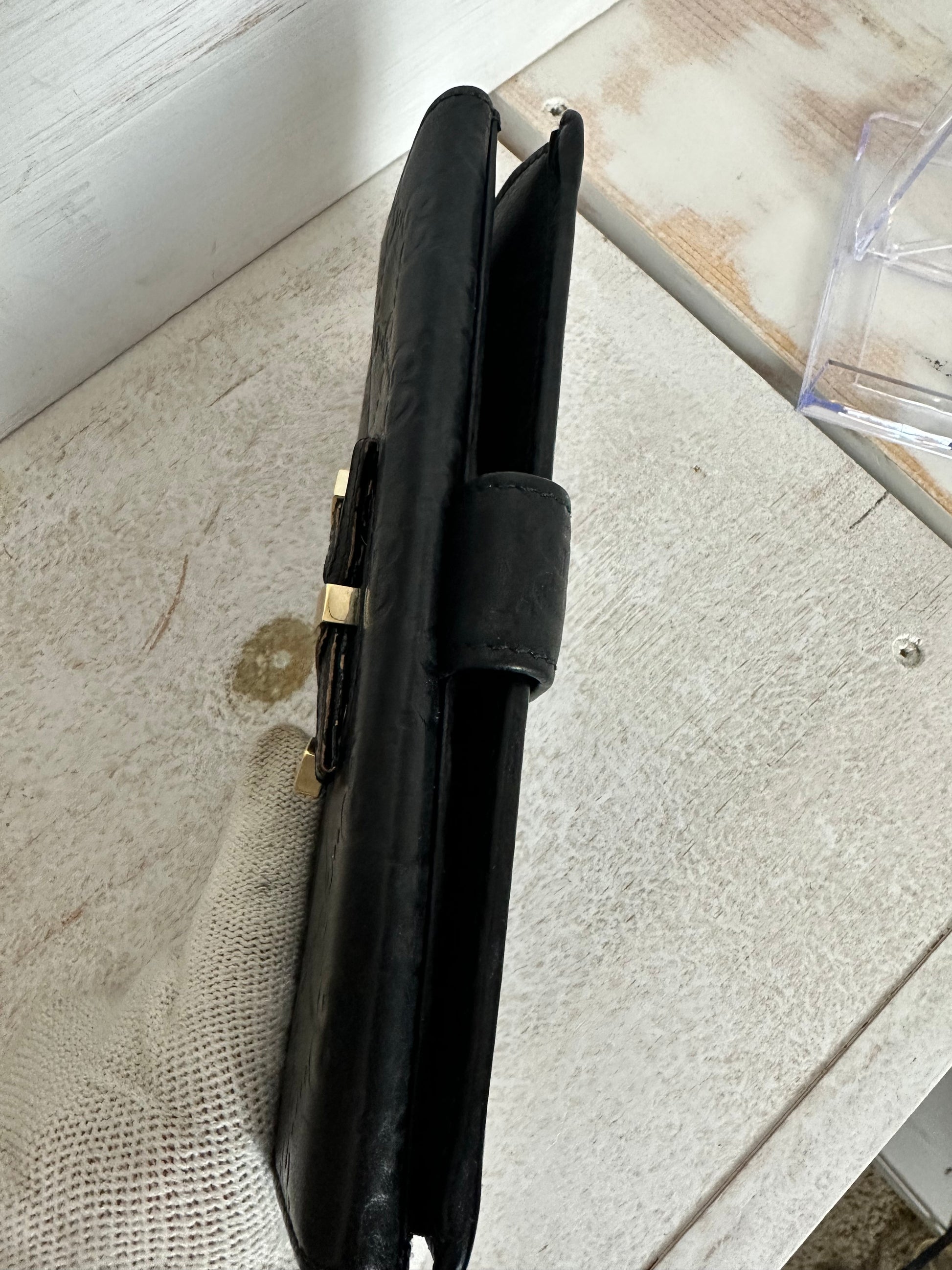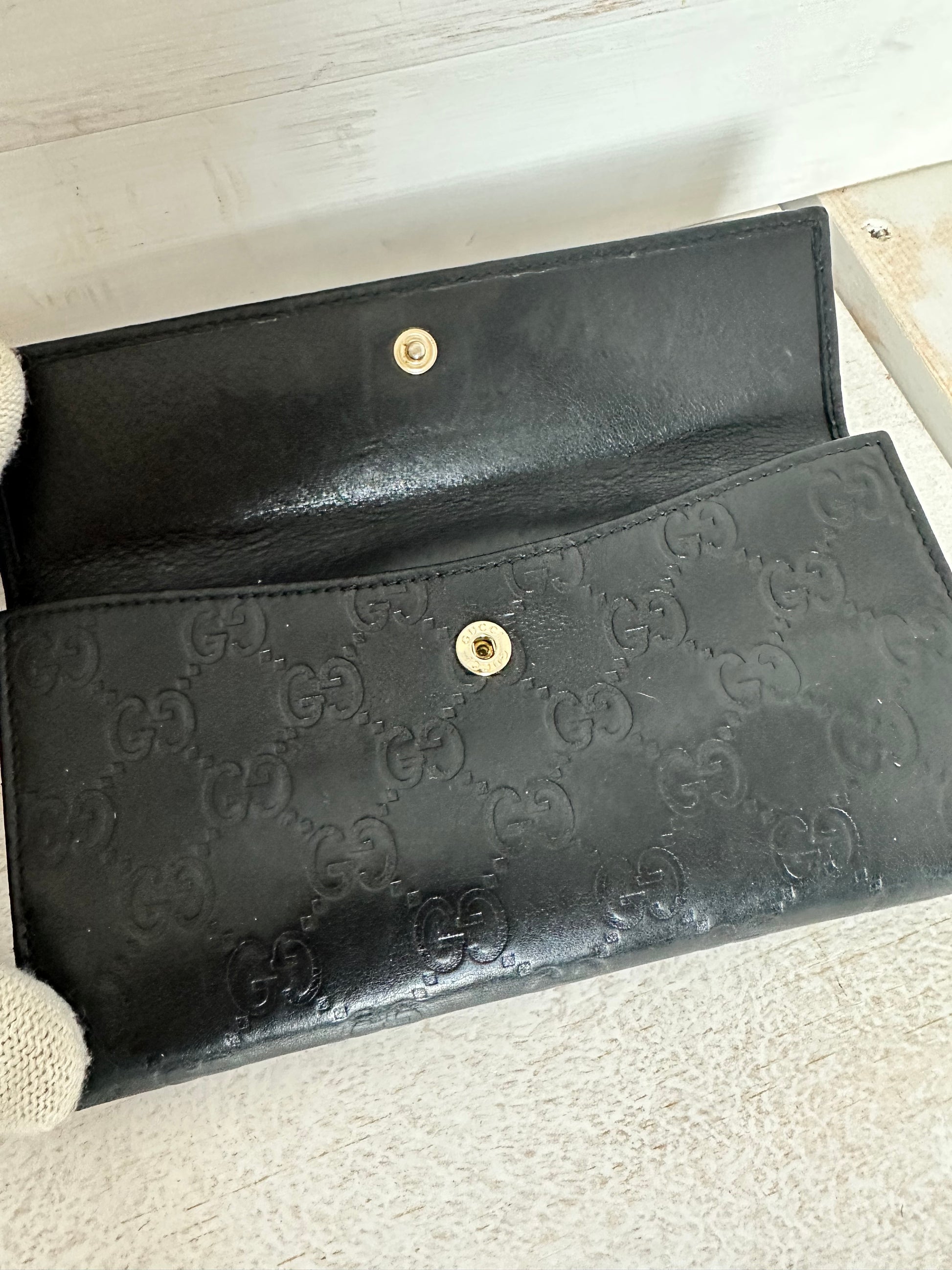 This is an authentic GUCCI Guccissima Princy Continental Wallet in Black. This stylish wallet is crafted of Gucci GG monogram embossed leather. The rear has a strap that opens to a matte leather black interior with full case compartments and a full card slot panel. These face has a leather tie on the top flap that opens to a currency compartment, and ideal grab and go for everyday essentials, only from Gucci! You can easily add a chain and have a crossbody as well.