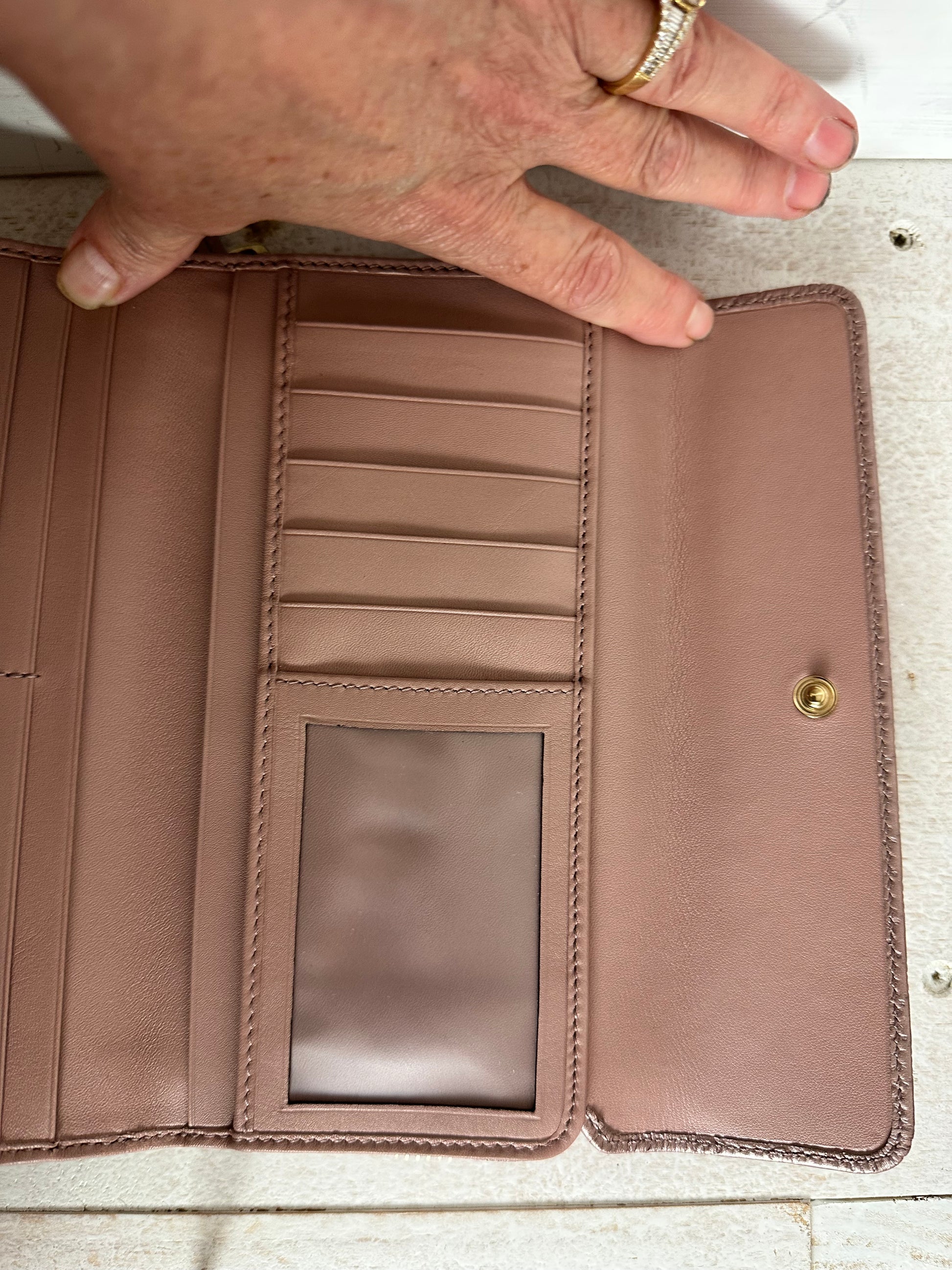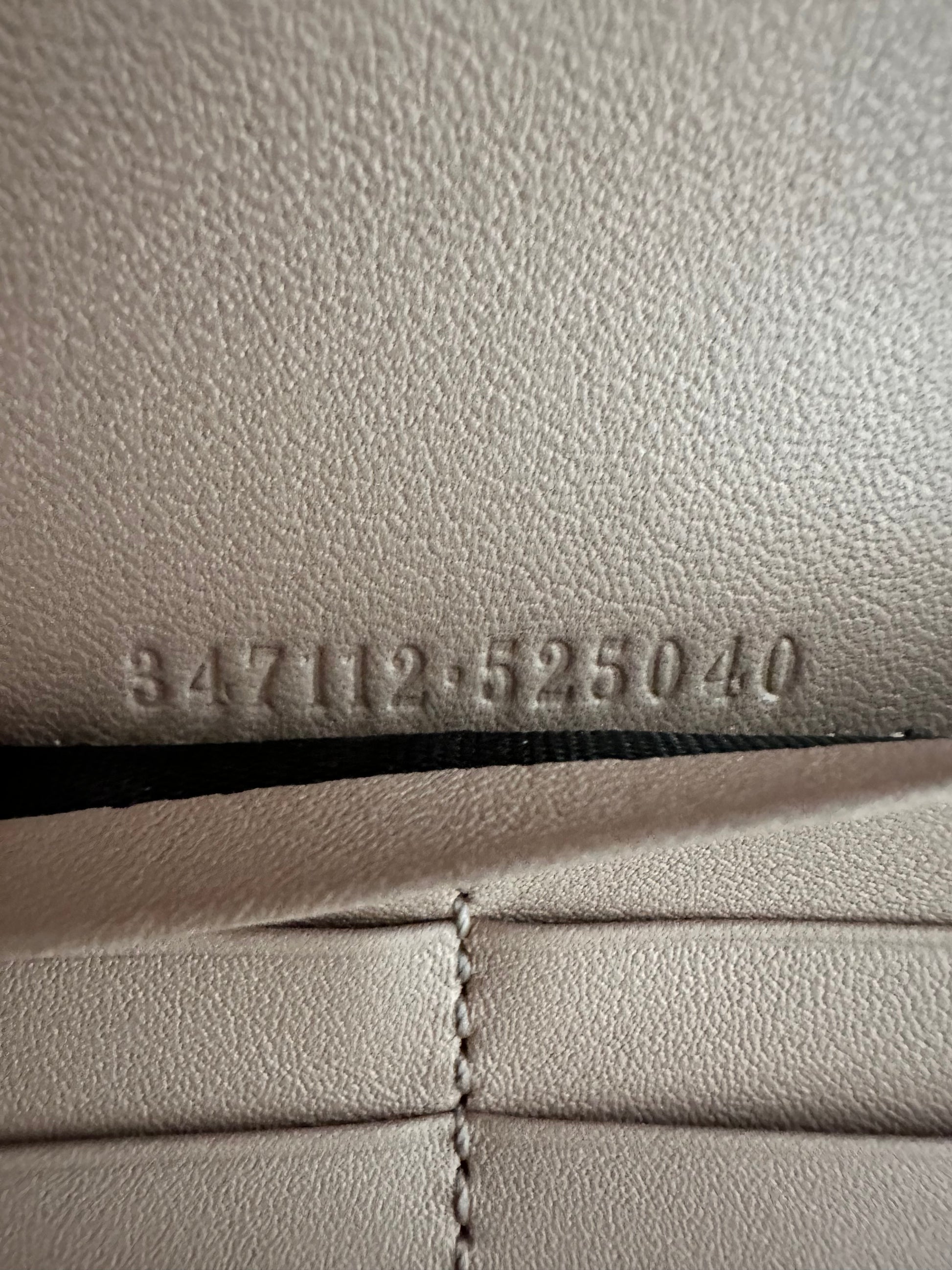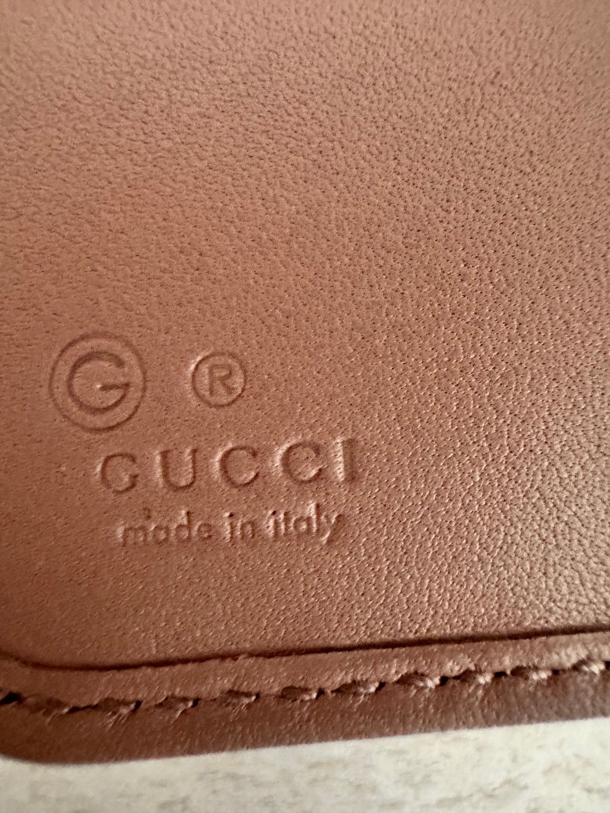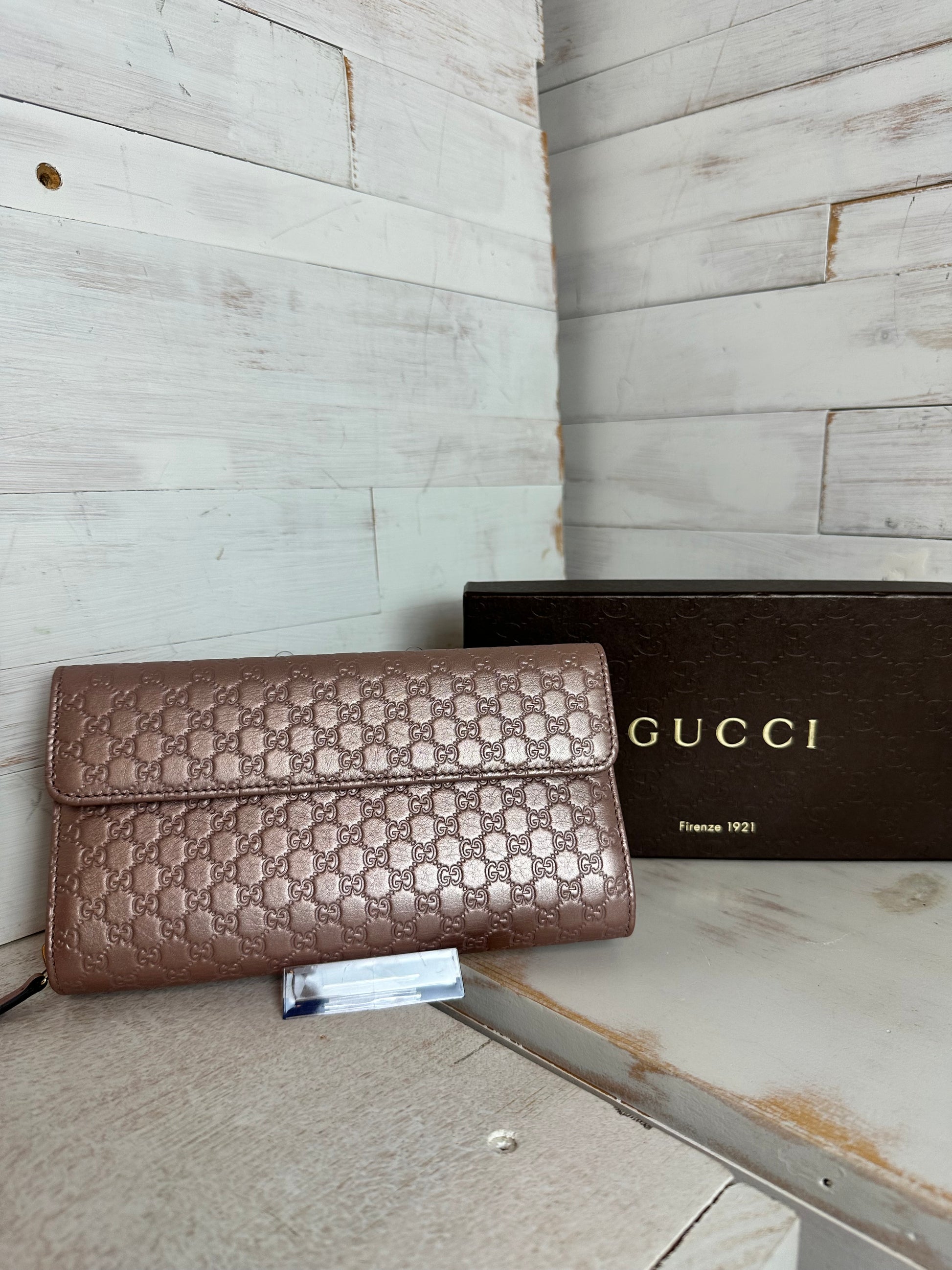 Stunning metallic pink Gucci wallet with the Classic GG symbol throughout the entire exterior. Accented with gold hardware and this is a gorgeous piece. You can add a gold chain and make it into a crossbody. There are no signs of wear, at all in this wallet. Boast 14 card slots, three slip pockets and a zipper compartment with three accordion slots with the middle one featuring a zippered coin slot. Original box and tissue papers included.