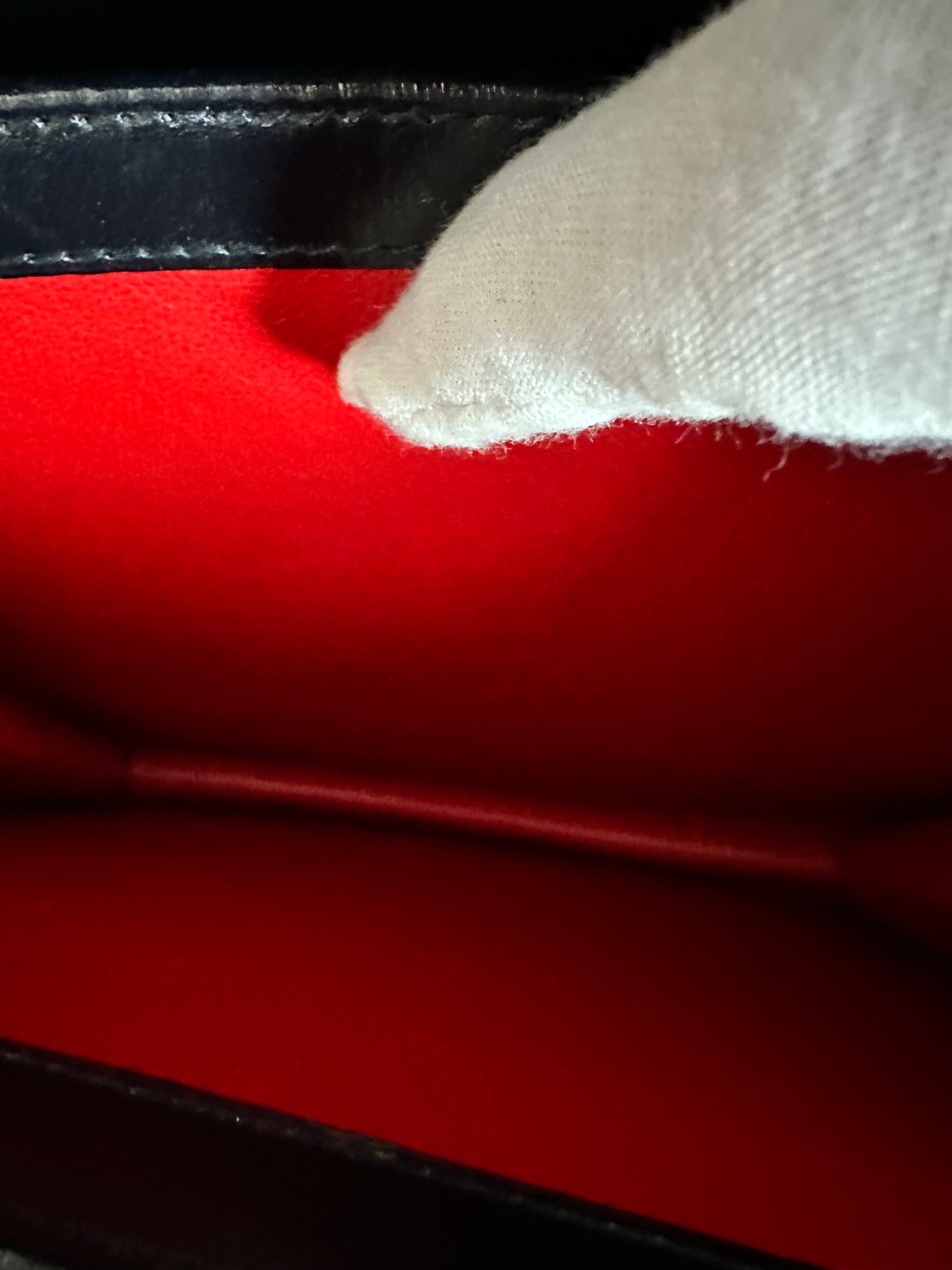 Gucci Tom Ford Era Gucci G Lock Black Leather Handbag. This Gucci is a classic and a little hard to come across these days. It's black leather with red interior. It has the famous, well made Gucci hardware and a long strap so you are able to showcase this beautiful handbag on your shoulder with ease and show it off. It does have some minor spots near the top of the handbag (please note pictures) from normal wear. Interior is spotless.