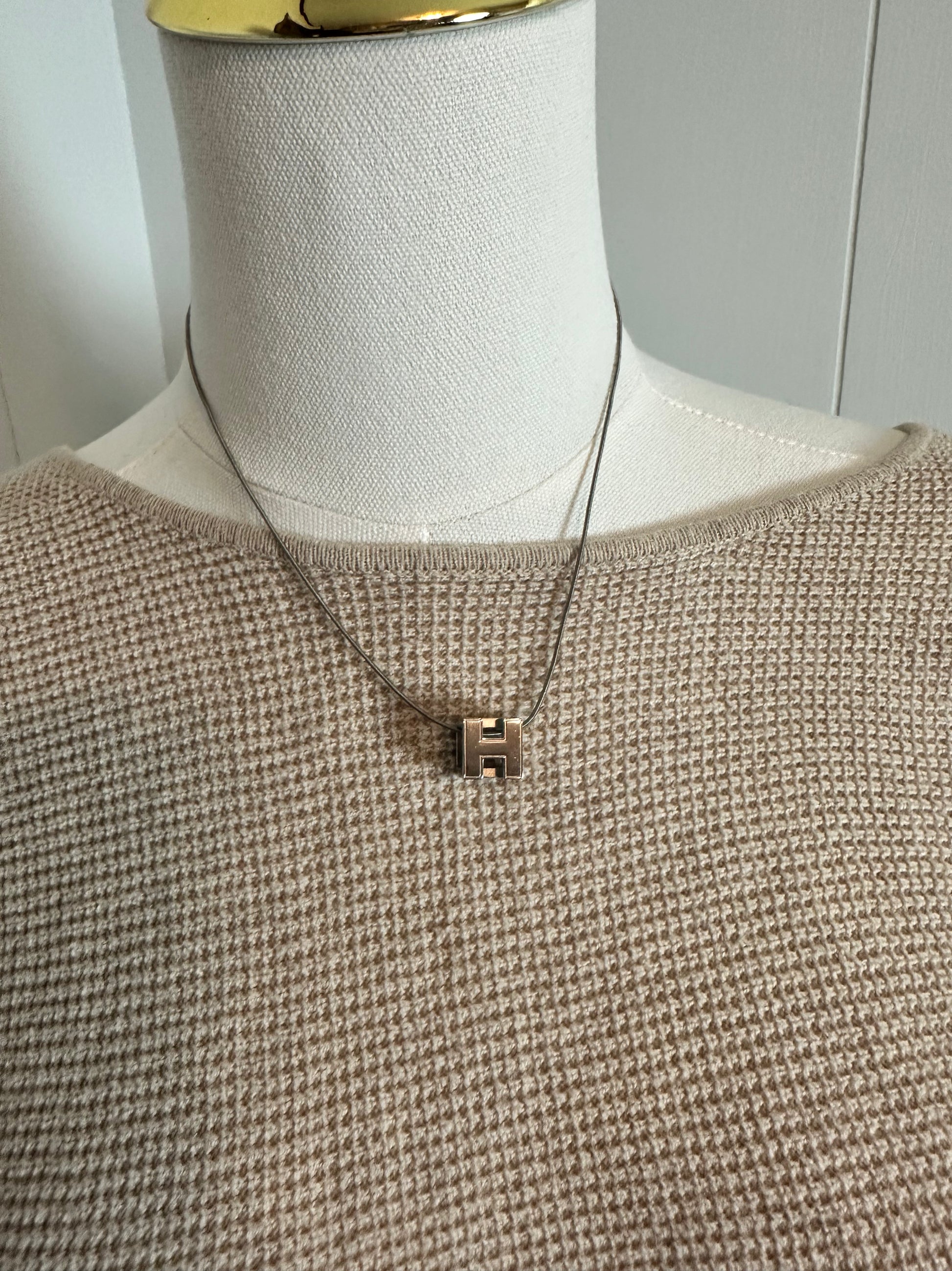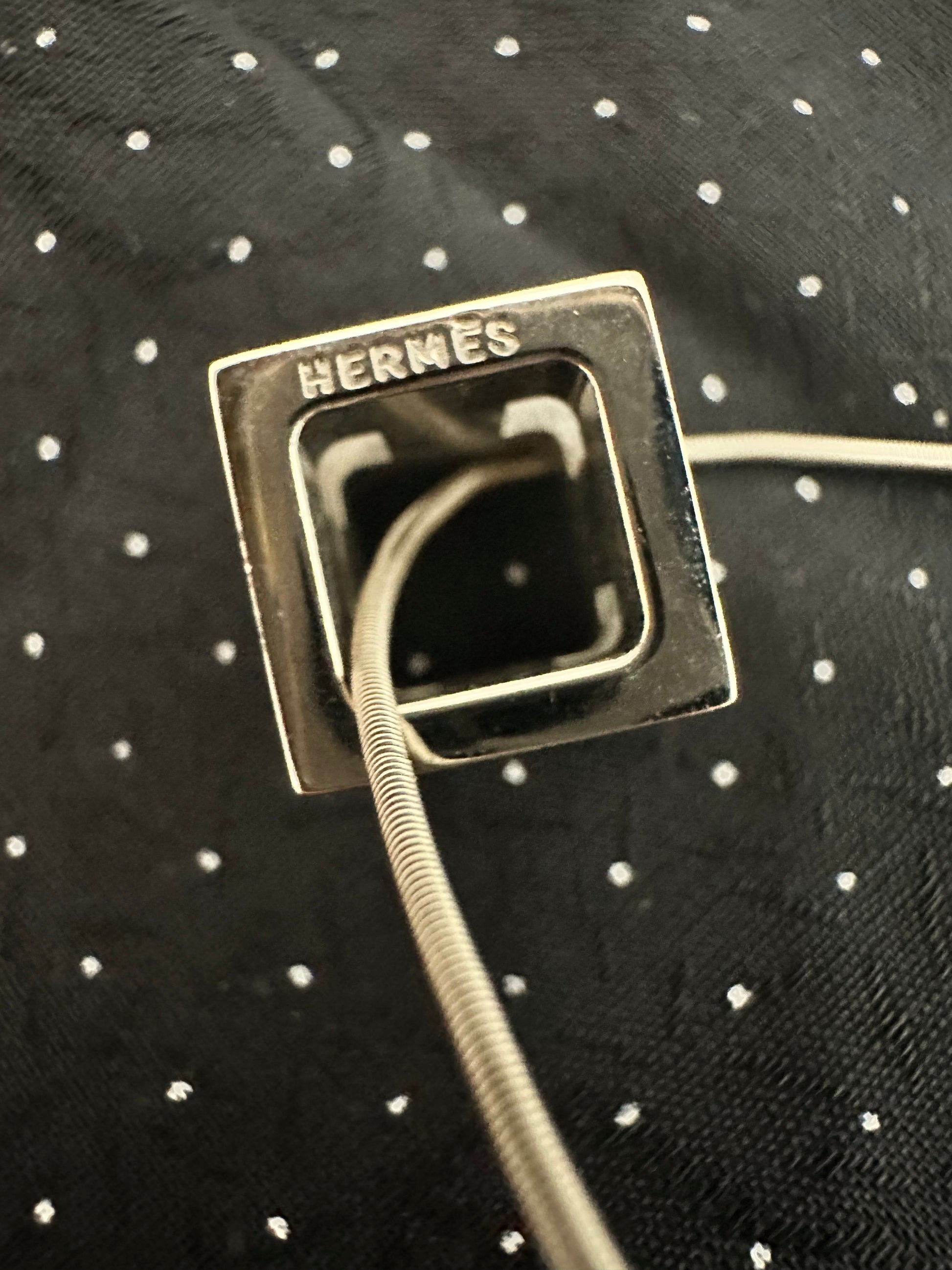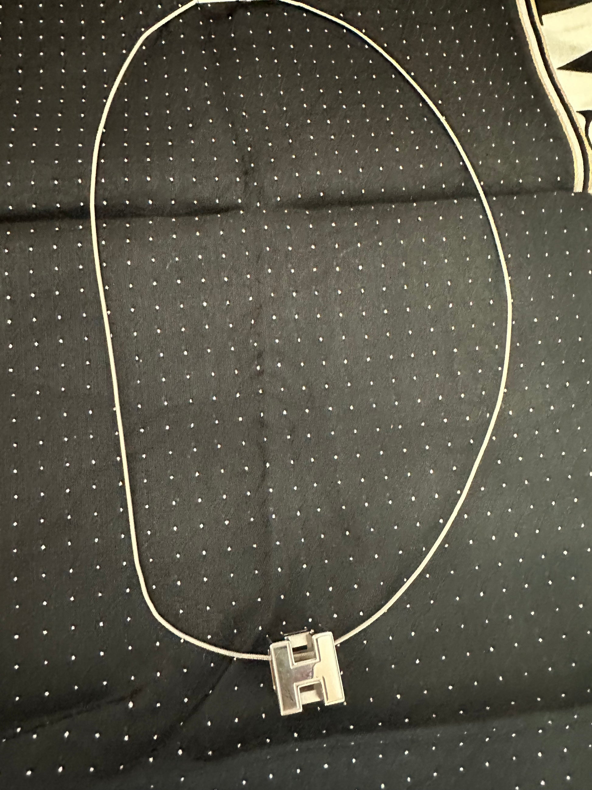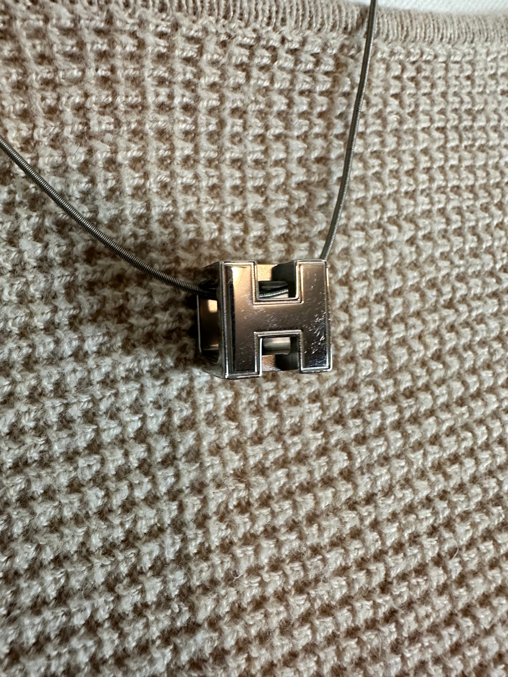 This Hermes necklace features a distinctive H Cube Cage design crafted from metal in a silver color. The pendant measures 0.39" x 0.39" and is attached to a necklace length of 16.73". Please note there is a slight bend in the chain but does not distract from the classical beauty of this pendant.