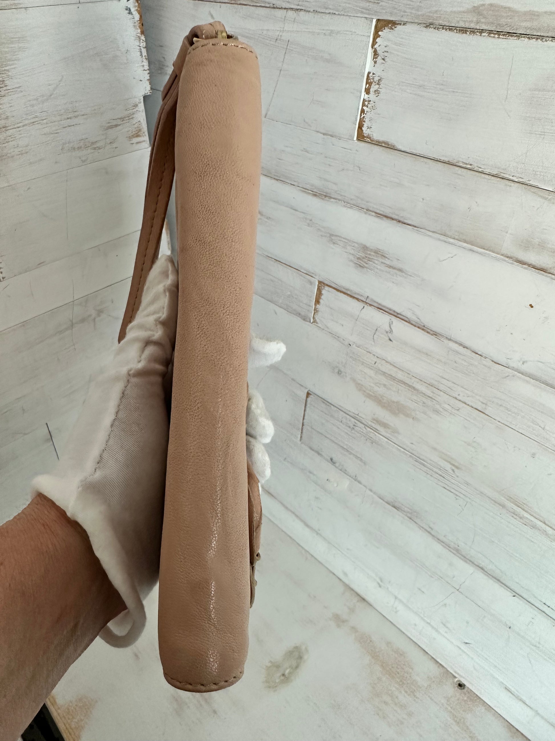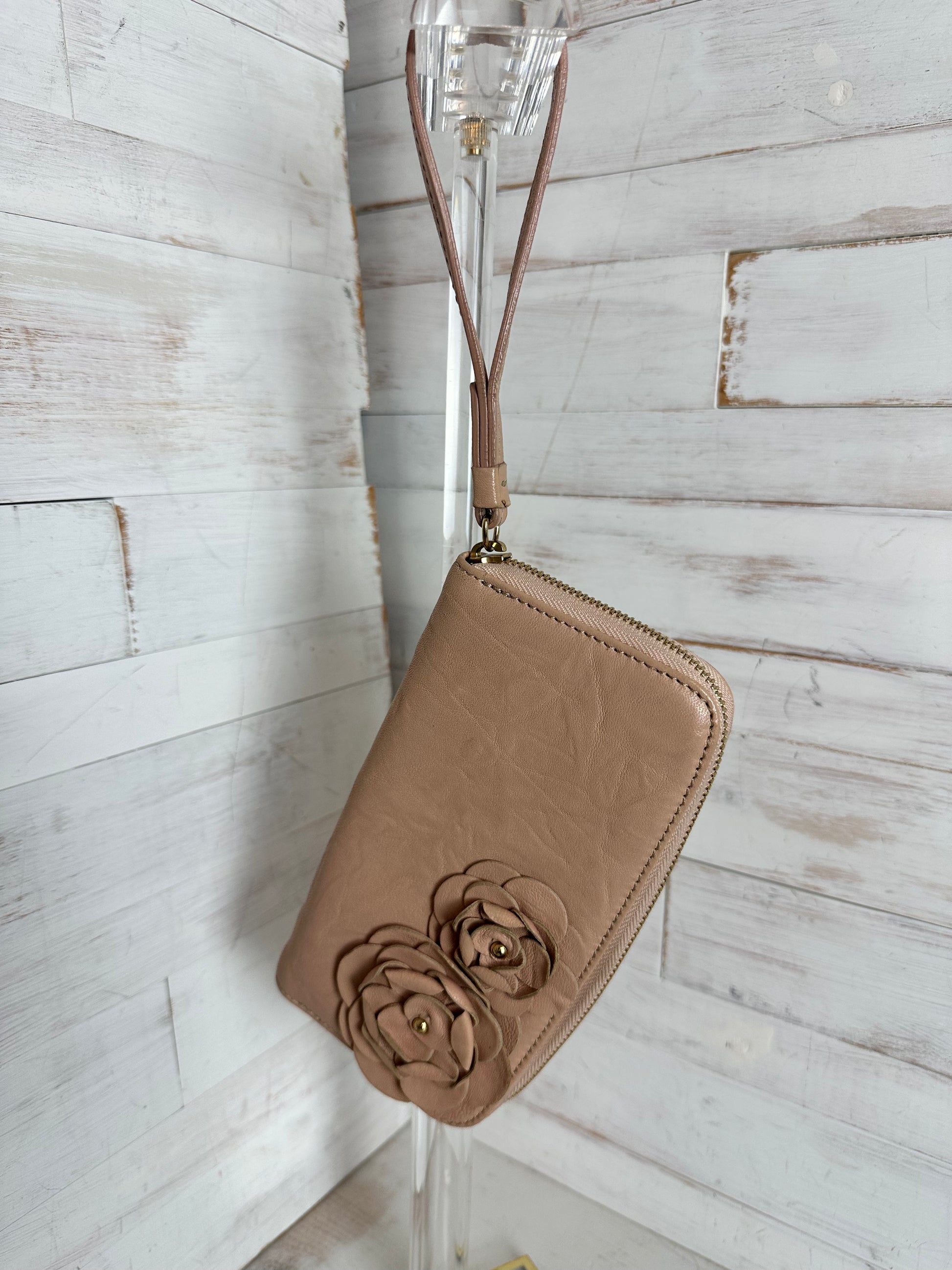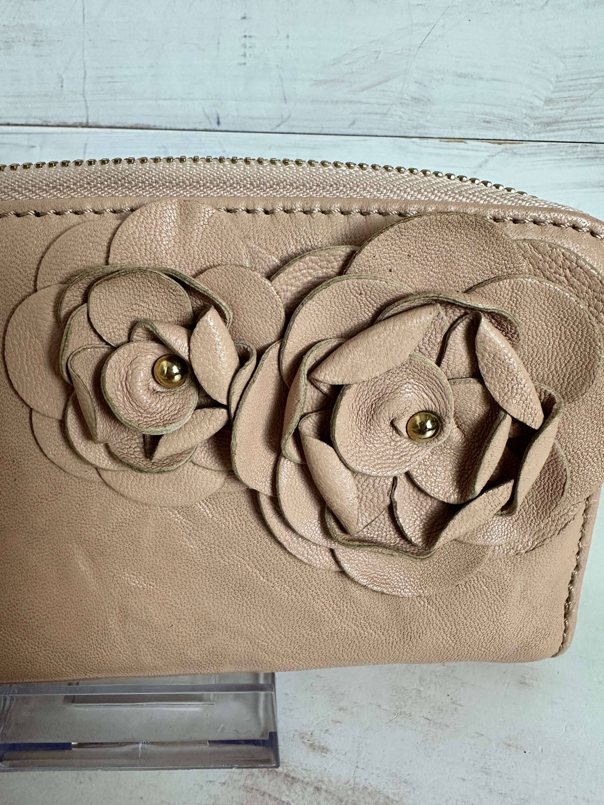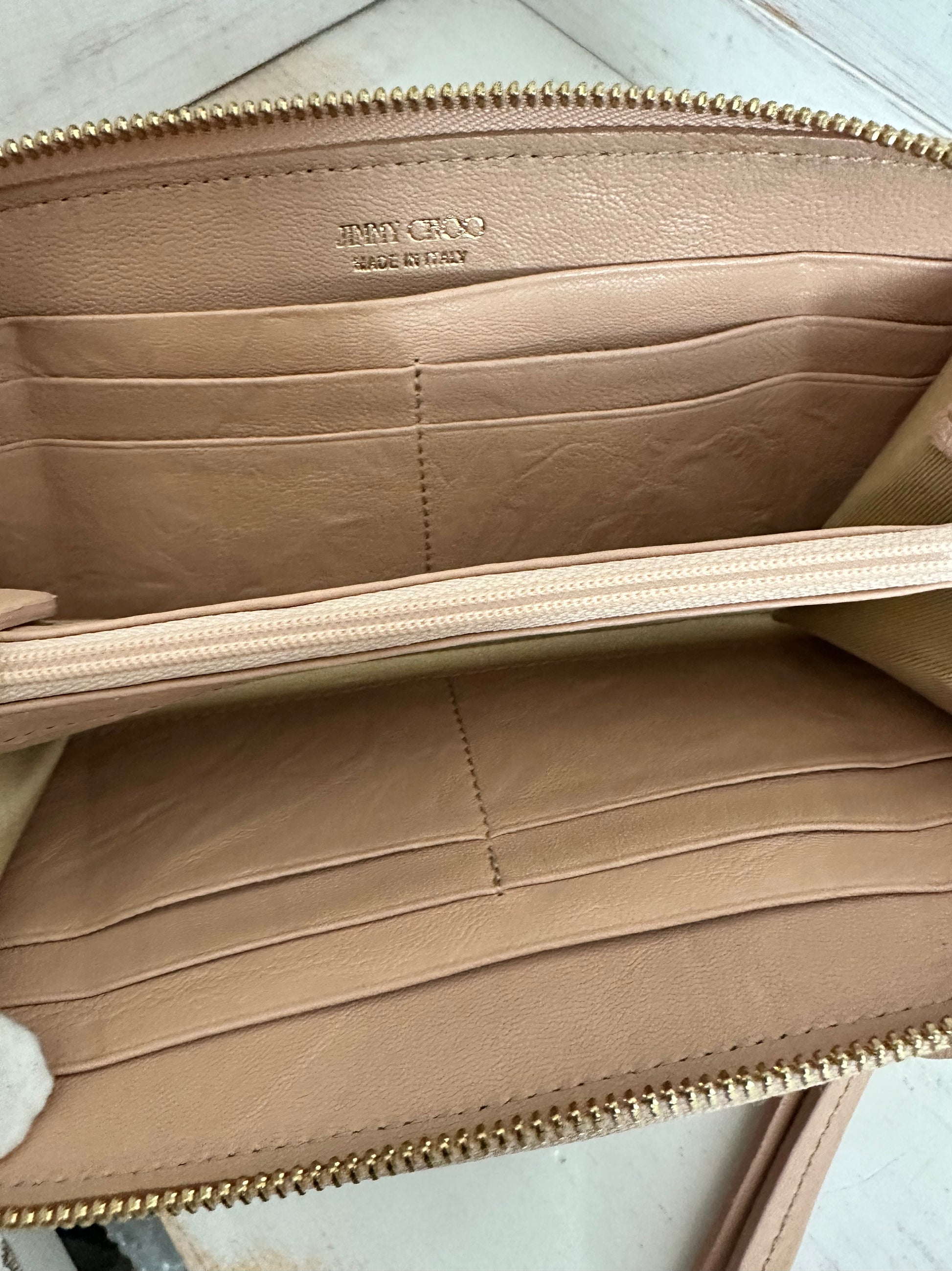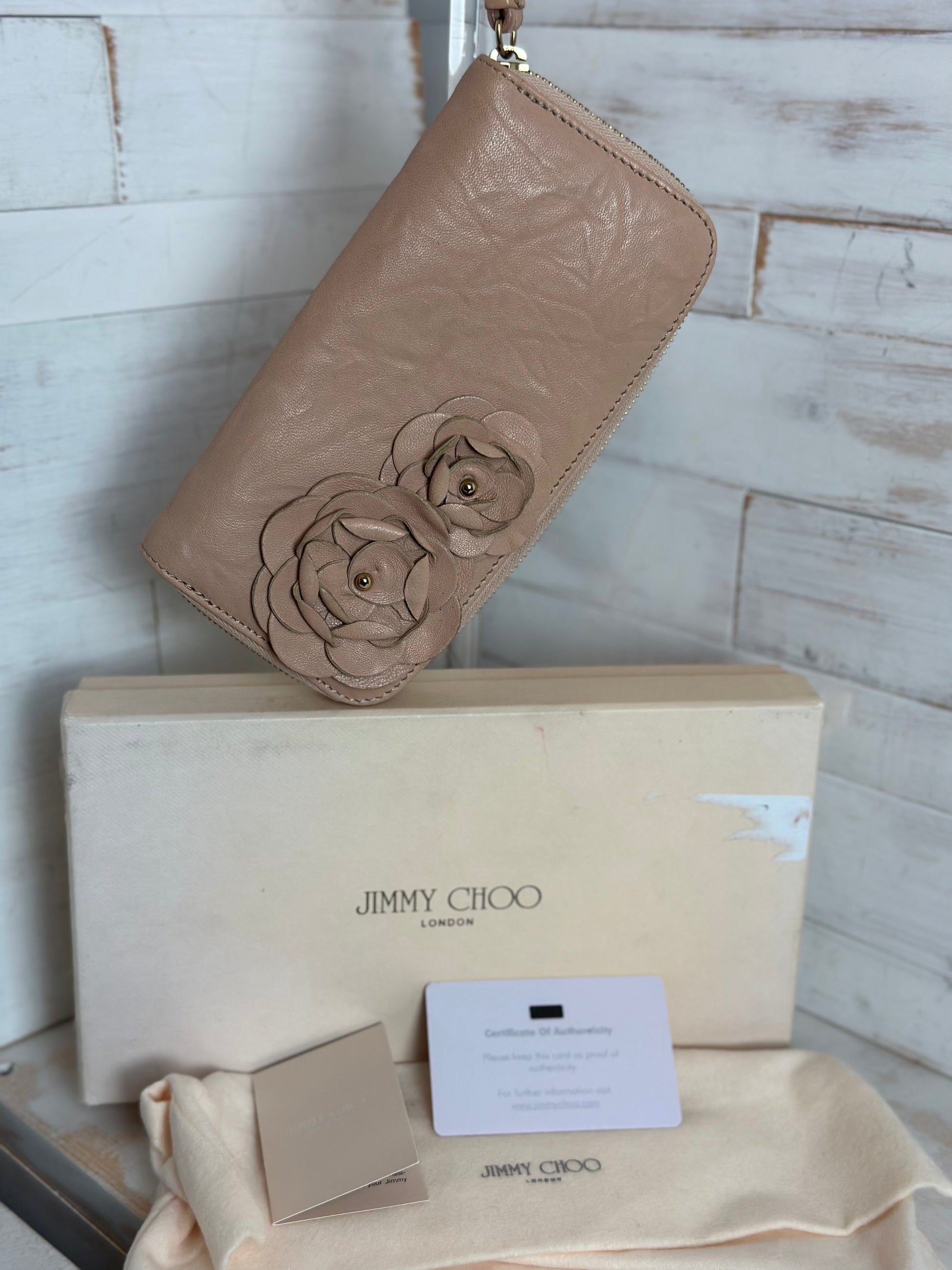 This is a stunning long wallet designed by Jimmy Choo. It features two open flowers on the front with a gold ball center. The Powder Biker Leather adorns the exterior. A wristlet leather is added to make it a two way. The interior is also in Powder Biker Leather, with 8 card slots, 2 open compartments, and a zippered compartment. Comes with the original price tag, COA, dust bag, and box.