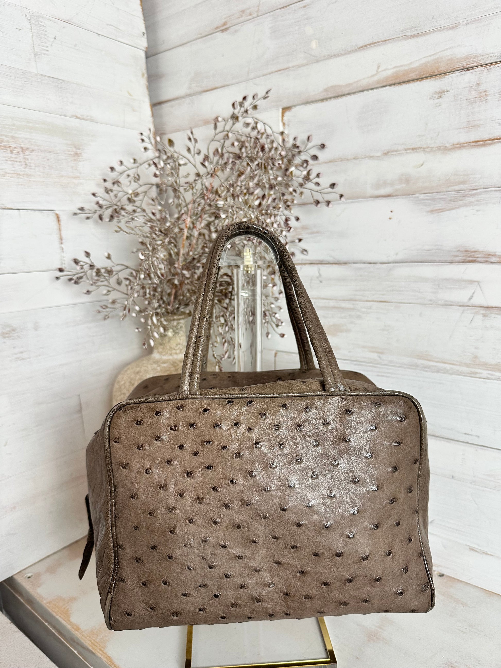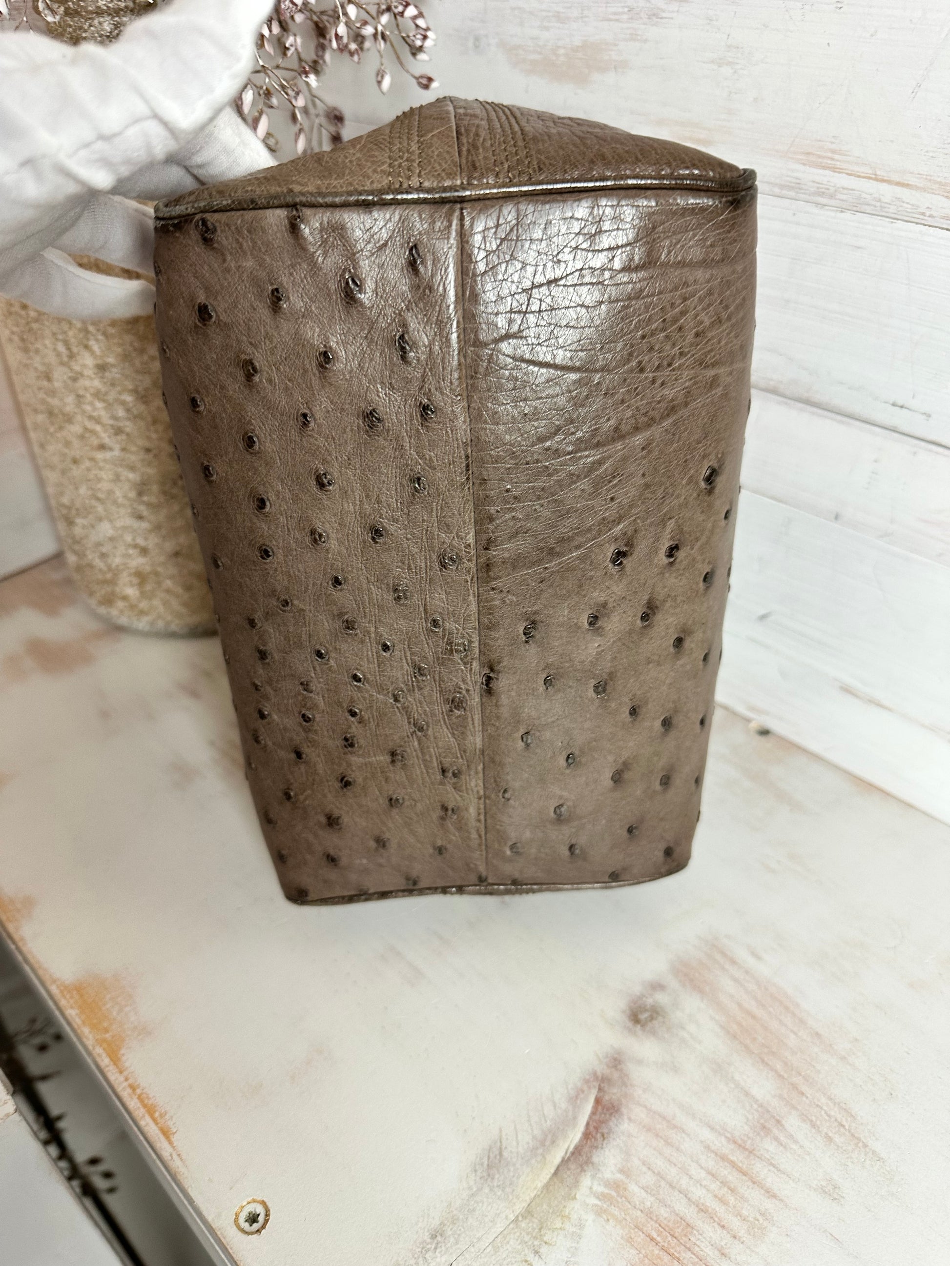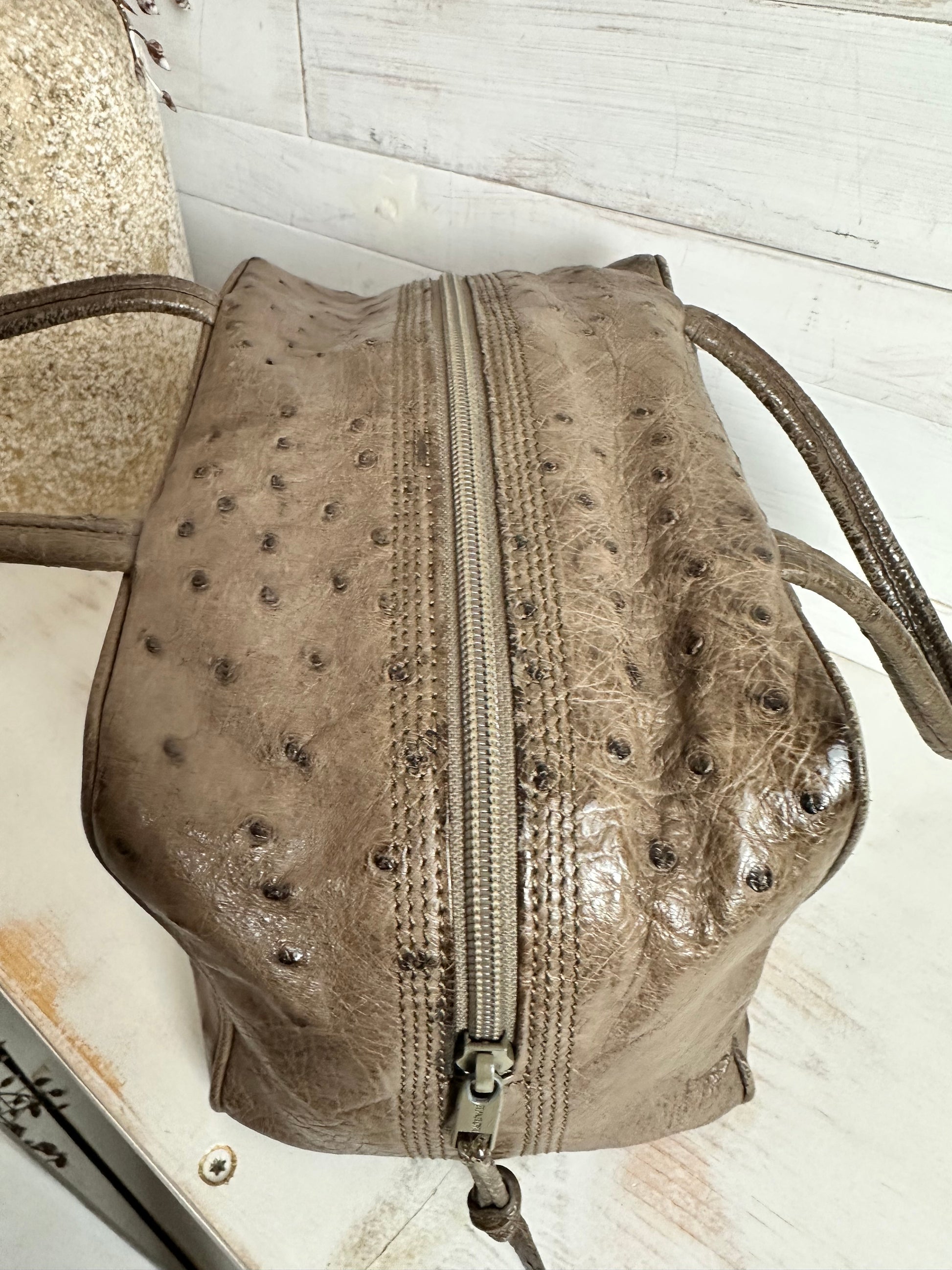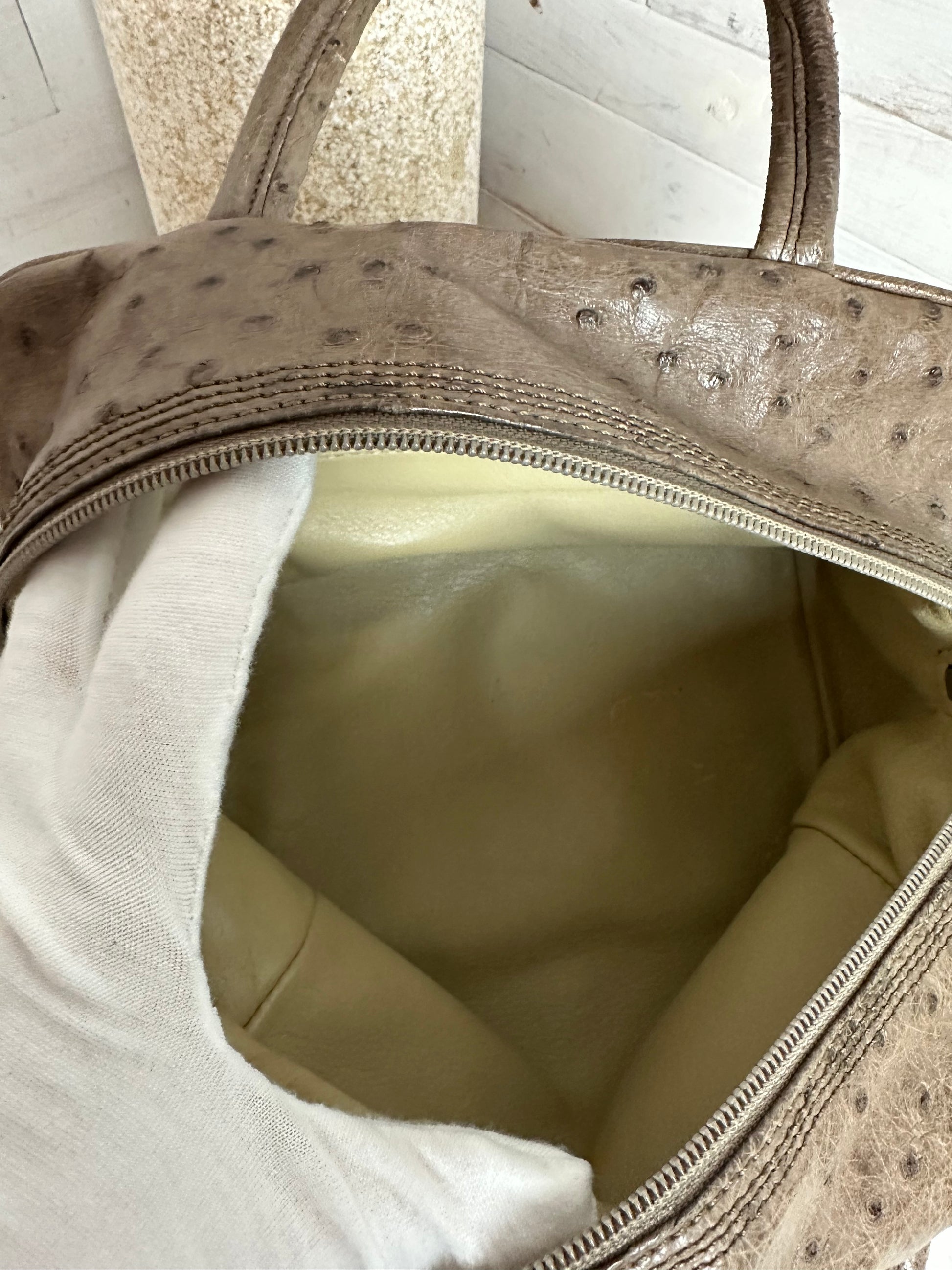 Beautiful Top Handle Ostrich Skin Loewe Bag in Taupe. Exotic in nature and supple in texture, this is a statement piece. Light tan leather interior is guaranteed to be the highlight of any collection. Interior has one zipper compartment. Note that there is wear to the leather on the bottoms and a couple of marks on the interior. Handles have sign of use with rubbing. Overall a gorgeous bag. Comes with COA and dust bag