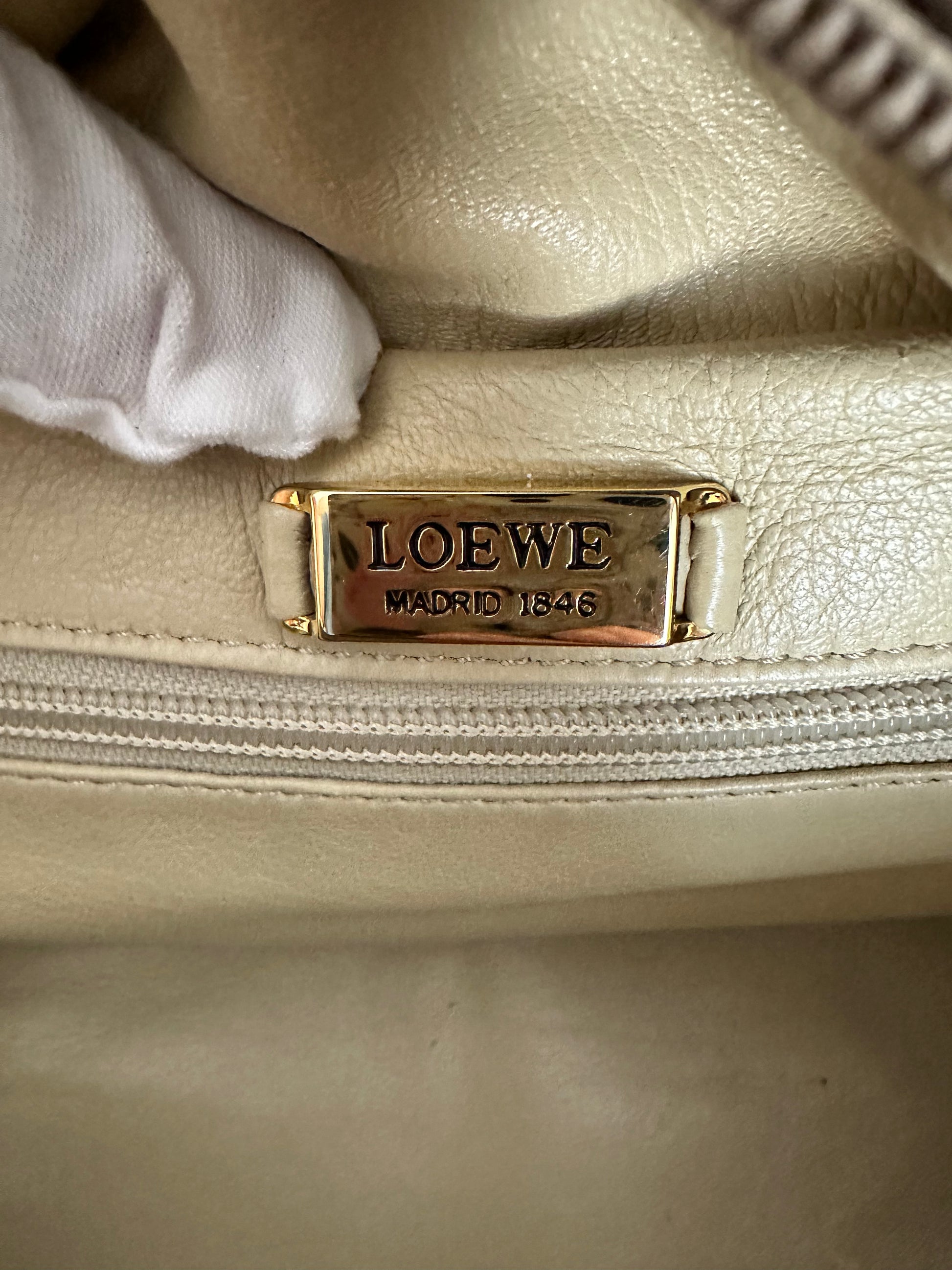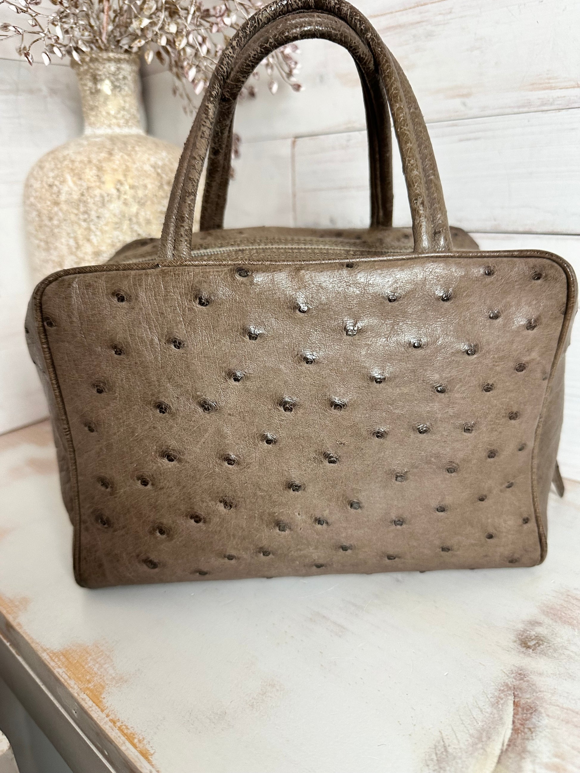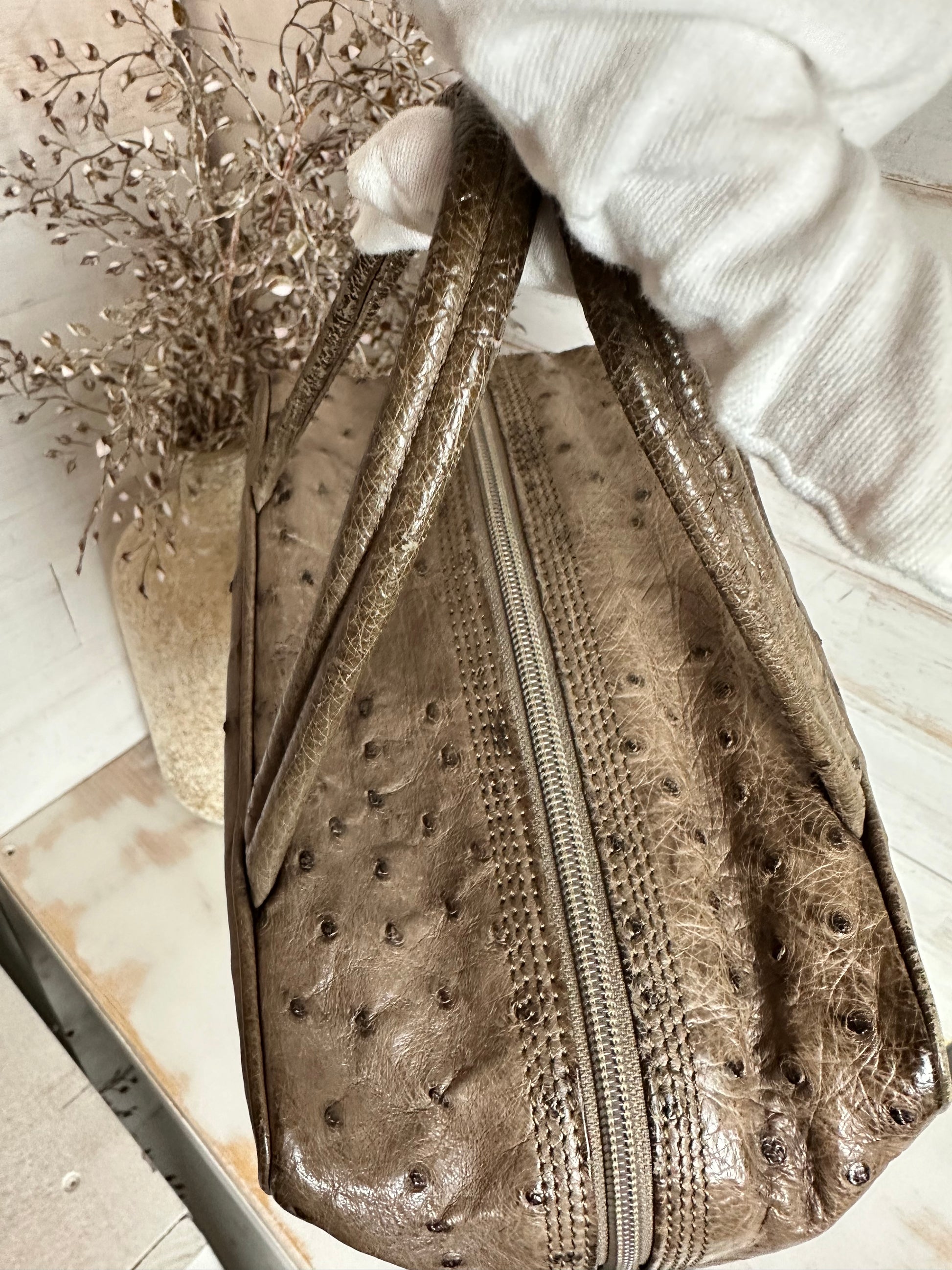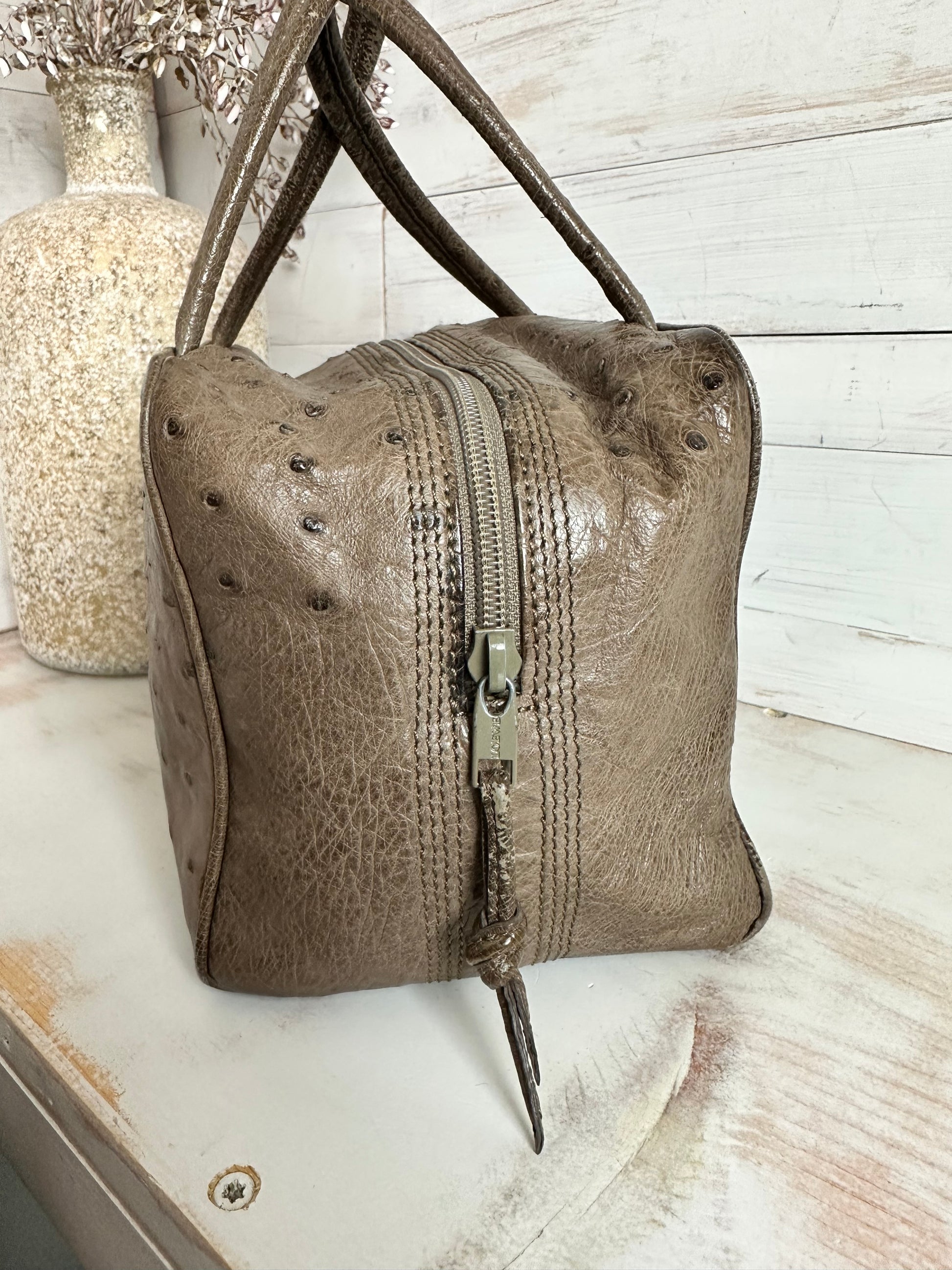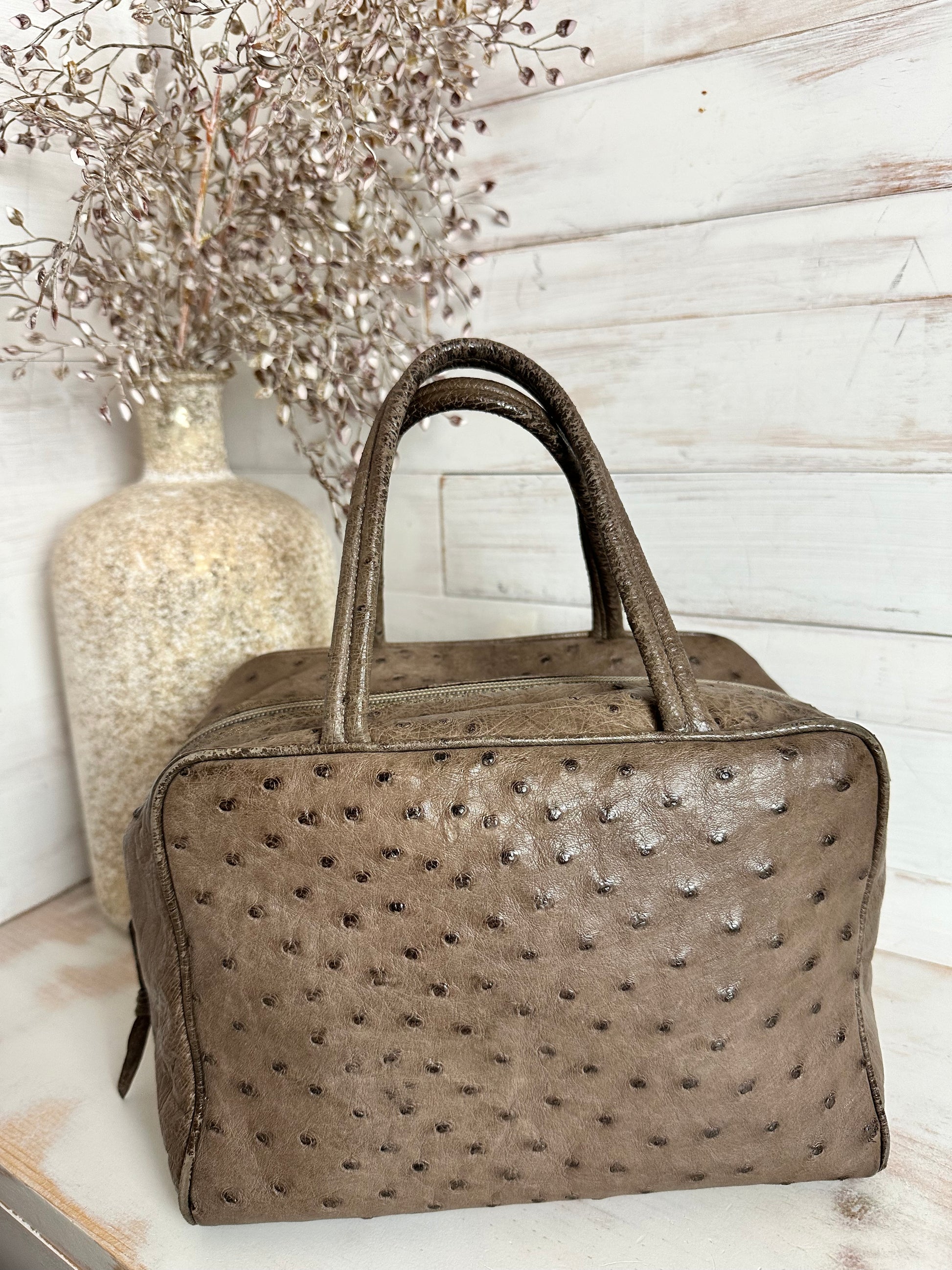 Beautiful Top Handle Ostrich Skin Loewe Bag in Taupe. Exotic in nature and supple in texture, this is a statement piece. Light tan leather interior is guaranteed to be the highlight of any collection. Interior has one zipper compartment. Note that there is wear to the leather on the bottoms and a couple of marks on the interior. Handles have sign of use with rubbing. Overall a gorgeous bag. Comes with COA and dust bag