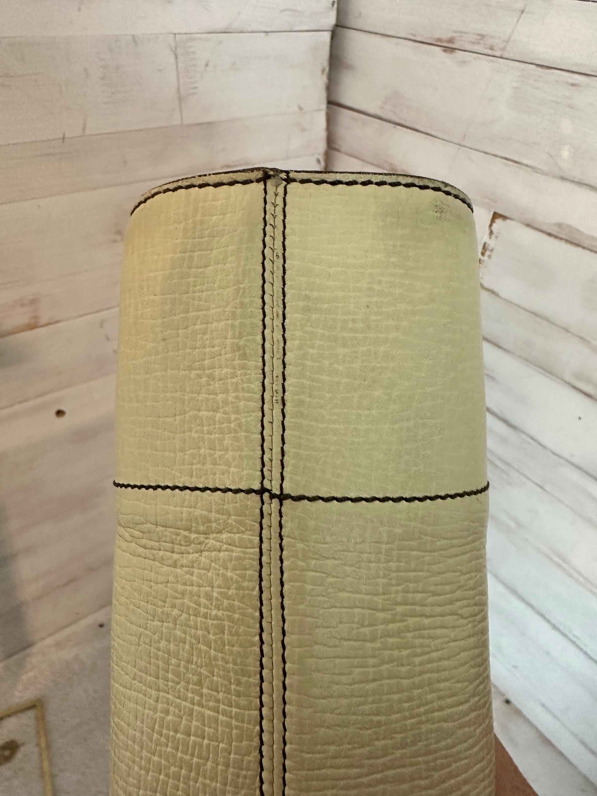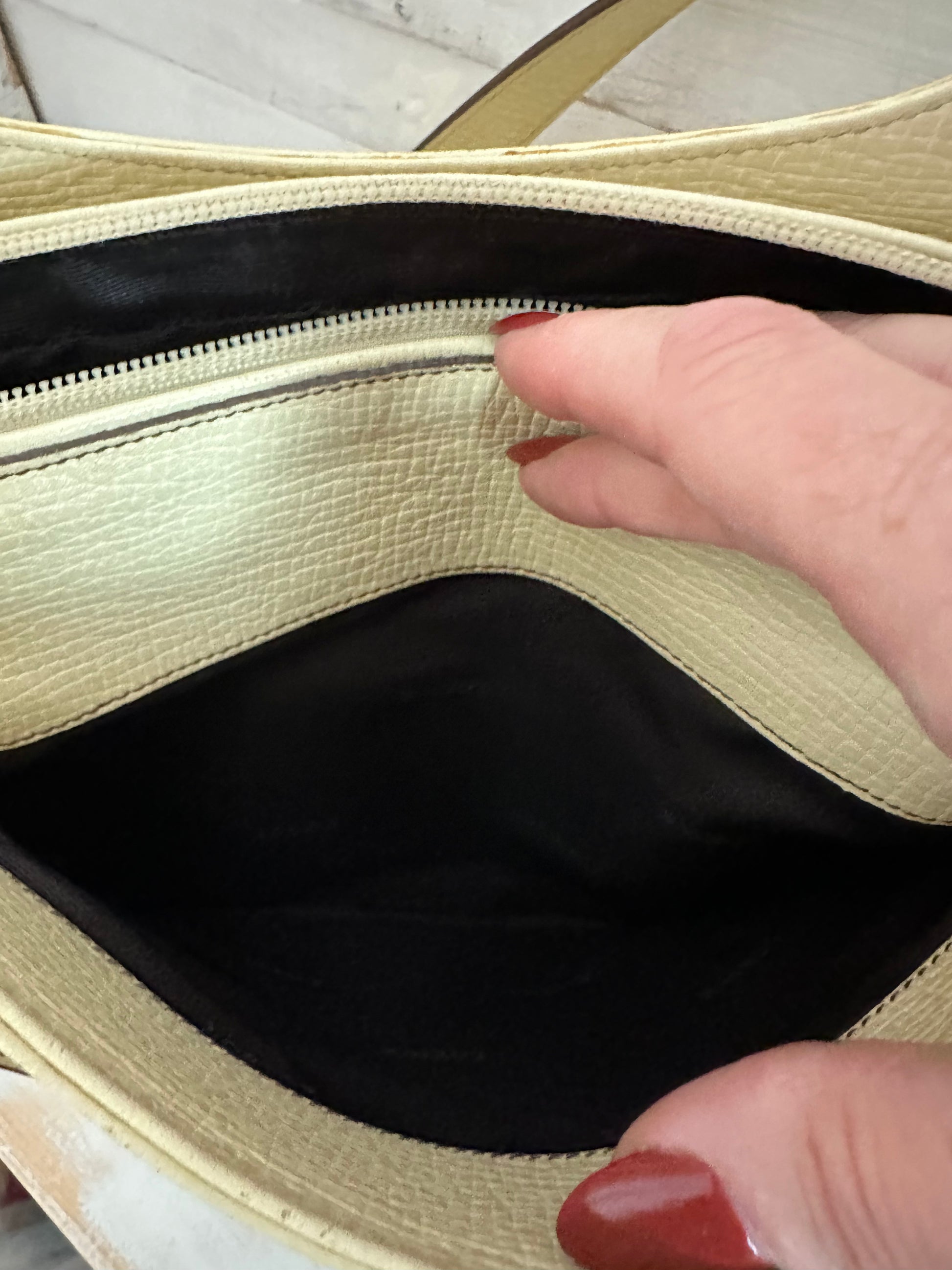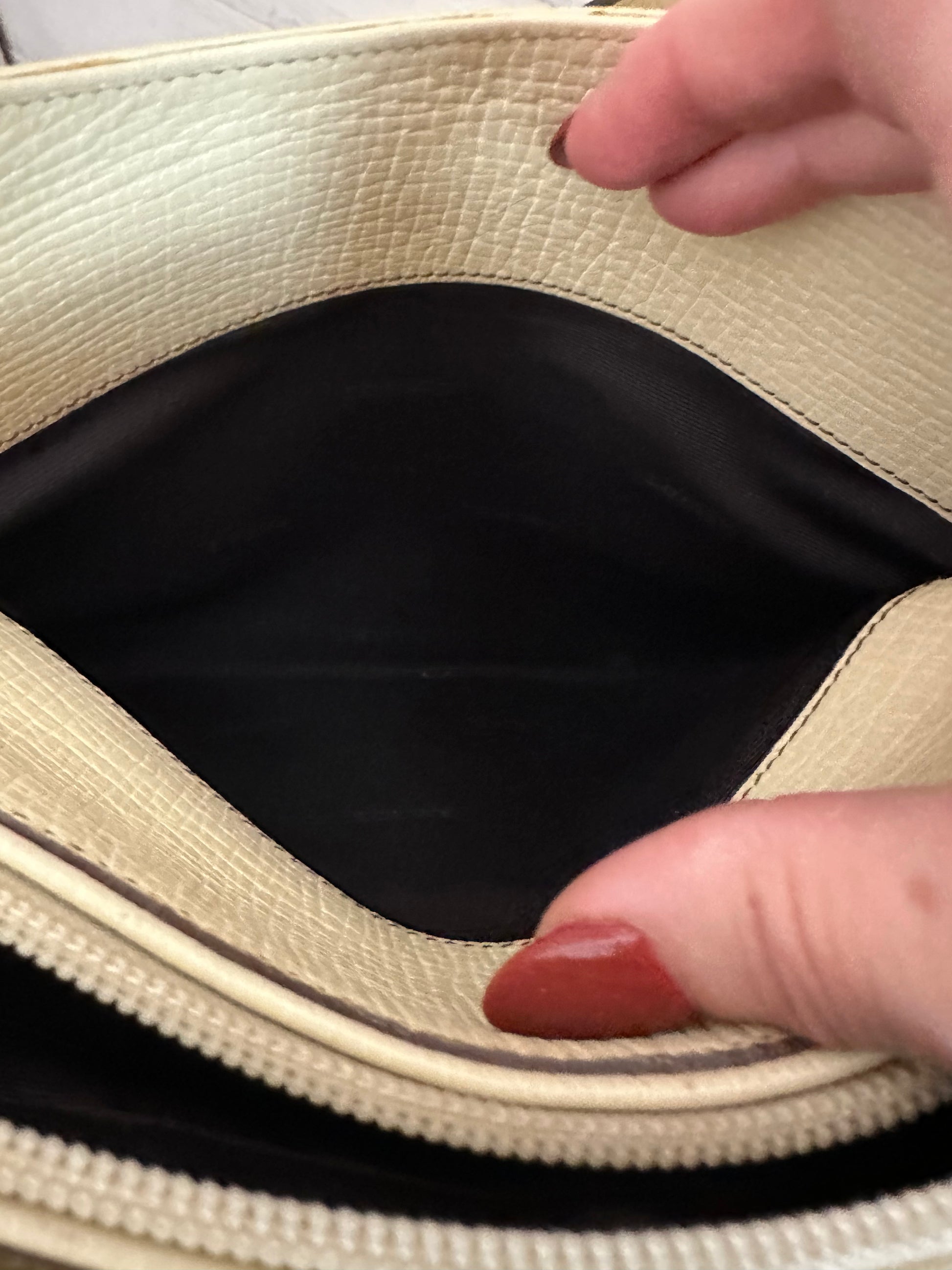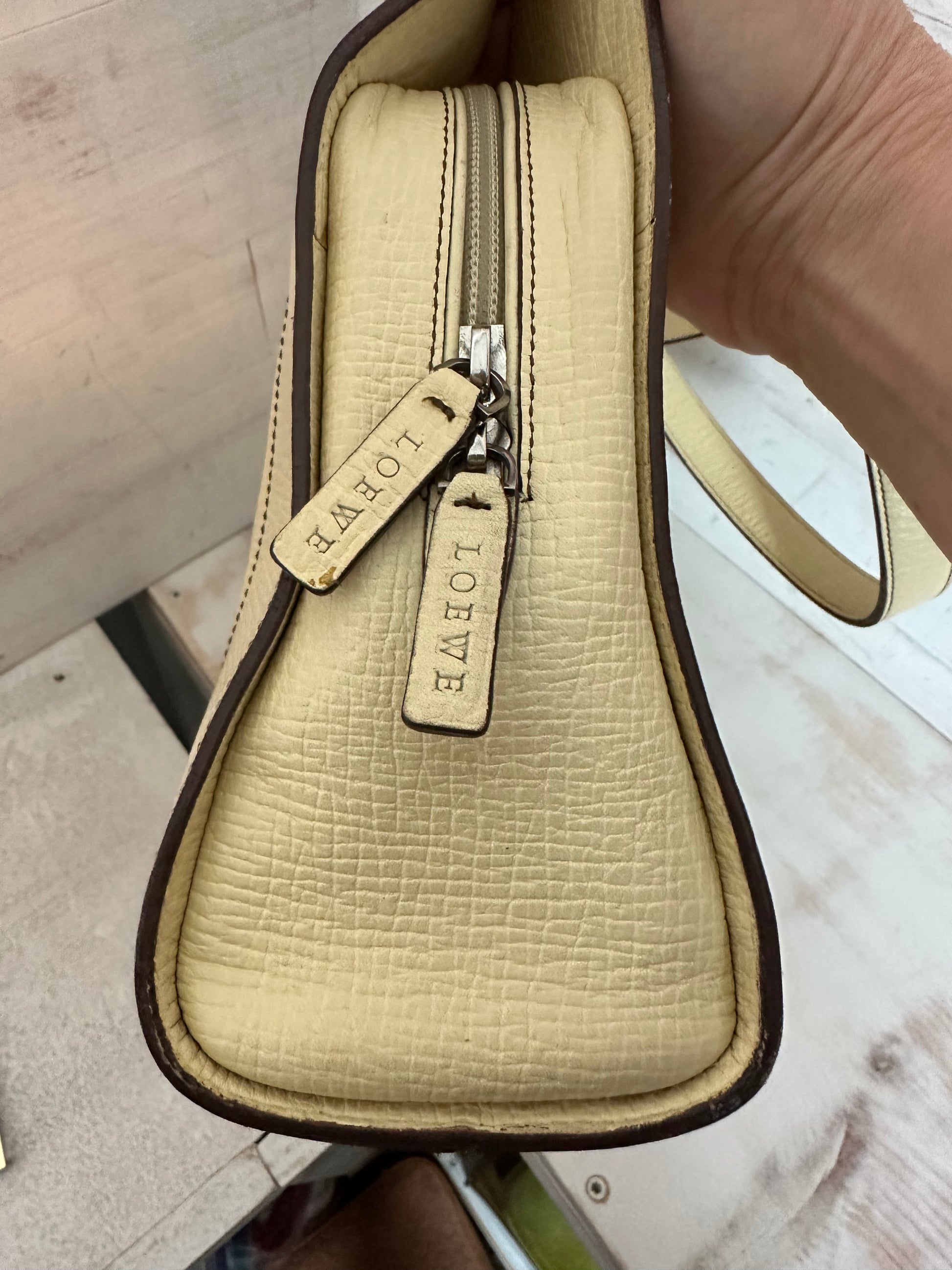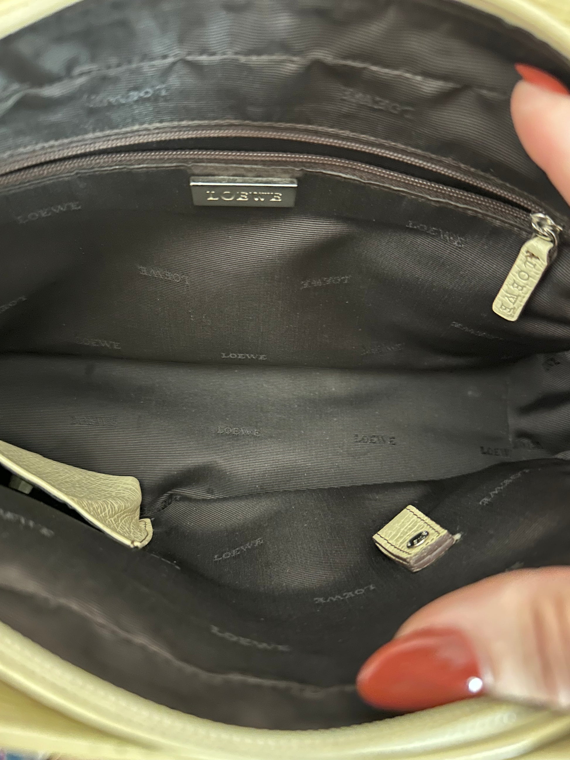 VINTAGE Loewe Cream/Yellow Textured Leather Shoulder Bag. Stylish for any occasion. Featuring a double zipper middle pocket and two side open pockets. The interior is a black fabric lined imprinted with Loewe, perfectly clean. The zippered center features a small zippered pocket, a slip pocket and a leather snap, perfect to hold your keys. Does have some rubbing on the corners (note pictures).