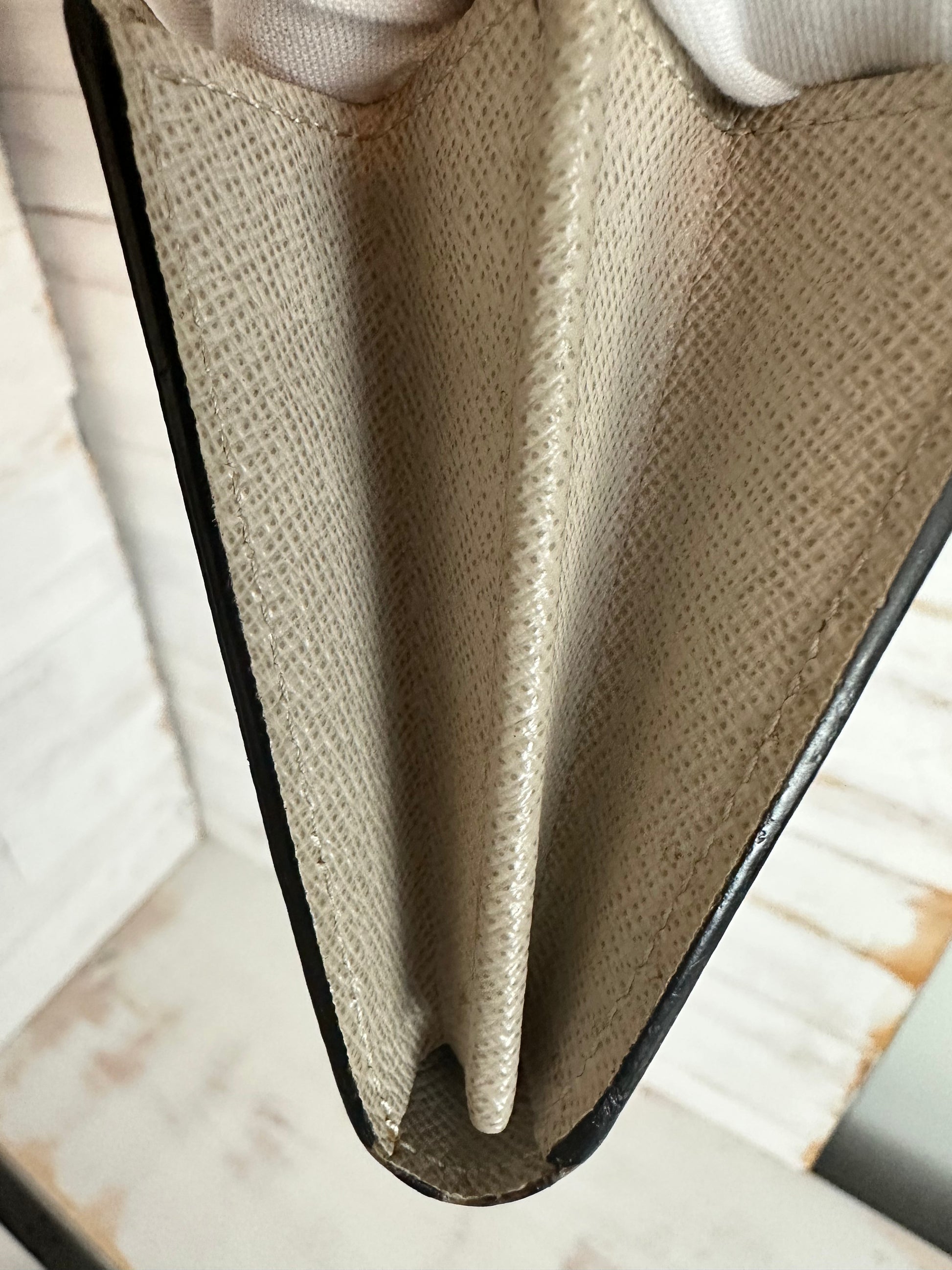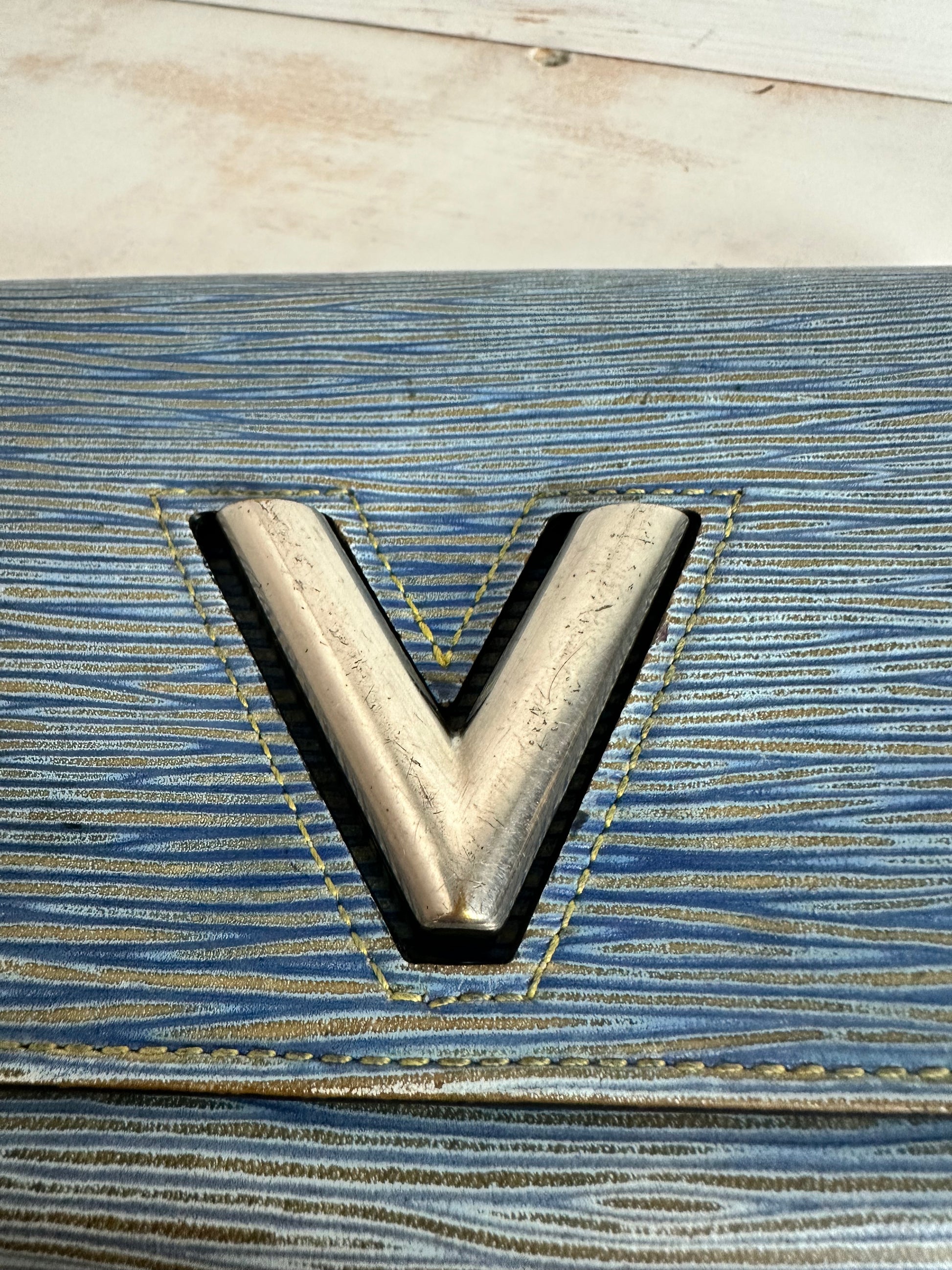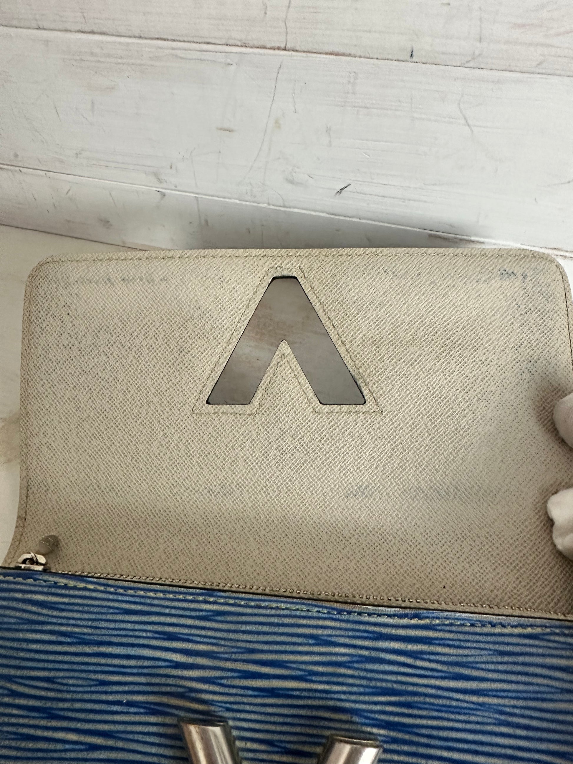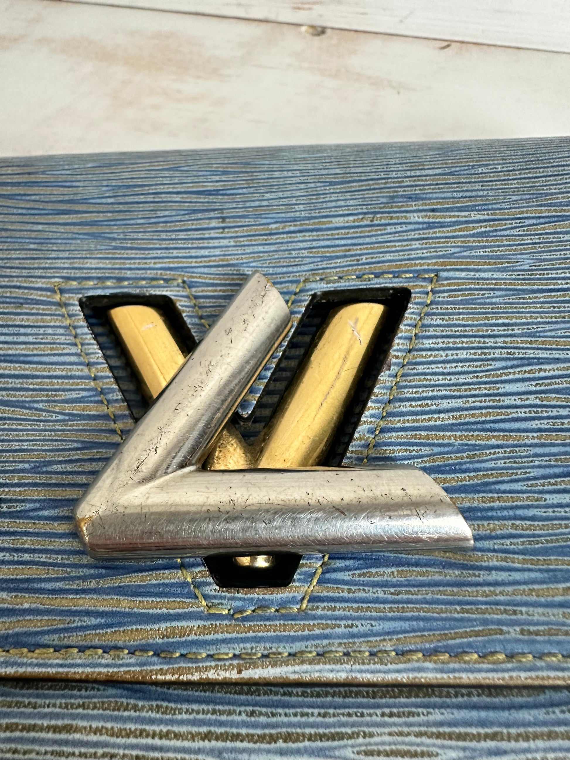 Rare Louis Vuitton Denim Epi Twist Lock Sarah Wallet. Twist lock is silver and gold toned with an exterior of epi leather in the fashion of denim. Interior is a sand color to match the graining of the exterior. Inside you will find 8 card slots, 2 slots, and a zippered pouch for change. Please note the exterior does show signs of rubbing on exterior, bottom corners have some missing piping, and hardware has scratches. Also, slight separation at upper corner, right side. Please note pictures. Interior has some color transfer. This is a rare find that would look great in any wardrobe. Comes with a COA.