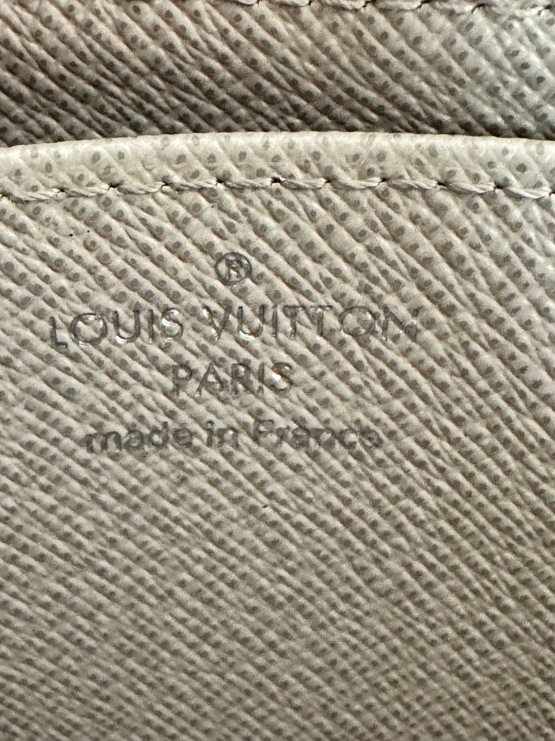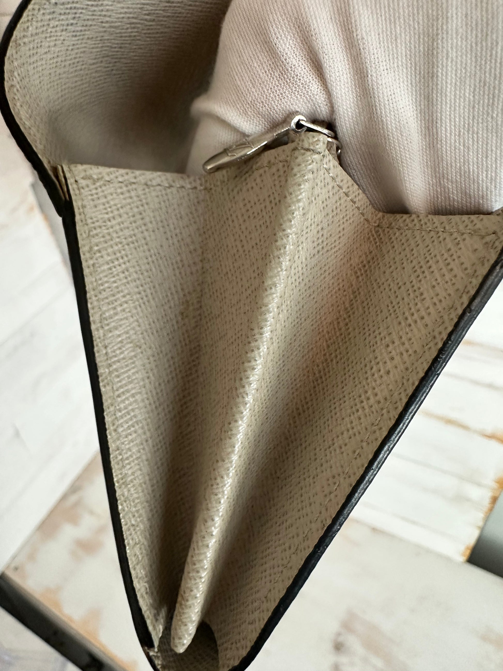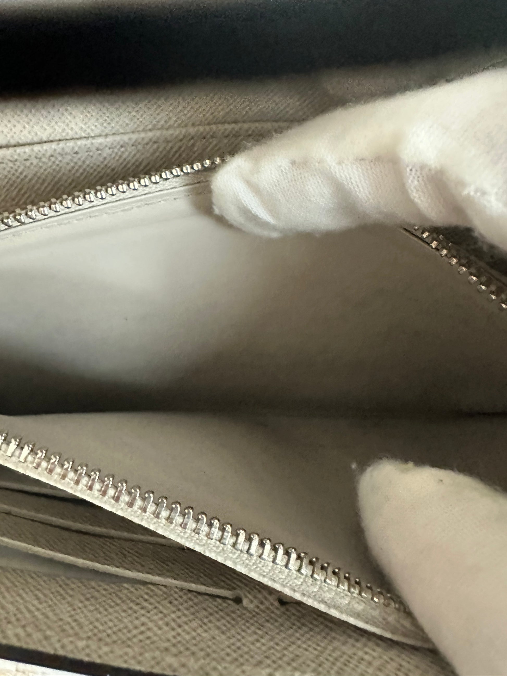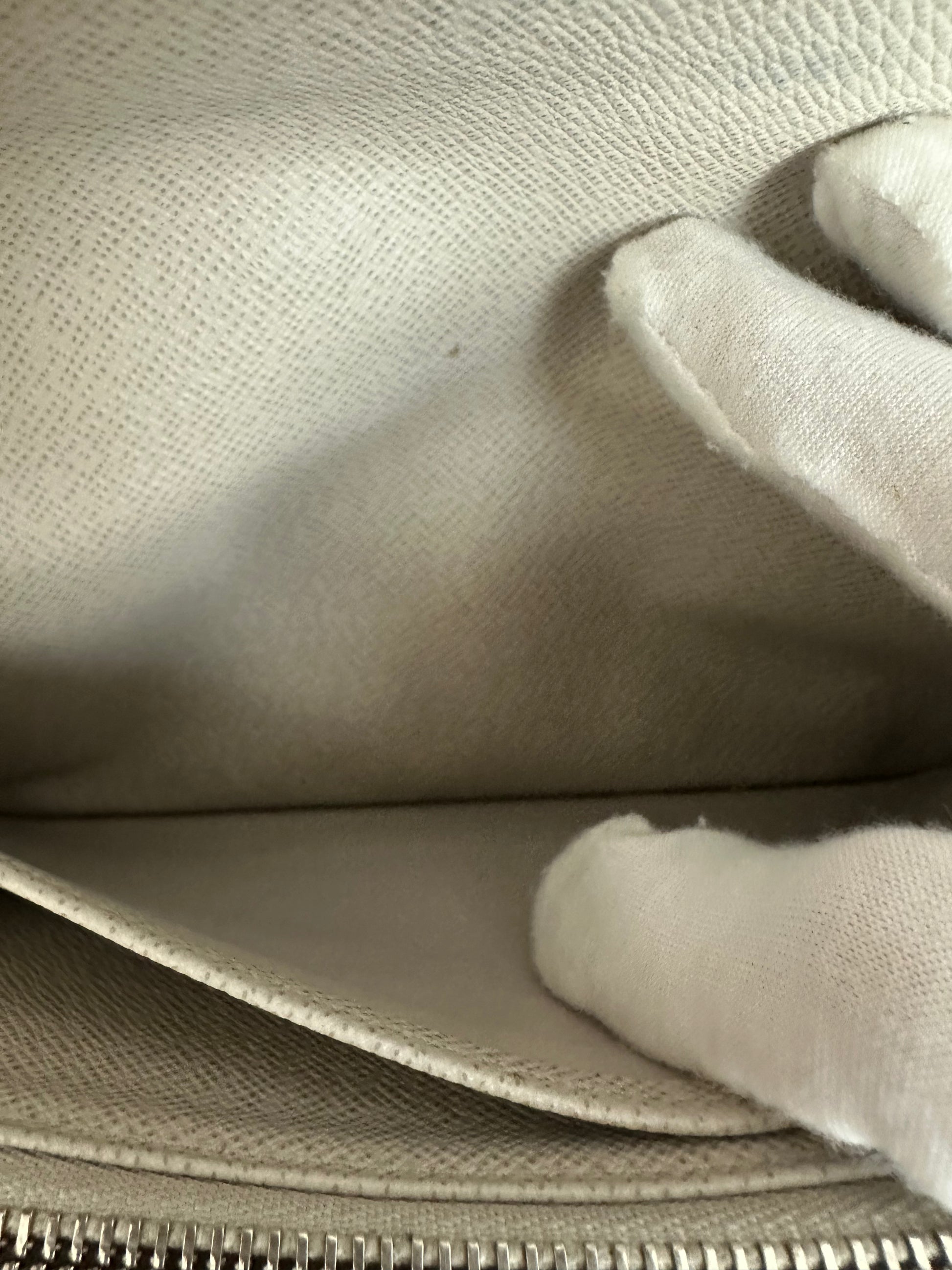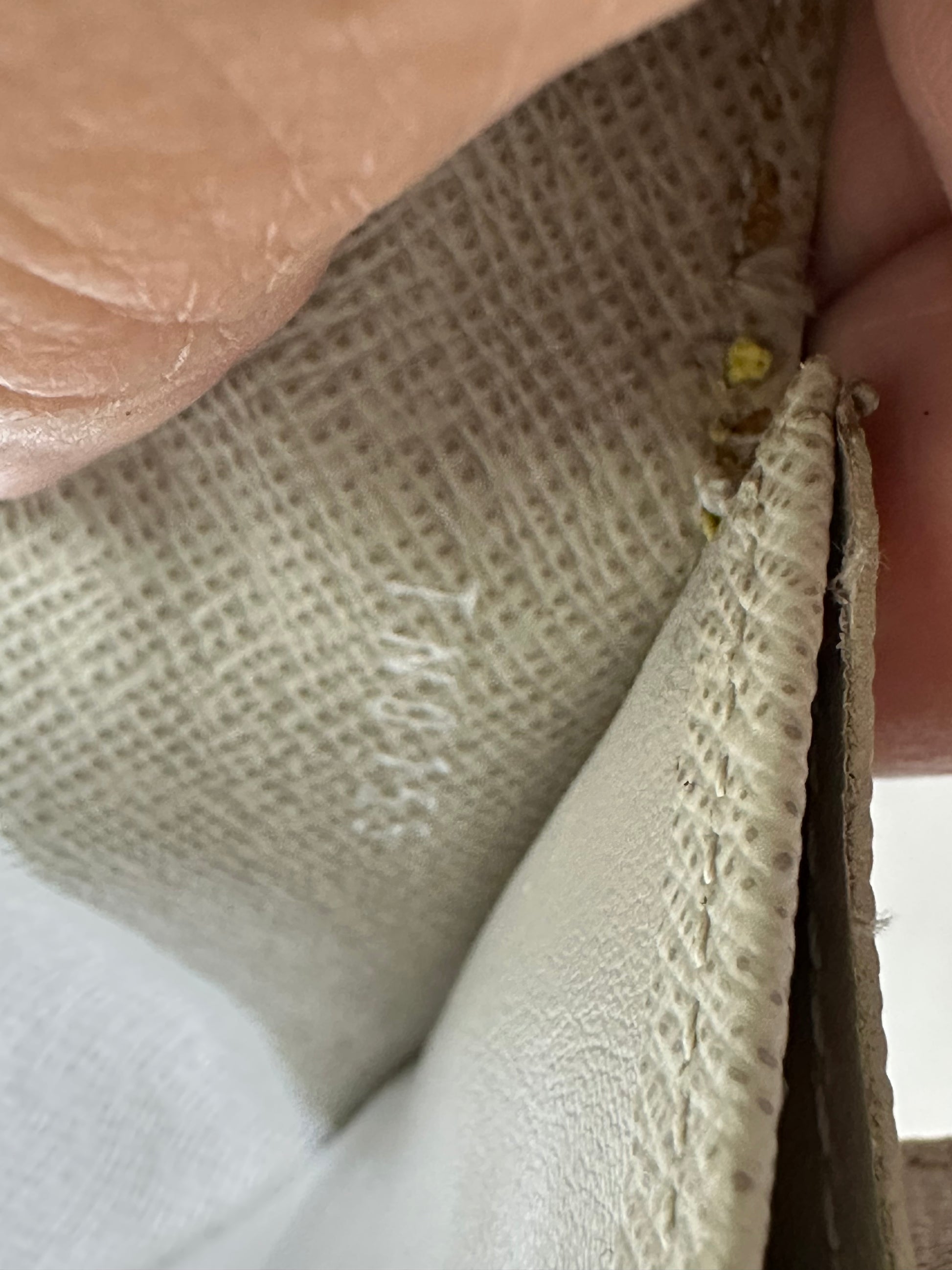Rare Louis Vuitton Denim Epi Twist Lock Sarah Wallet. Twist lock is silver and gold toned with an exterior of epi leather in the fashion of denim. Interior is a sand color to match the graining of the exterior. Inside you will find 8 card slots, 2 slots, and a zippered pouch for change. Please note the exterior does show signs of rubbing on exterior, bottom corners have some missing piping, and hardware has scratches. Also, slight separation at upper corner, right side. Please note pictures. Interior has some color transfer. This is a rare find that would look great in any wardrobe. Comes with a COA.