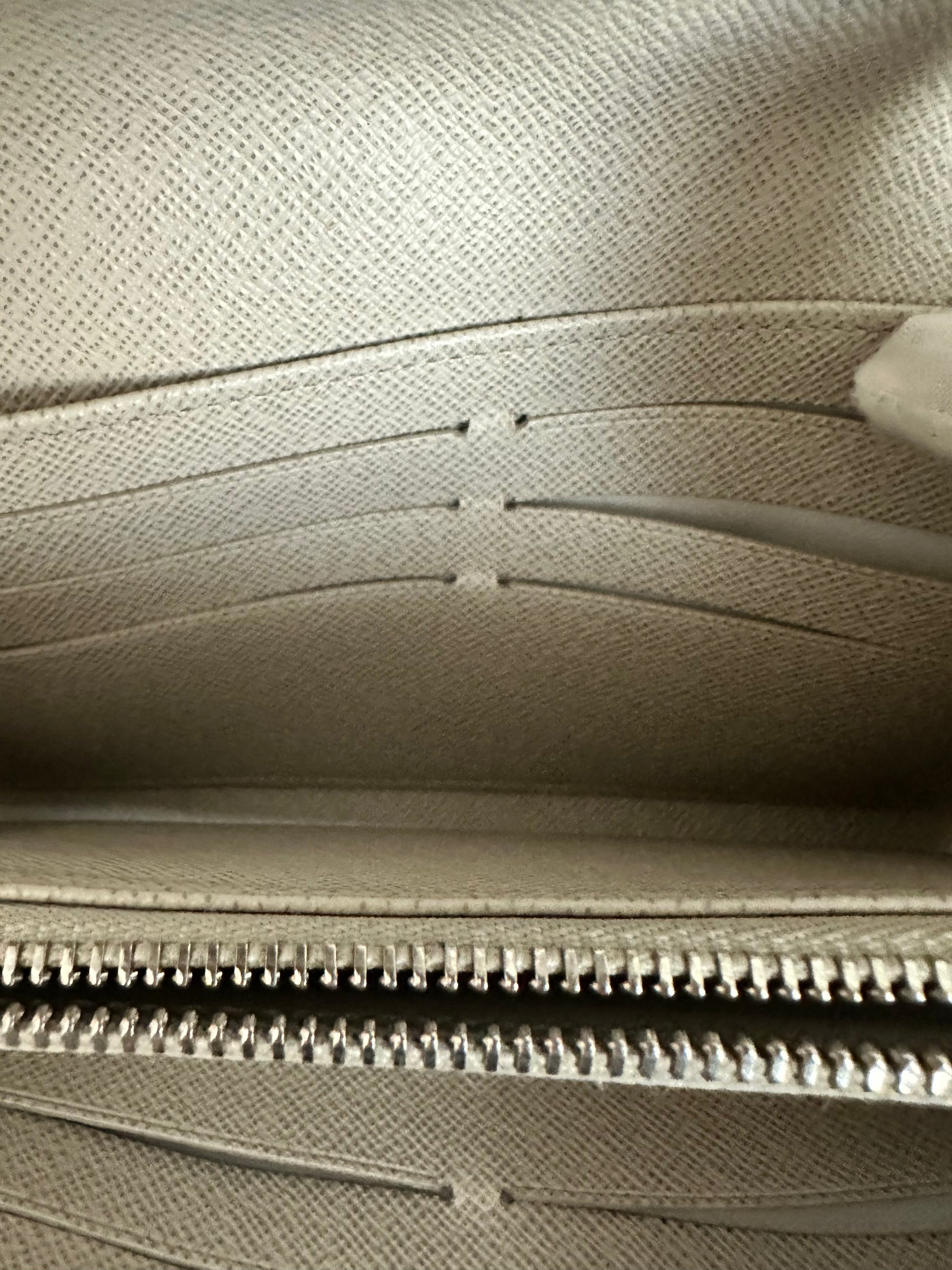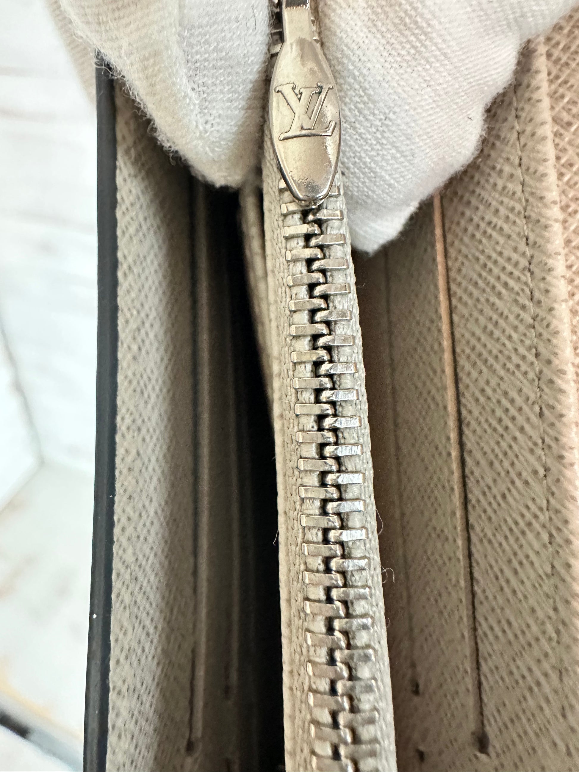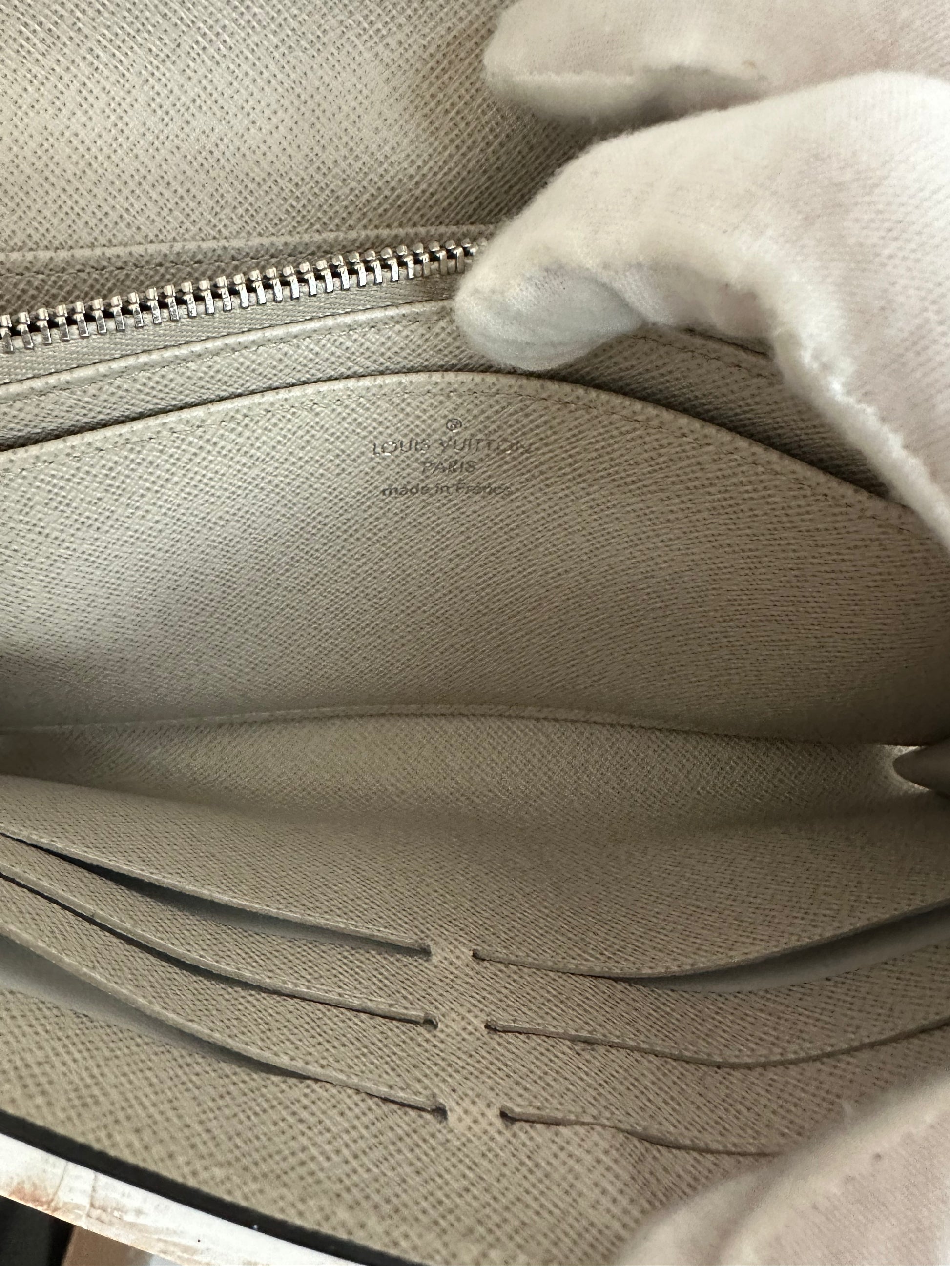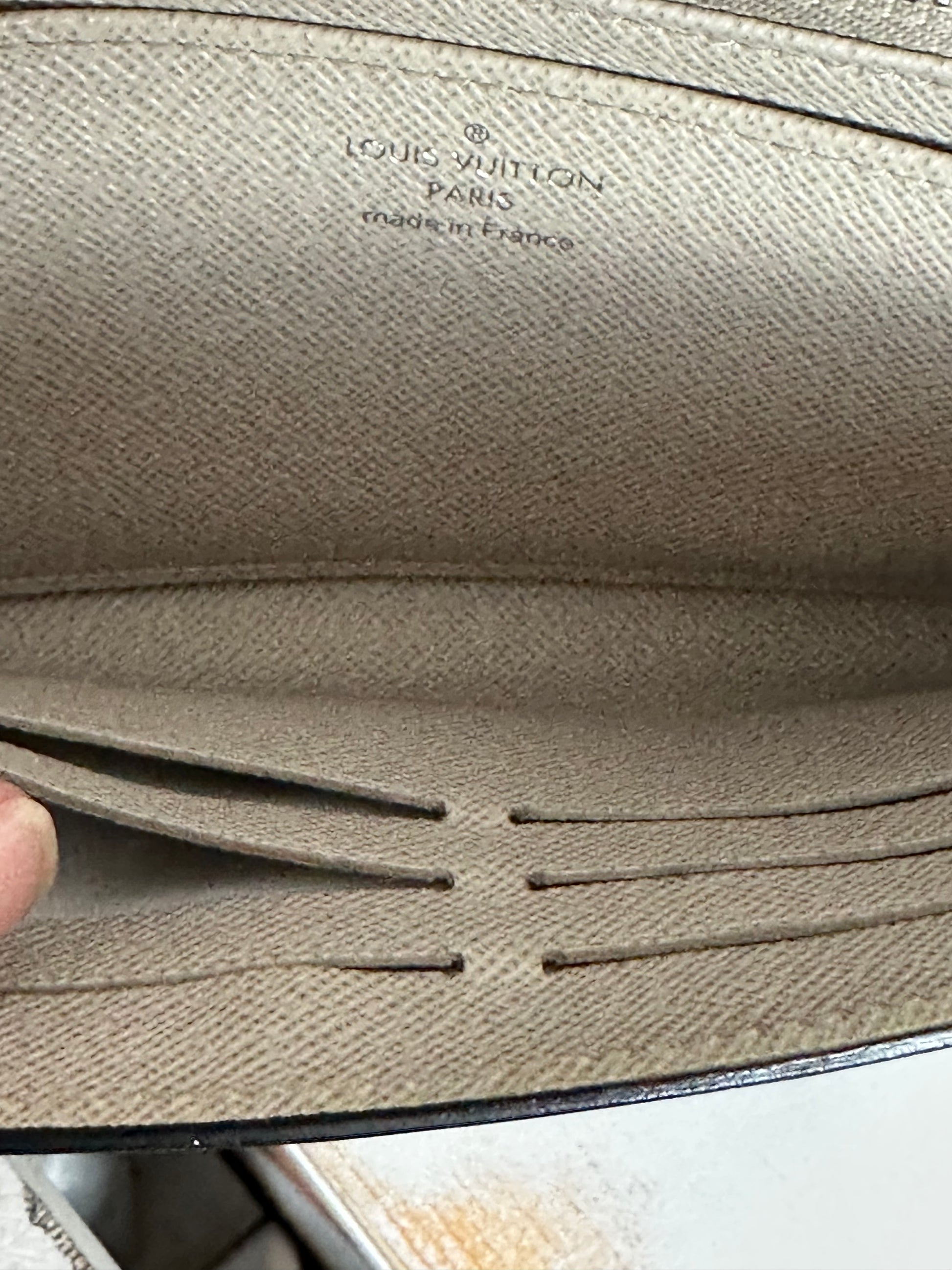 Rare Louis Vuitton Denim Epi Twist Lock Sarah Wallet. Twist lock is silver and gold toned with an exterior of epi leather in the fashion of denim. Interior is a sand color to match the graining of the exterior. Inside you will find 8 card slots, 2 slots, and a zippered pouch for change. Please note the exterior does show signs of rubbing on exterior, bottom corners have some missing piping, and hardware has scratches. Also, slight separation at upper corner, right side. Please note pictures. Interior has some color transfer. This is a rare find that would look great in any wardrobe. Comes with a COA.