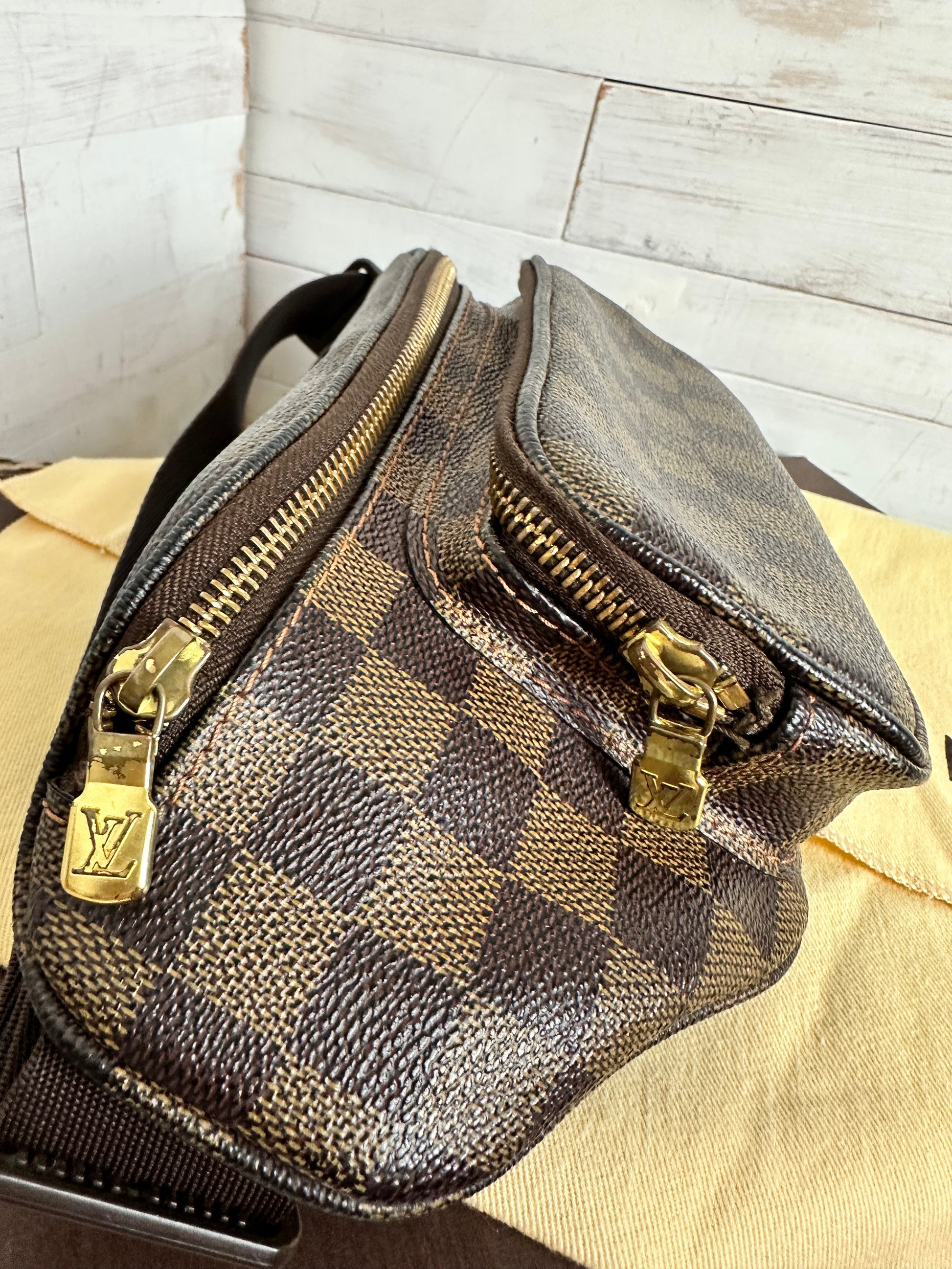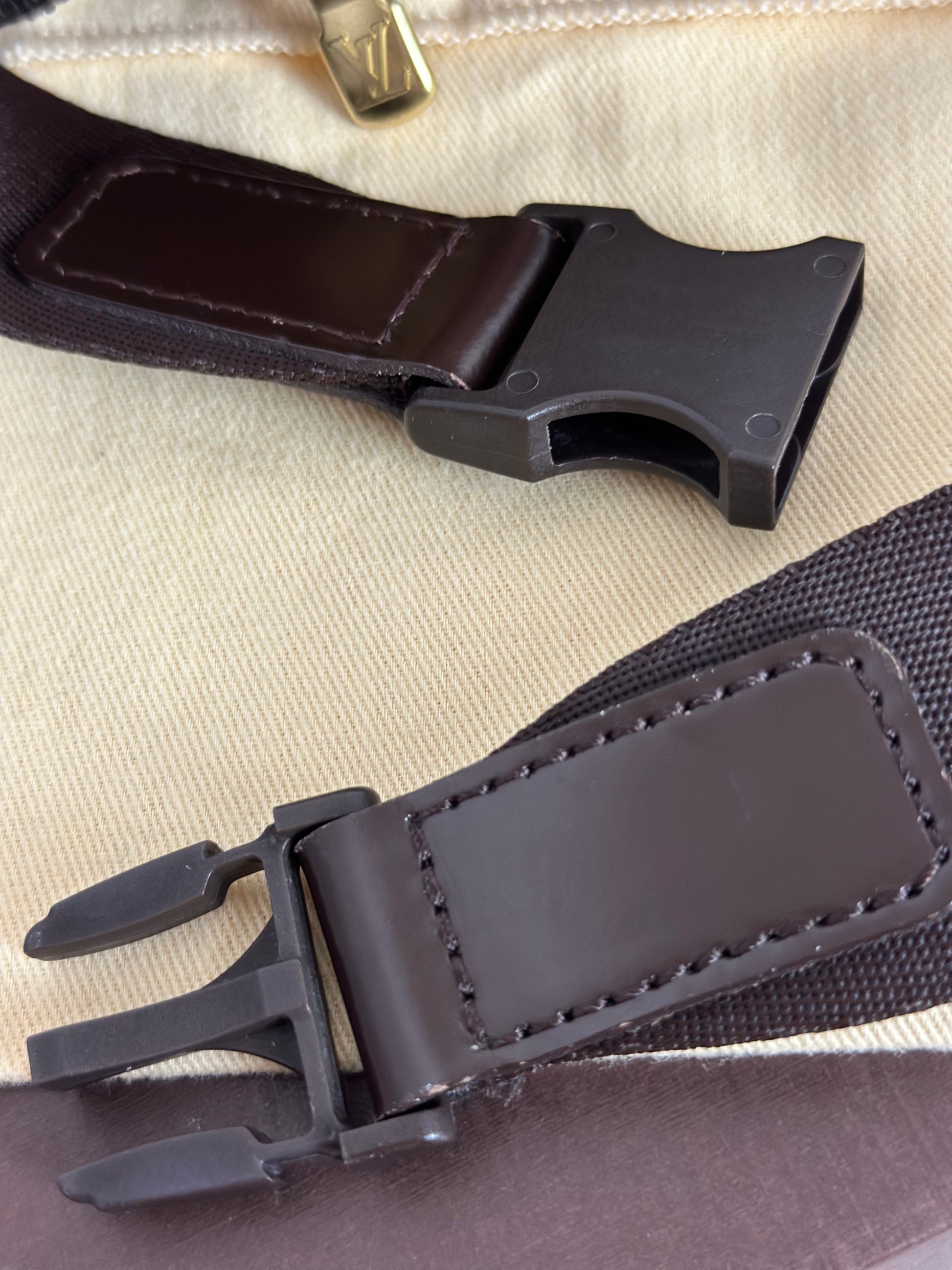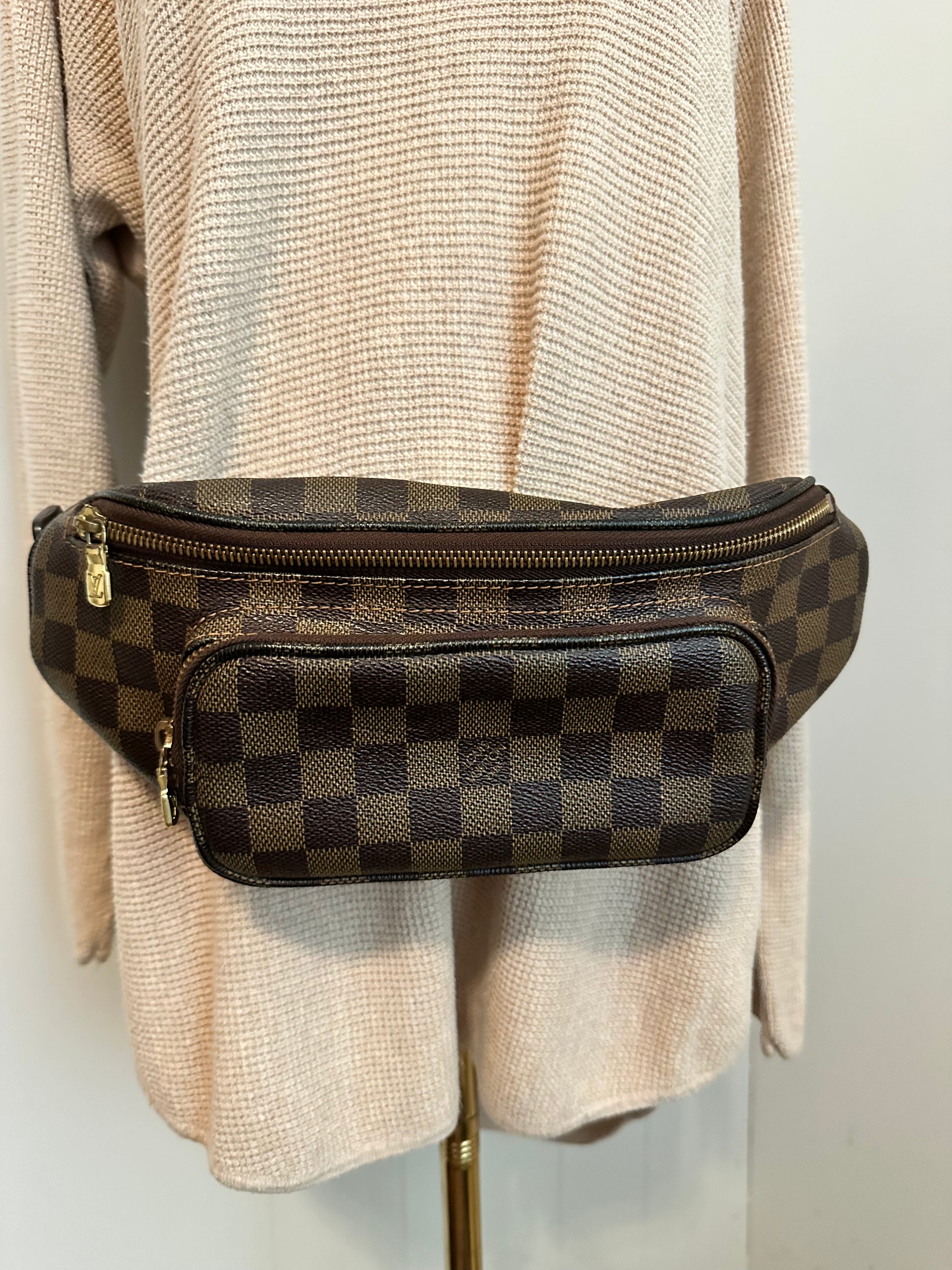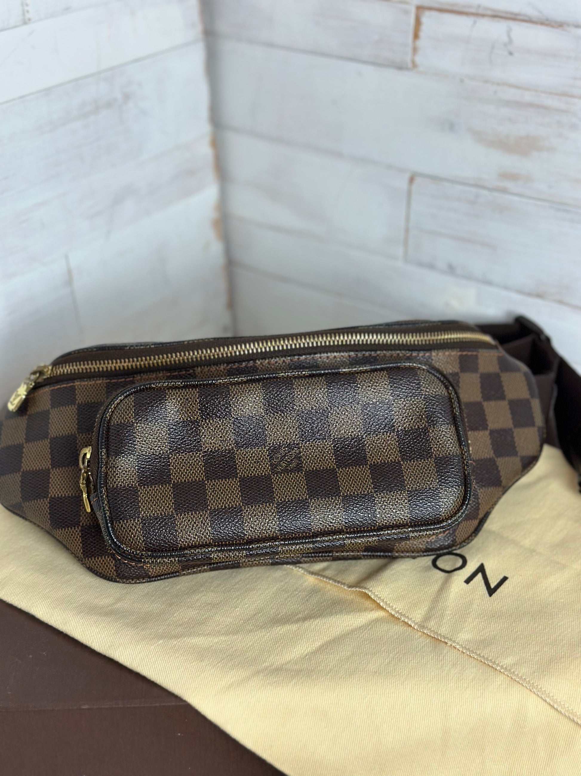 This is an authentic LOUIS VUITTON Damier Ebene Melville Bum Bag. This stylish bum bag is crafted of signature Louis Vuitton Damier checkered coated canvas in brown. The bag features an adjustable nylon waist strap with a buckle and front and back zipper compartment. It opens to a dark brown fabric interior. Hardware has some tarnish. Comes with box and dust bag.