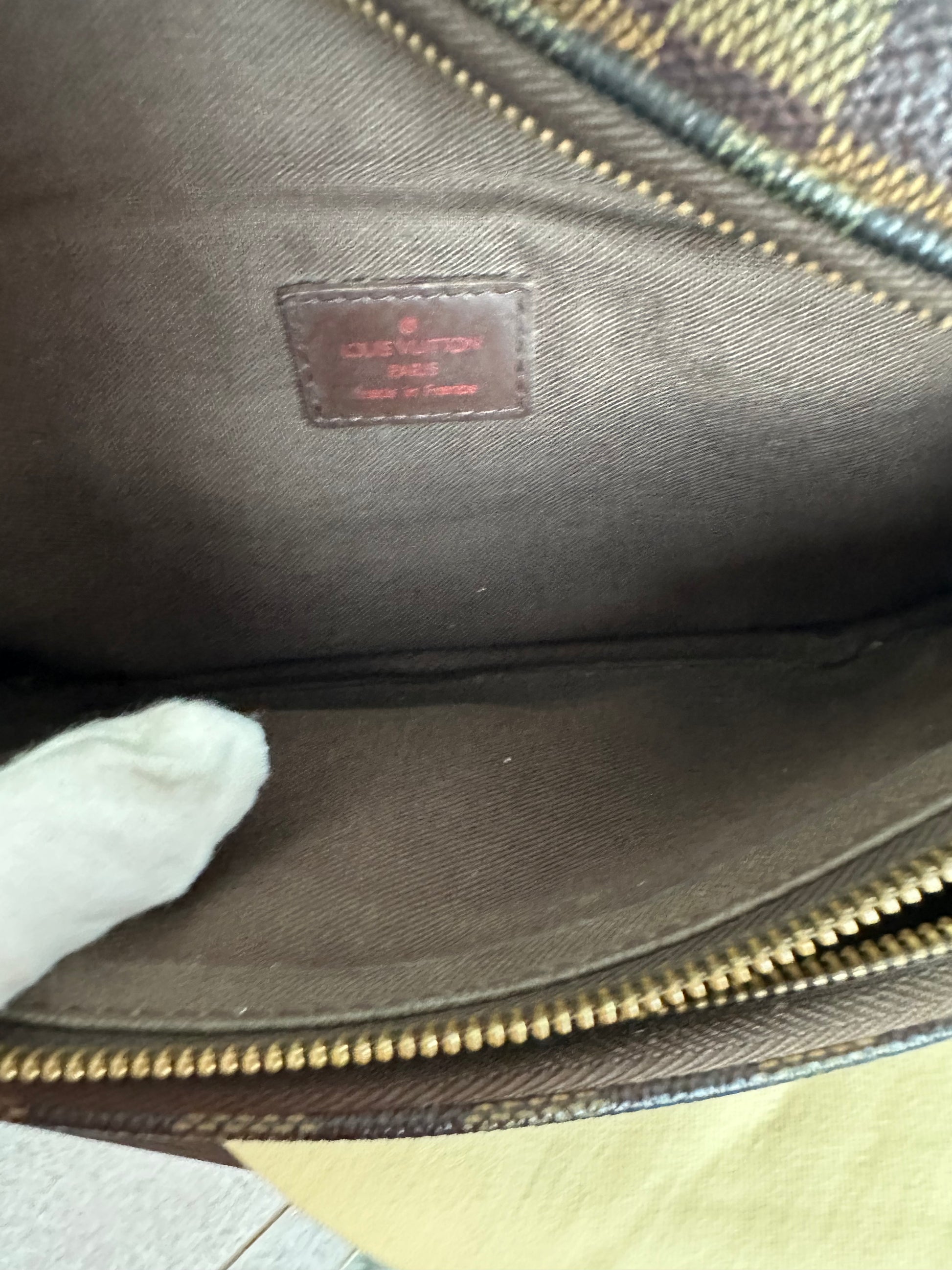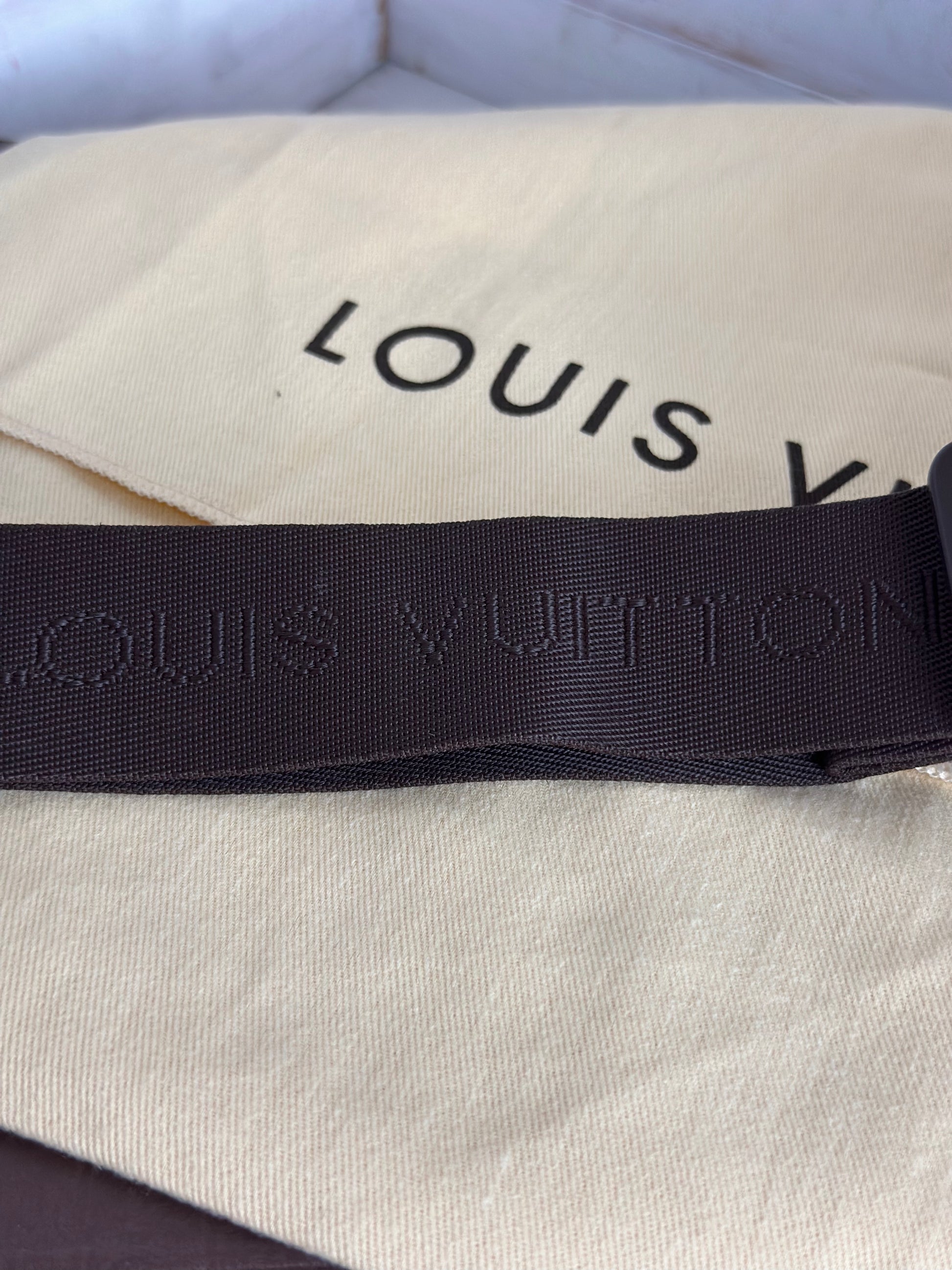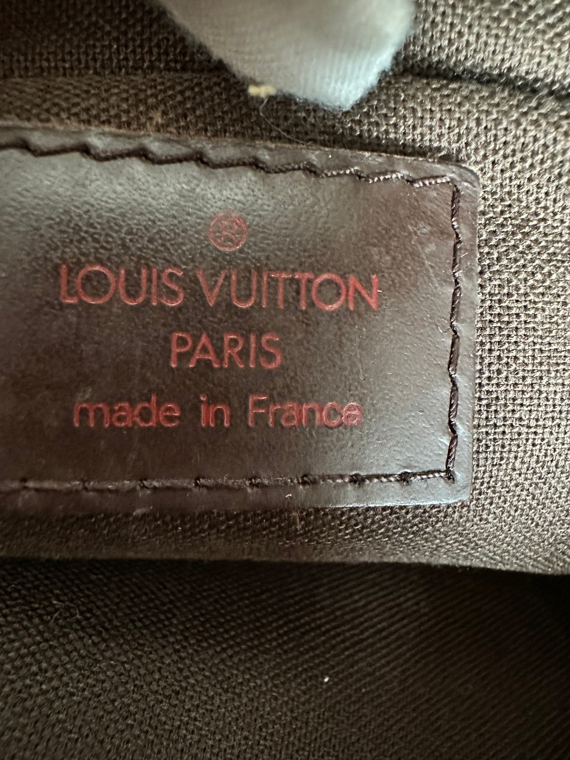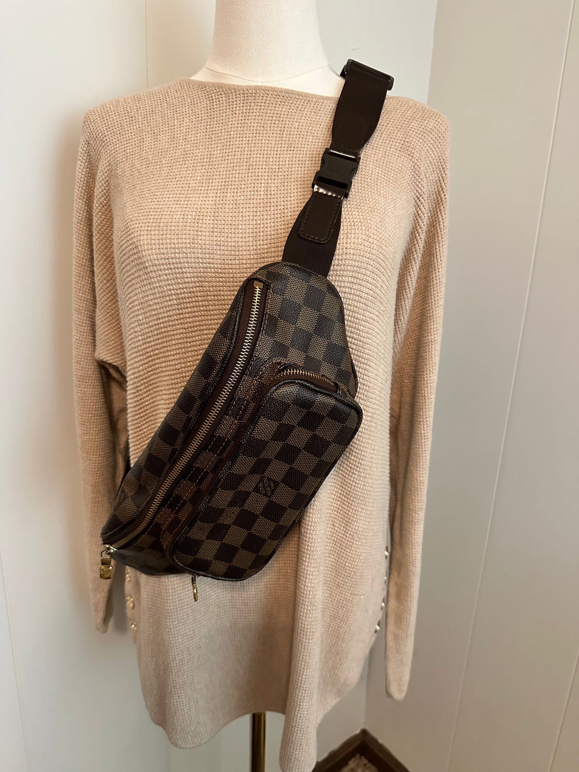 This is an authentic LOUIS VUITTON Damier Ebene Melville Bum Bag. This stylish bum bag is crafted of signature Louis Vuitton Damier checkered coated canvas in brown. The bag features an adjustable nylon waist strap with a buckle and front and back zipper compartment. It opens to a dark brown fabric interior. Hardware has some tarnish. Comes with box and dust bag.