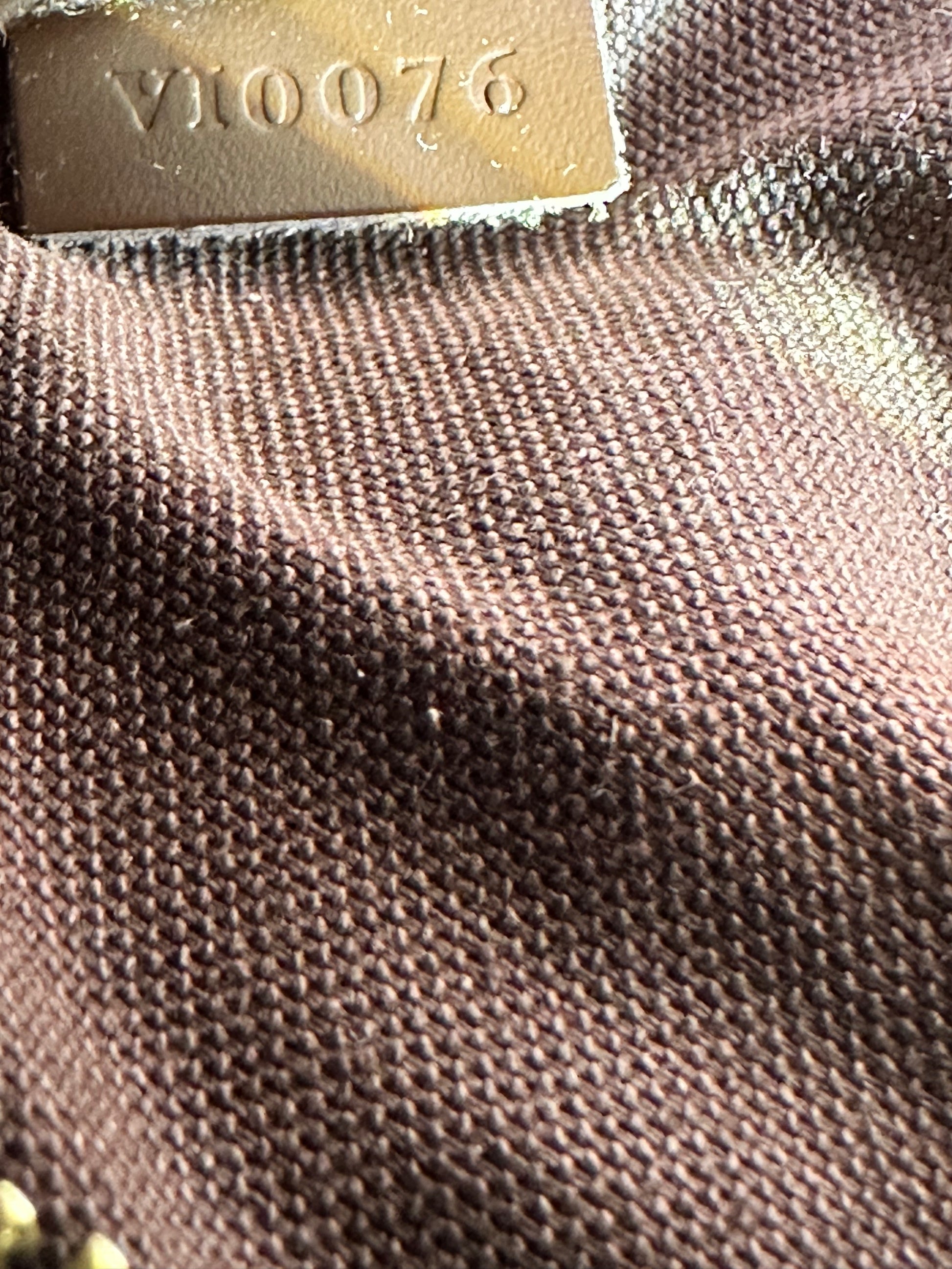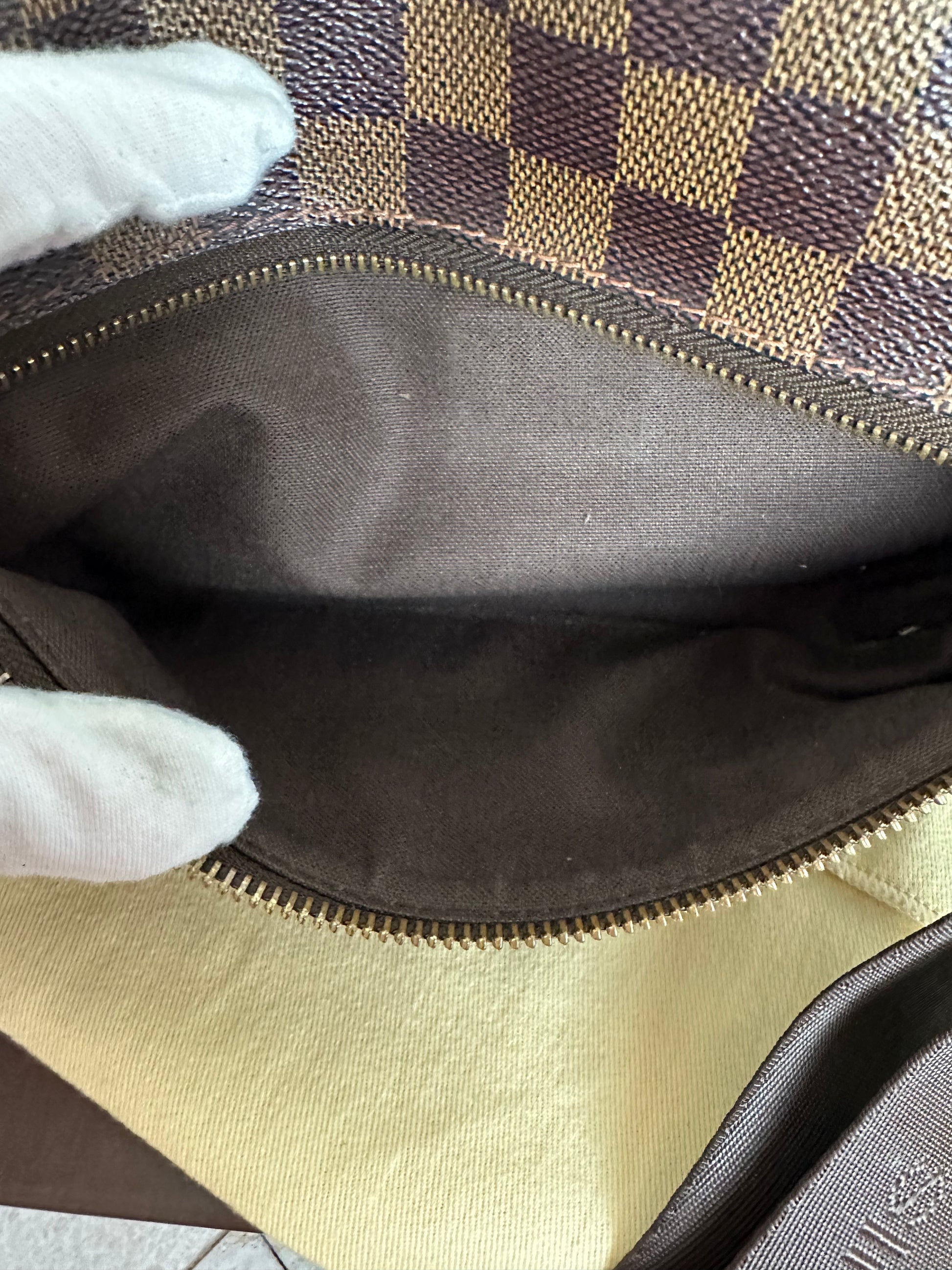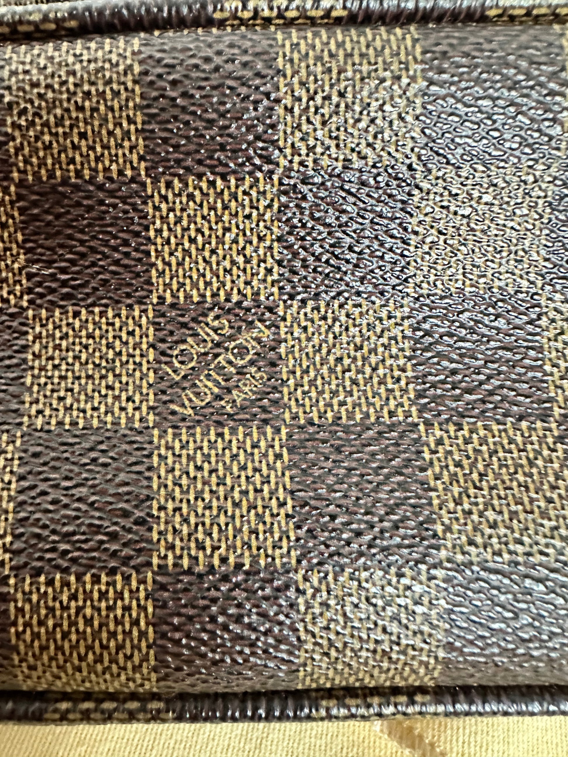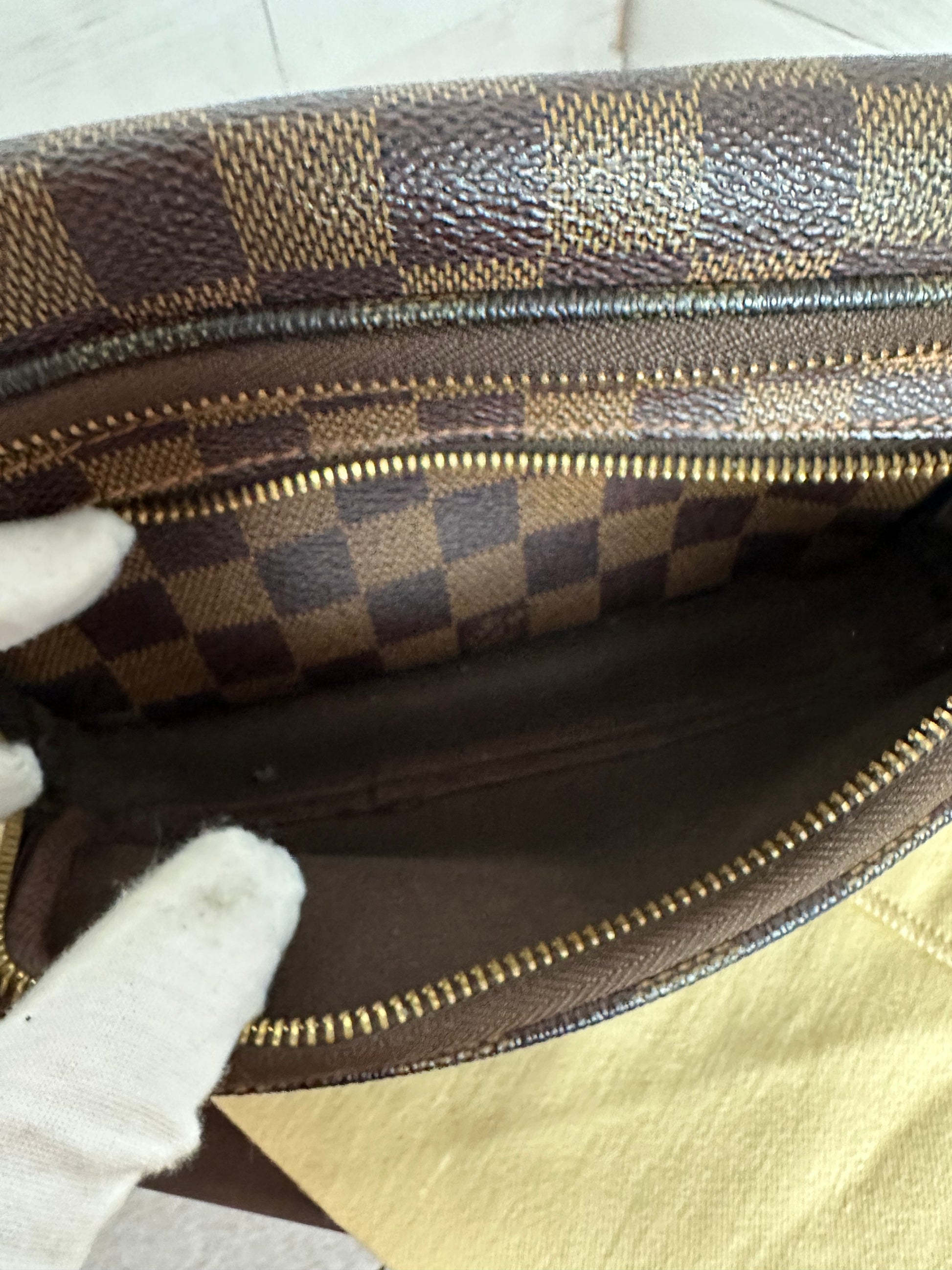 This is an authentic LOUIS VUITTON Damier Ebene Melville Bum Bag. This stylish bum bag is crafted of signature Louis Vuitton Damier checkered coated canvas in brown. The bag features an adjustable nylon waist strap with a buckle and front and back zipper compartment. It opens to a dark brown fabric interior. Hardware has some tarnish. Comes with box and dust bag.