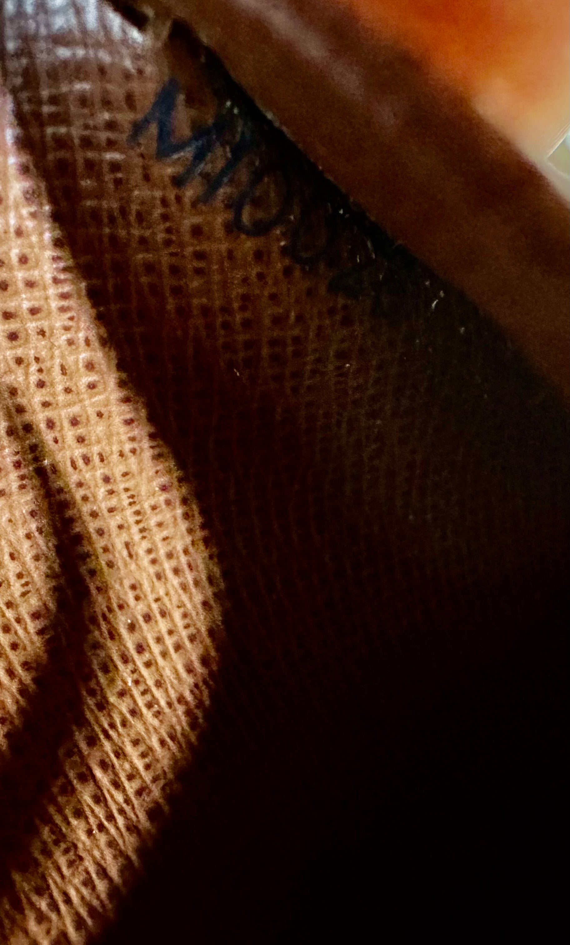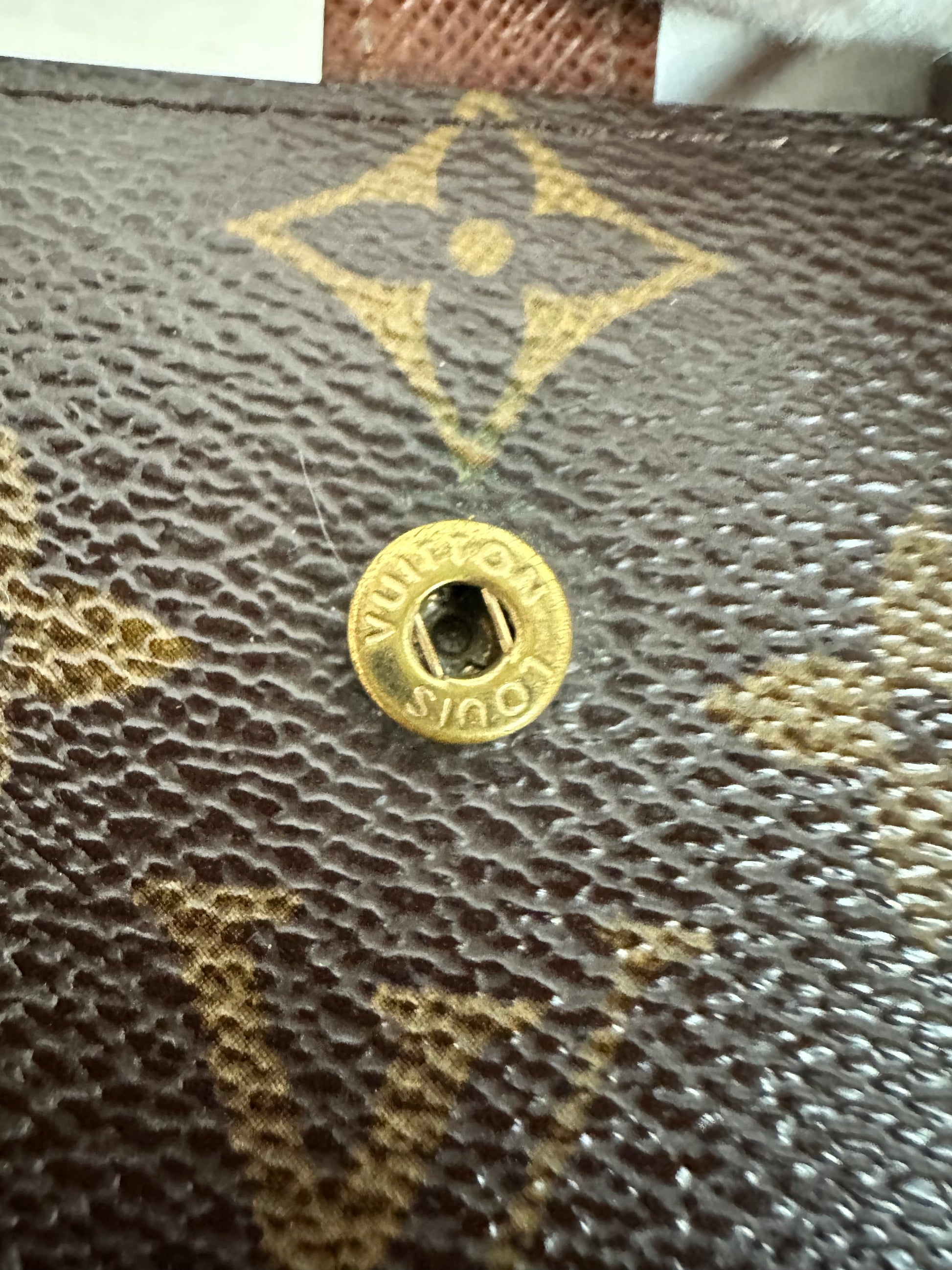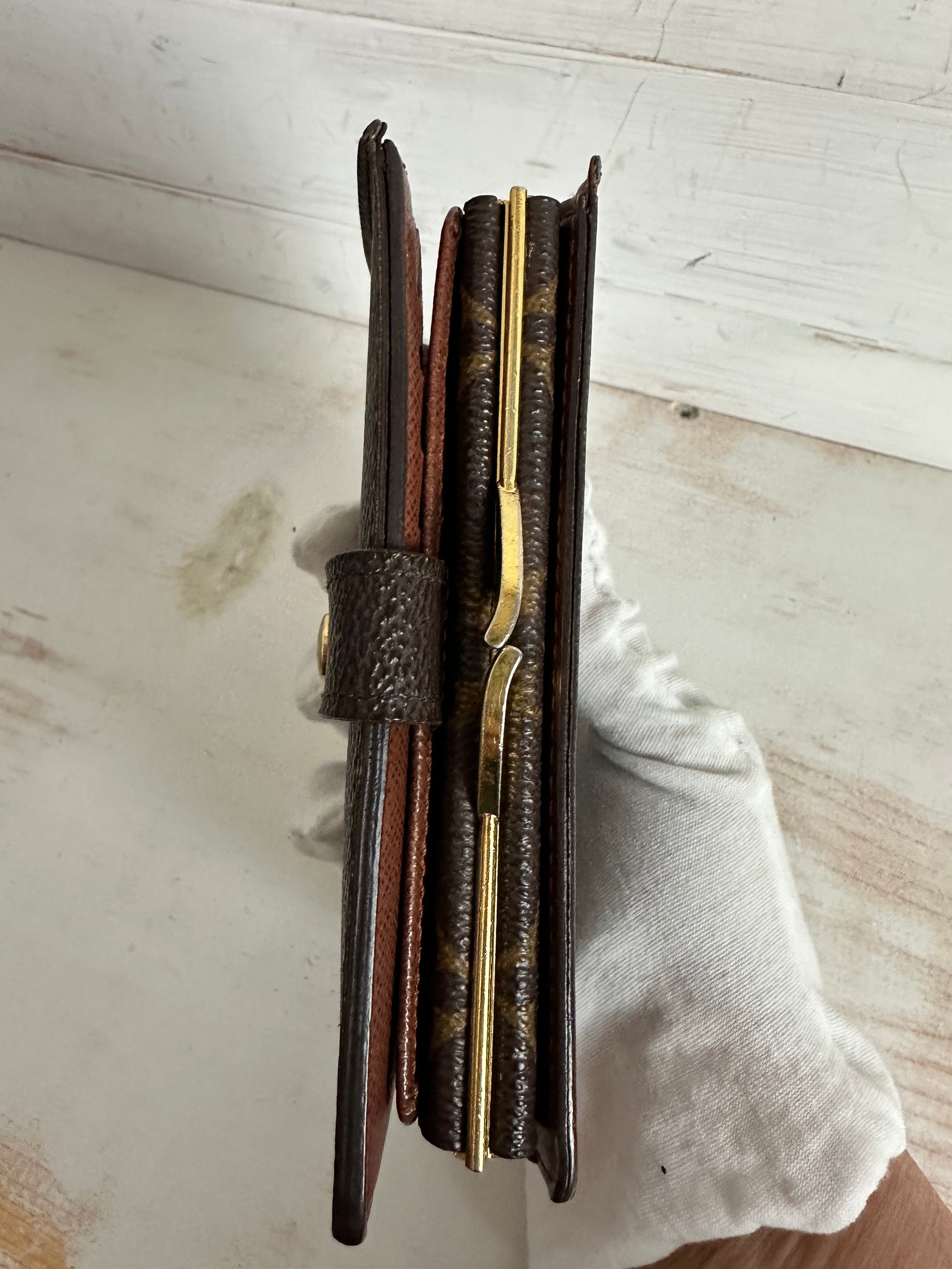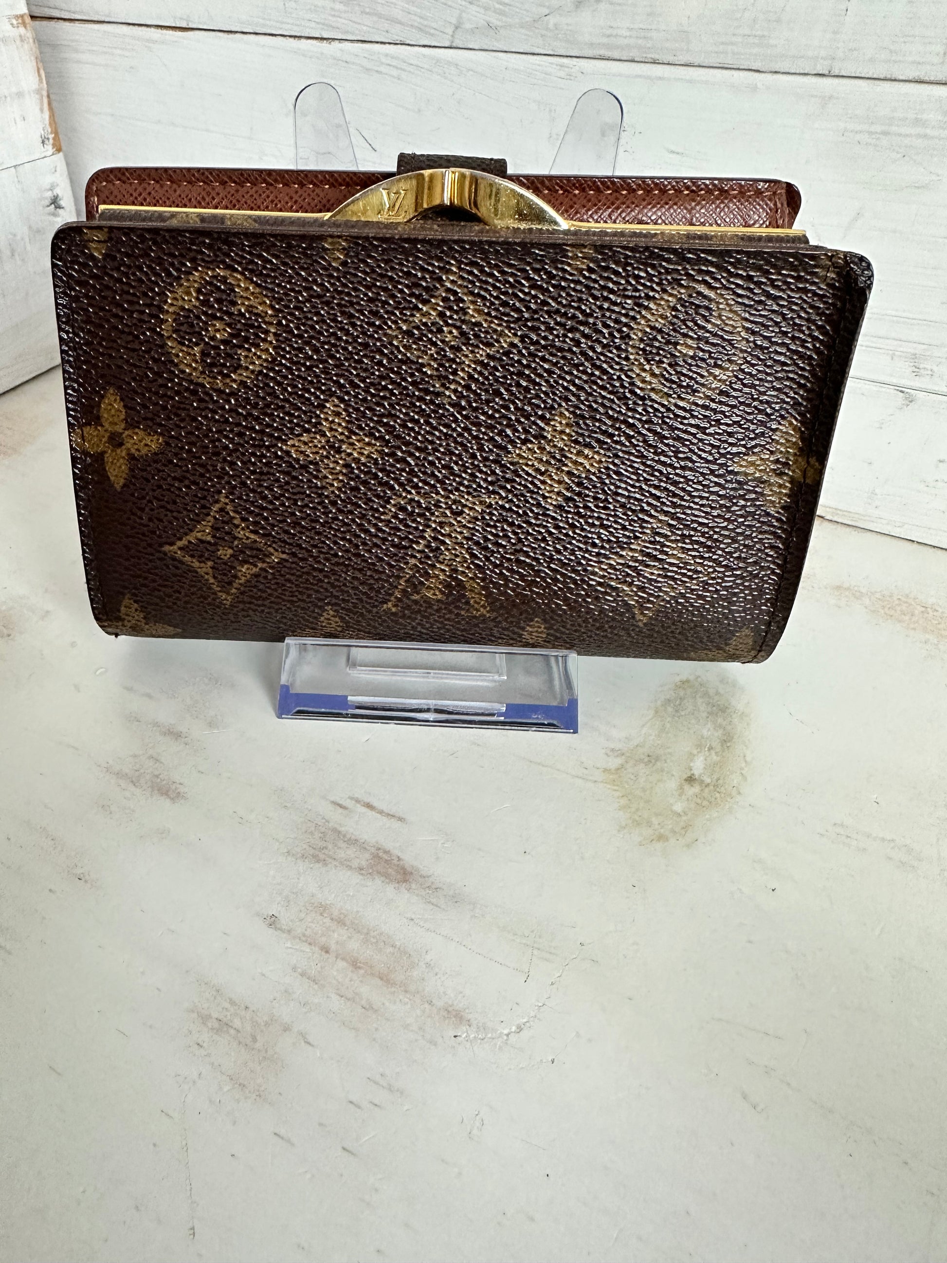 This is an authentic LOUIS VUITTON Monogram French Purse Wallet. This stylish purse is crafted of Louis Vuitton monogram coated canvas. It has a brass bar frame and a gold kiss lock top that opens to a cross-grain leather interior with patch pockets, card slots, and billfold. Slight tarnish on hardware. Also, light threads noted on coin pouch. Very good condition.