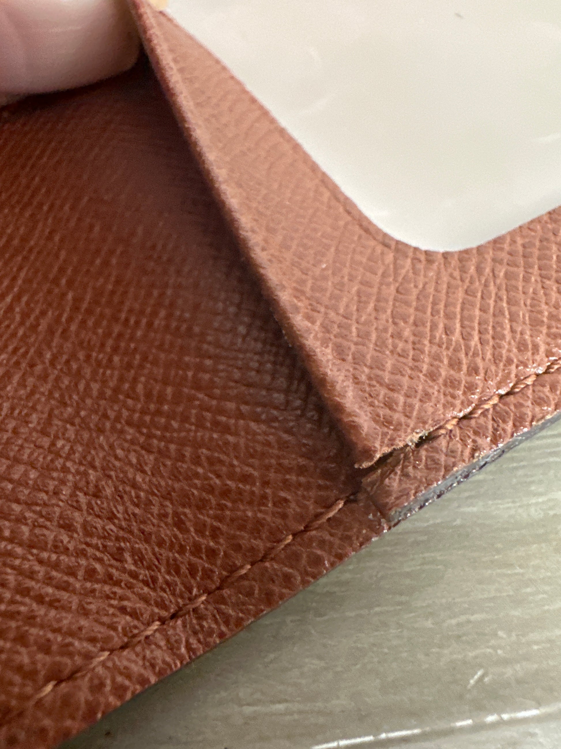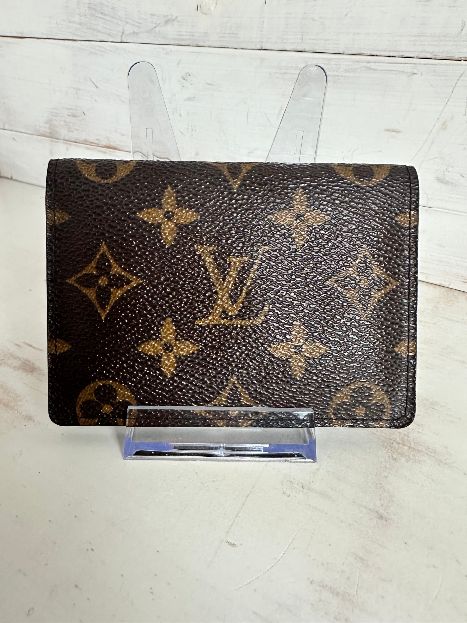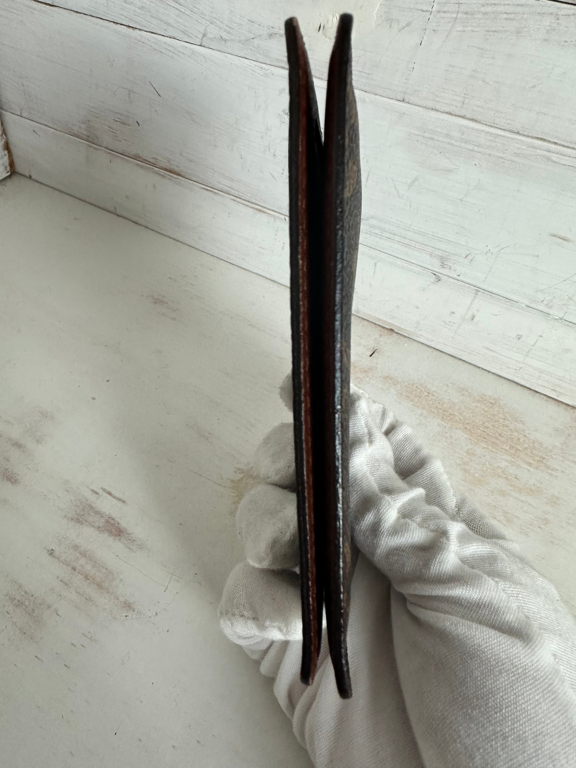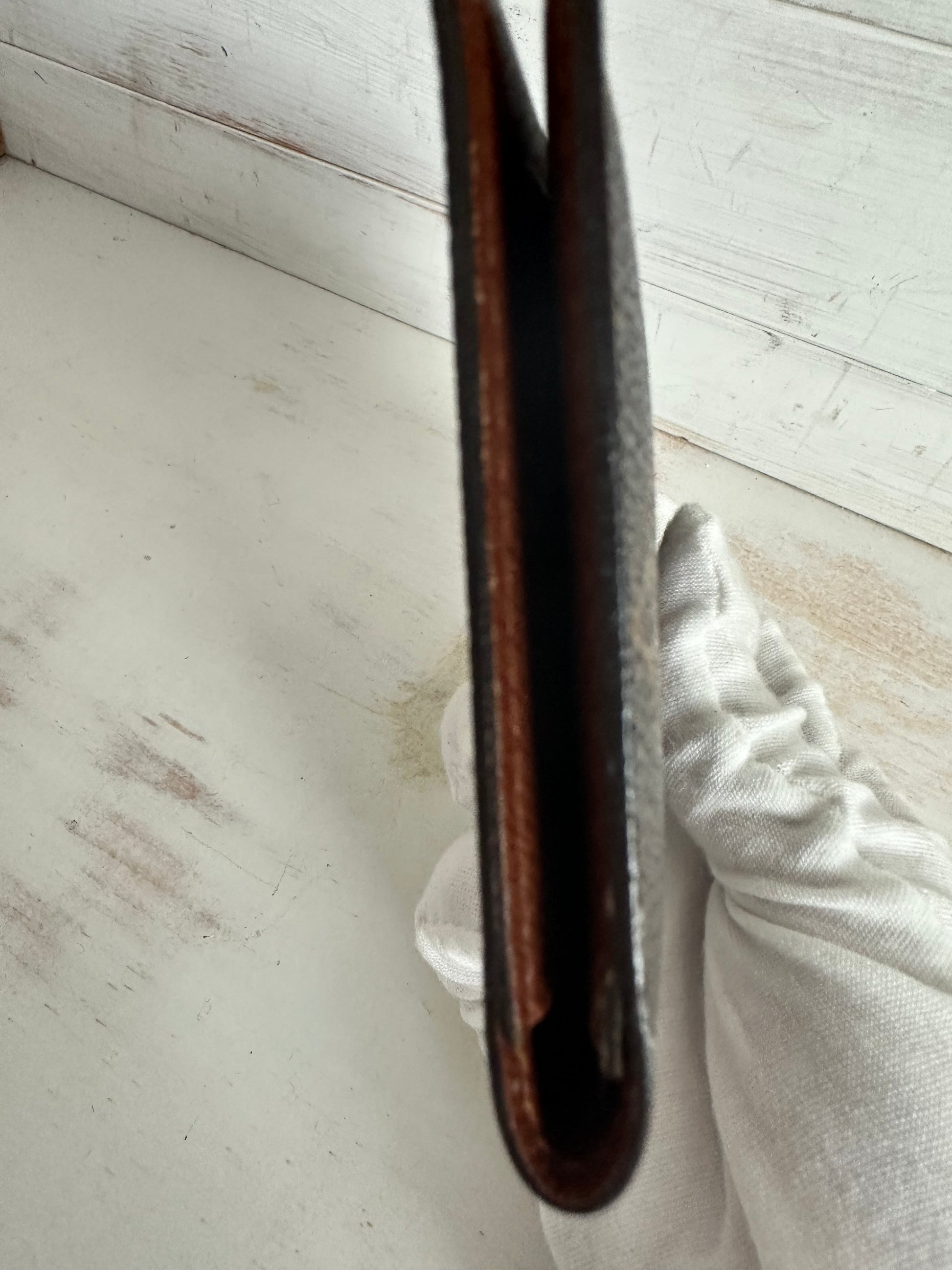 Vintage, circa 2003, monogram vertical card case. No glazing issues, with one small tear near card slot.