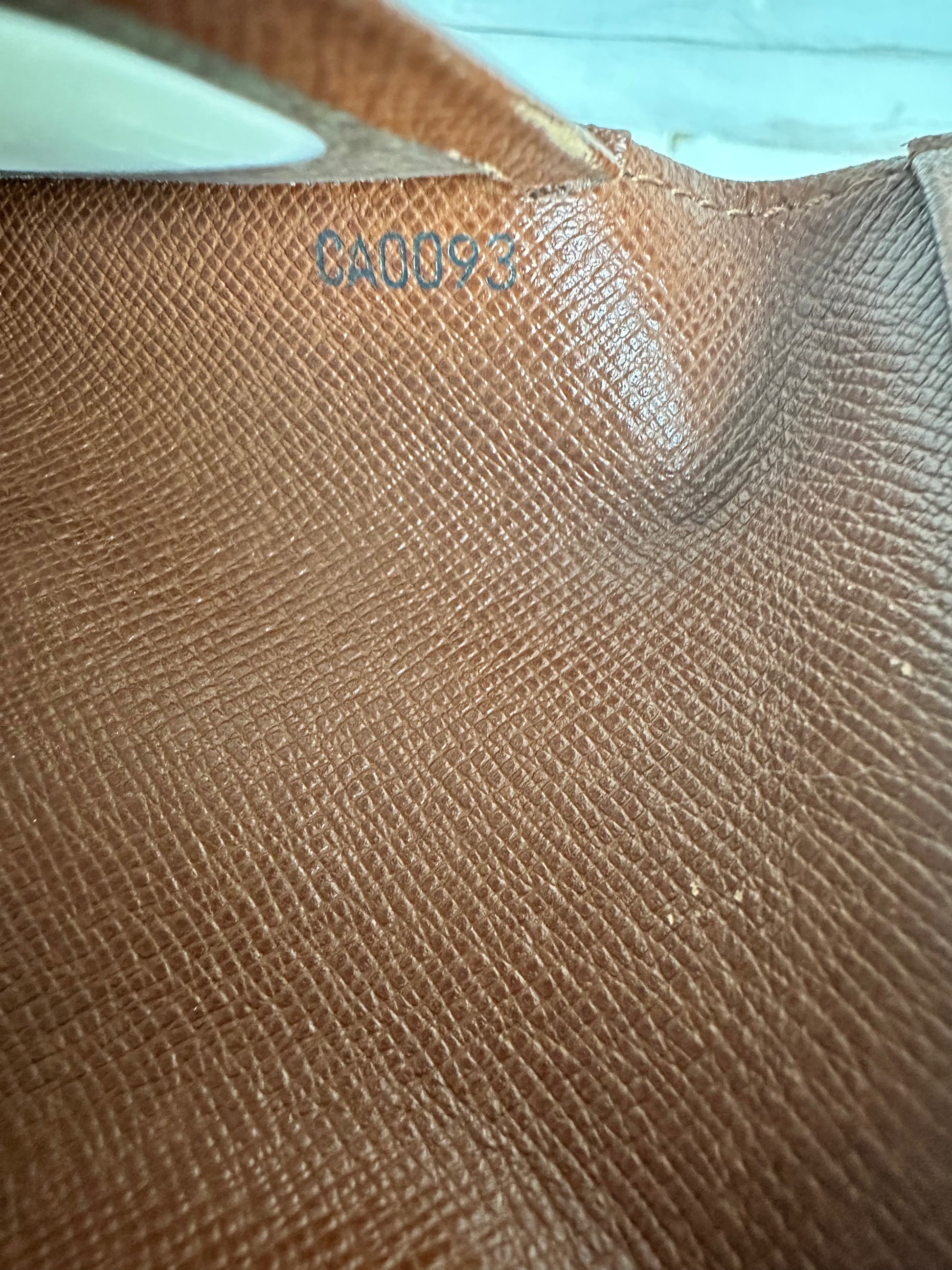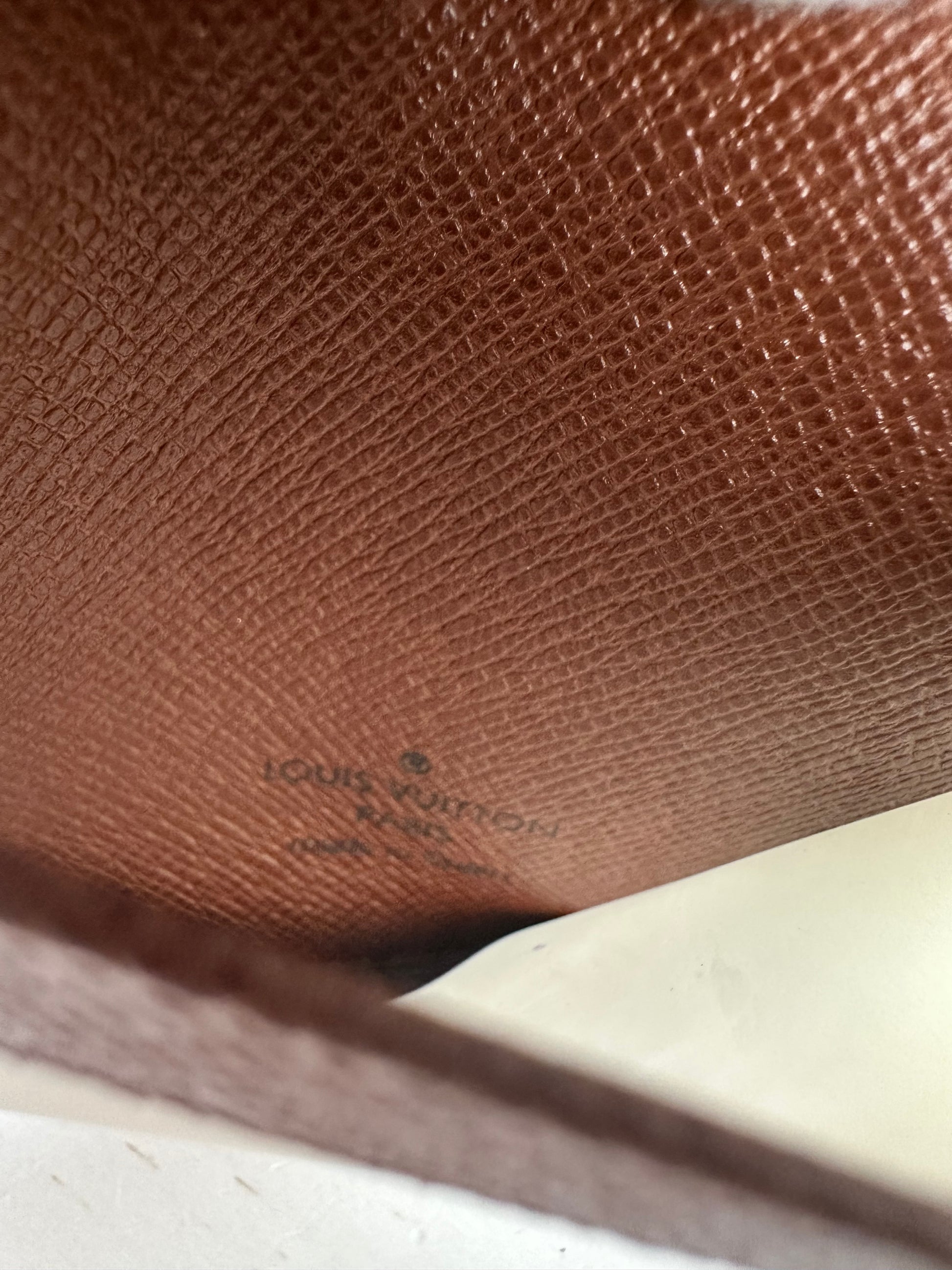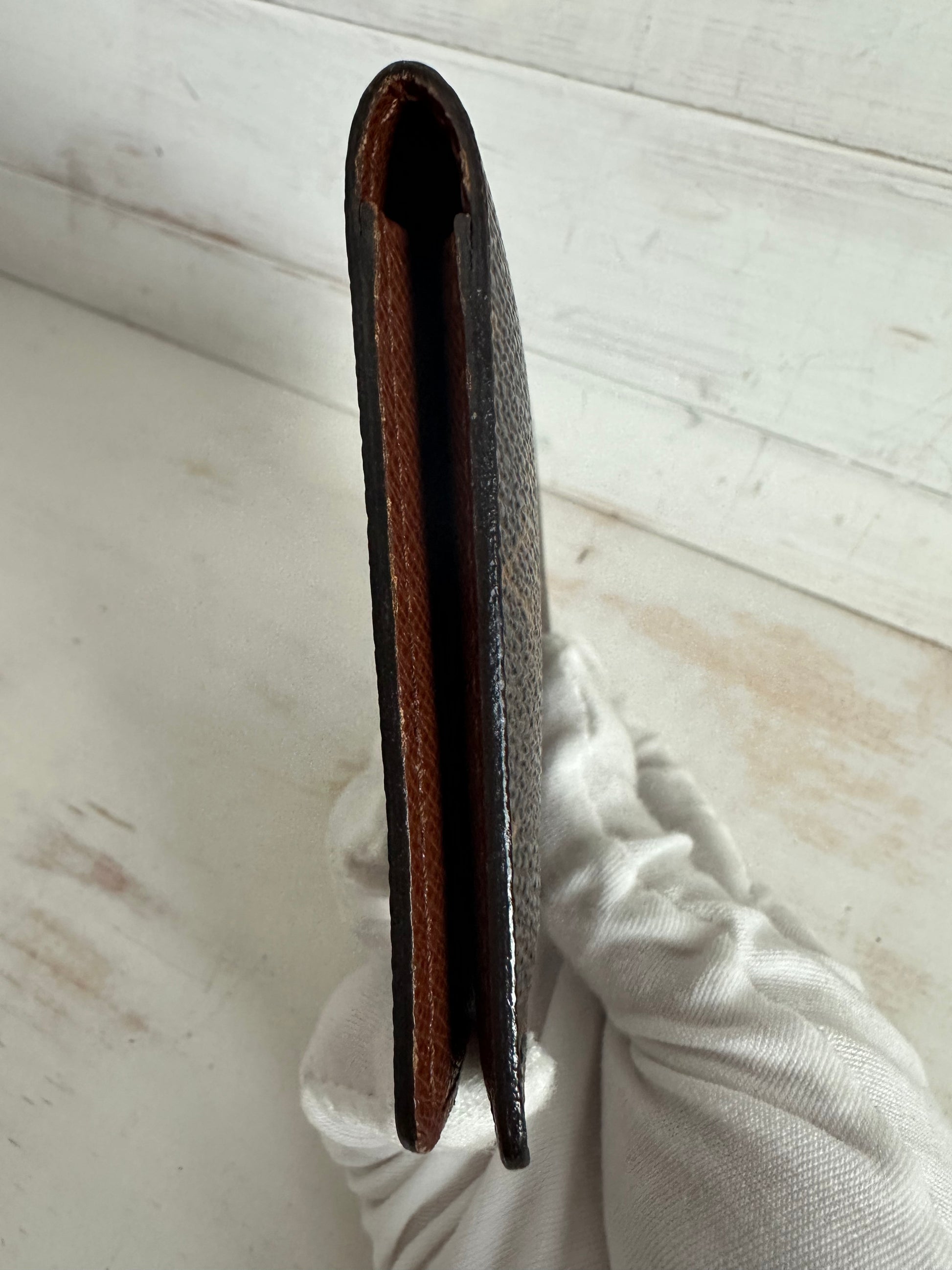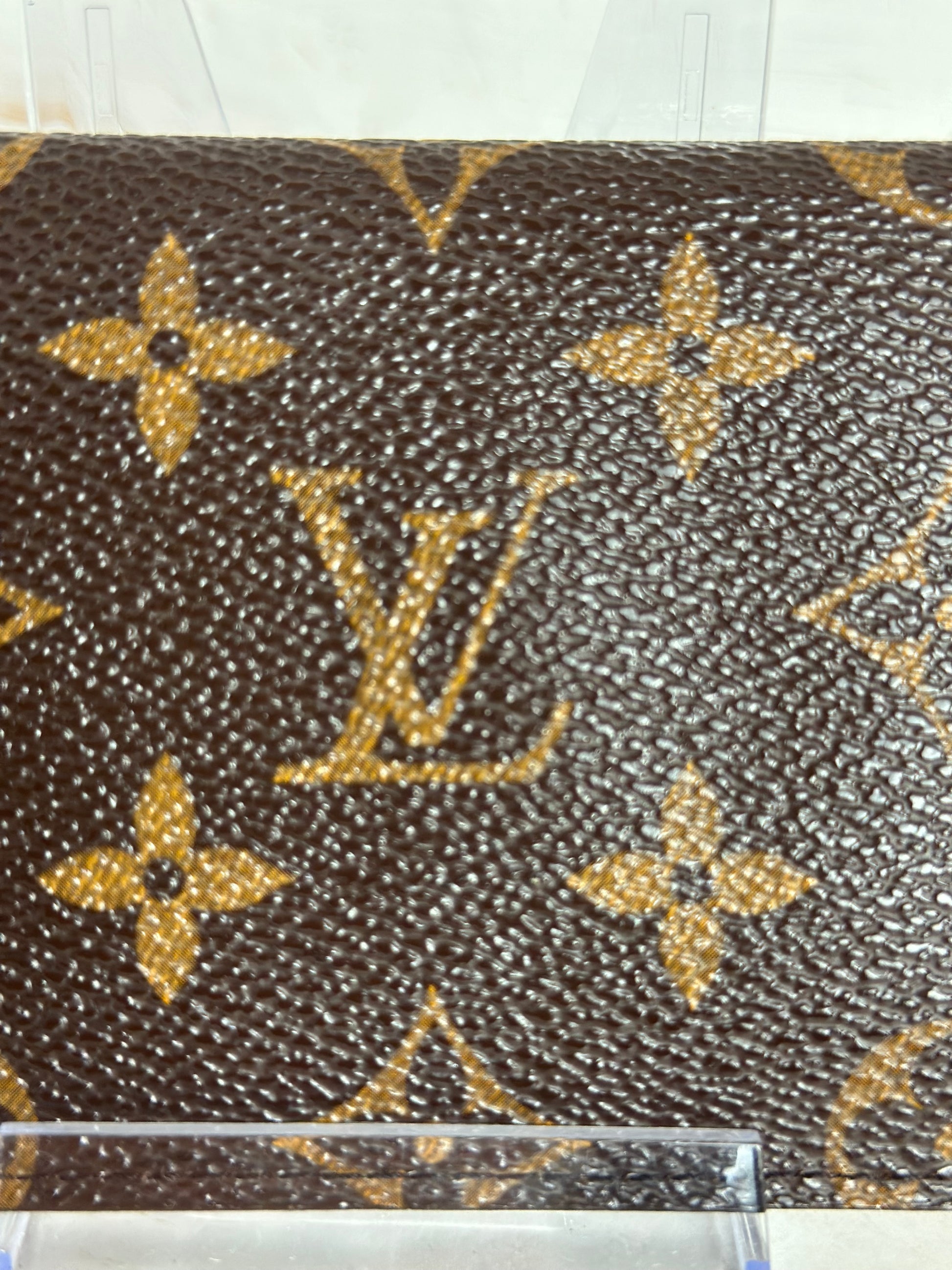 Vintage, circa 2003, monogram vertical card case. No glazing issues, with one small tear near card slot.