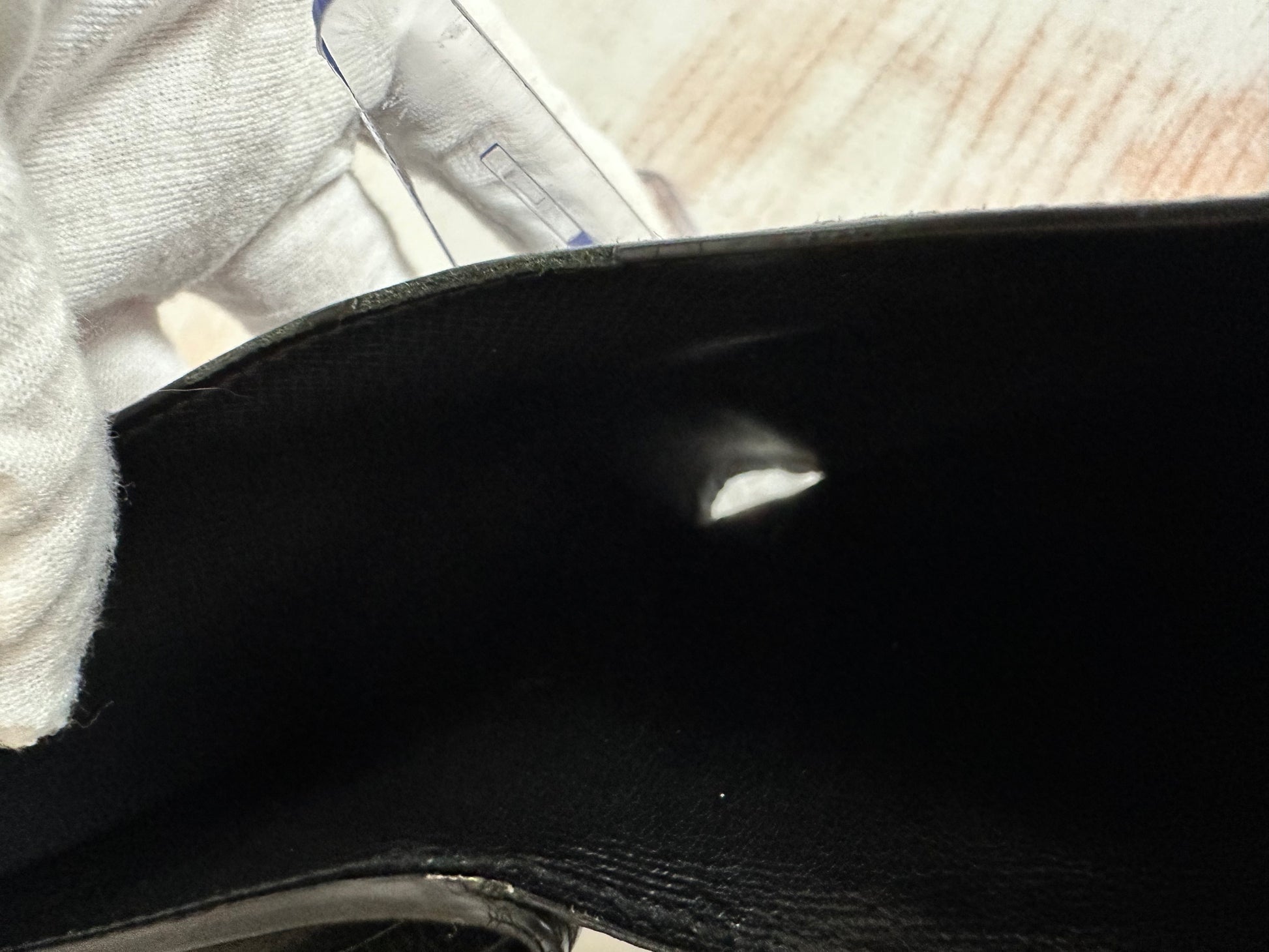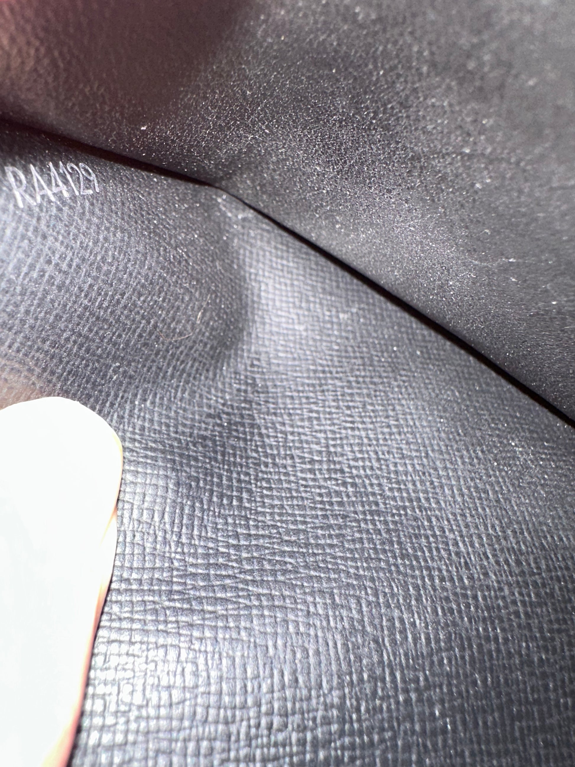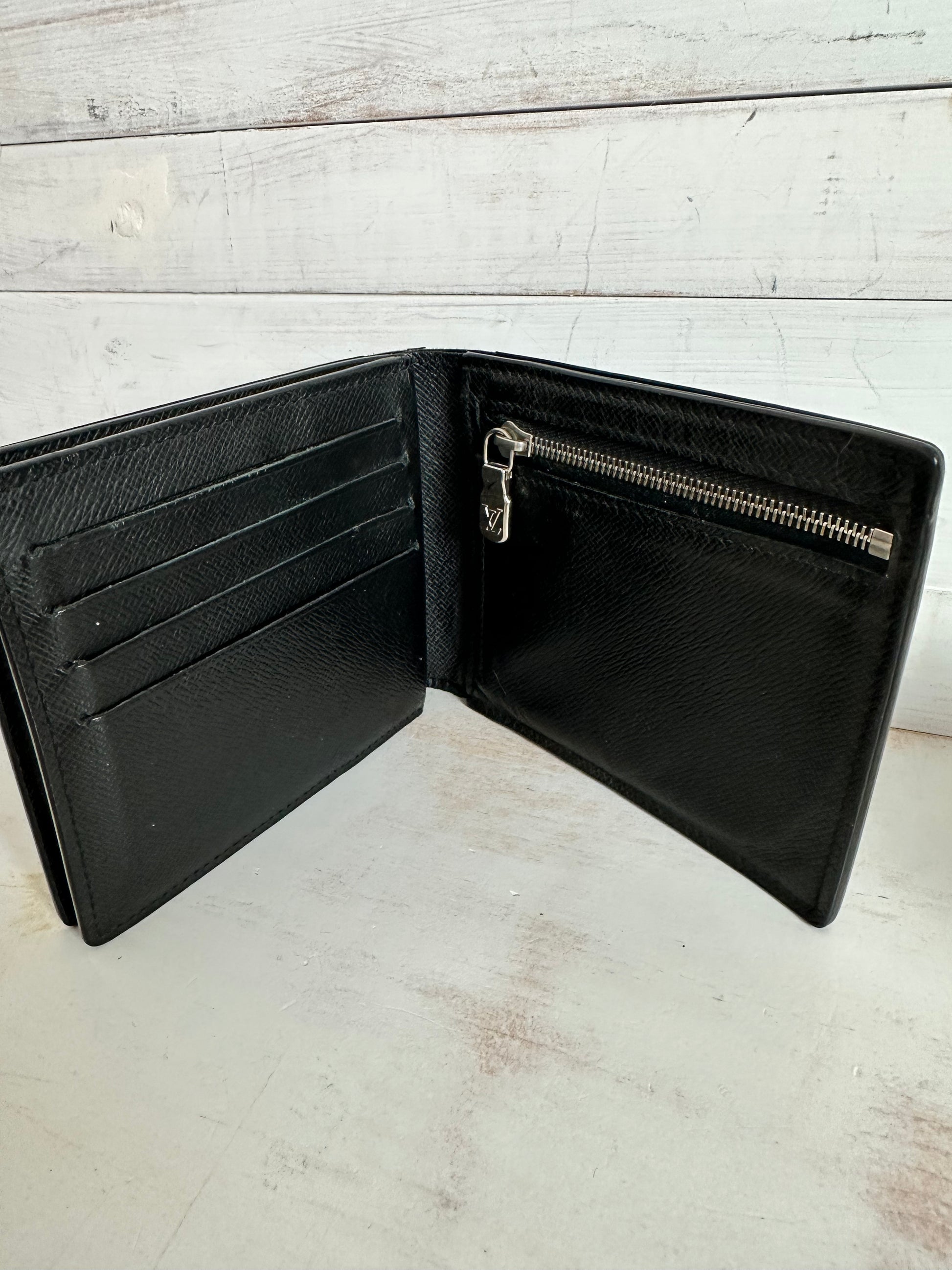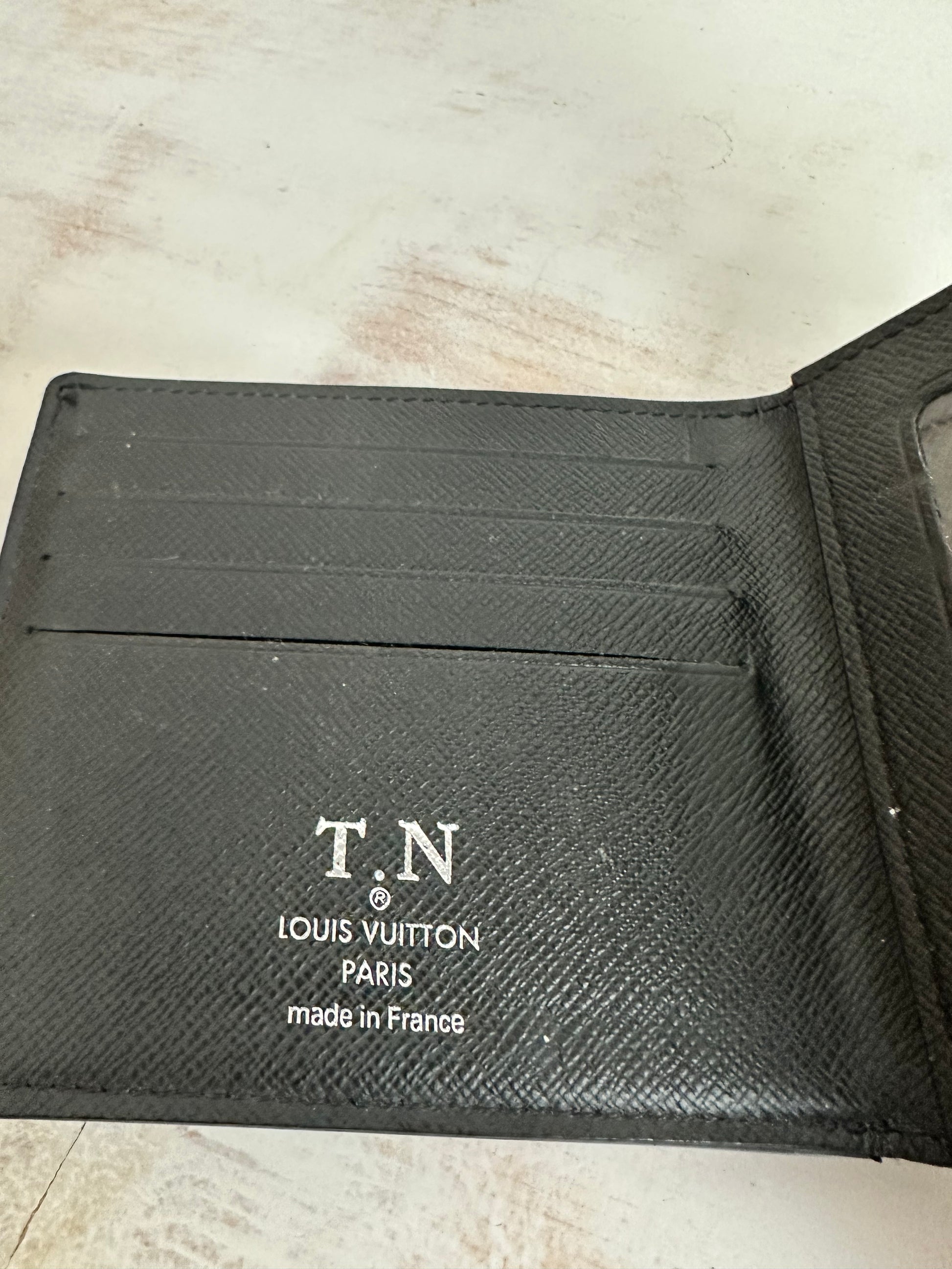 This is an authentic Louis Vuitton Taiga Amerigo Wallet. This stylish wallet is crafted of beautifully textured taiga cross grain leather. The wallet opens to a taiga leather interior with 8 credit card slots, patch pockets, billfold, and zippered coin pouch. Does have the initials TN on the interior. Slight cut in the transparent window.
