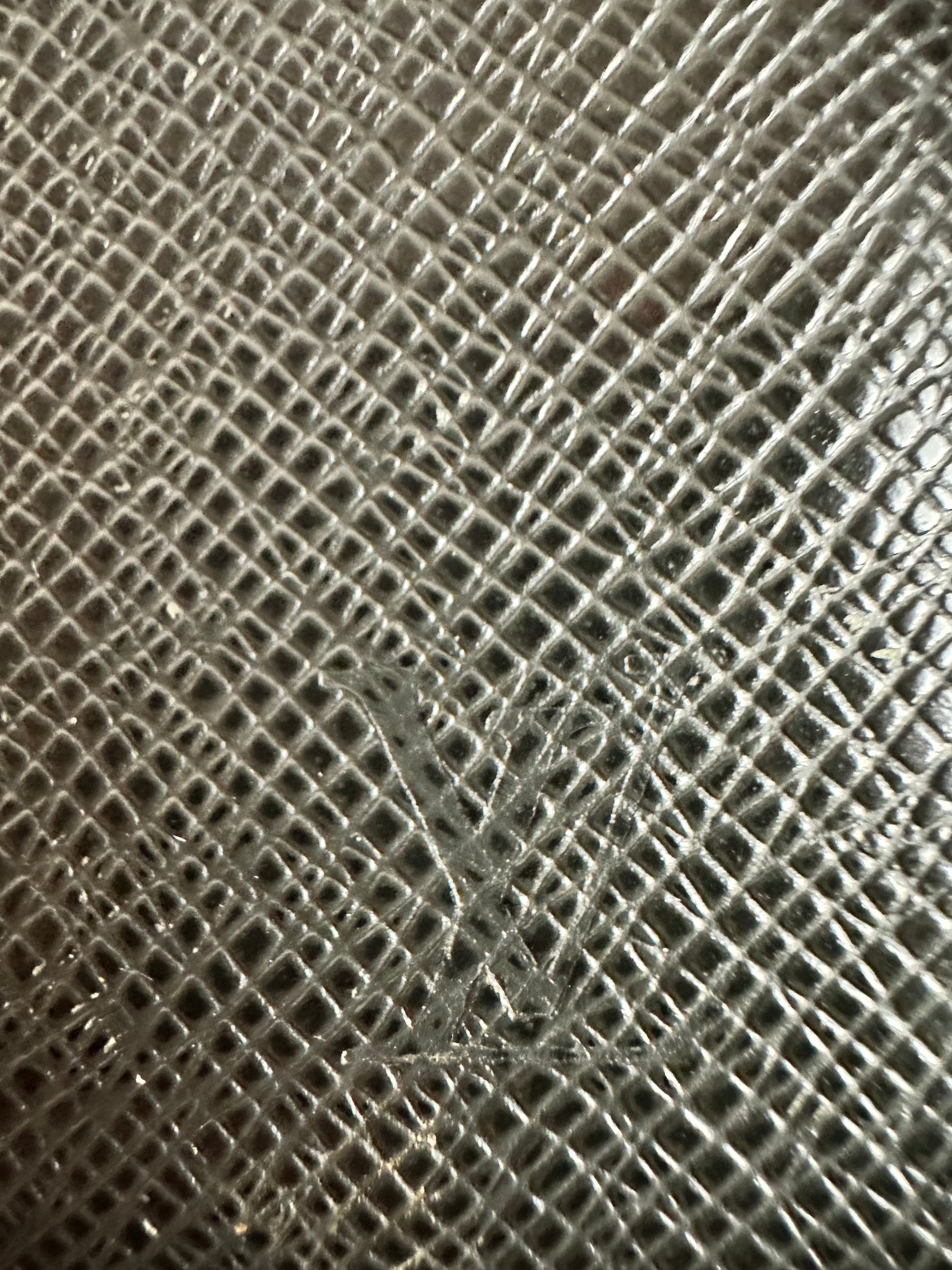 Authentic Louis Vuitton Tiaga Leather in Black. This is a long wallet, card holder, and checkbook. Interior features 7 card holders and 3 slip pockets. Please note there is wrinkling on the front and center of the interior. Slight scratching but great for a piece of Louis Vuitton from 2007. No peelings.