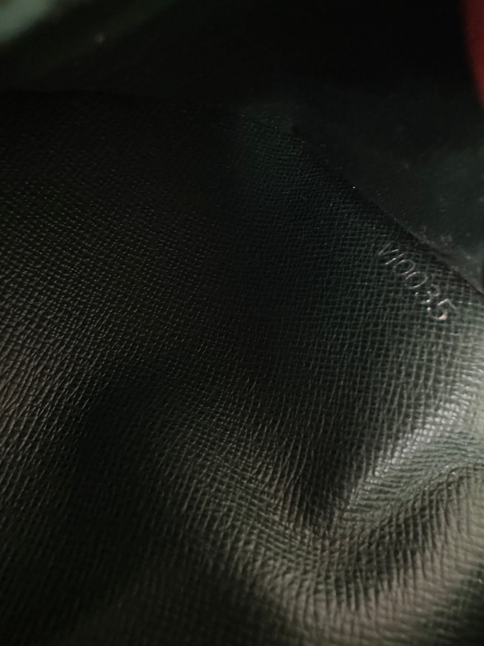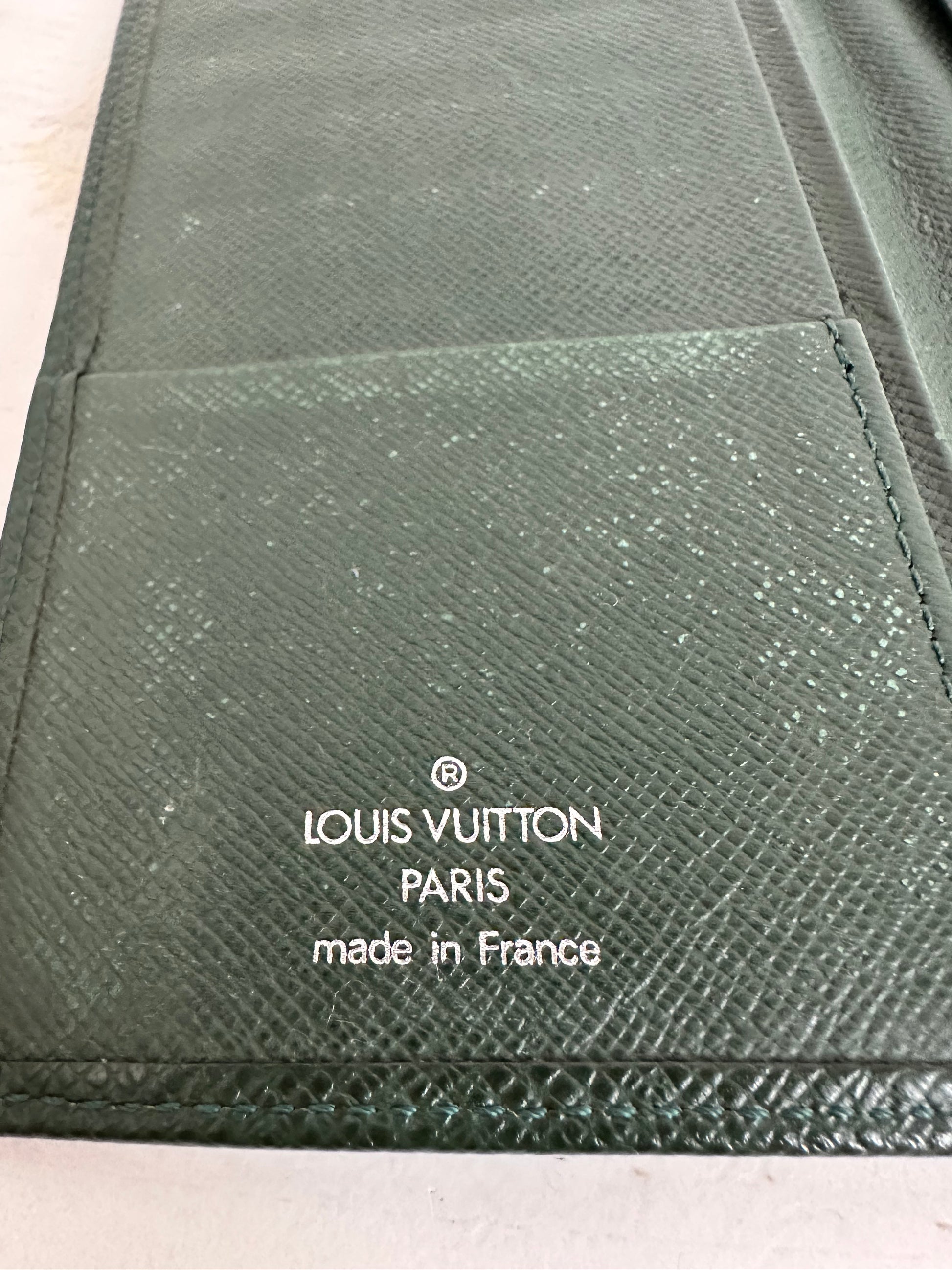 Authentic Louis Vuitton Tiaga Leather in Green. This is a long card holder or checkbook. Interior features 7 card holders and 3 slip pockets. Please note there is slight wrinkling of leather on exterior and wear is noted on the interior. No peelings.