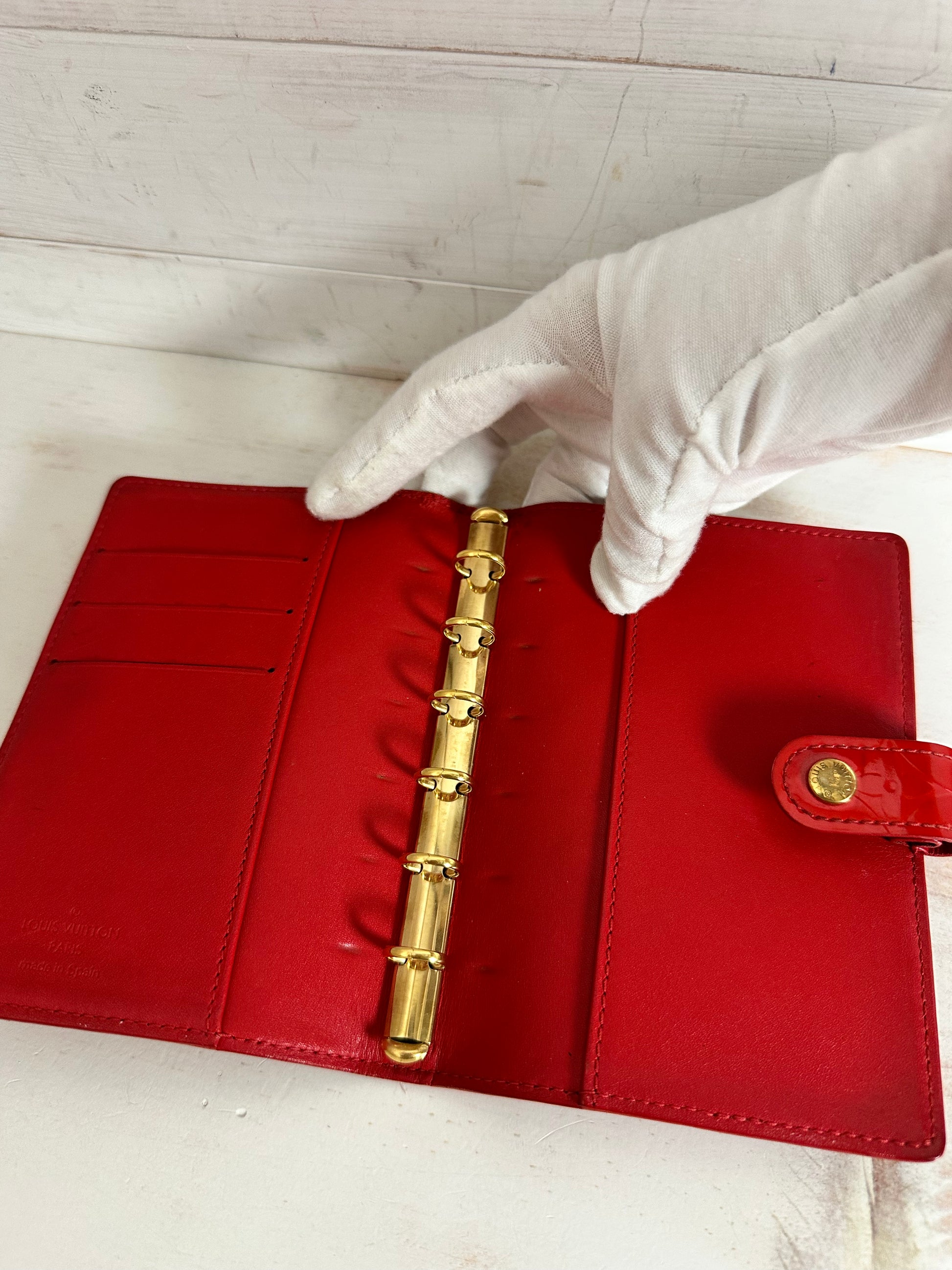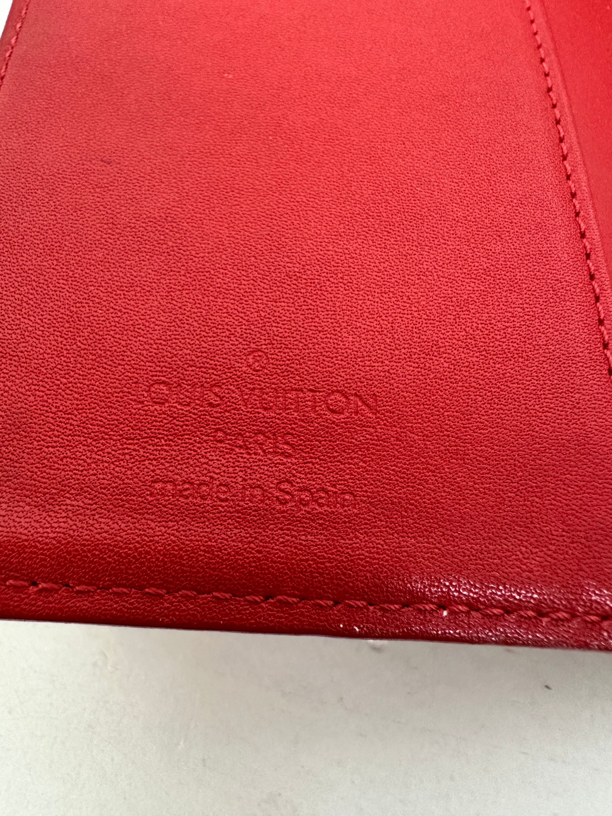 Vintage Louis Vuitton Red Vernis Agenda PM/Passport Holder. Slight color transfer on front and back (see pictures) and tarnish on hardware but overall it’s in great condition for a Vintage piece.
