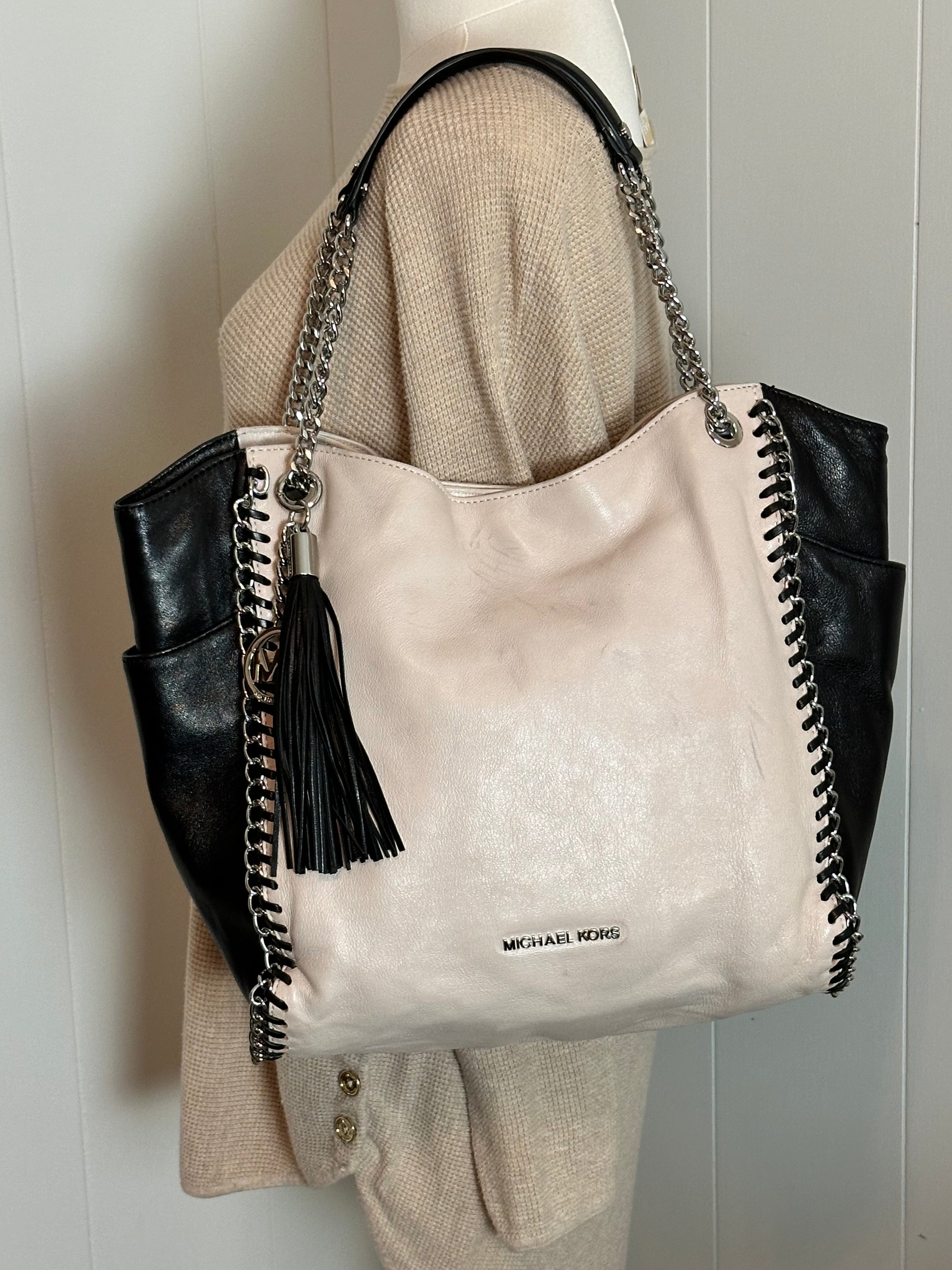 Michael Kors Large Chelsea Leather Tote Cream/Black Silver Hardware