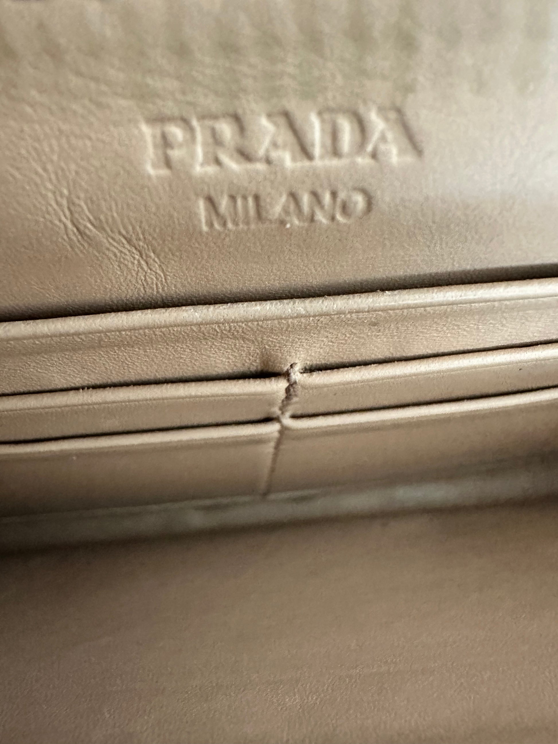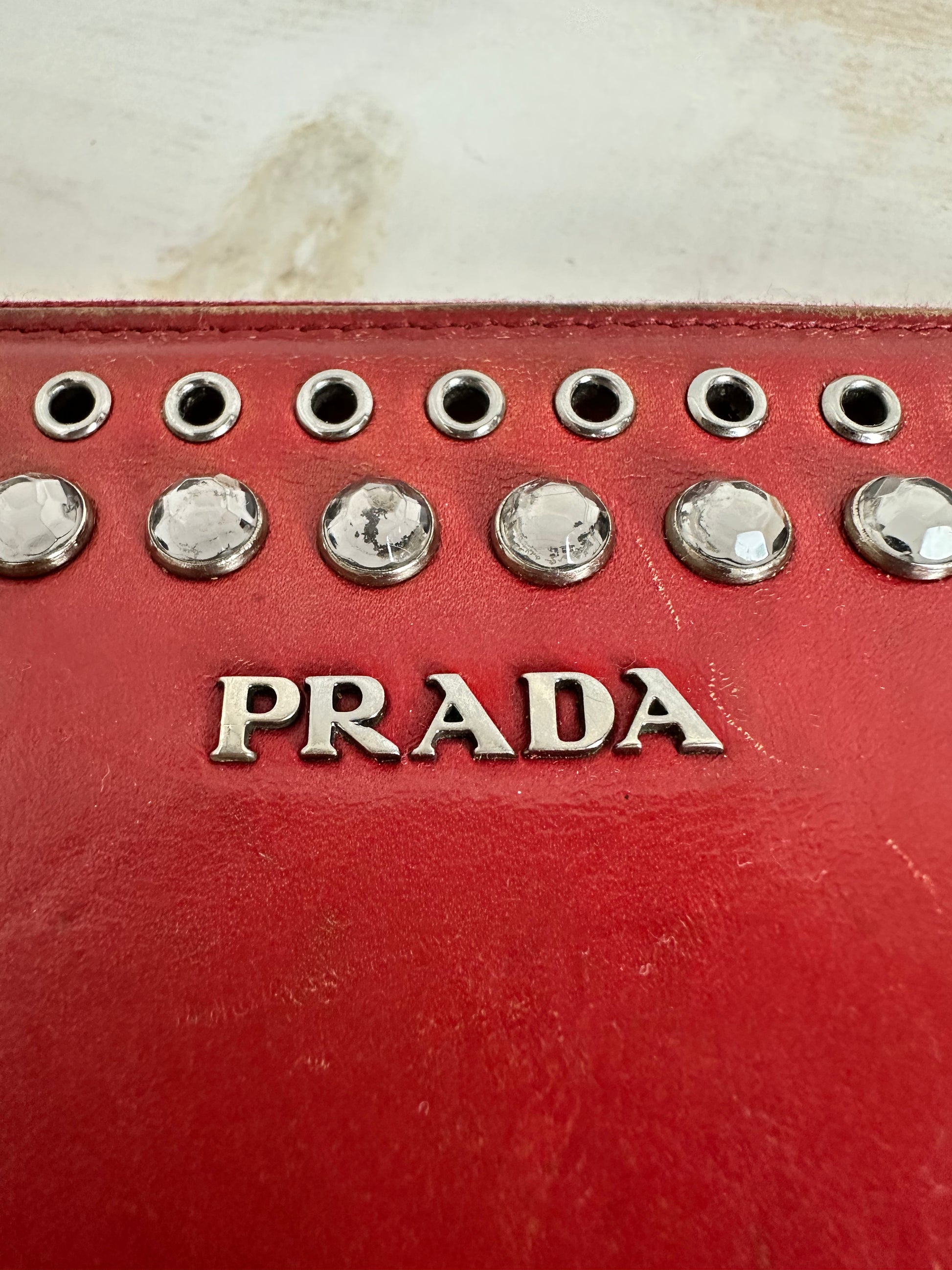 Very rare PRADA wallet with rivets** Beautiful patina. Worn with pleasure ** Zipper works perfectly. It has been well loved and is in good condition. Please note all pictures. All crystals and rivets are intact.