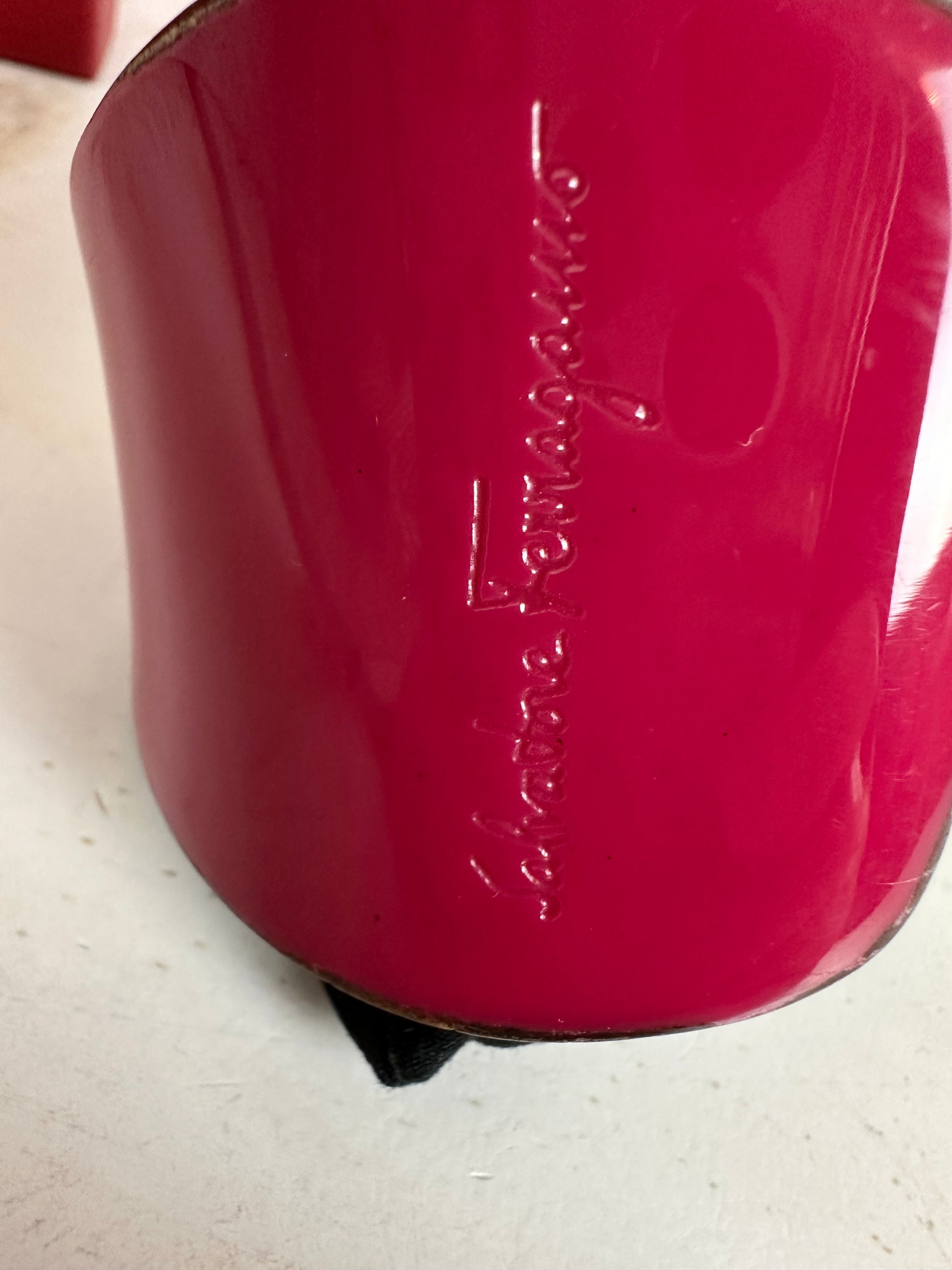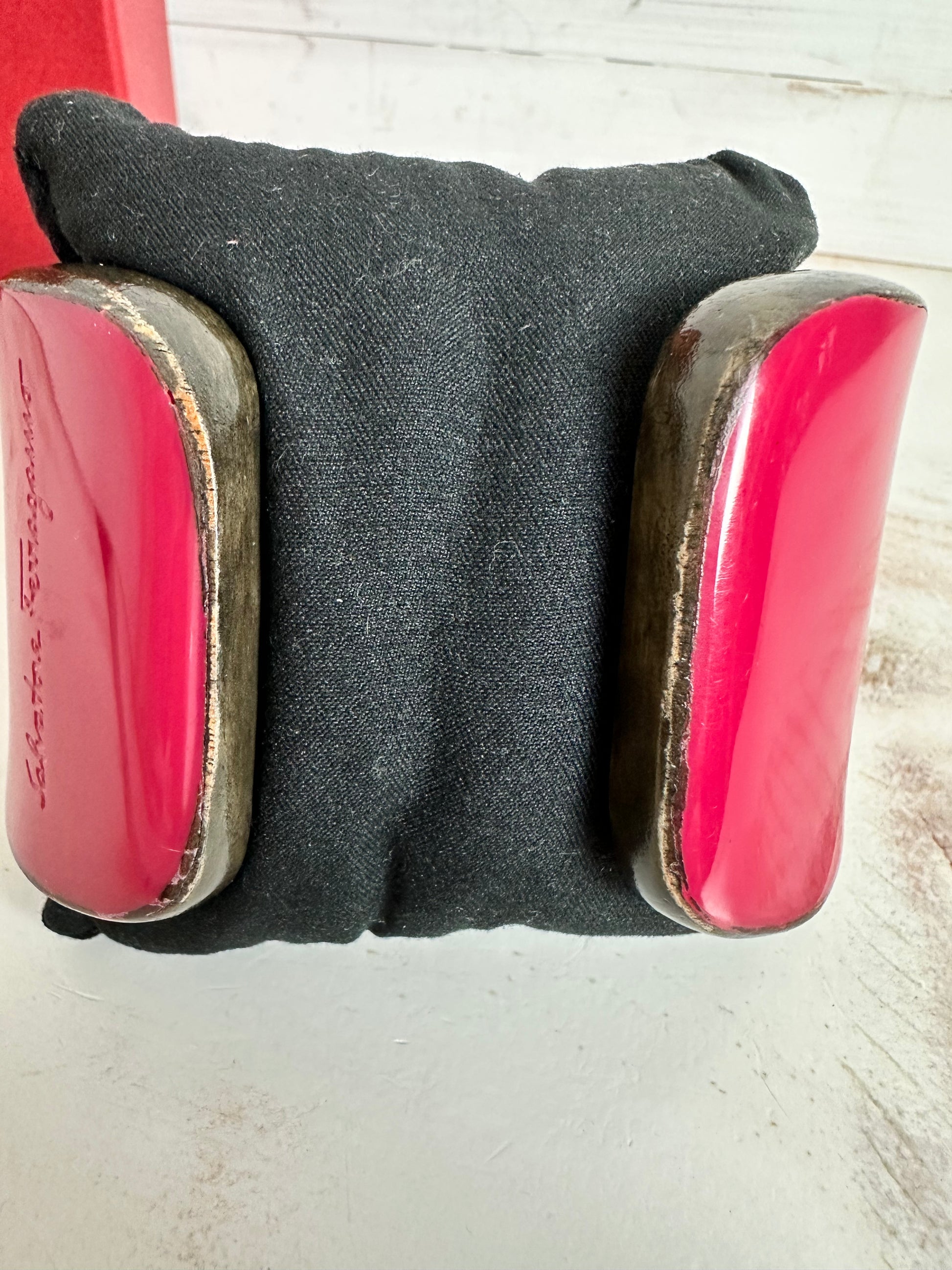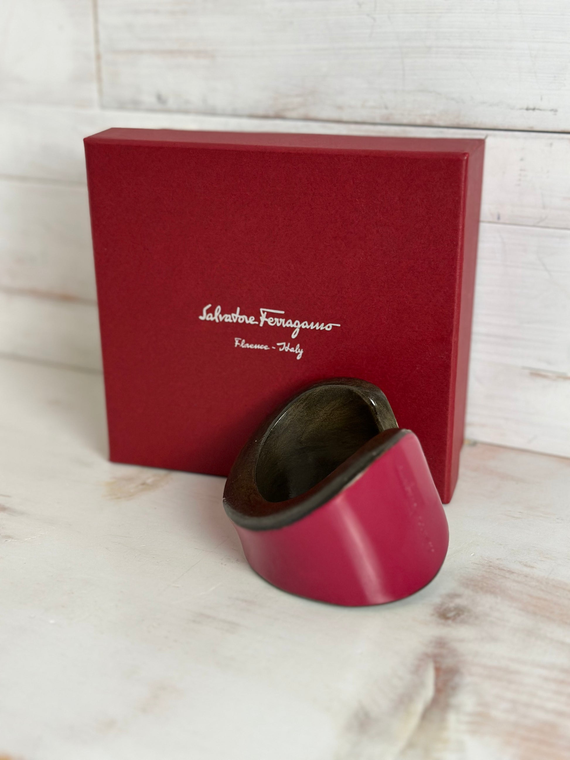 This is a beautiful Ferragamo Bangle Bracelet. The outer surface is a red resin with Salvatore Ferragamo logo on it. Paired with a wood interior. Some minor rubbing on the sides (see pictures) Comes with box and ribbon