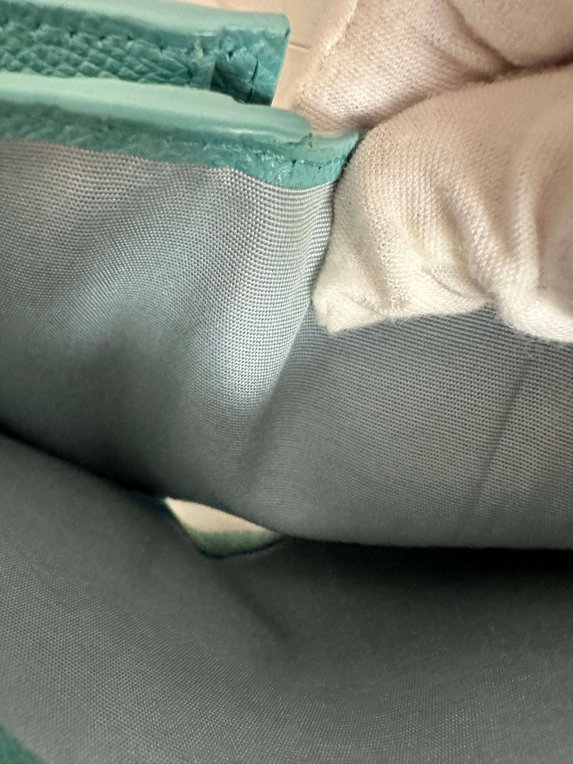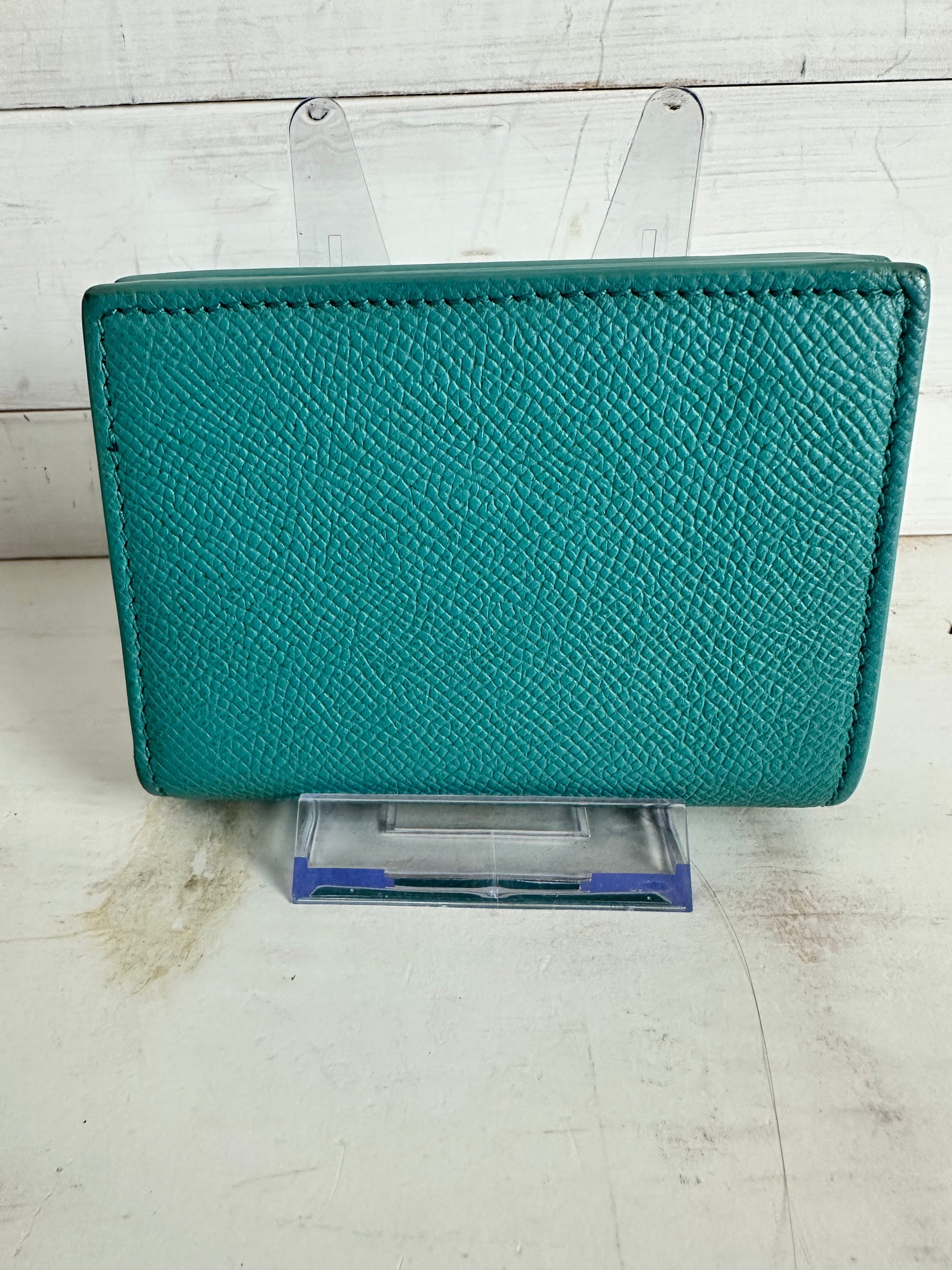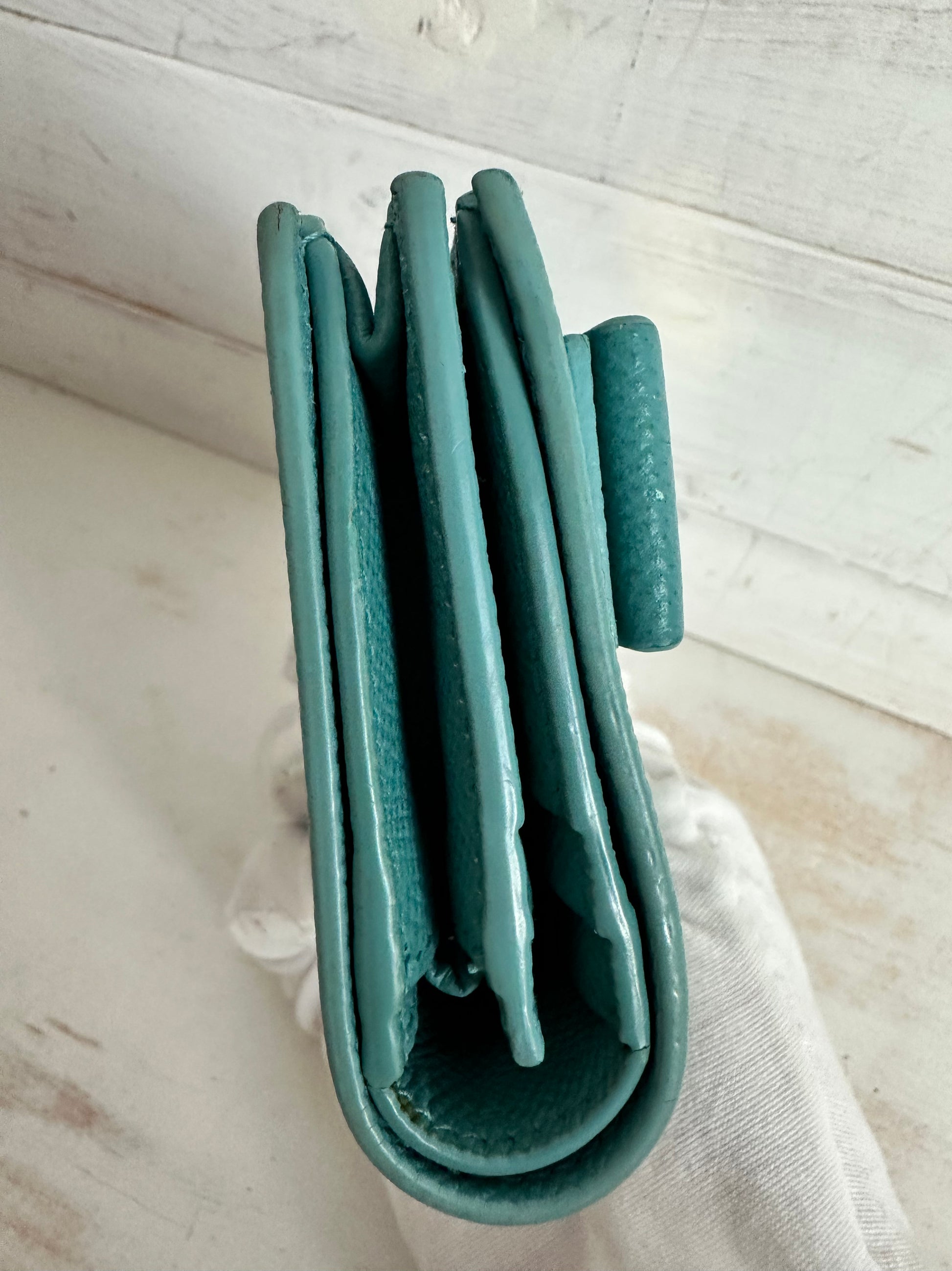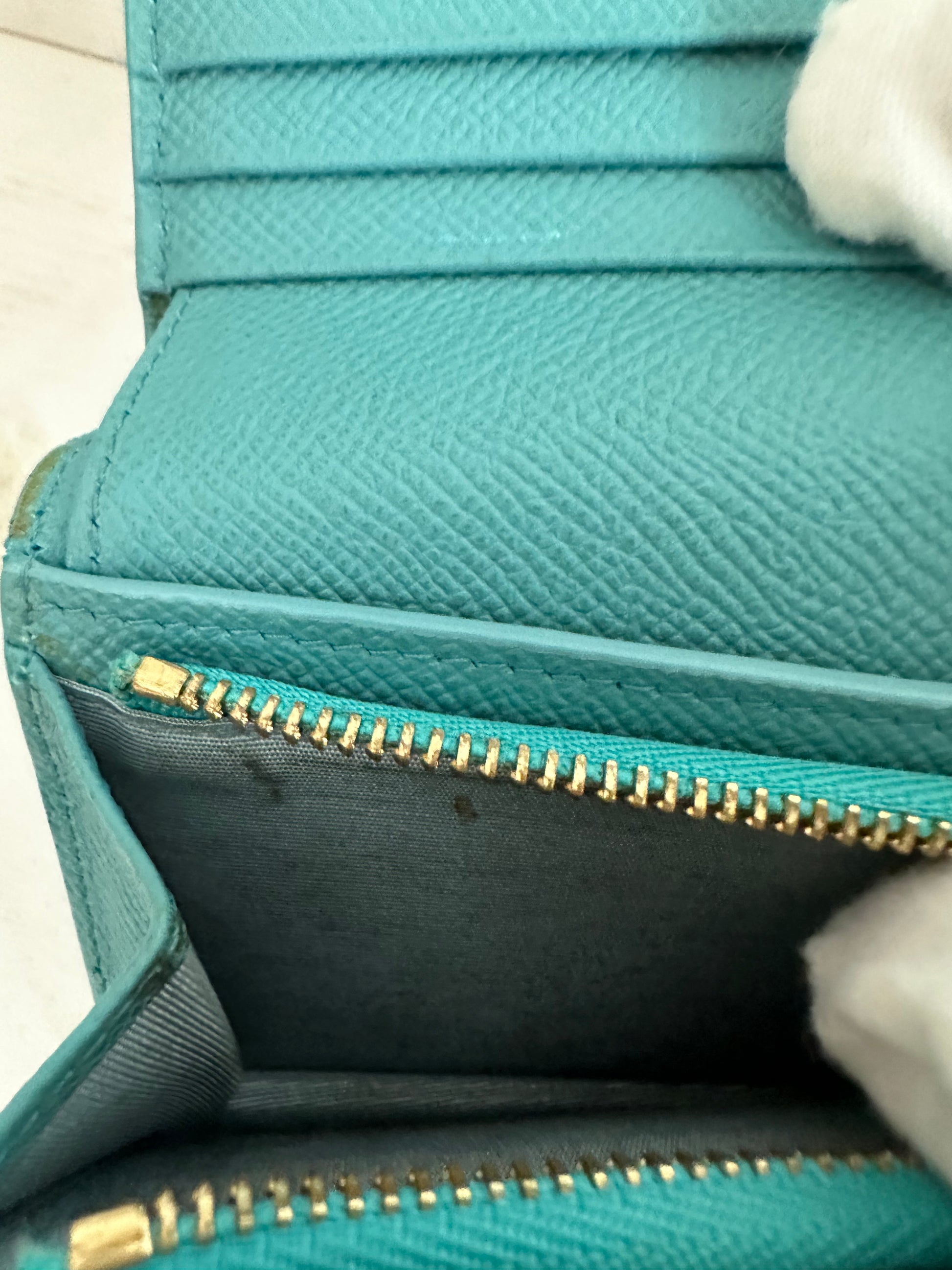Bifold wallet Fiocco Vara Tyrone Turquoise, absolutely beautiful color. Accented with gold hardware and writing sets this piece off. Interior is clean with some coin residue in zipper coin pouch. Minimal wear and is in EXCELLENT condition. Please note all pictures. Comes with original box and COA.