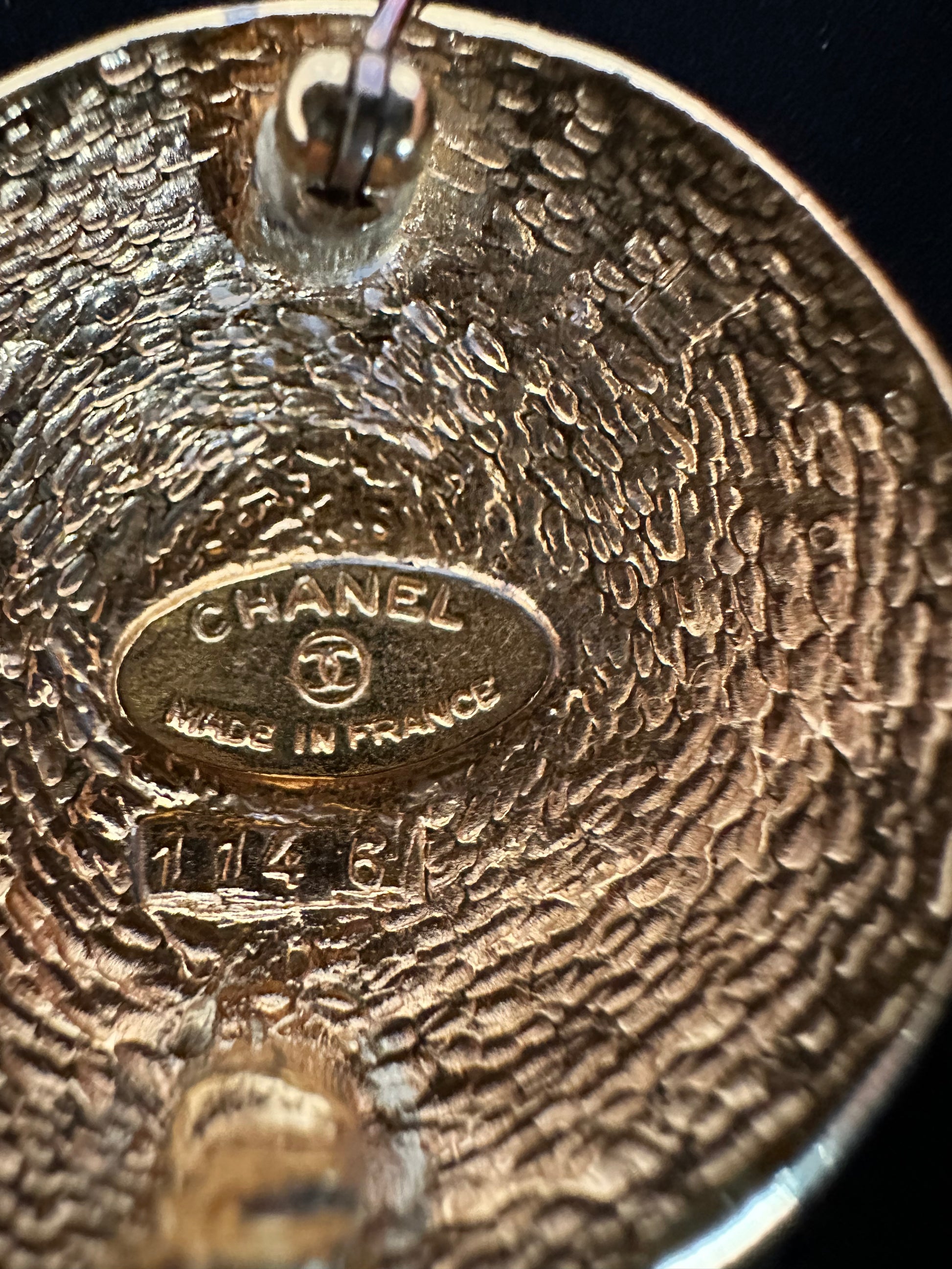 Vintage Chanel 18K Gold tone brooch. Elevate any look with this authentic vintage brooch from Chanel's iconic collection. Expertly crafted in the brand's signature gold tone metal, This piece pays homage to Coco Chanel's legendary Paris flagship. Raised concentric rings featuring intricate, repeating CC and geometric patterns. The center plaque is stamped with Chanel Paris in crisp bold lettering. Very good condition.