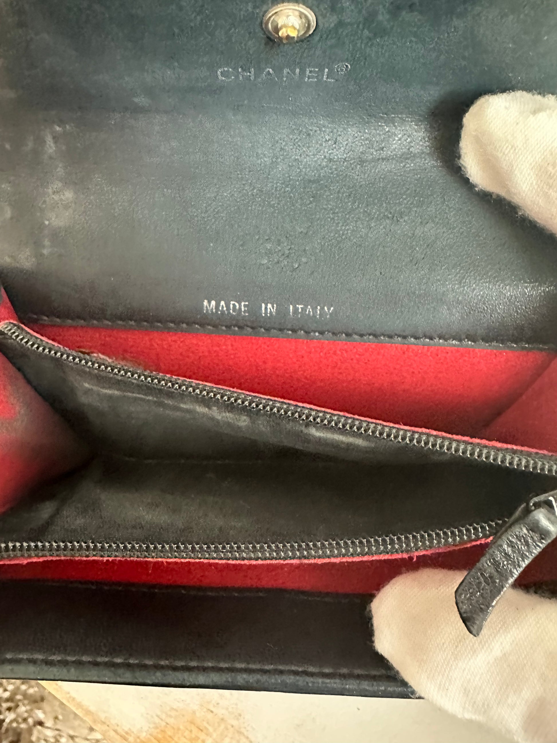 VINTAGE Chanel Black Chocolate Bar Wallet. Circa 2000-2002. This is a classic piece. Please note there is some wear from age of this exquisite piece (note pictures). Interior is red making this a stunning piece of Chanel history. Hologram is intact. Comes with original COA.