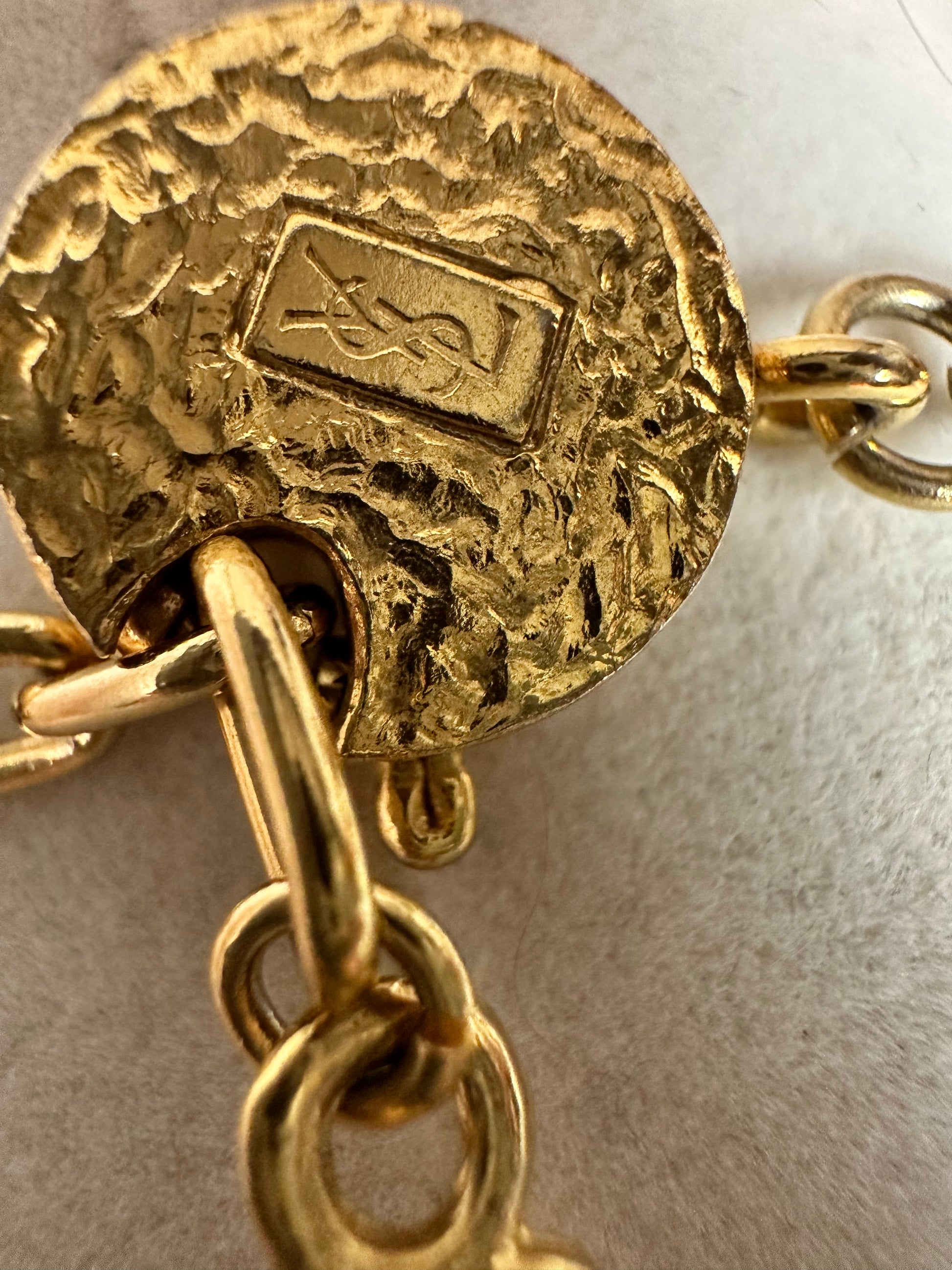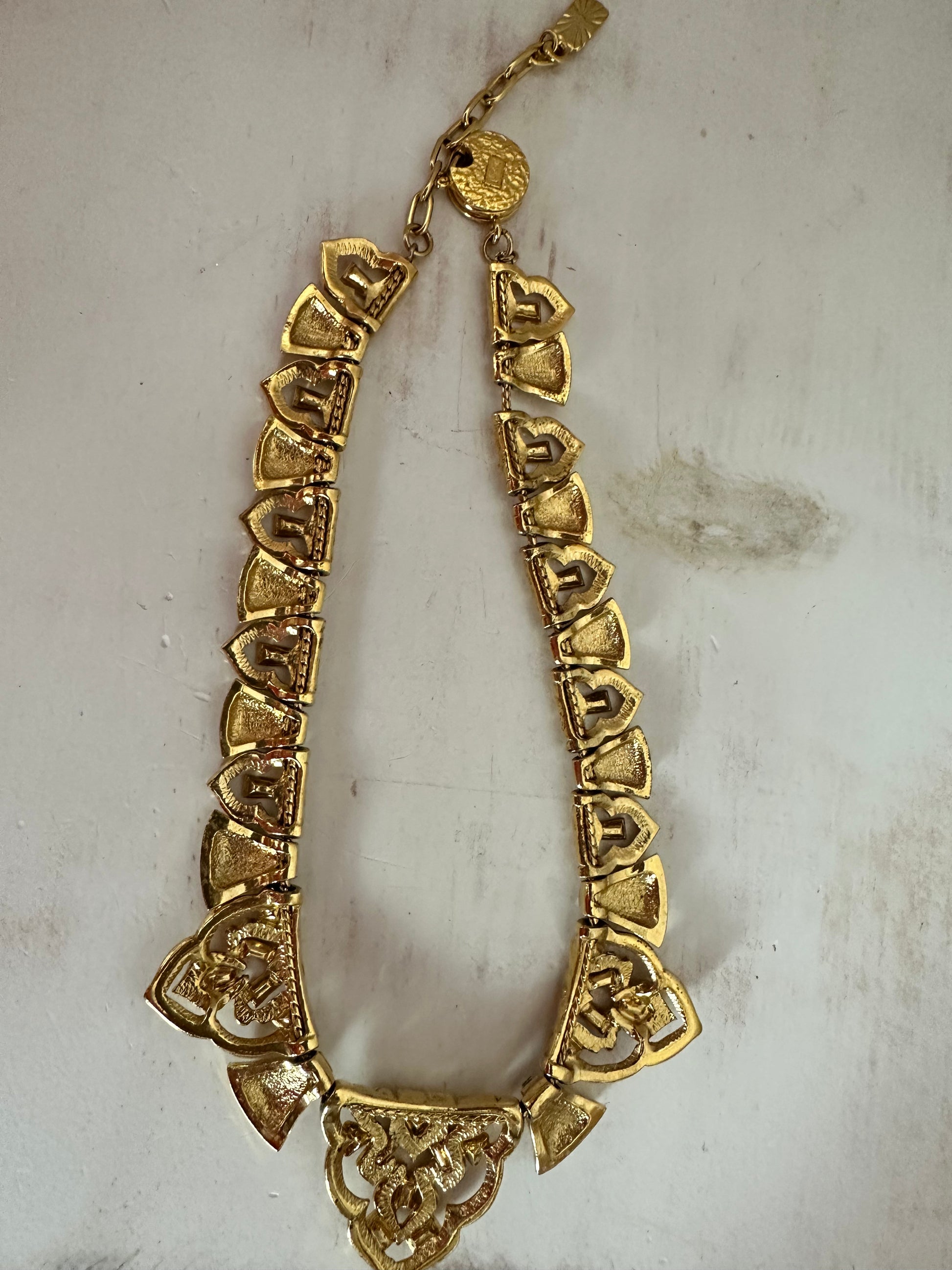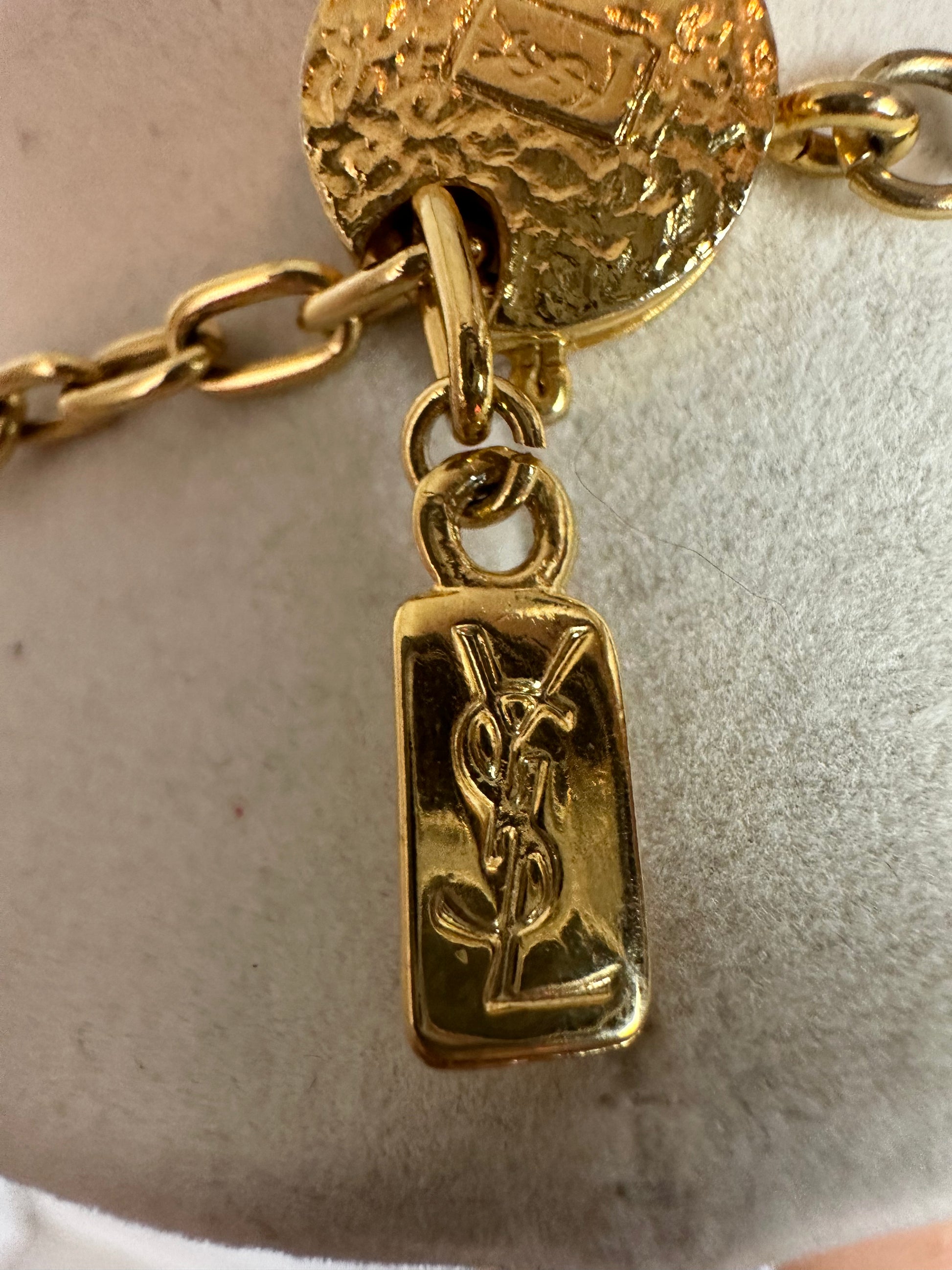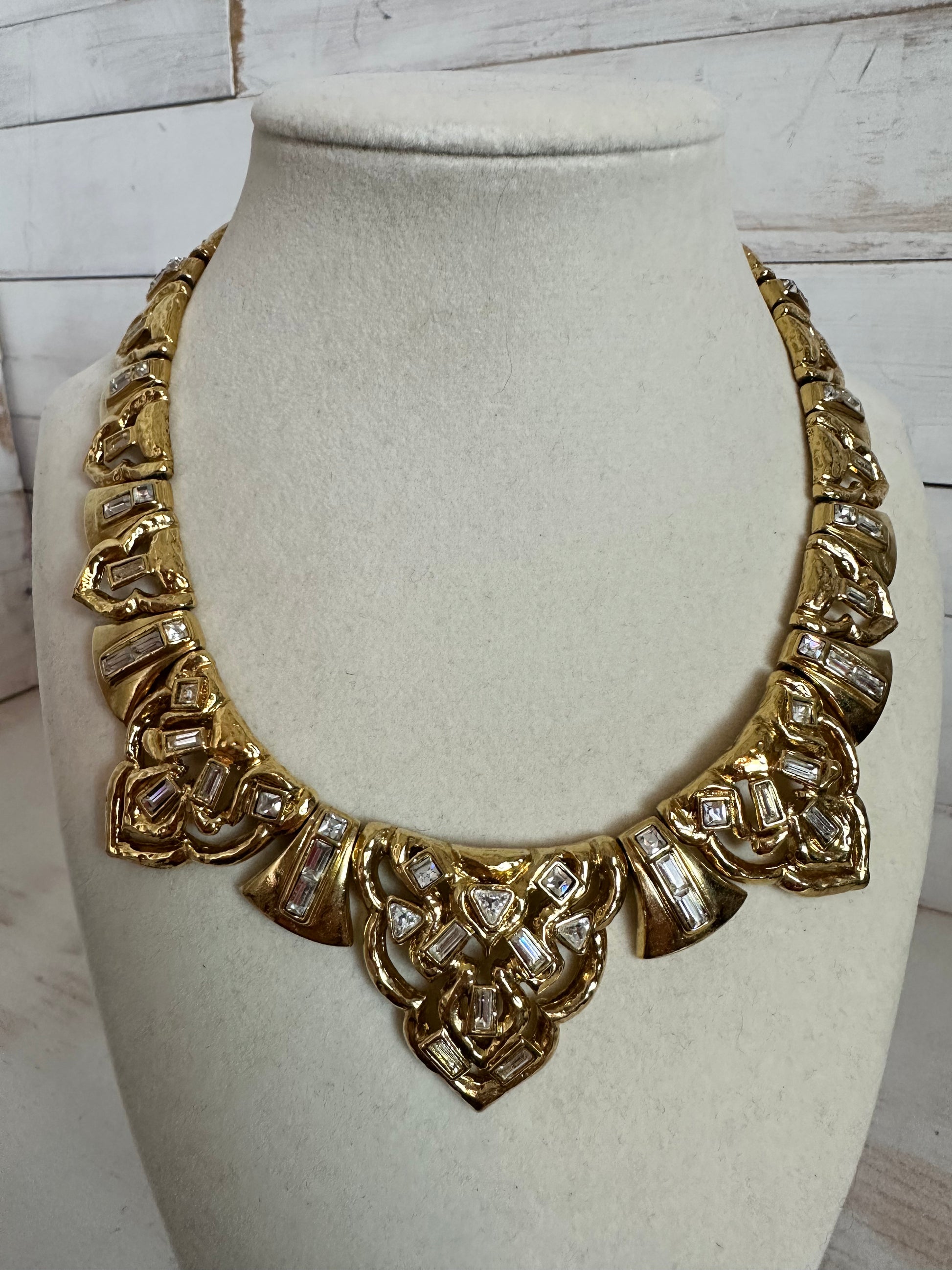 This rare YSL goldtone and crystal necklace is designed to the highest standard. The design is intricate and uses rigid elements in a matt gold finish and decorated with crystals, and in five different shapes and sizes. The design features small interlocking crystal-embelished shapes and a central motif of three larger and more richly decorated elements festooned with clear emerald and square cut clear crystals. Truly a work of art! Oval link extension chain and oblong hangtag marked 'YSL' and a round spring ring clasp marked YSL Made in France. From 1980's. Measurements Total length of the necklace is 17" (43cms) including a 2.5" extension chain. The central element measures 1.4" by 1.5" wide (3.5 by 3.75cms). This exceptional necklace is in excellent condition |